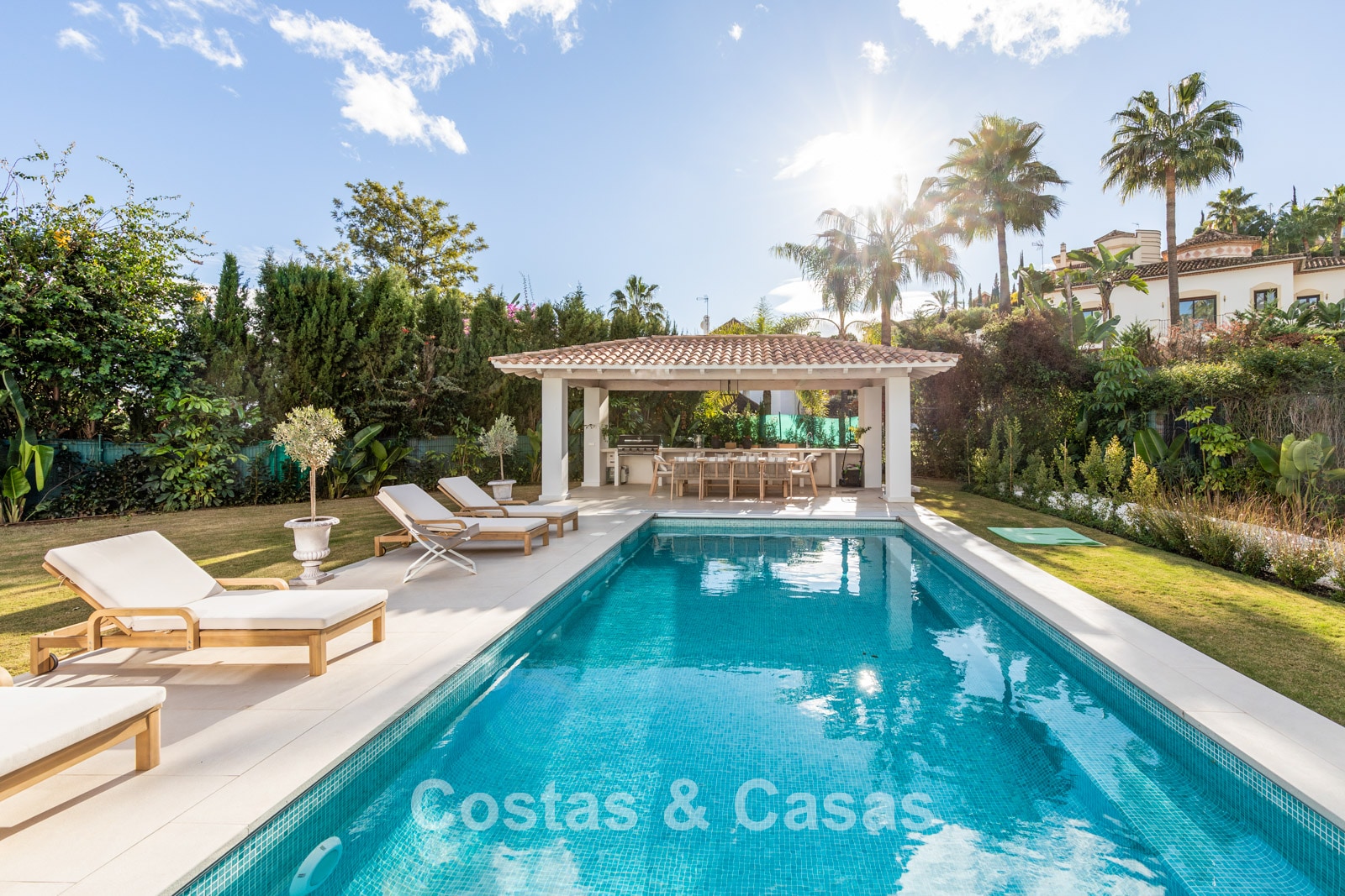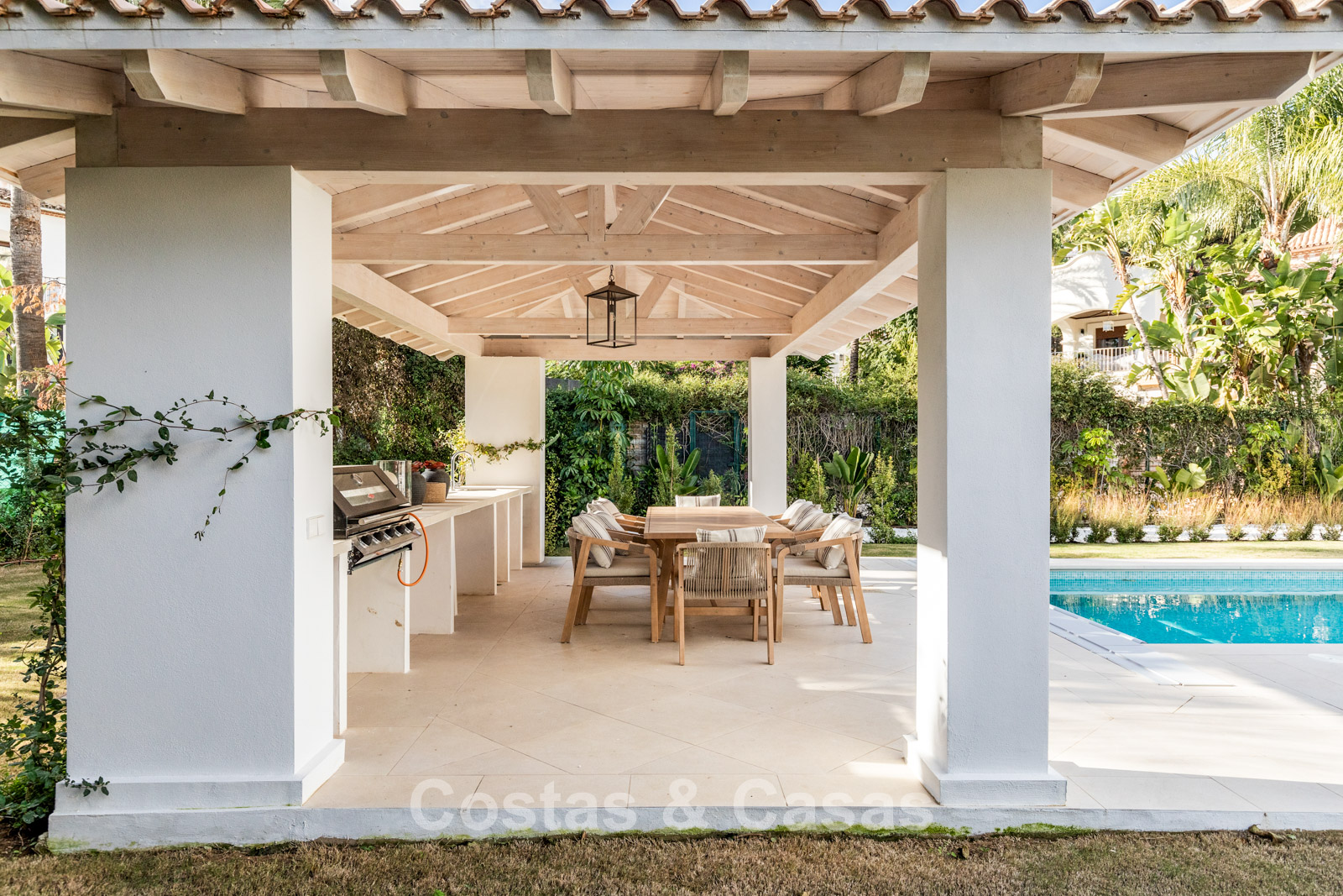Implantée sur un vaste terrain entièrement clôturé. Jardin paysager soigné de style méditerranéen, mêlant végétation tropicale luxuriante et terrasses ensoleillées. Grande piscine privée avec espaces lounge. Cuisine extérieure avec barbecue intégré, idéale pour les déjeuners en plein air. Vues sur le jardin et l’environnement pittoresque.