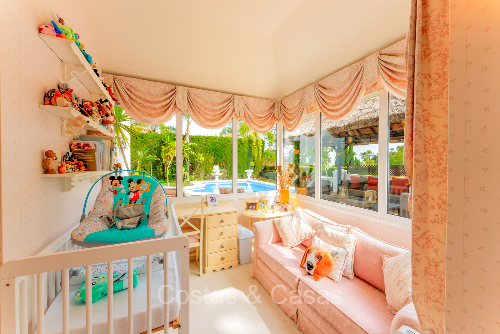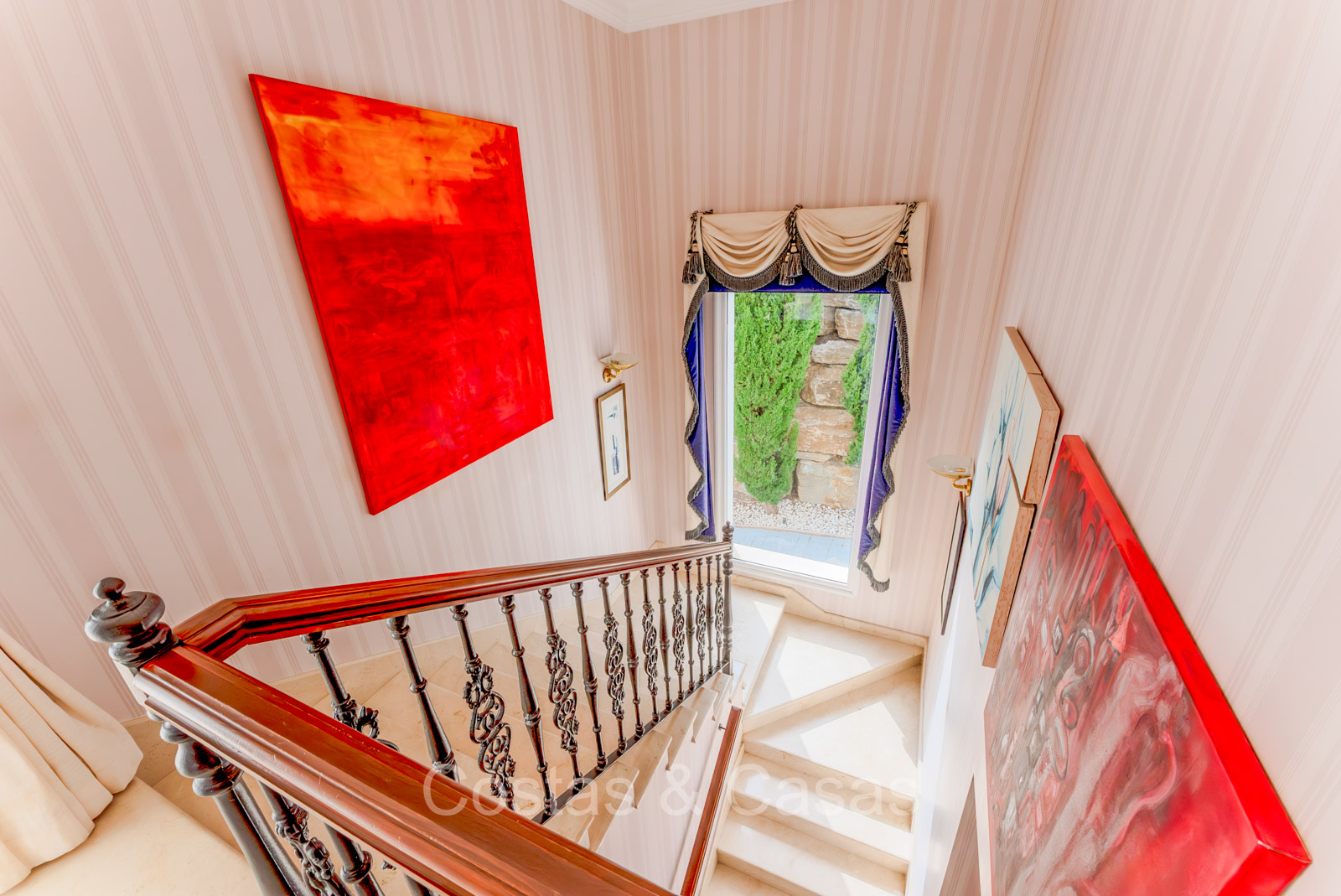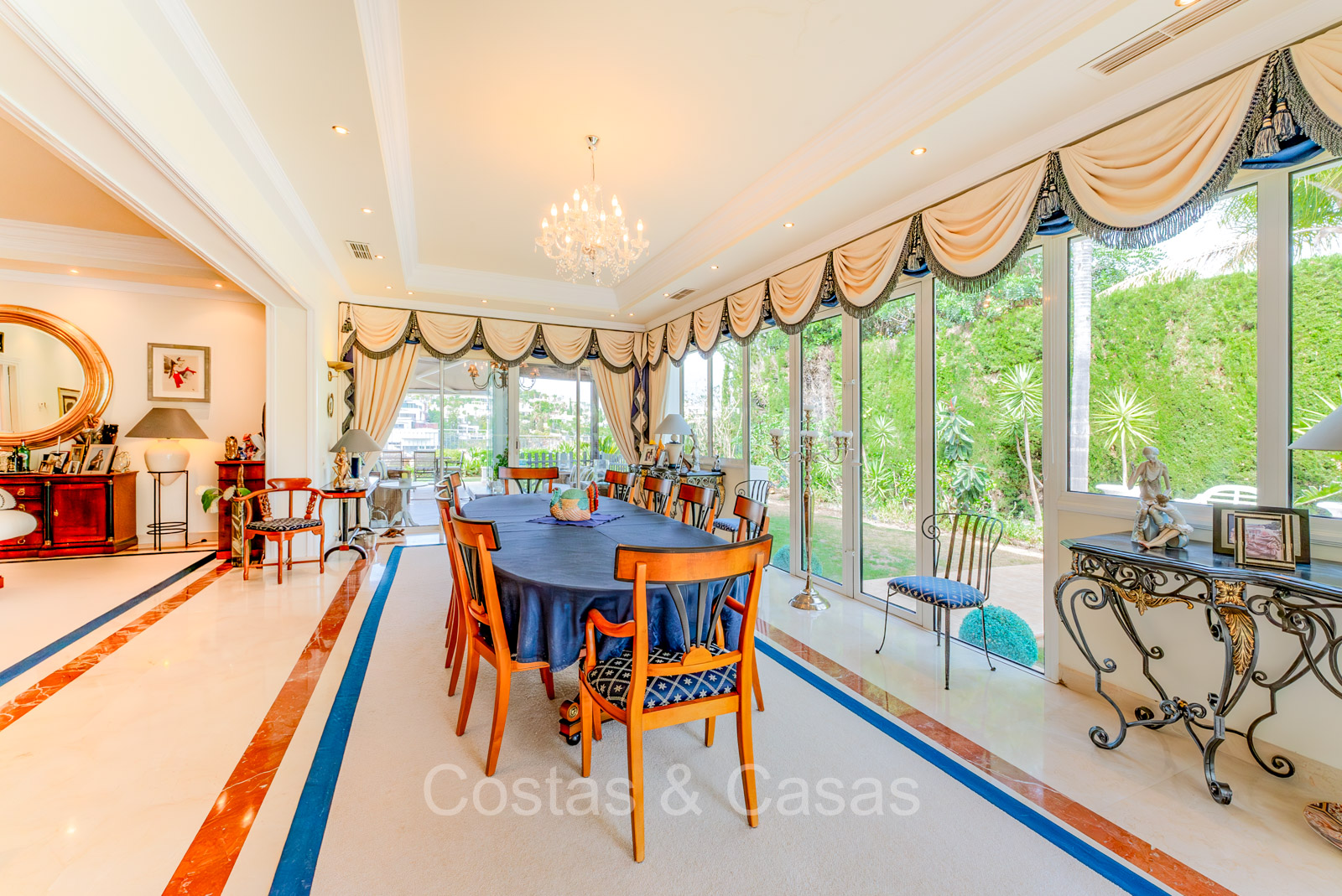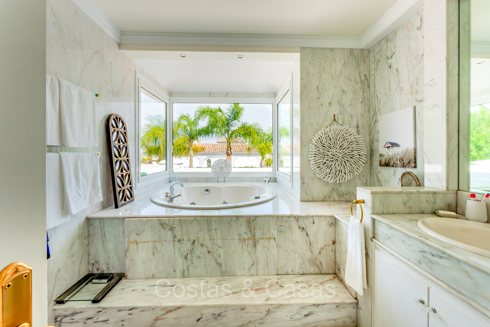 Villa individuelle dans une architecture classique et méditerranéenne. La villa offre la possibilité d'investir dans un projet de modernisation. Utiliser des matériaux de qualité. Le hall d'entrée dispose de hauts plafonds et s'ouvre sur le spacieux espace de vie ouvert avec un grand salon TV et un coin repas intégré. Une cage d'escalier élégante et lumineuse avec un plafond à double hauteur vous mène au dernier étage. La cuisine lumineuse s'ouvre sur une terrasse ensoleillée, avec un espace repas en plein air, où vous pourrez également profiter d'une belle vue sur la vallée du golf. 5 chambres, 7 salles de bains et une toilette séparée. L’étage inférieur dispose d'une salle de jeux et d'un salon TV. Sols intérieurs en marbre. Buanderie. Débarras spacieux. Parking pour 4 voitures.