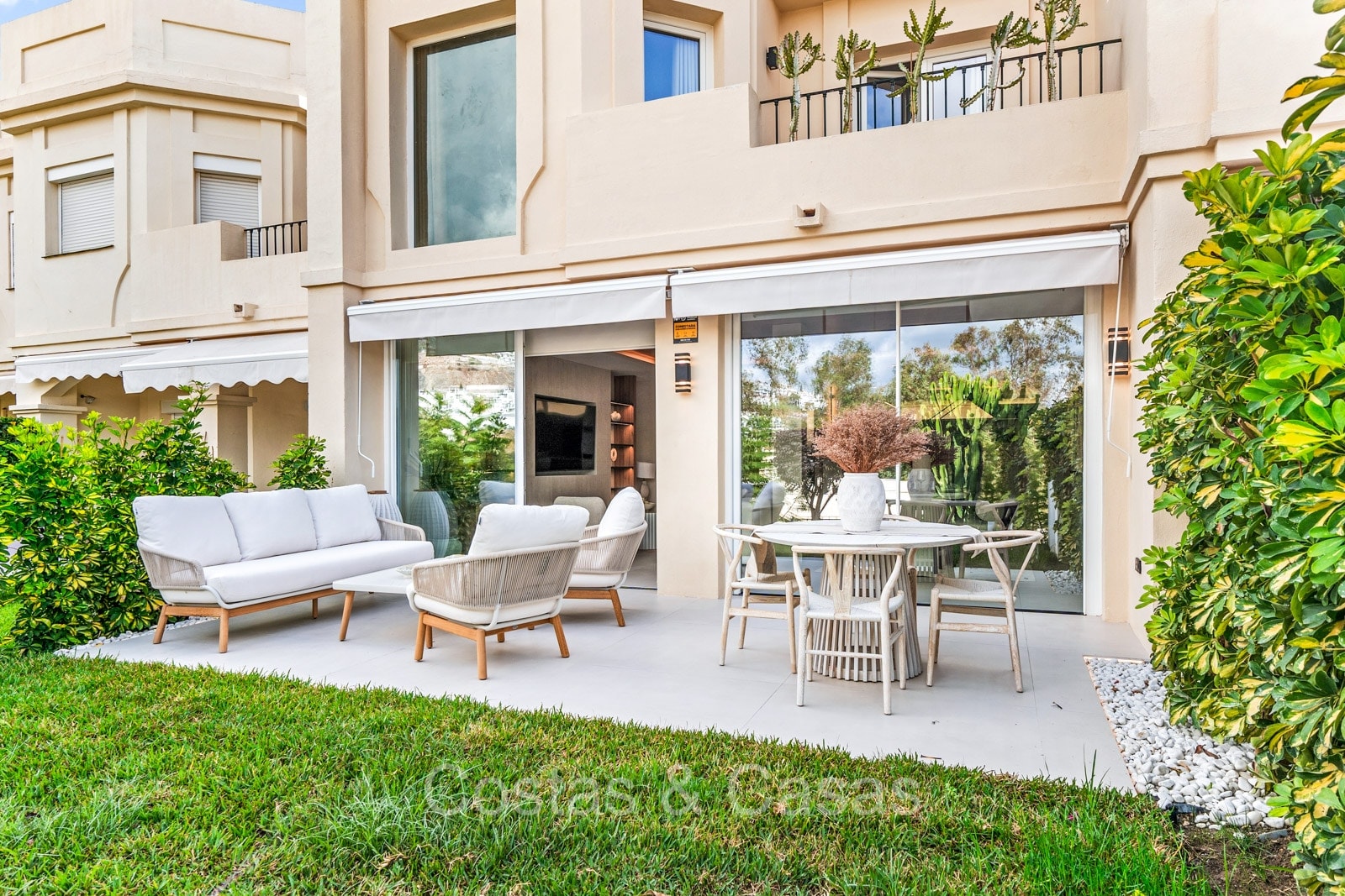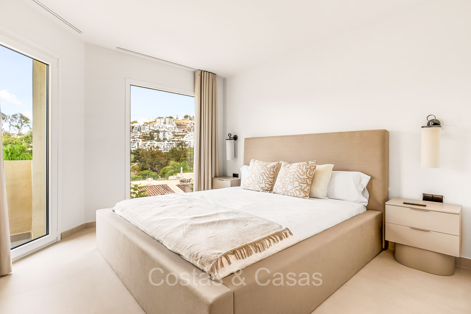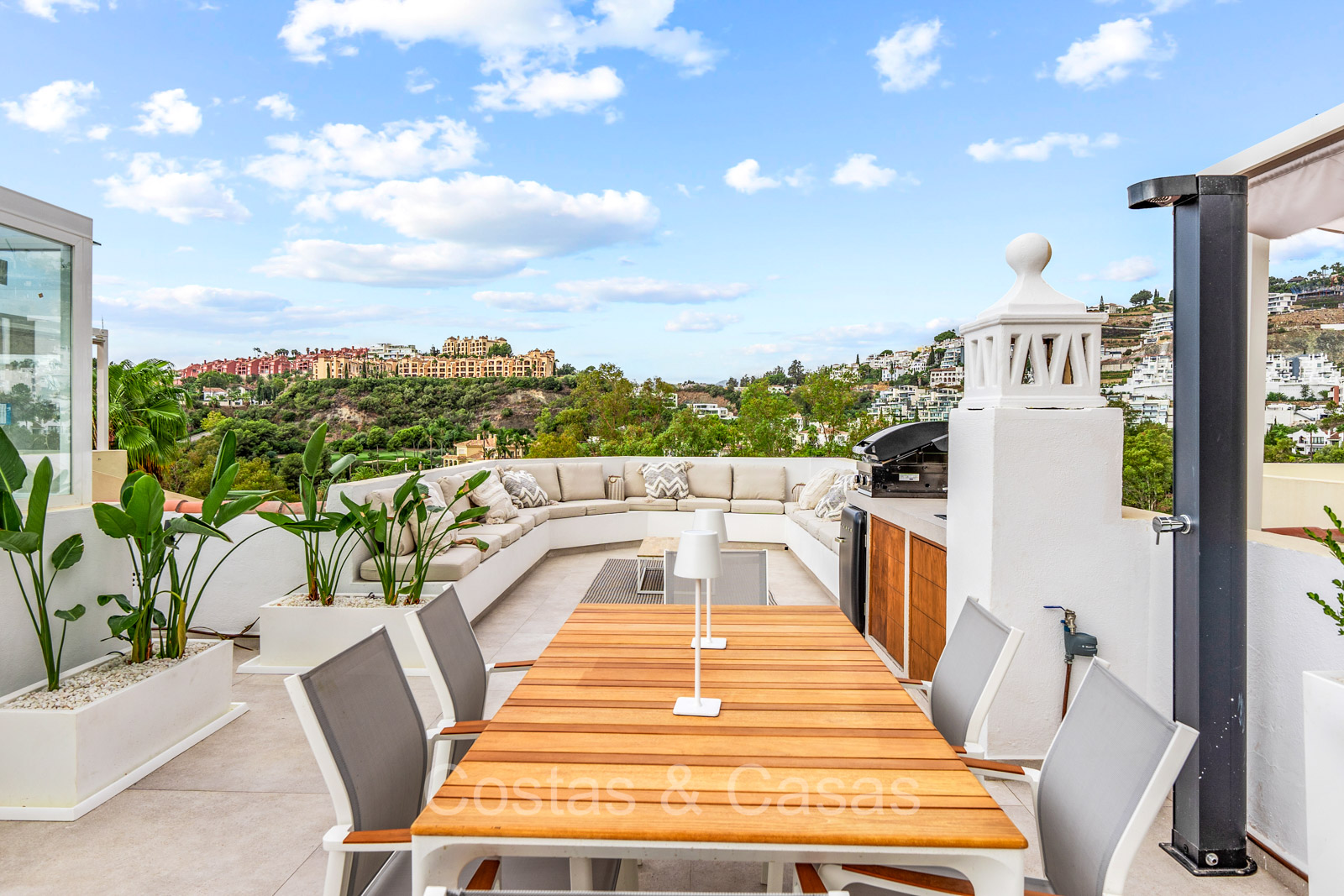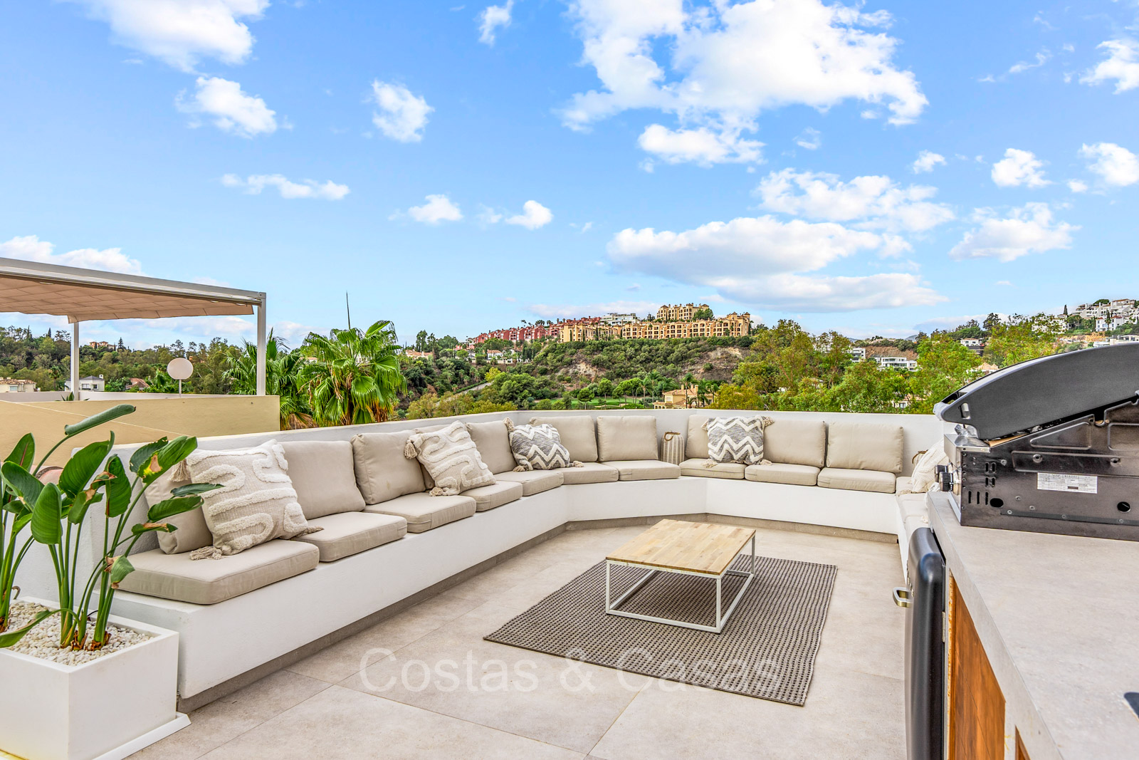 Maison spacieuse avec 2 étages et un vaste solarium. Soigneusement rénovée et meublée avec goût, où les éléments de design scandinave et contemporain se mélangent harmonieusement. Orientée vers l'ouest. Belles vues sur le paysage montagneux, les terrains de golf et la mer Méditerranée. La terrasse ensoleillée s'ouvre sur un jardin privatif. Un solarium de 60m² est équipé d'un salon, d'une cuisine extérieure avec barbecue et coin repas et vous pourrez également profiter de la vue à 180° sur les montagnes, le golf et la mer. Les fenêtres coulissantes du sol au plafond avec cadres encastrés assurent un flux fluide entre les espaces intérieurs et extérieurs et génèrent également beaucoup de lumière naturelle. La cage d'escalier qui relie les étages est dotée d'une verrière qui apporte une lumière supplémentaire. Cuisine pratiquement équipée avec des appareils électroménagers de haute qualité et un îlot de cuisson où vous pourrez prendre le petit-déjeuner. Espace de vie ouvert avec salon et salle à manger. 3 chambres, 2 salles de bains et une toilette séparée. Sols en carrelage en pierre naturelle grand format. Buanderie équipée de machines à laver et à sécher.
