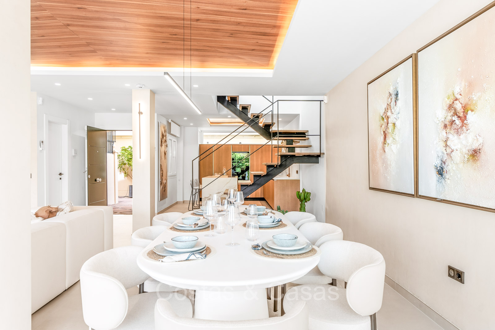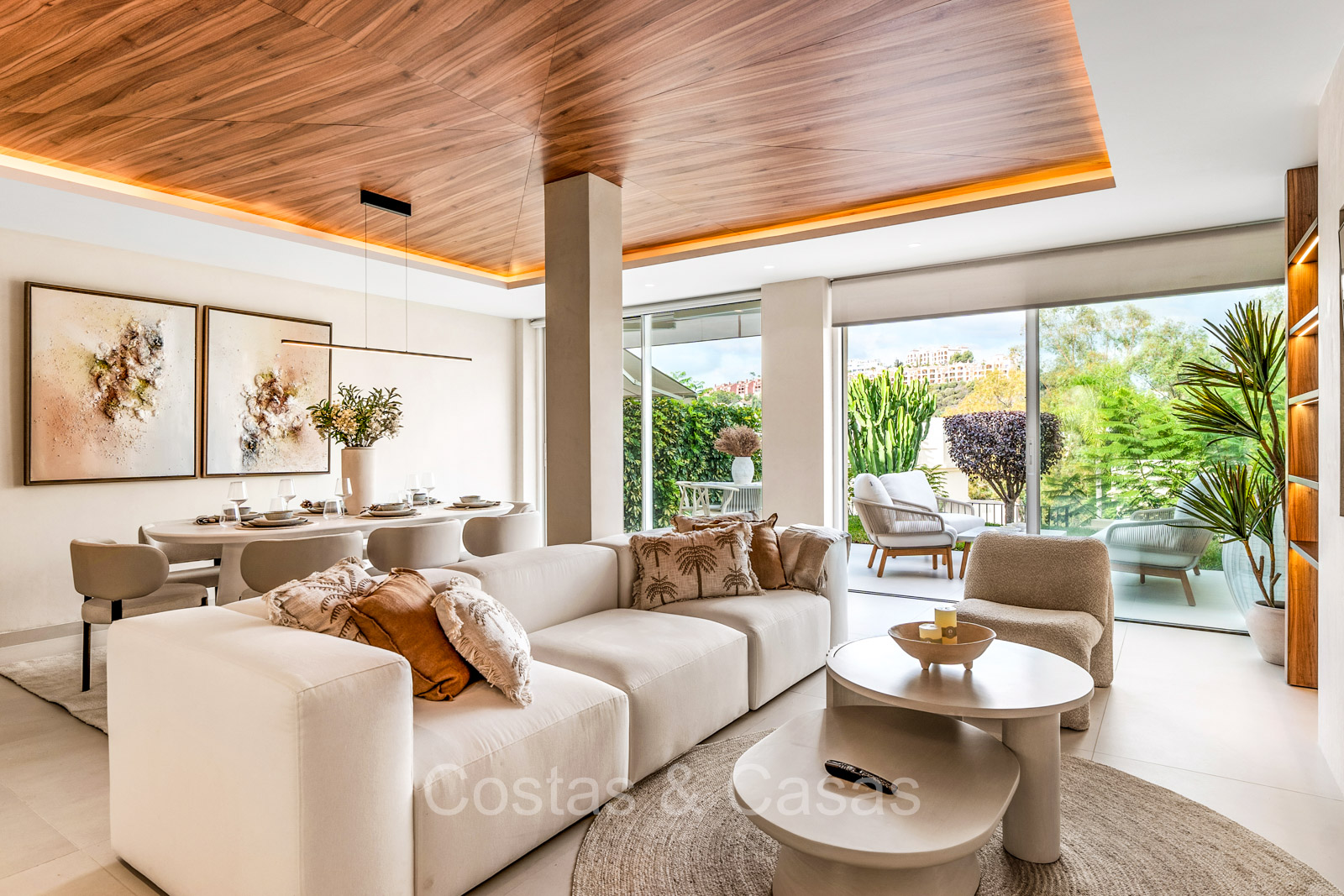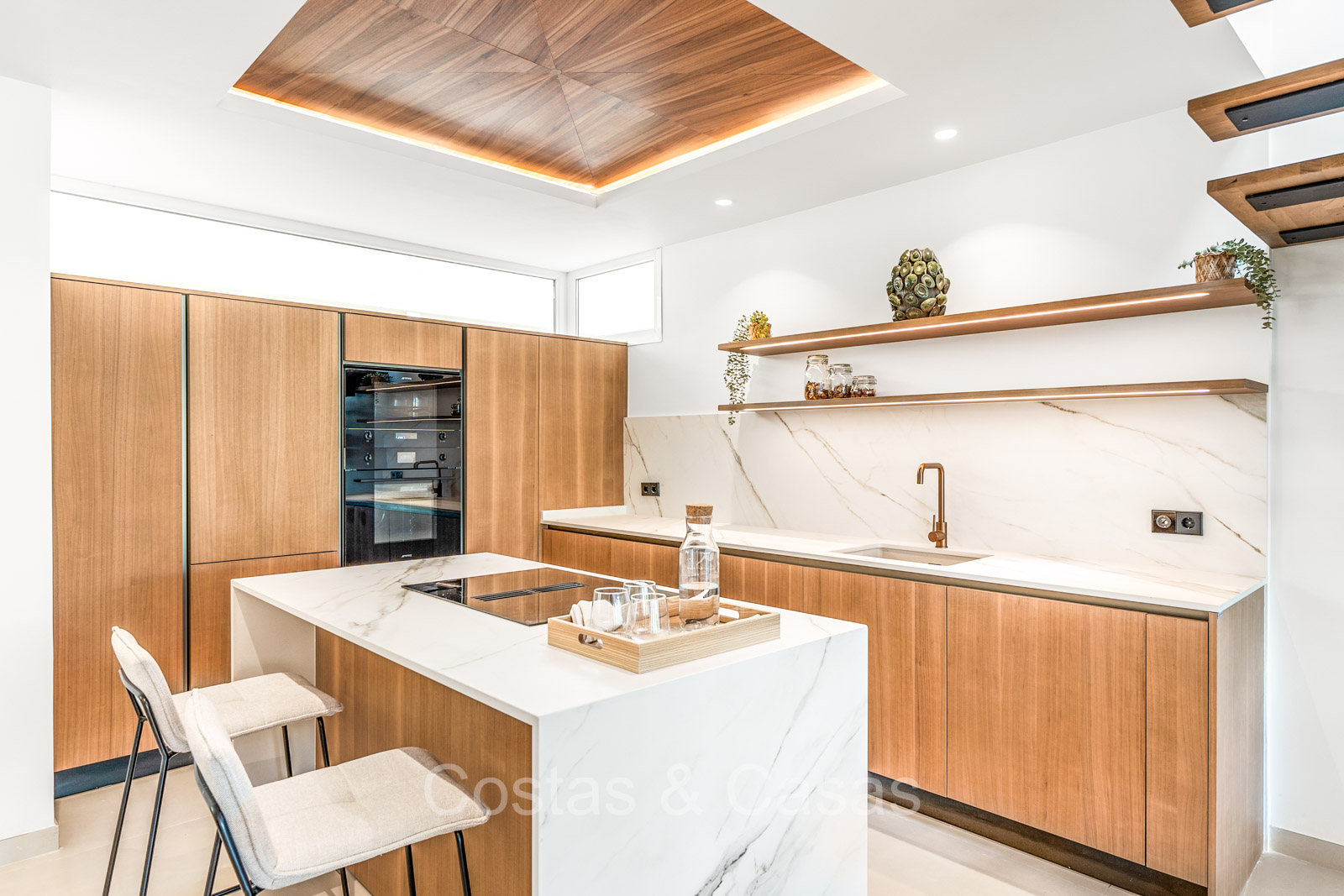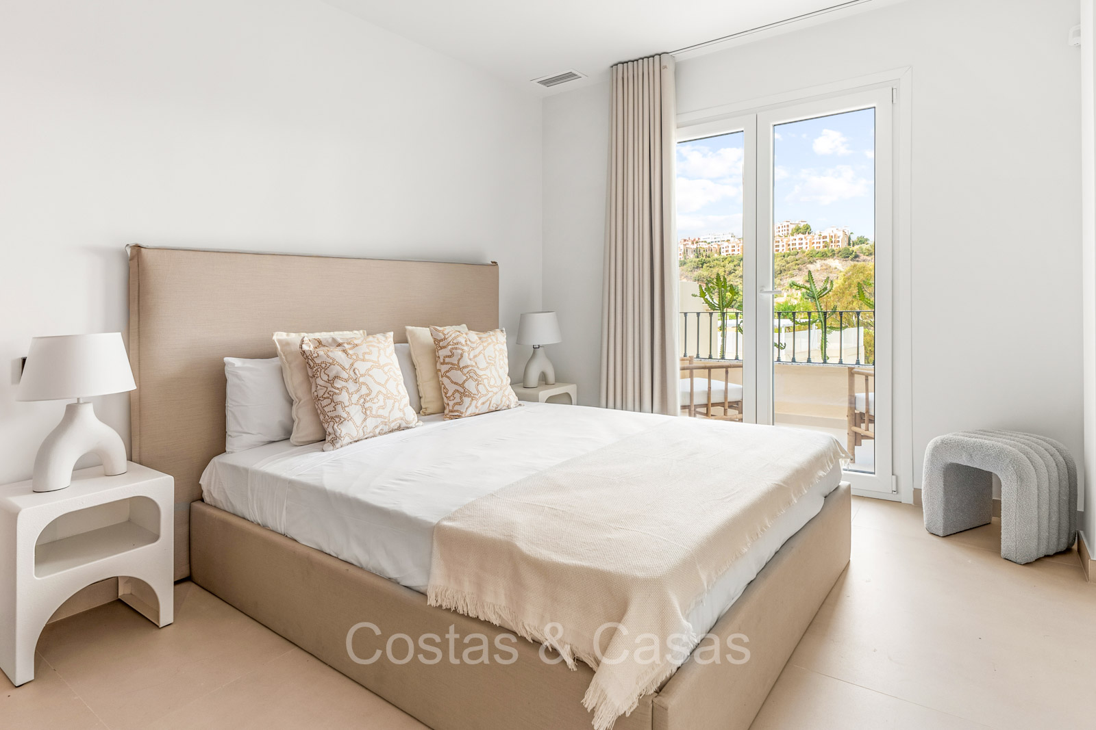 Maison spacieuse avec 2 étages et un vaste solarium. Soigneusement rénovée et meublée avec goût, où les éléments de design scandinave et contemporain se mélangent harmonieusement. Orientée vers l'ouest. Belles vues sur le paysage montagneux, les terrains de golf et la mer Méditerranée. La terrasse ensoleillée s'ouvre sur un jardin privatif. Un solarium de 60m² est équipé d'un salon, d'une cuisine extérieure avec barbecue et coin repas et vous pourrez également profiter de la vue à 180° sur les montagnes, le golf et la mer. Les fenêtres coulissantes du sol au plafond avec cadres encastrés assurent un flux fluide entre les espaces intérieurs et extérieurs et génèrent également beaucoup de lumière naturelle. La cage d'escalier qui relie les étages est dotée d'une verrière qui apporte une lumière supplémentaire. Cuisine pratiquement équipée avec des appareils électroménagers de haute qualité et un îlot de cuisson où vous pourrez prendre le petit-déjeuner. Espace de vie ouvert avec salon et salle à manger. 3 chambres, 2 salles de bains et une toilette séparée. Sols en carrelage en pierre naturelle grand format. Buanderie équipée de machines à laver et à sécher.