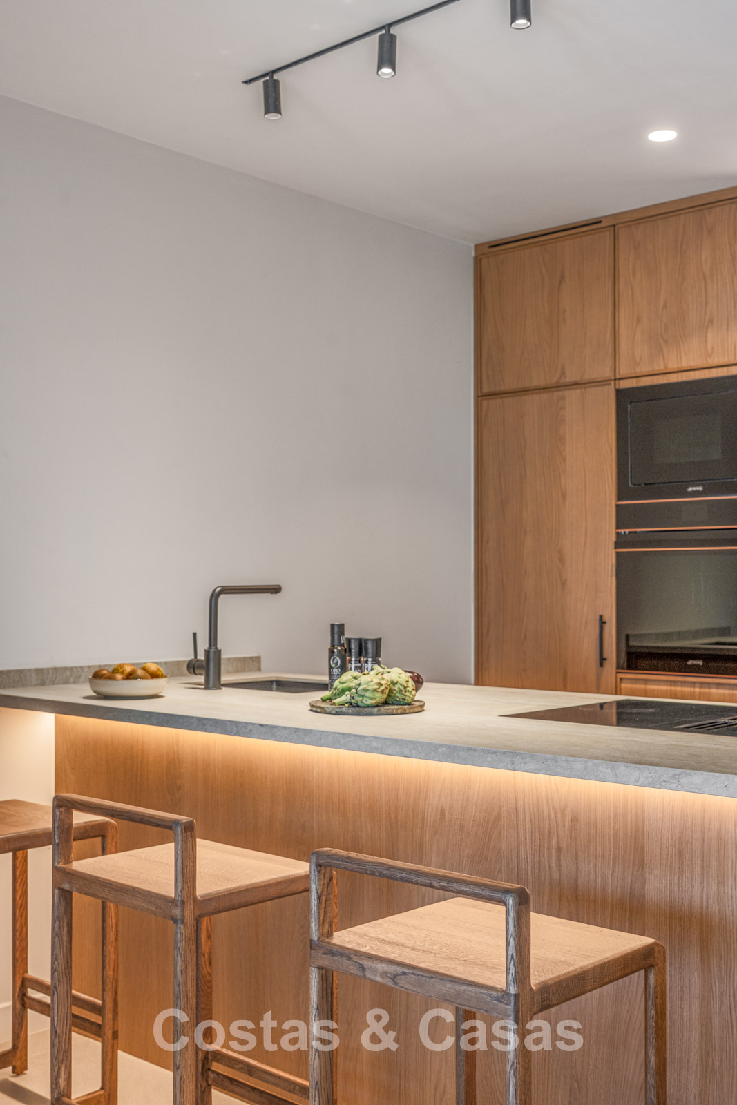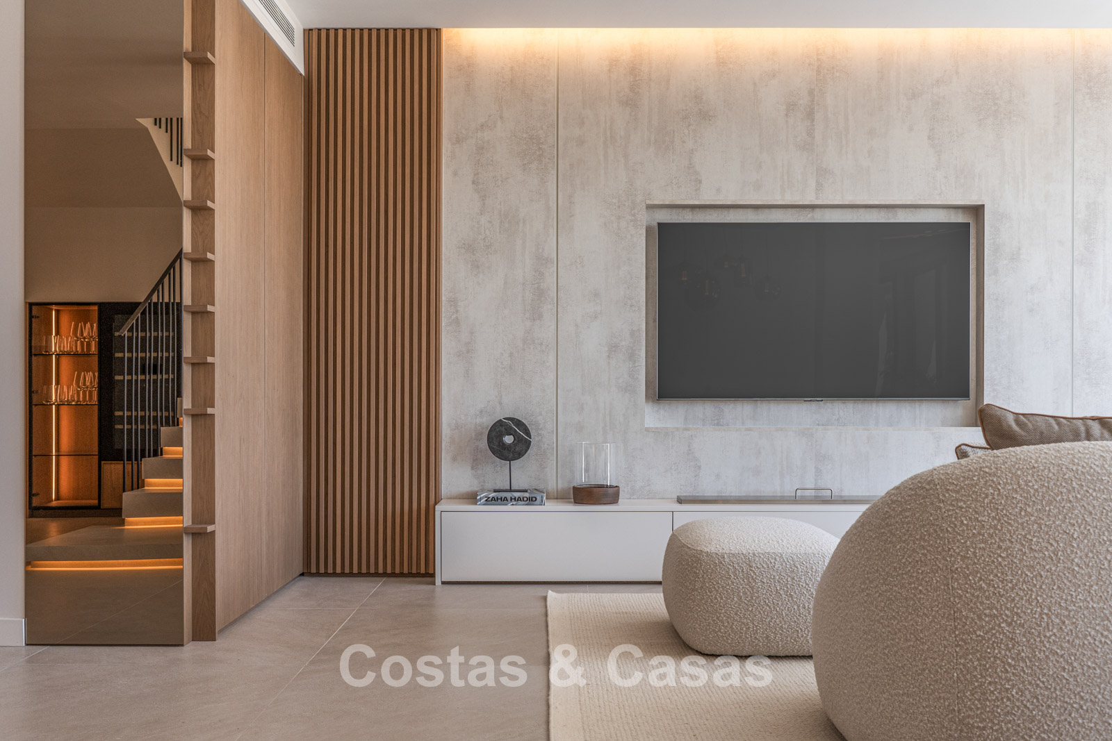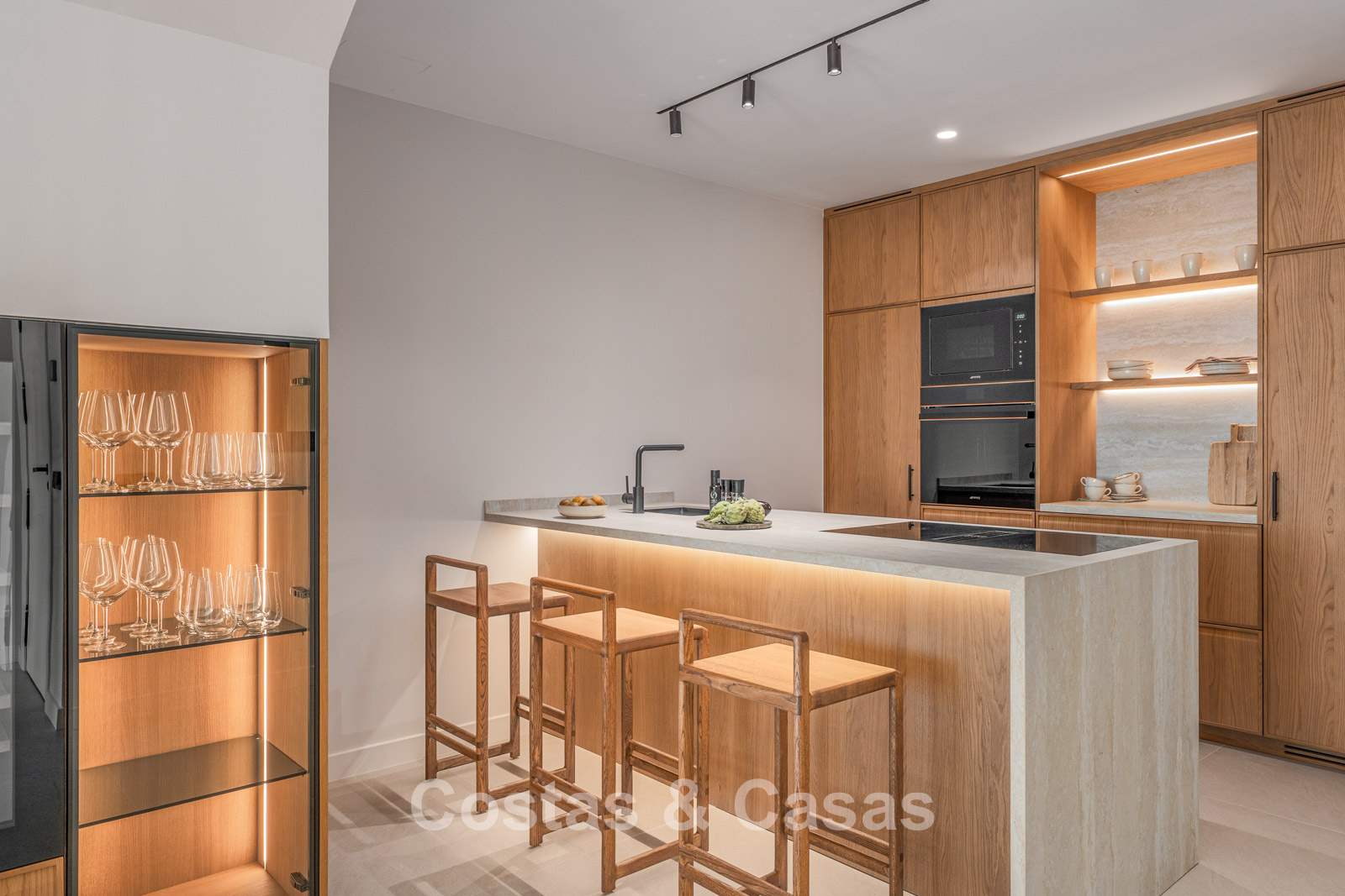 Autres caractéristiques : Climatisation pour le refroidissement et le chauffage. Cheminée au bioéthanol. Armoires encastrées sur mesure. Double vitrage. Éclairage LED. Auvents.