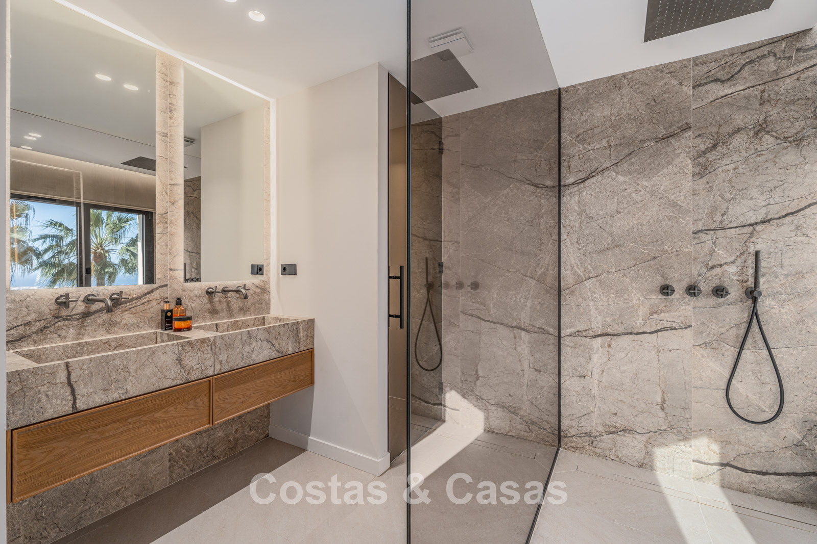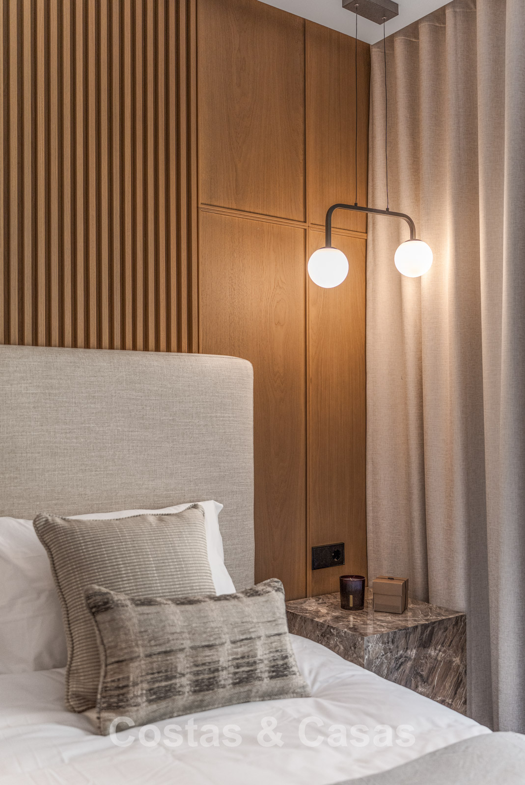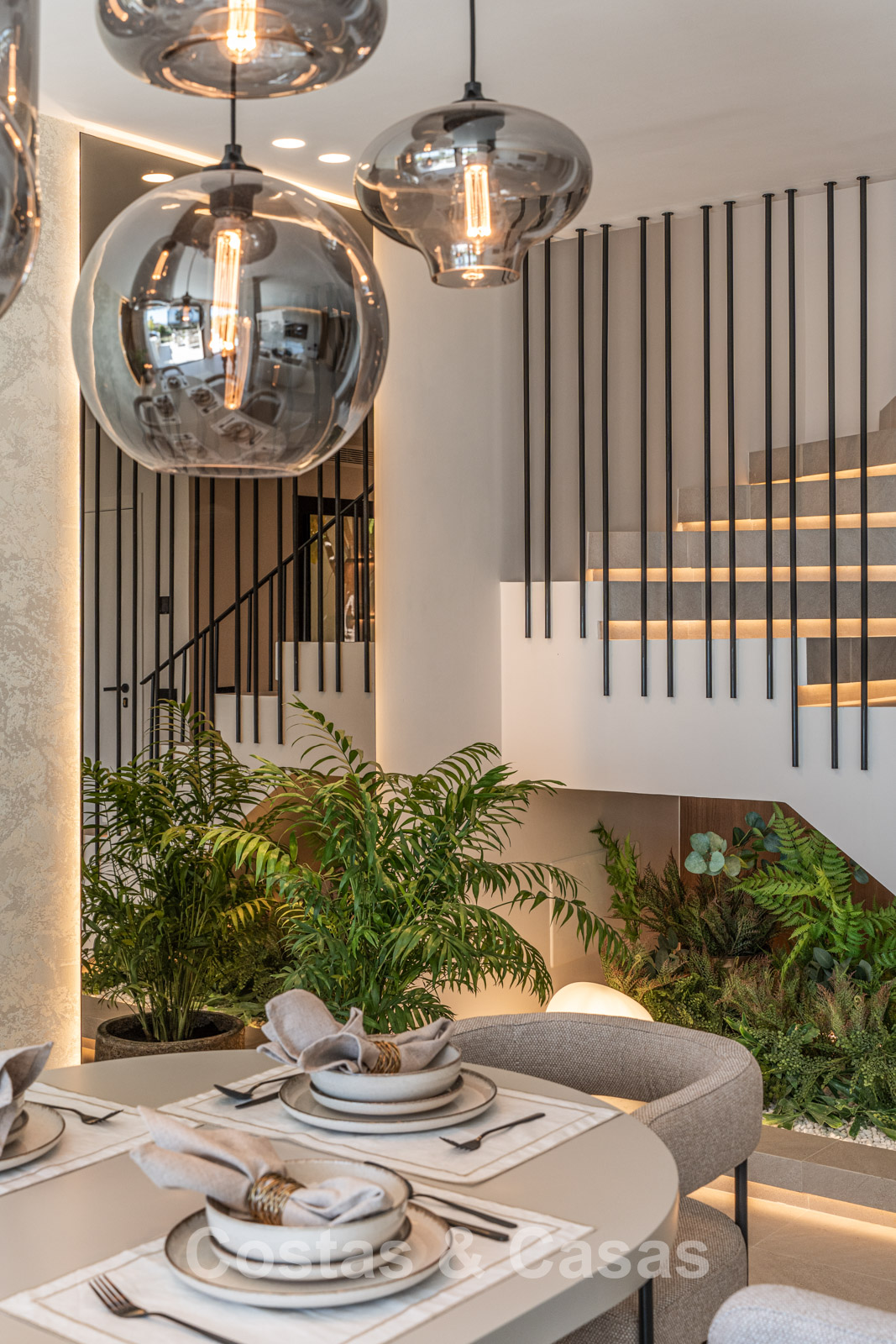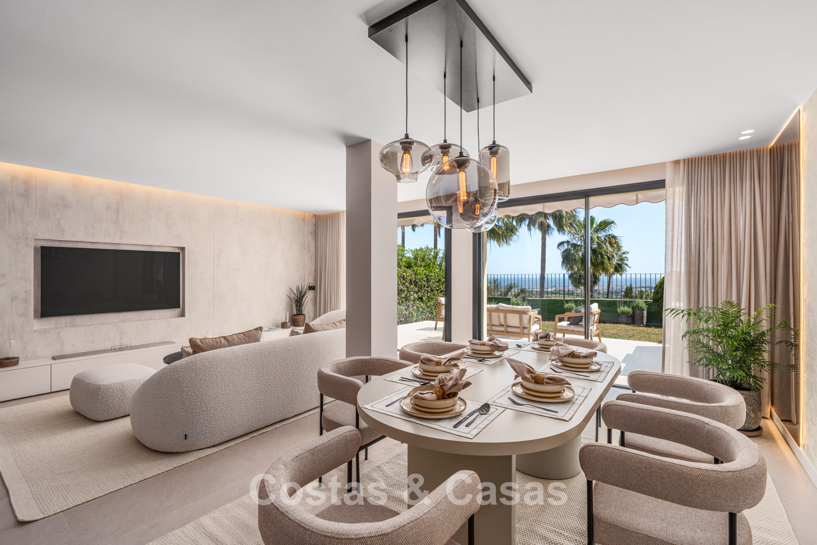 Autres caractéristiques : Climatisation pour le refroidissement et le chauffage. Cheminée au bioéthanol. Armoires encastrées sur mesure. Double vitrage. Éclairage LED. Auvents.