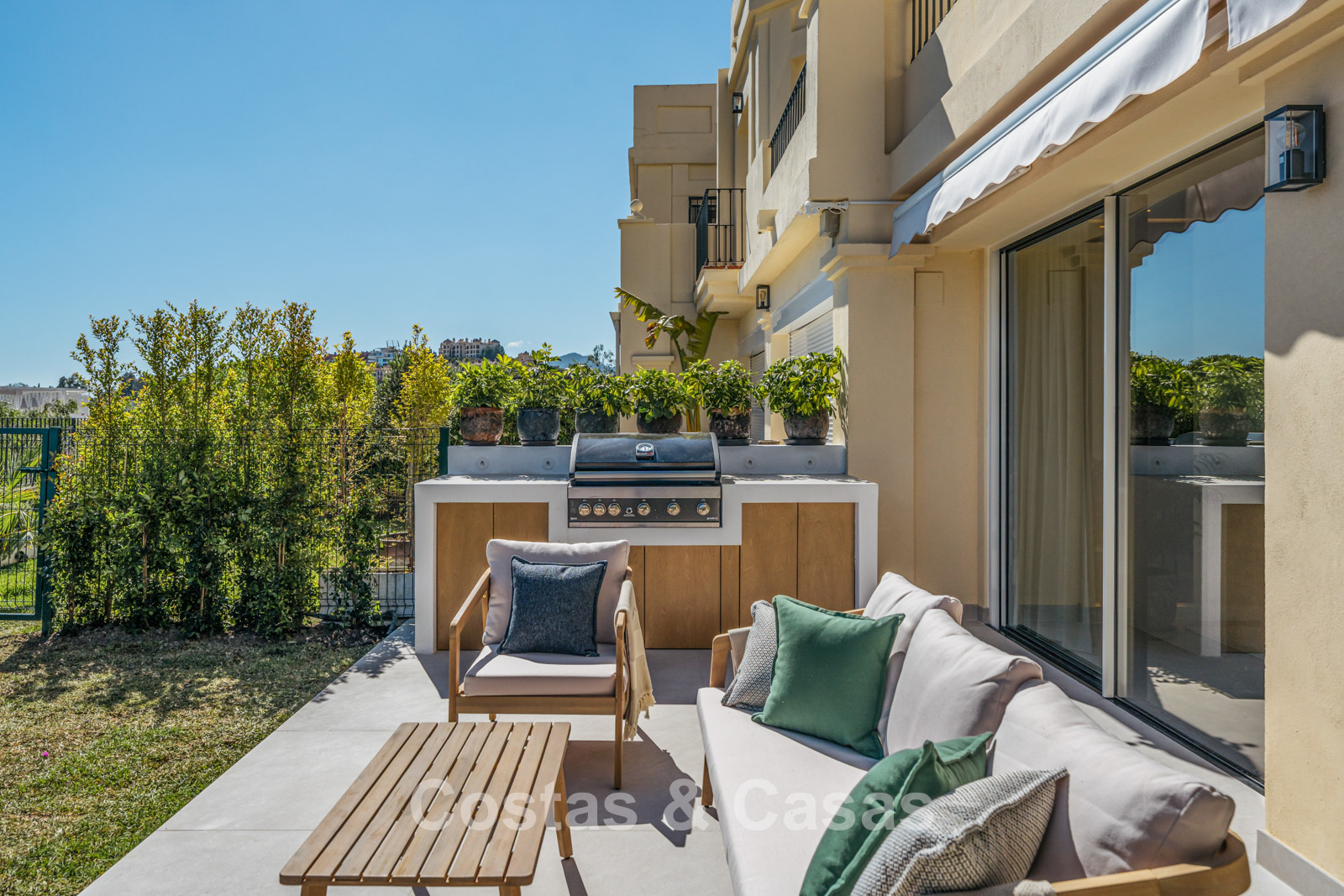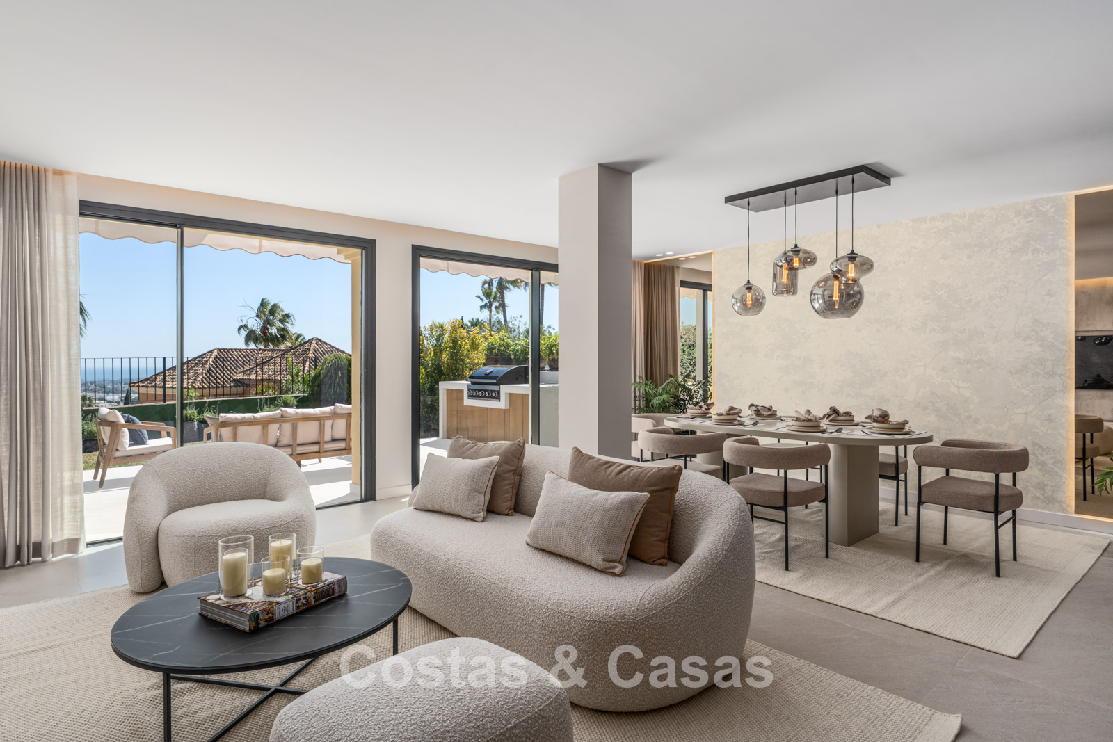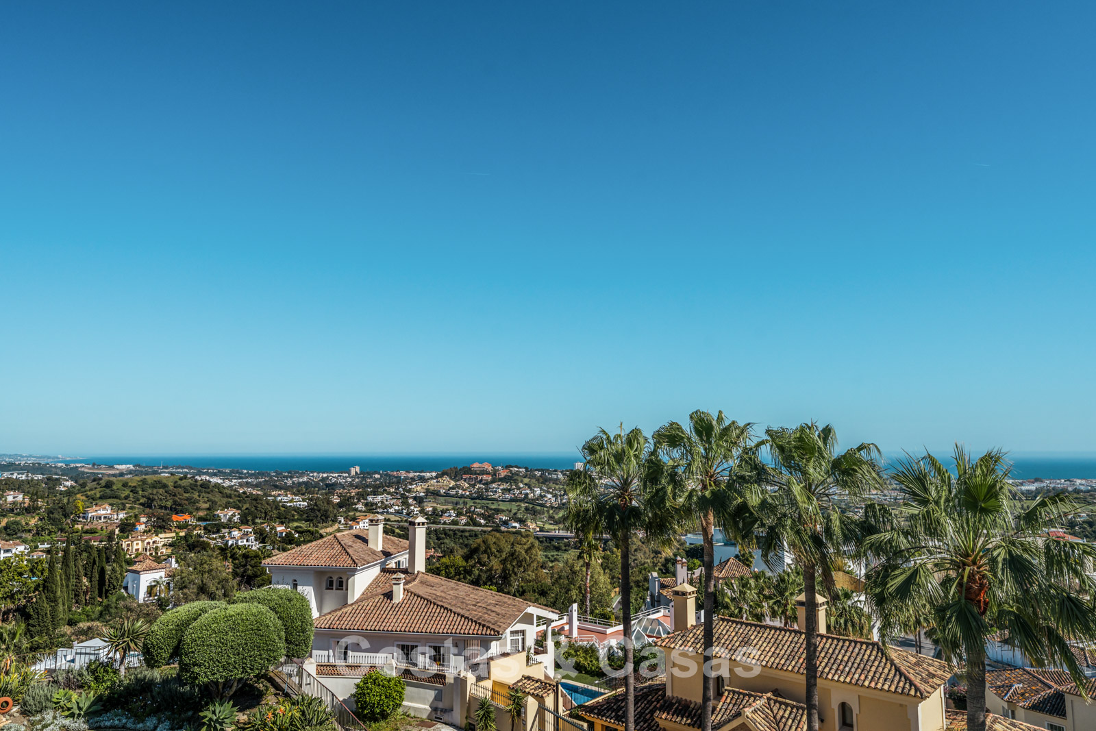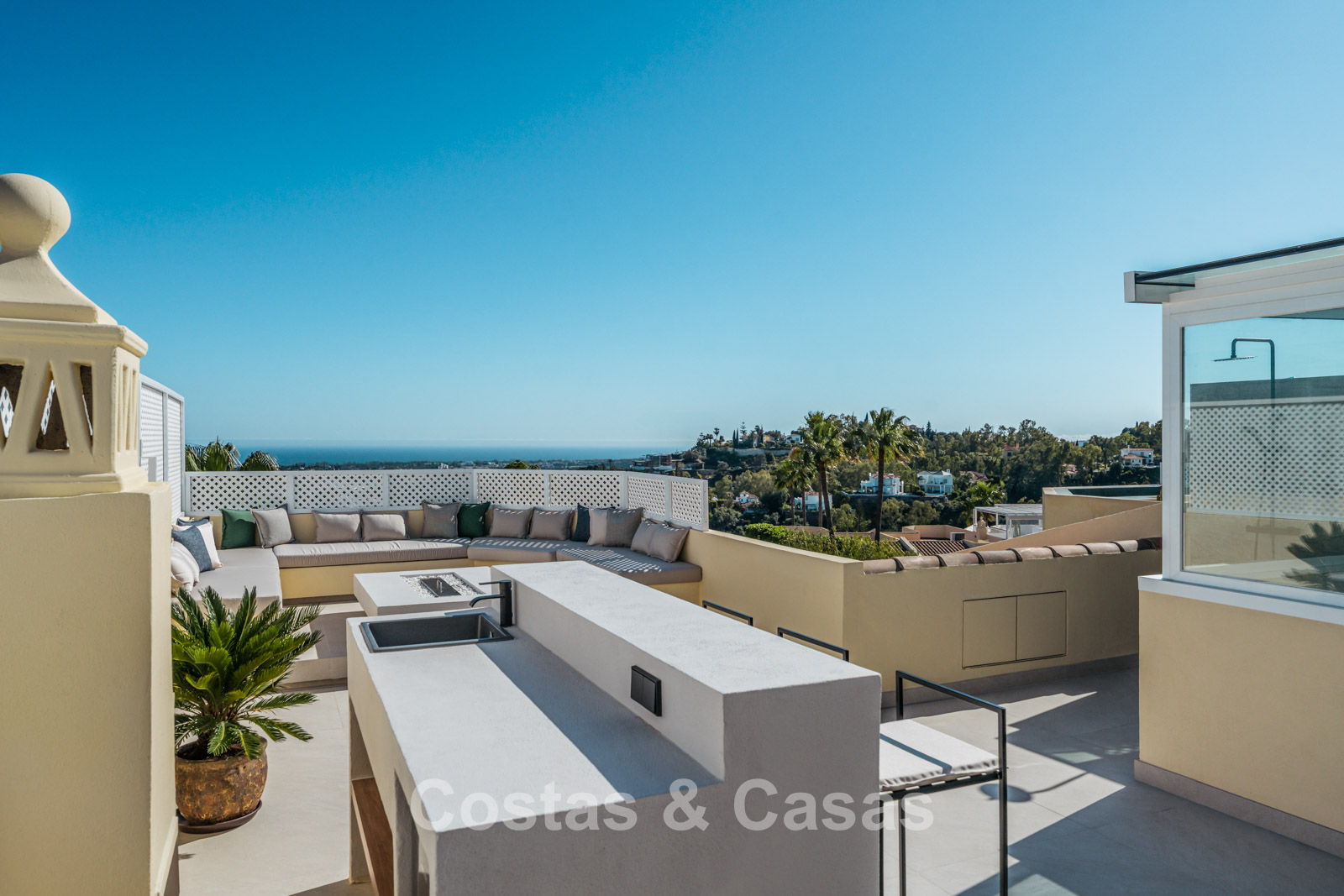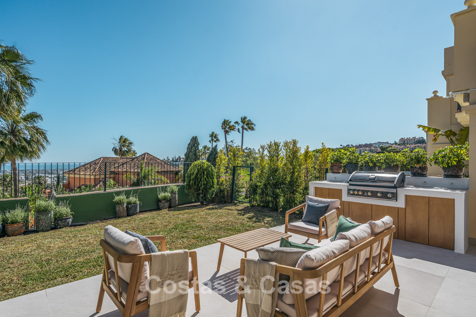 Jardin privé clos avec un charmant coin pelouse. Terrasse ensoleillée avec cuisine extérieure et barbecue. La terrasse sur le toit, pleine d'ambiance, dispose d'un espace détente confortable près de la cheminée et d'un bar élégant où vous pourrez vous détendre et prendre un verre. Située au sud. Vues panoramiques sur la vallée vers la montagne de La Concha et la mer Méditerranée.