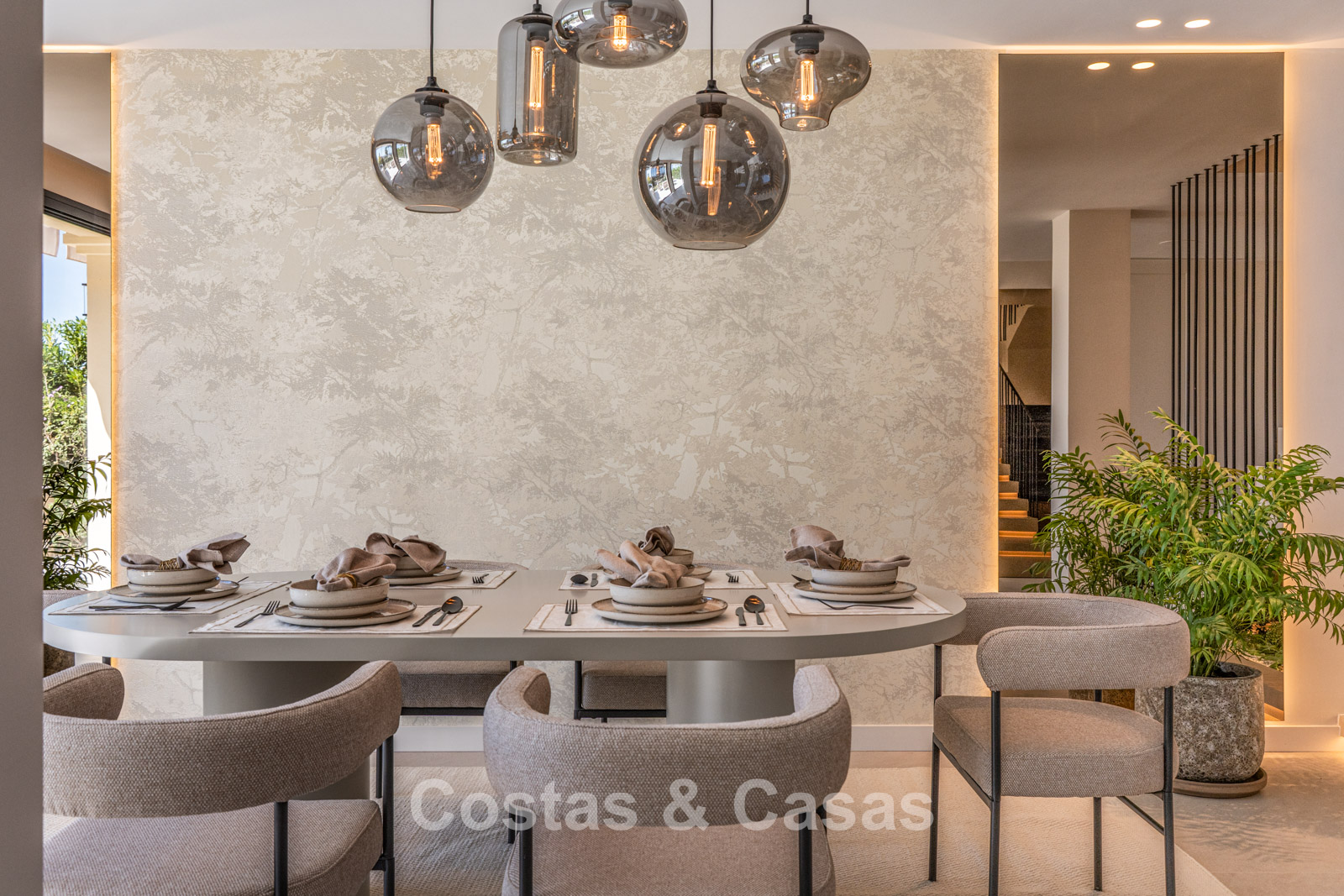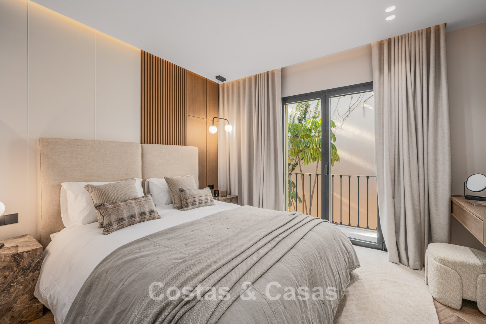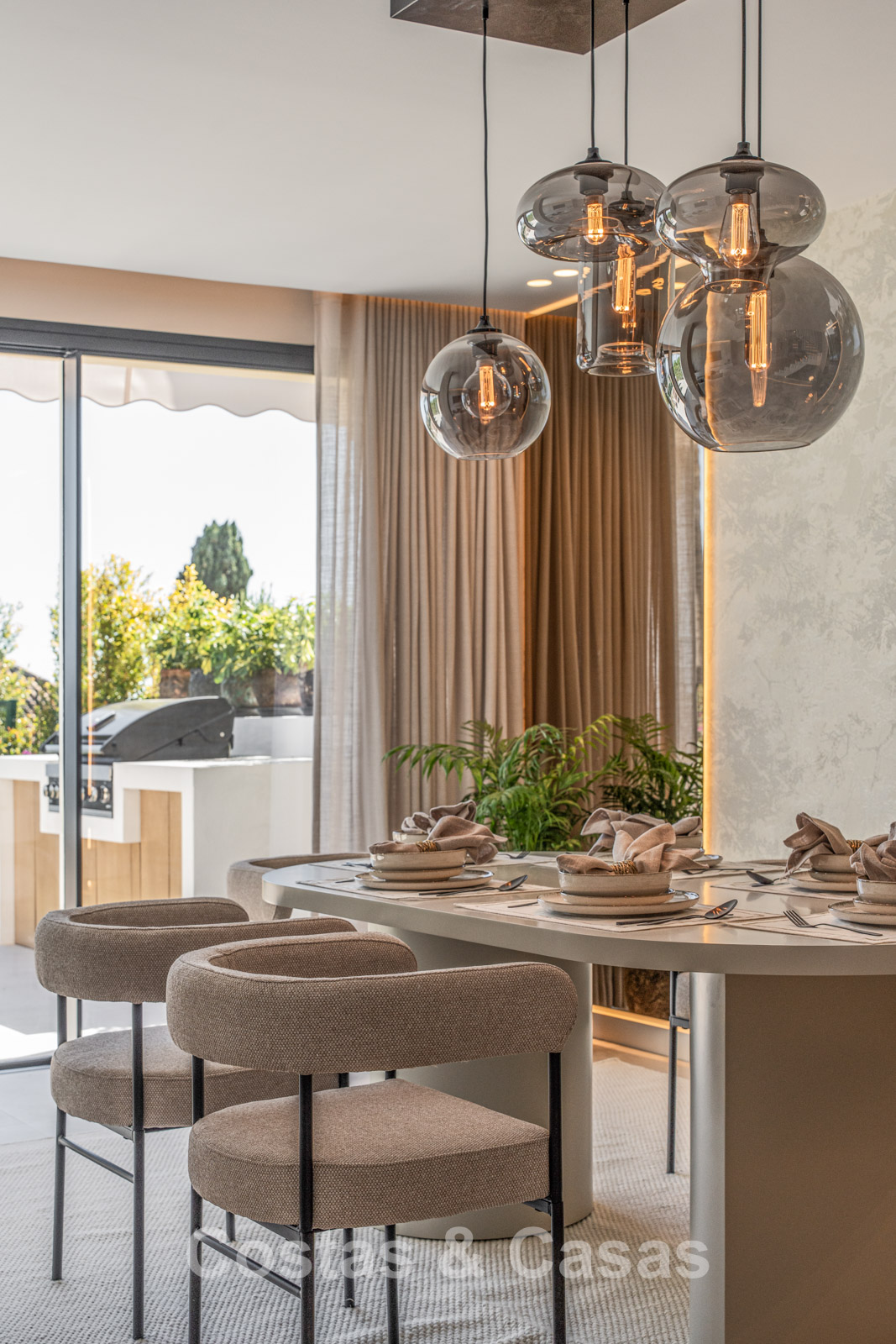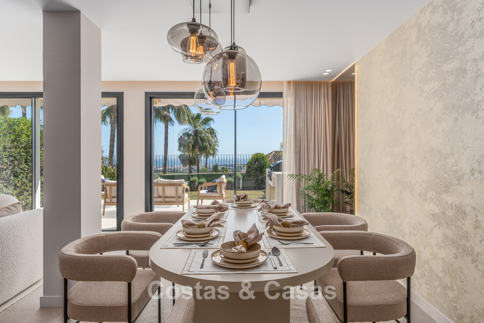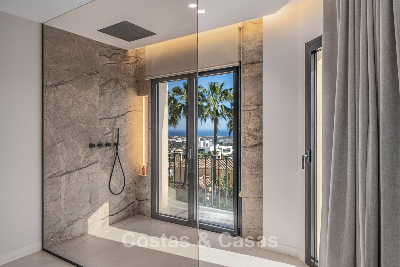 Jardin privé clos avec un charmant coin pelouse. Terrasse ensoleillée avec cuisine extérieure et barbecue. La terrasse sur le toit, pleine d'ambiance, dispose d'un espace détente confortable près de la cheminée et d'un bar élégant où vous pourrez vous détendre et prendre un verre. Située au sud. Vues panoramiques sur la vallée vers la montagne de La Concha et la mer Méditerranée.