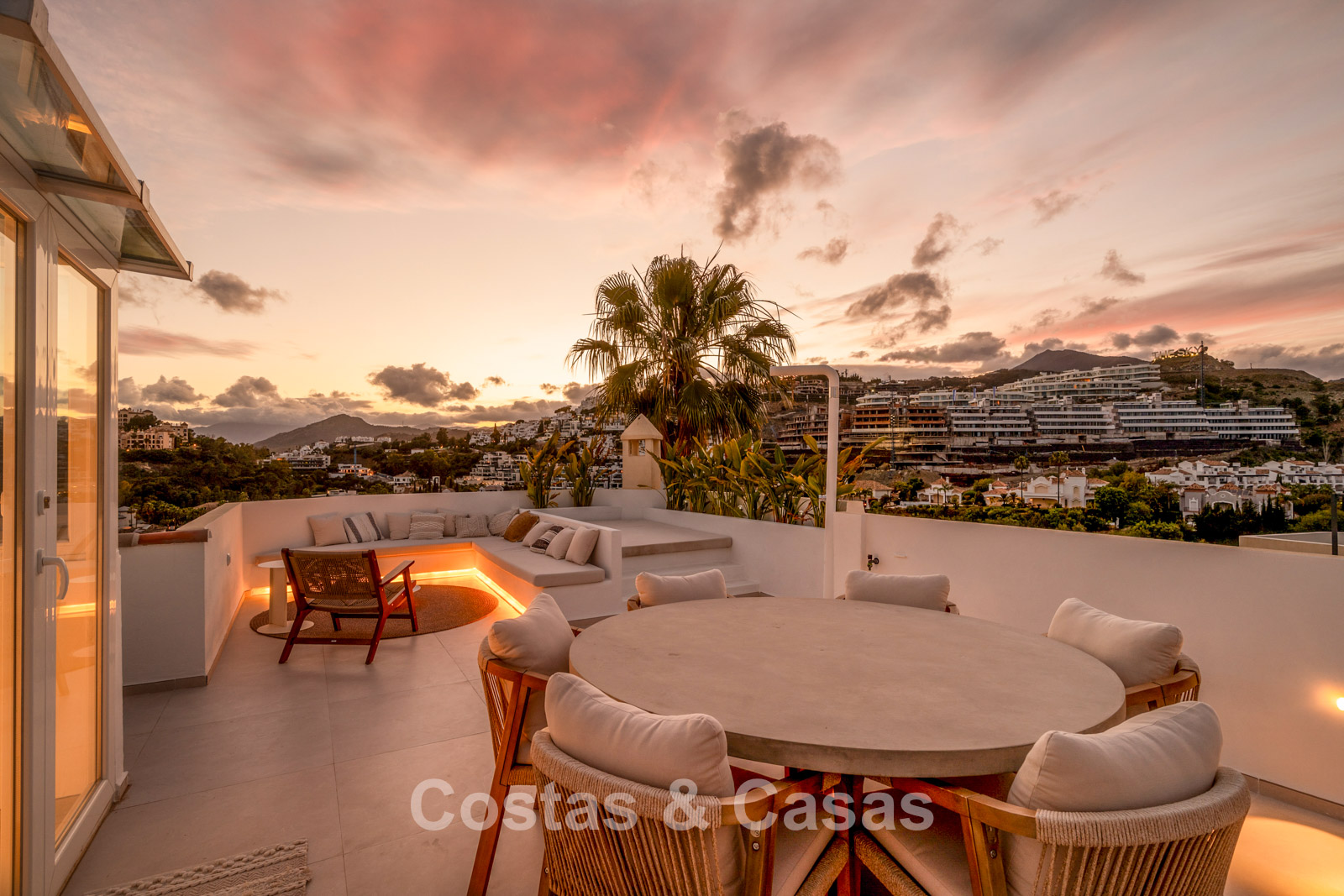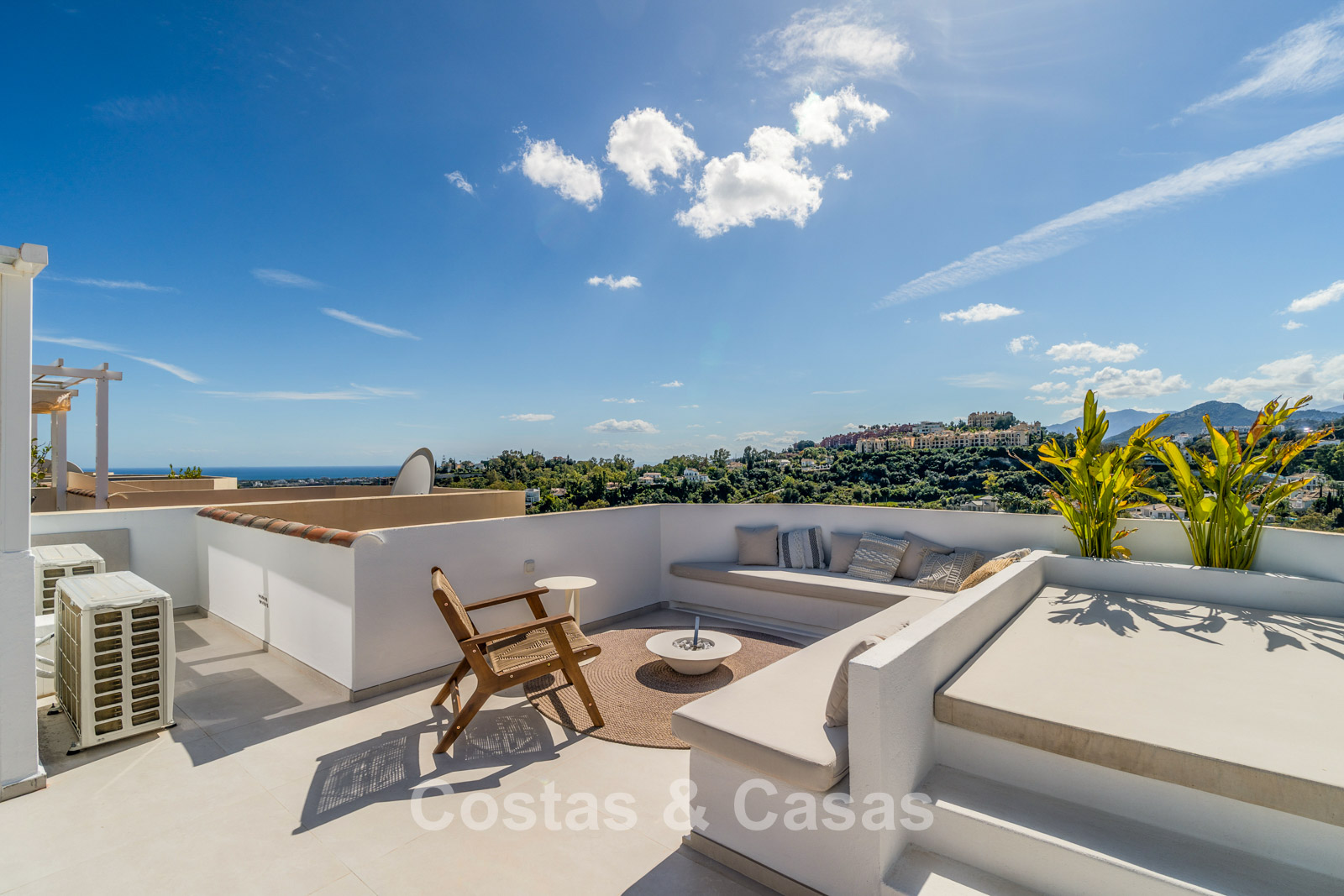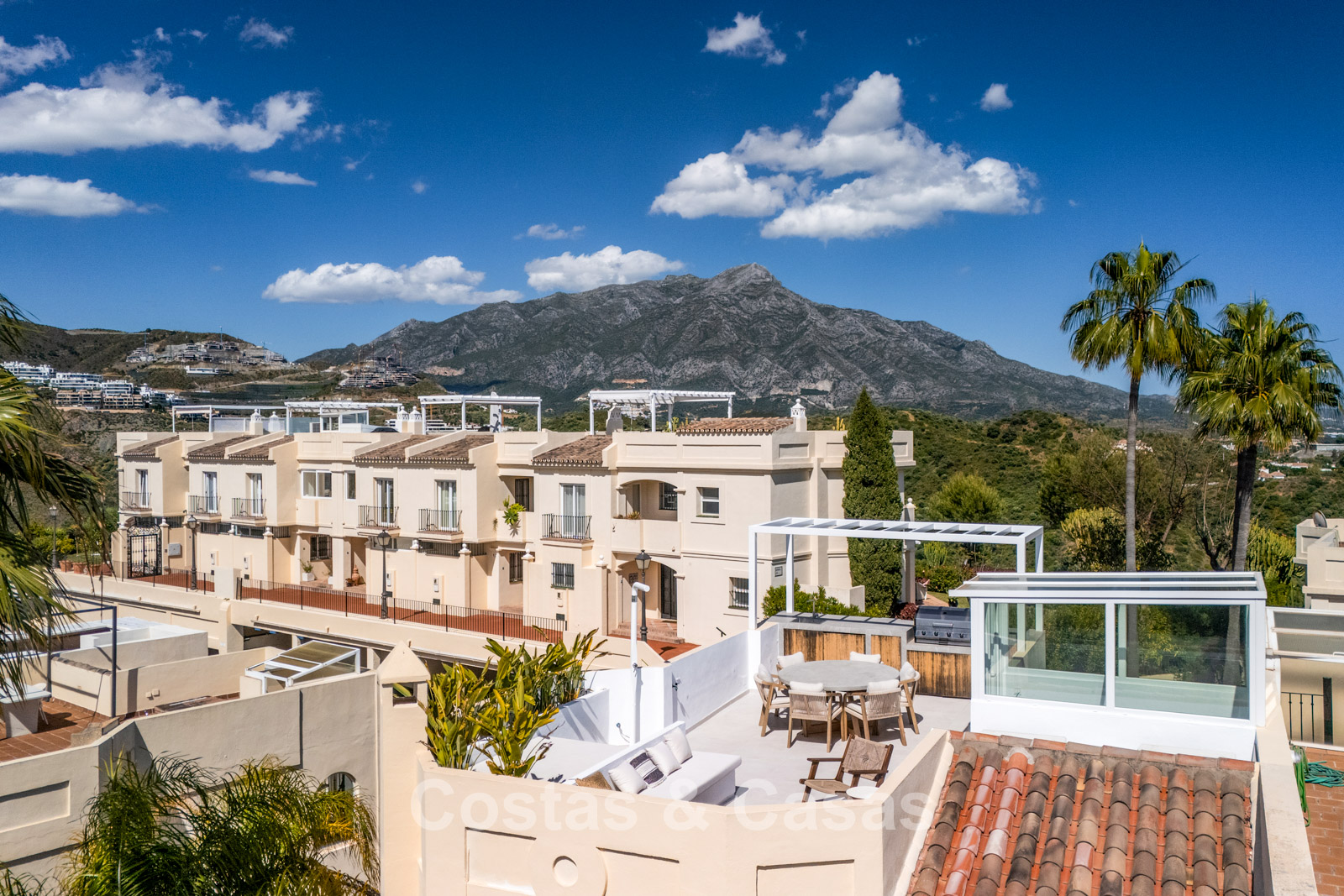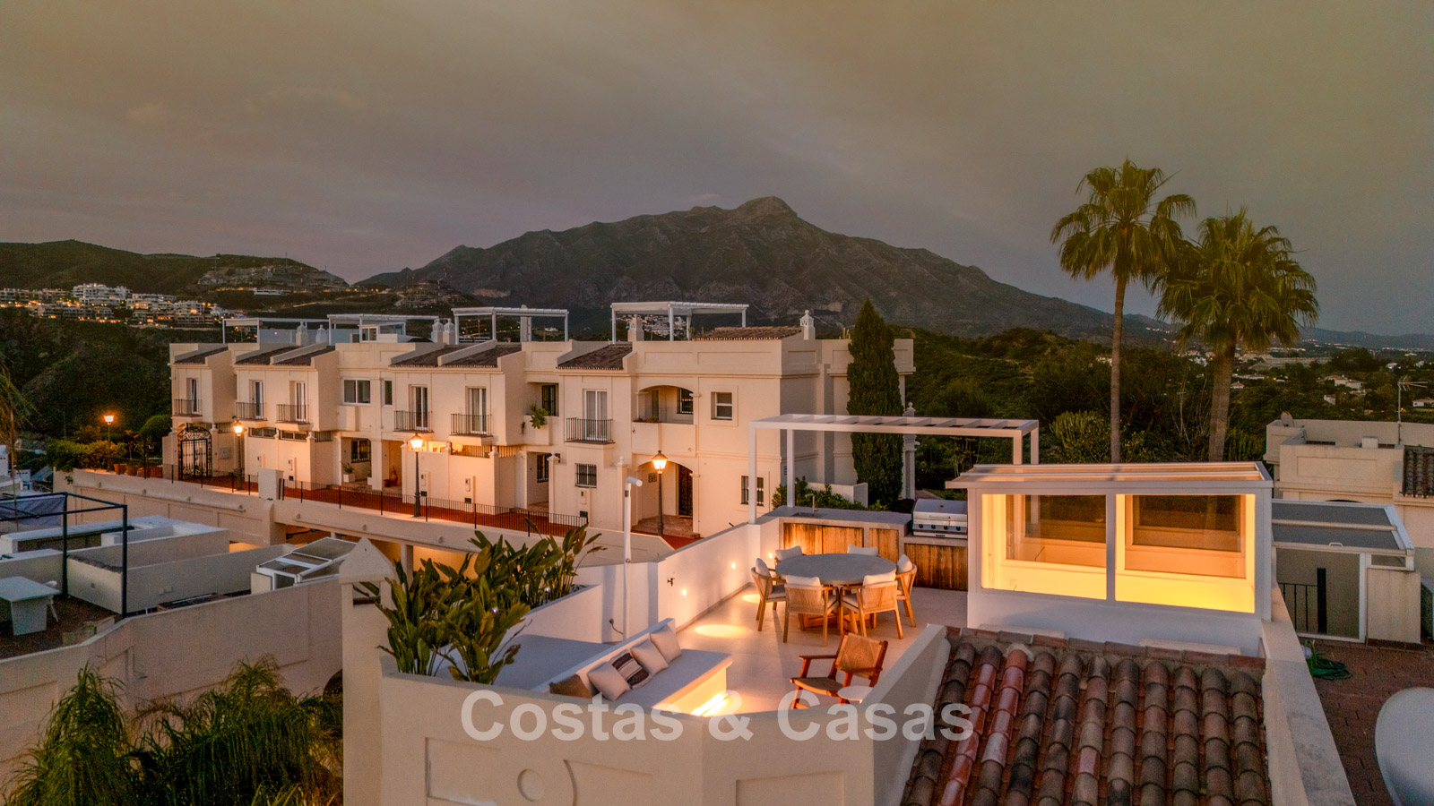Appartement duplex rénové avec soin, doté d’une vaste terrasse sur le toit. Finitions de très haute qualité. Solarium accueillant avec cuisine extérieure, espace repas et zones de détente. Intérieur contemporain avec une distribution ouverte. Magnifiques vues sur les paysages environnants, les parcours de golf de La Quinta, les montagnes et la mer. Spacieux salon comprenant un espace salle à manger et un coin détente. Cuisine ouverte haut de gamme équipée d’appareils Siemens et d’un îlot central. De larges baies vitrées assurent une luminosité naturelle abondante. 3 chambres et 2 salles de bains, dont une salle de bains familiale partagée. L’une des chambres est actuellement aménagée en élégant bureau à domicile. Carrelage de haute qualité.
