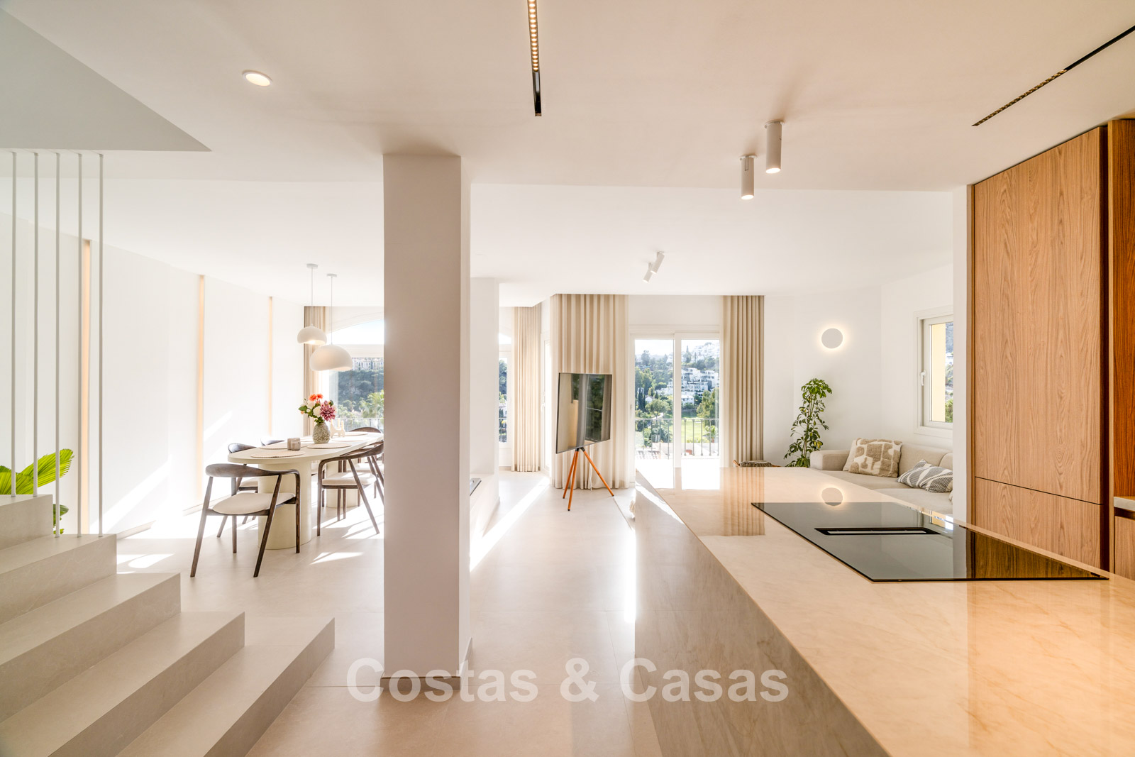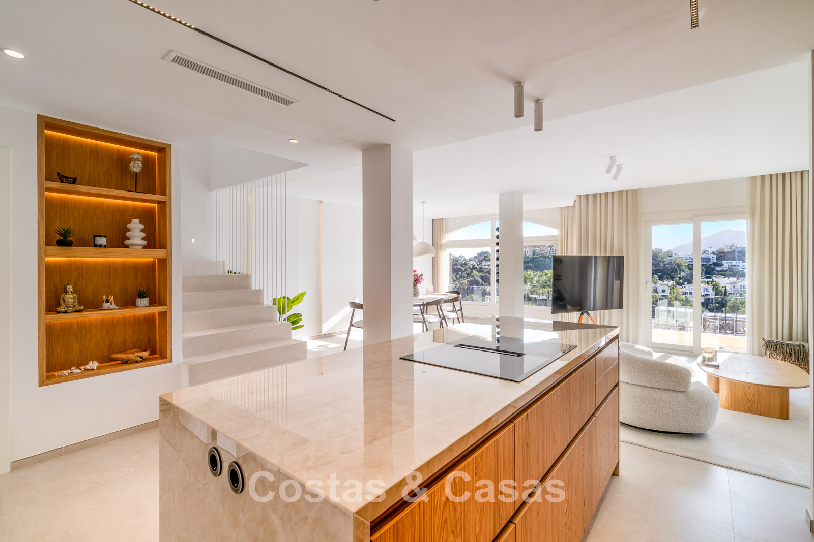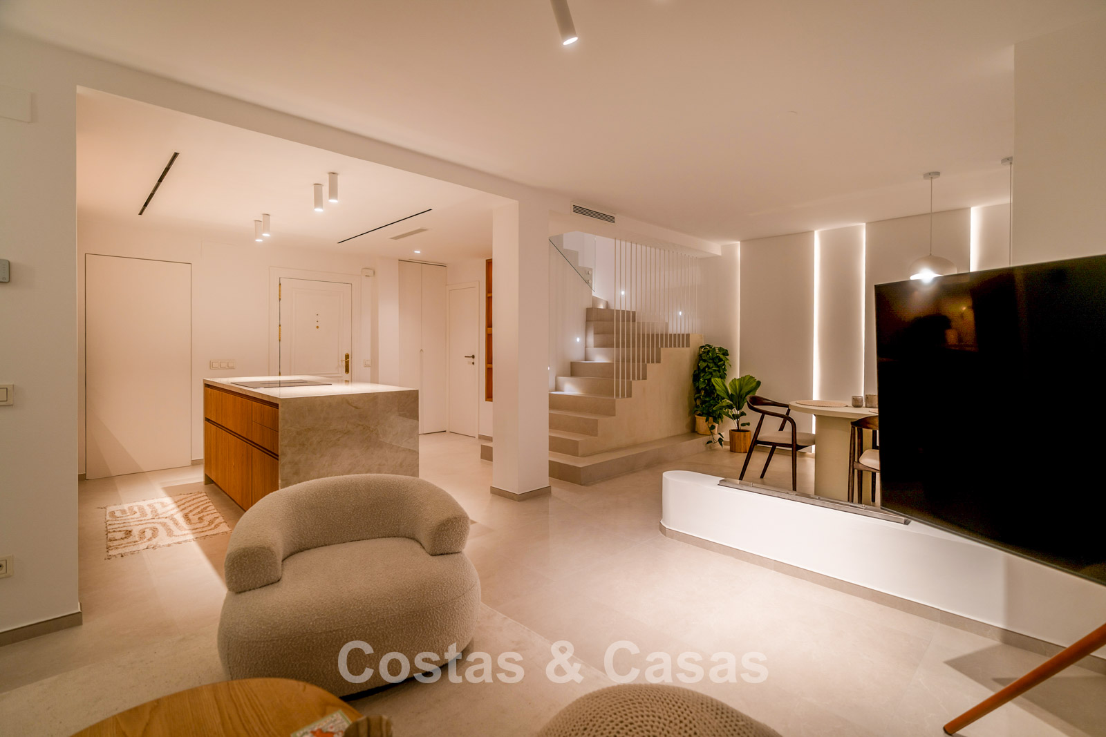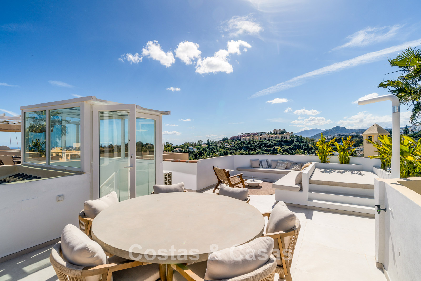 Appartement duplex rénové avec soin, doté d’une vaste terrasse sur le toit. Finitions de très haute qualité. Solarium accueillant avec cuisine extérieure, espace repas et zones de détente. Intérieur contemporain avec une distribution ouverte. Magnifiques vues sur les paysages environnants, les parcours de golf de La Quinta, les montagnes et la mer. Spacieux salon comprenant un espace salle à manger et un coin détente. Cuisine ouverte haut de gamme équipée d’appareils Siemens et d’un îlot central. De larges baies vitrées assurent une luminosité naturelle abondante. 3 chambres et 2 salles de bains, dont une salle de bains familiale partagée. L’une des chambres est actuellement aménagée en élégant bureau à domicile. Carrelage de haute qualité.