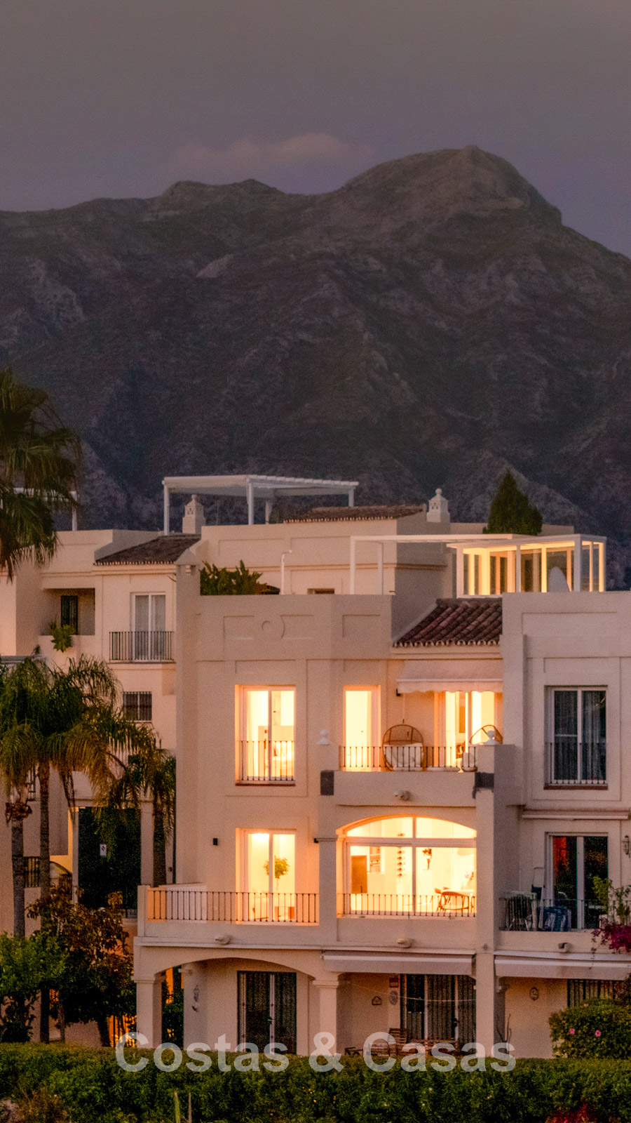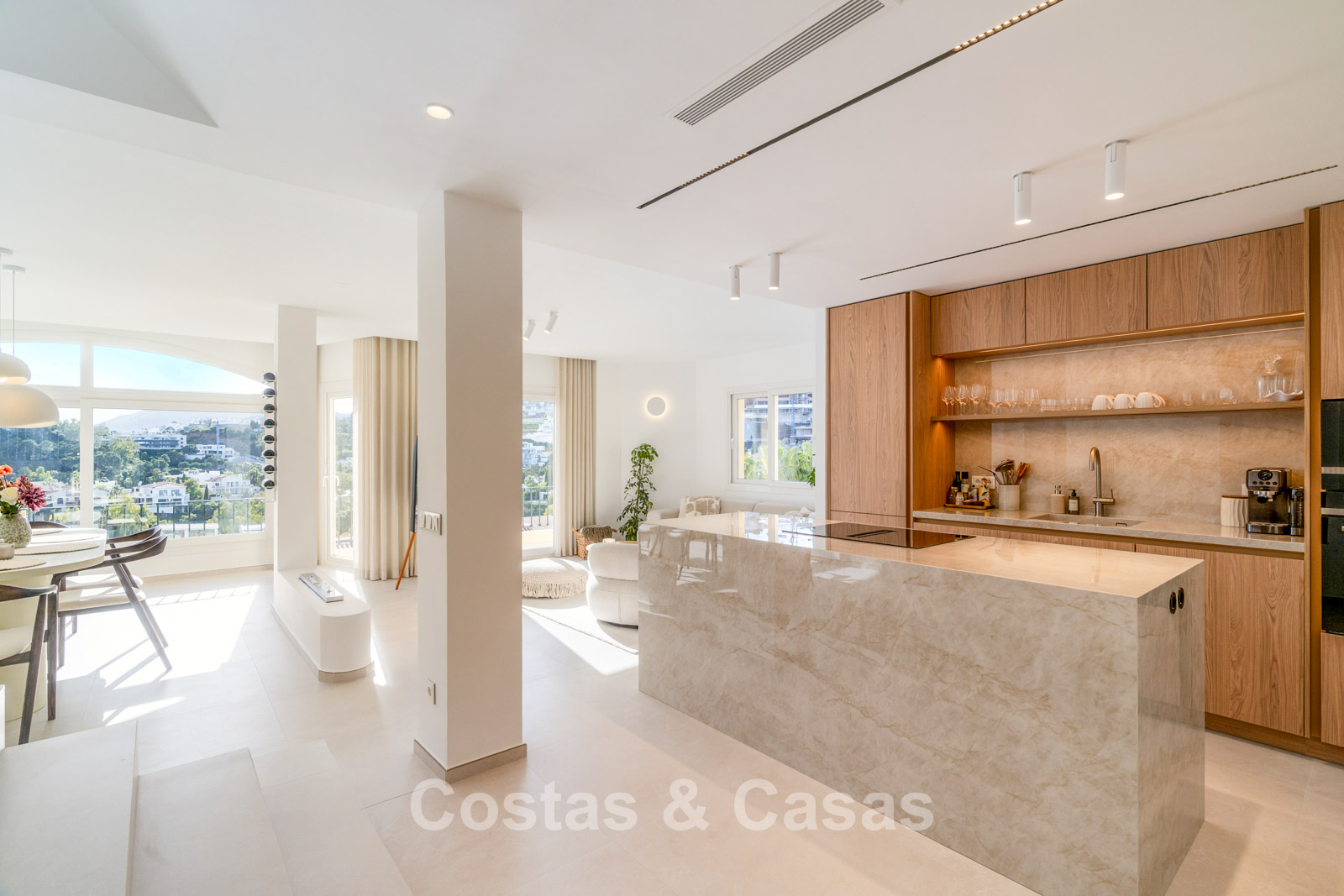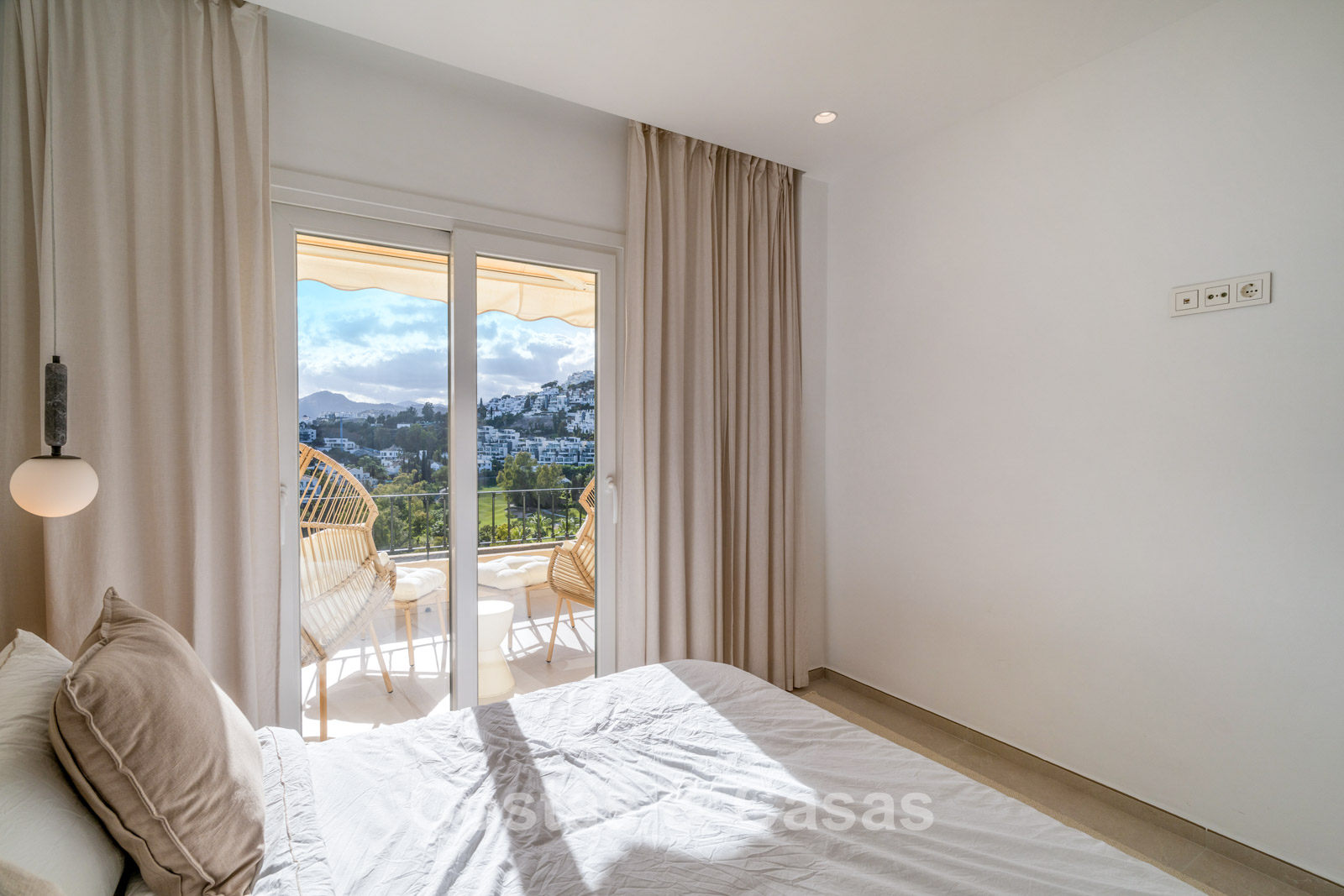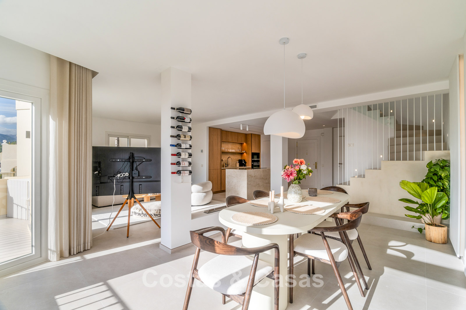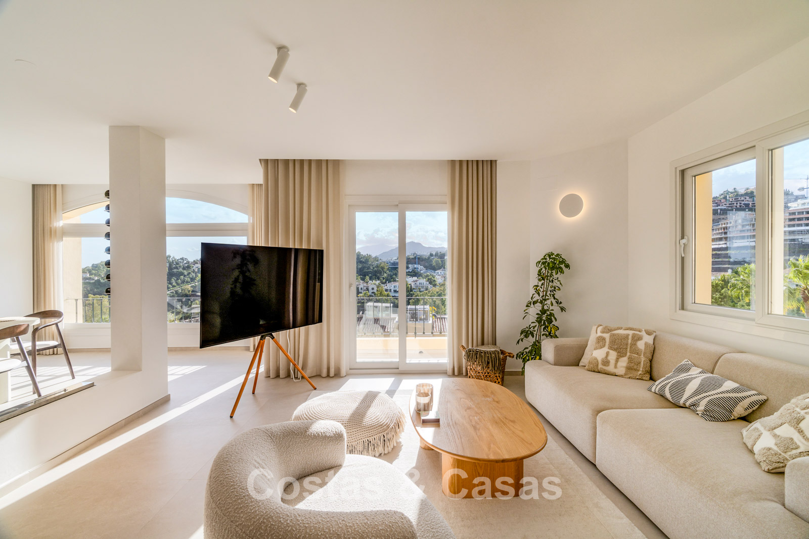 Appartement duplex rénové avec soin, doté d’une vaste terrasse sur le toit. Finitions de très haute qualité. Solarium accueillant avec cuisine extérieure, espace repas et zones de détente. Intérieur contemporain avec une distribution ouverte. Magnifiques vues sur les paysages environnants, les parcours de golf de La Quinta, les montagnes et la mer. Spacieux salon comprenant un espace salle à manger et un coin détente. Cuisine ouverte haut de gamme équipée d’appareils Siemens et d’un îlot central. De larges baies vitrées assurent une luminosité naturelle abondante. 3 chambres et 2 salles de bains, dont une salle de bains familiale partagée. L’une des chambres est actuellement aménagée en élégant bureau à domicile. Carrelage de haute qualité.