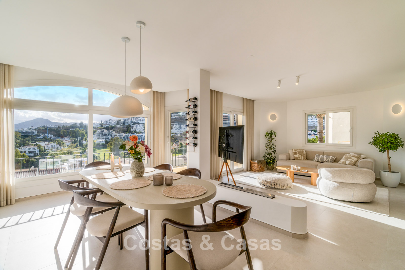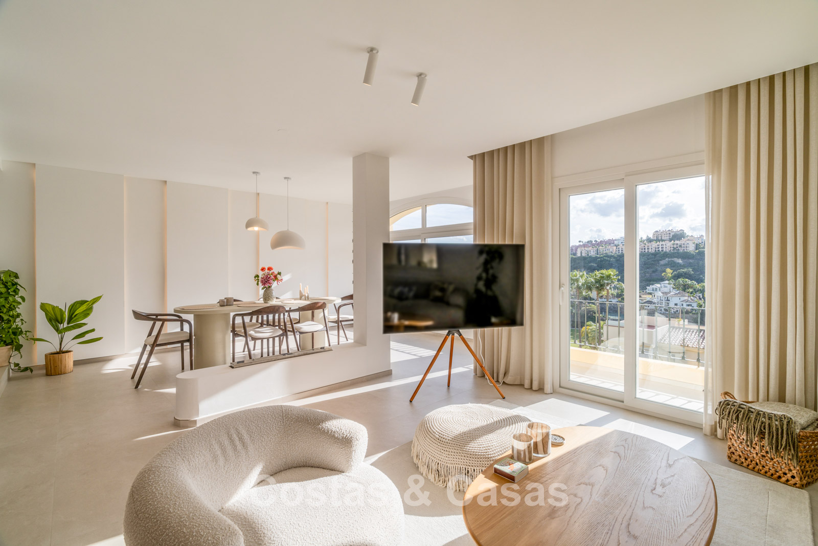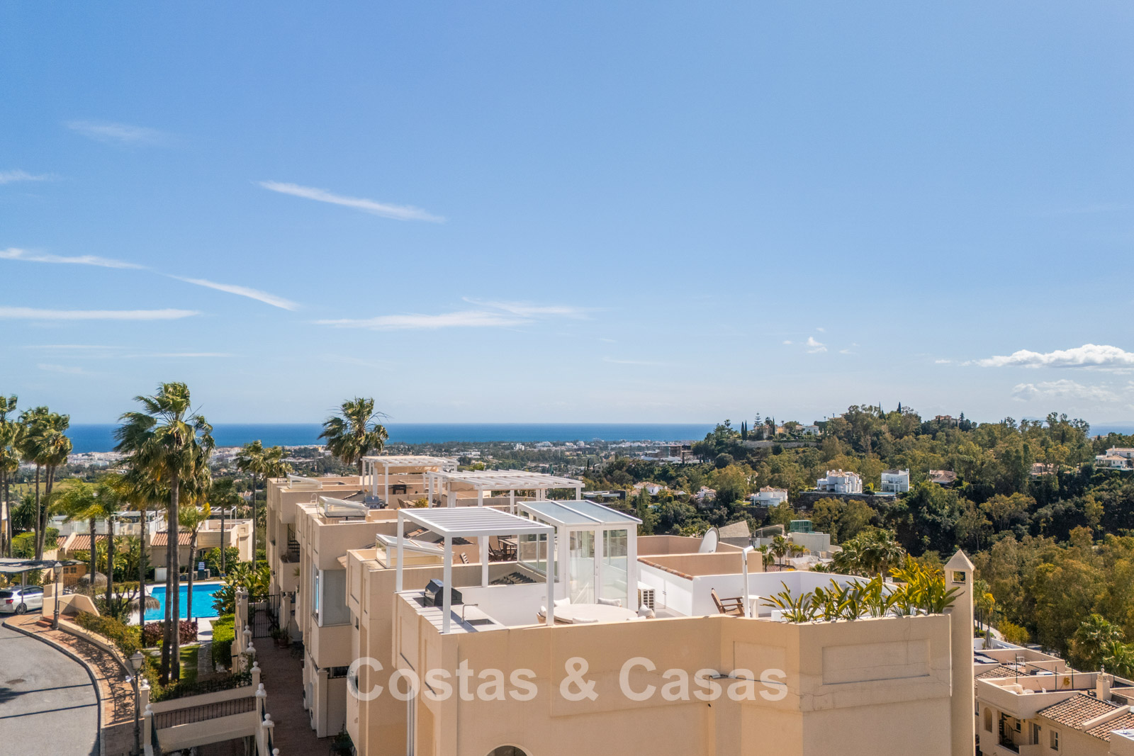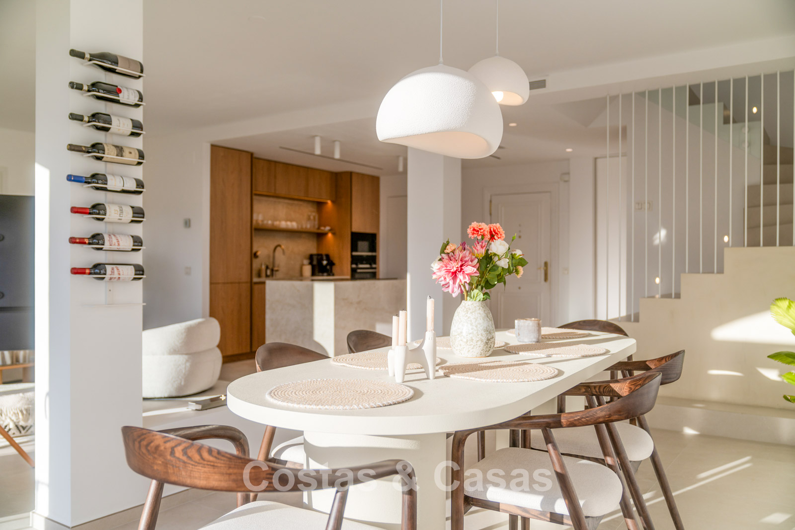 Appartement duplex rénové avec soin, doté d’une vaste terrasse sur le toit. Finitions de très haute qualité. Solarium accueillant avec cuisine extérieure, espace repas et zones de détente. Intérieur contemporain avec une distribution ouverte. Magnifiques vues sur les paysages environnants, les parcours de golf de La Quinta, les montagnes et la mer. Spacieux salon comprenant un espace salle à manger et un coin détente. Cuisine ouverte haut de gamme équipée d’appareils Siemens et d’un îlot central. De larges baies vitrées assurent une luminosité naturelle abondante. 3 chambres et 2 salles de bains, dont une salle de bains familiale partagée. L’une des chambres est actuellement aménagée en élégant bureau à domicile. Carrelage de haute qualité.