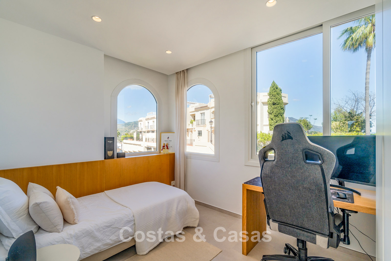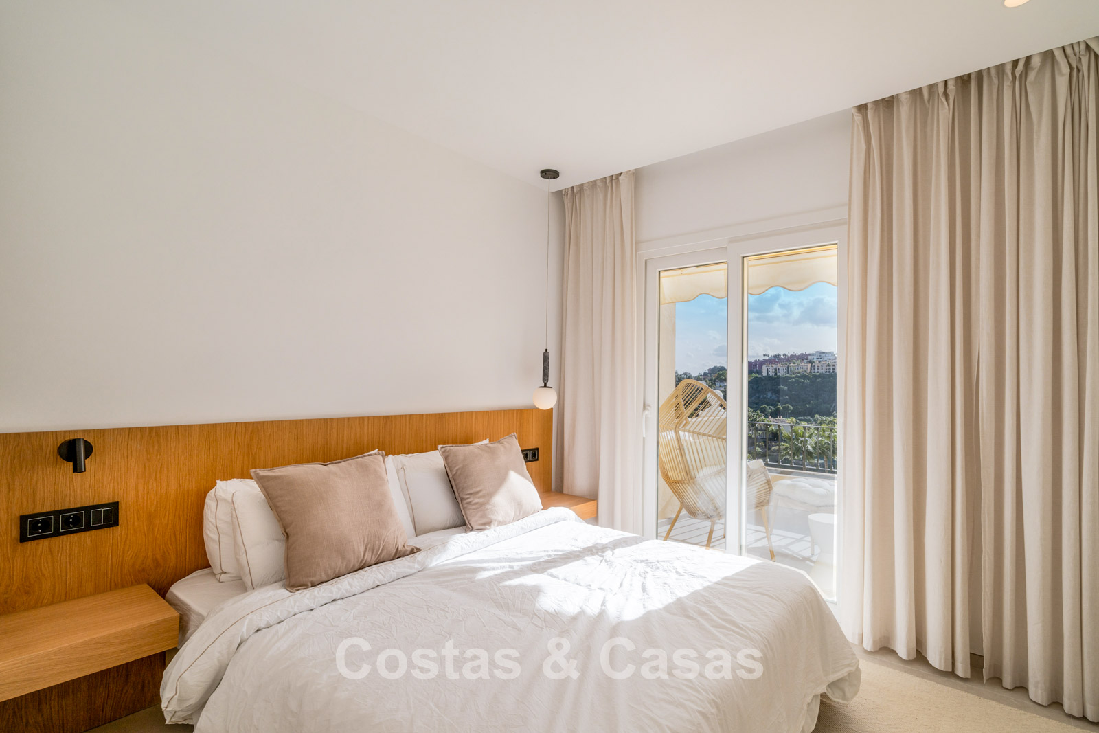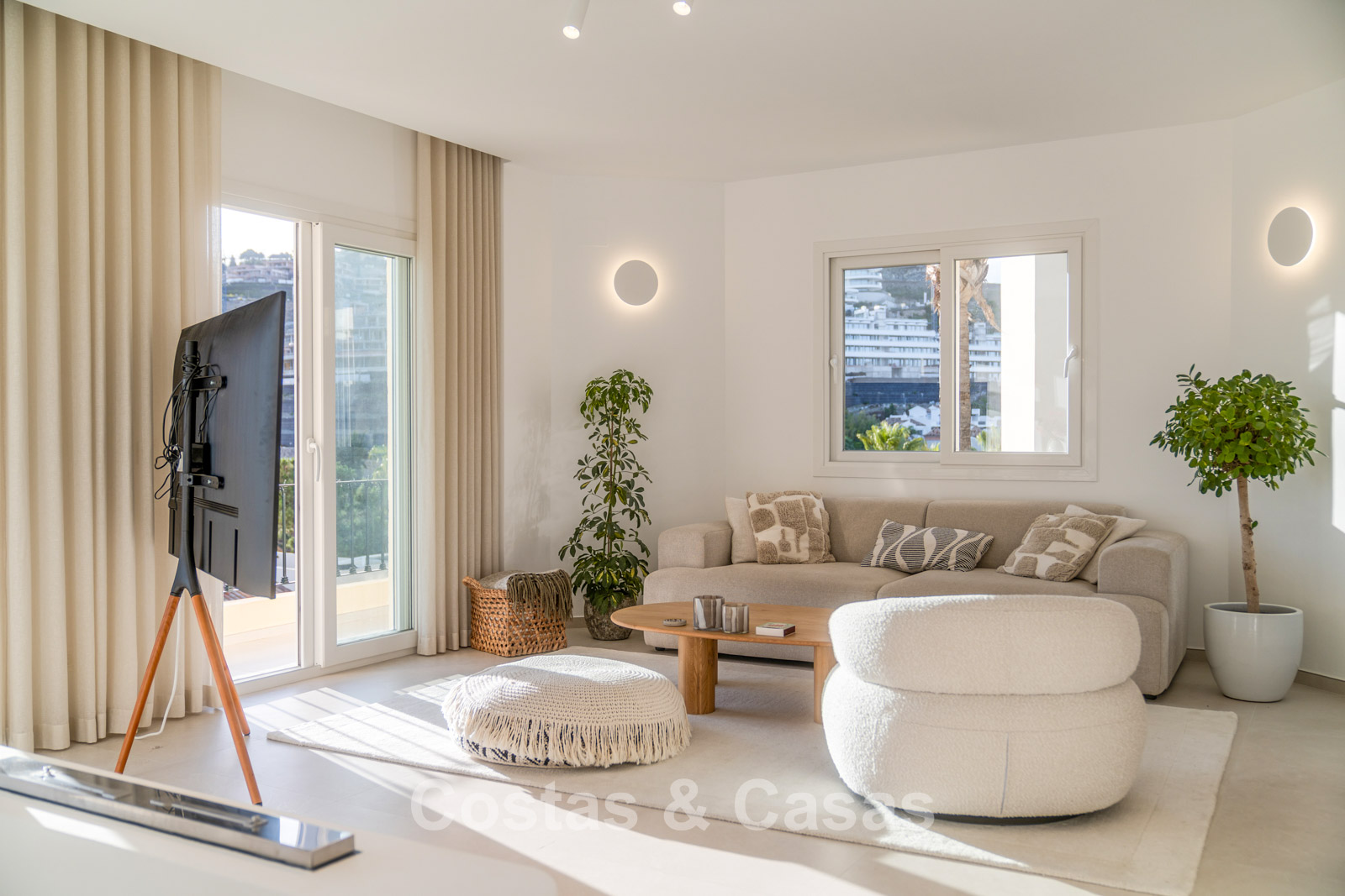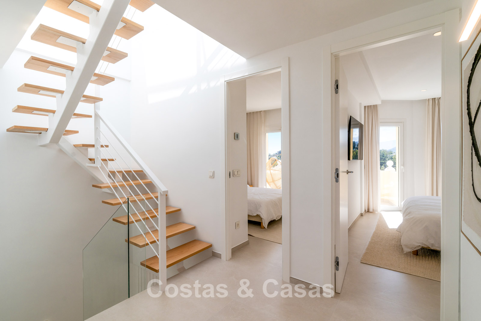Appartement duplex rénové avec soin, doté d’une vaste terrasse sur le toit. Finitions de très haute qualité. Solarium accueillant avec cuisine extérieure, espace repas et zones de détente. Intérieur contemporain avec une distribution ouverte. Magnifiques vues sur les paysages environnants, les parcours de golf de La Quinta, les montagnes et la mer. Spacieux salon comprenant un espace salle à manger et un coin détente. Cuisine ouverte haut de gamme équipée d’appareils Siemens et d’un îlot central. De larges baies vitrées assurent une luminosité naturelle abondante. 3 chambres et 2 salles de bains, dont une salle de bains familiale partagée. L’une des chambres est actuellement aménagée en élégant bureau à domicile. Carrelage de haute qualité.