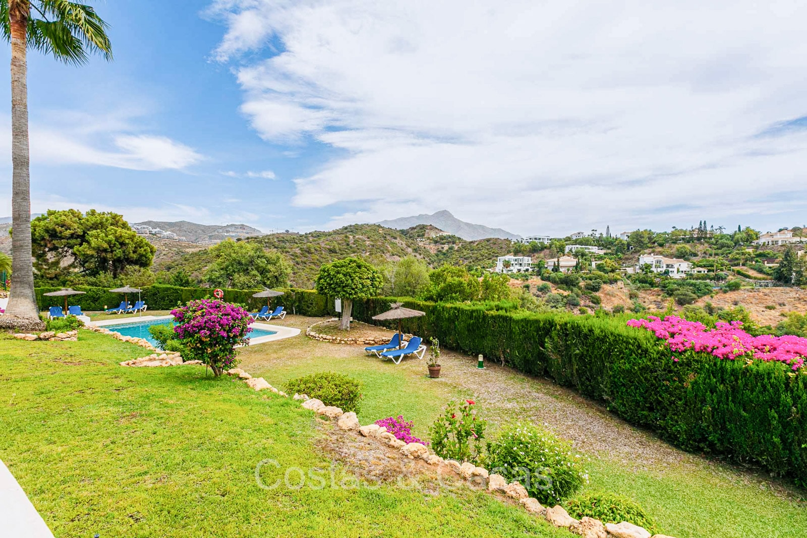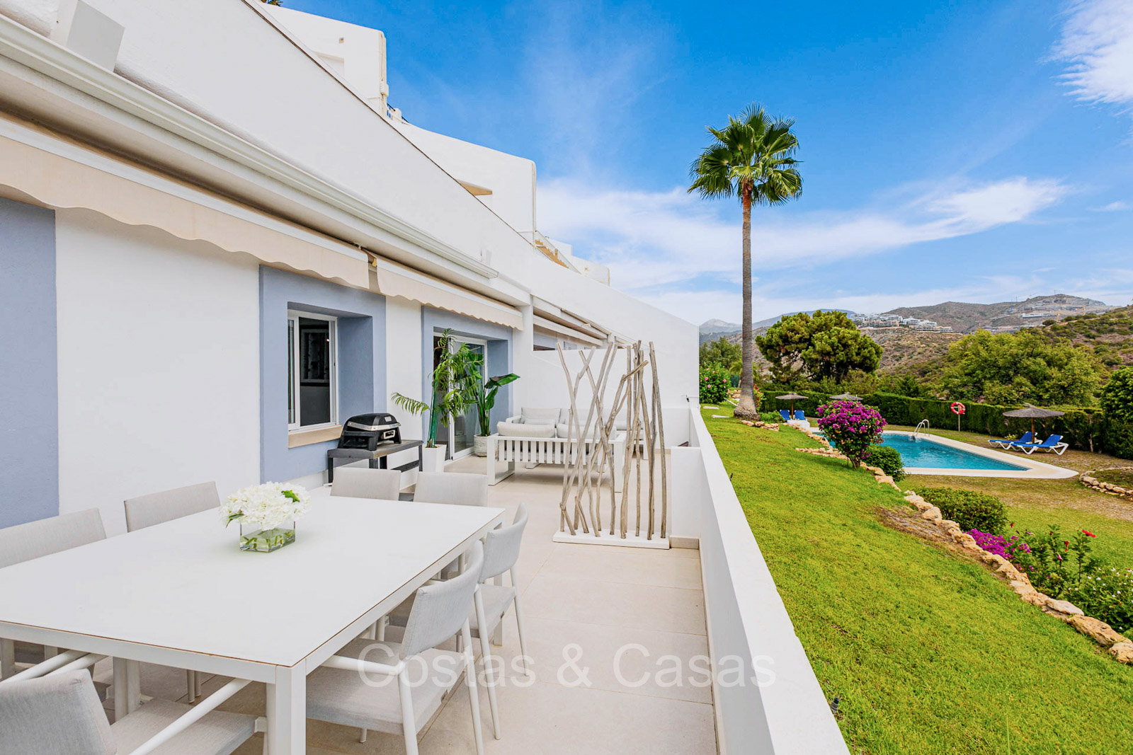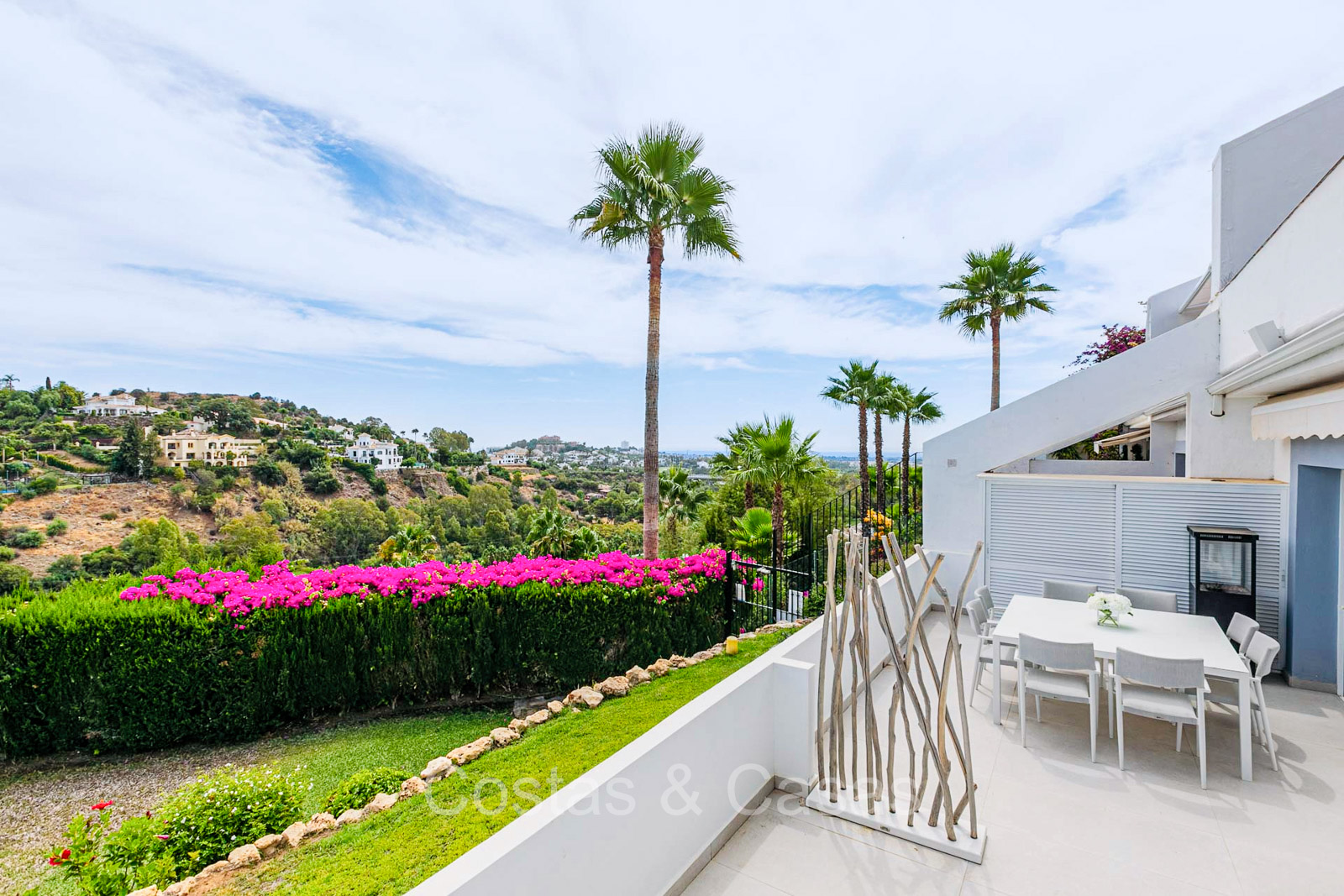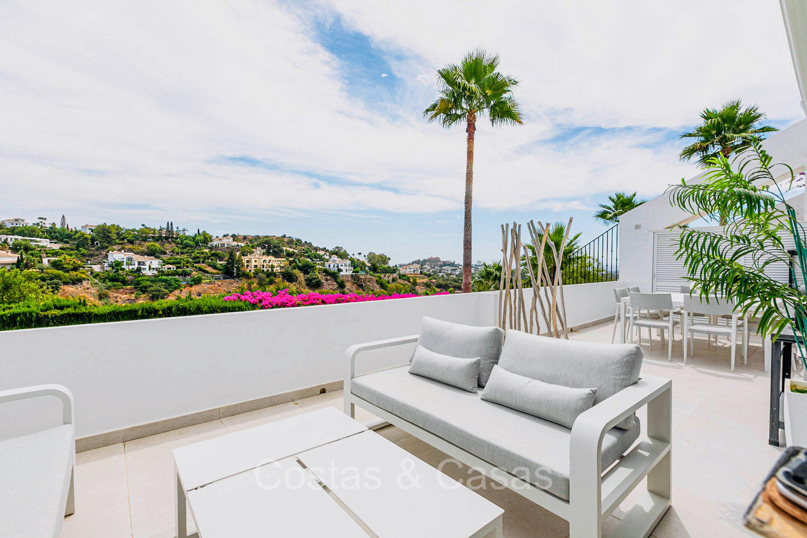 Appartement au rez-de-chaussée dans une position surélevée. Le charmant complexe résidentiel présente une architecture andalouse traditionnelle. Soigneusement rénové avec un souci du design luxueux. Orienté vers l'est. Belles vues dégagées sur la montagne de La Concha et en partie sur la mer. De hautes fenêtres coulissantes s'ouvrent sur la terrasse ensoleillée. Espace de vie ouvert. Cuisine ouverte avec appareils Siemens et un grand îlot de cuisson central où vous pouvez vous asseoir. A côté se trouve une pièce séparée et confortable, aménagée en salon de télévision. 3 chambres, 2 salles de bains et une toilette séparée. Sols de qualité de couleur crème. Buanderie séparée. Places de parking dans le parking commun du complexe.