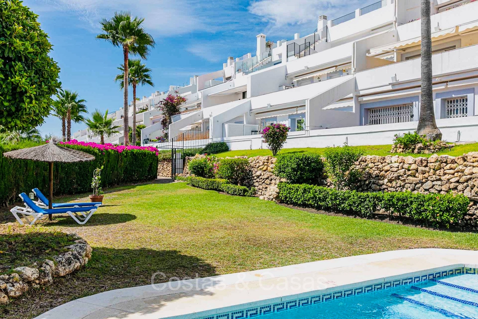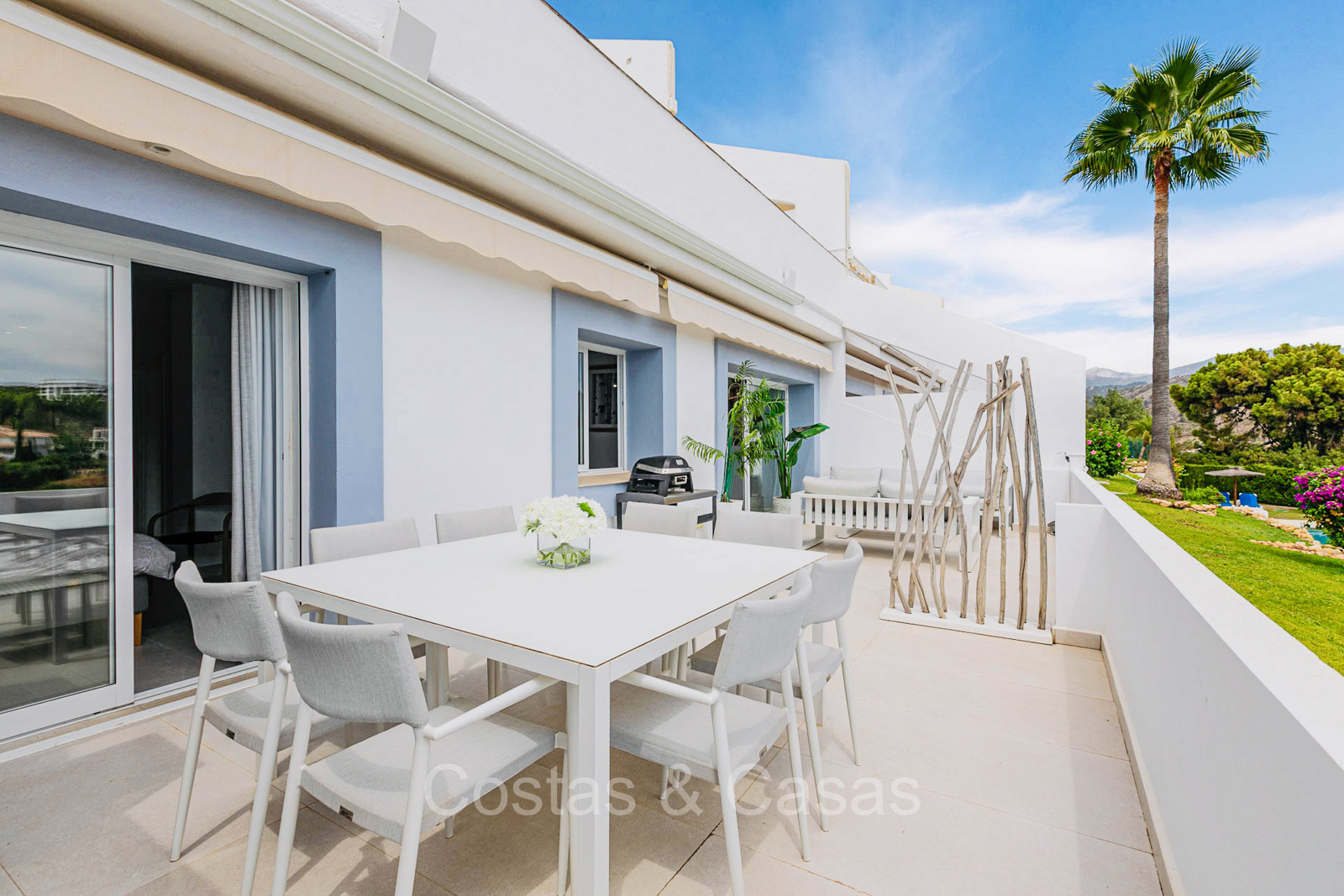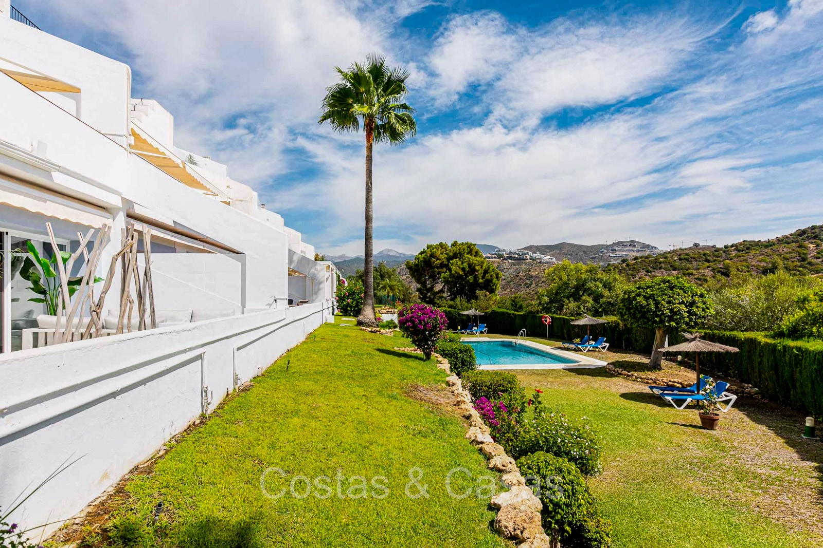 Appartement au rez-de-chaussée dans une position surélevée. Le charmant complexe résidentiel présente une architecture andalouse traditionnelle. Soigneusement rénové avec un souci du design luxueux. Orienté vers l'est. Belles vues dégagées sur la montagne de La Concha et en partie sur la mer. De hautes fenêtres coulissantes s'ouvrent sur la terrasse ensoleillée. Espace de vie ouvert. Cuisine ouverte avec appareils Siemens et un grand îlot de cuisson central où vous pouvez vous asseoir. A côté se trouve une pièce séparée et confortable, aménagée en salon de télévision. 3 chambres, 2 salles de bains et une toilette séparée. Sols de qualité de couleur crème. Buanderie séparée. Places de parking dans le parking commun du complexe.