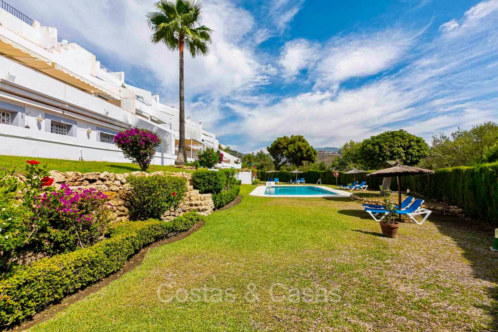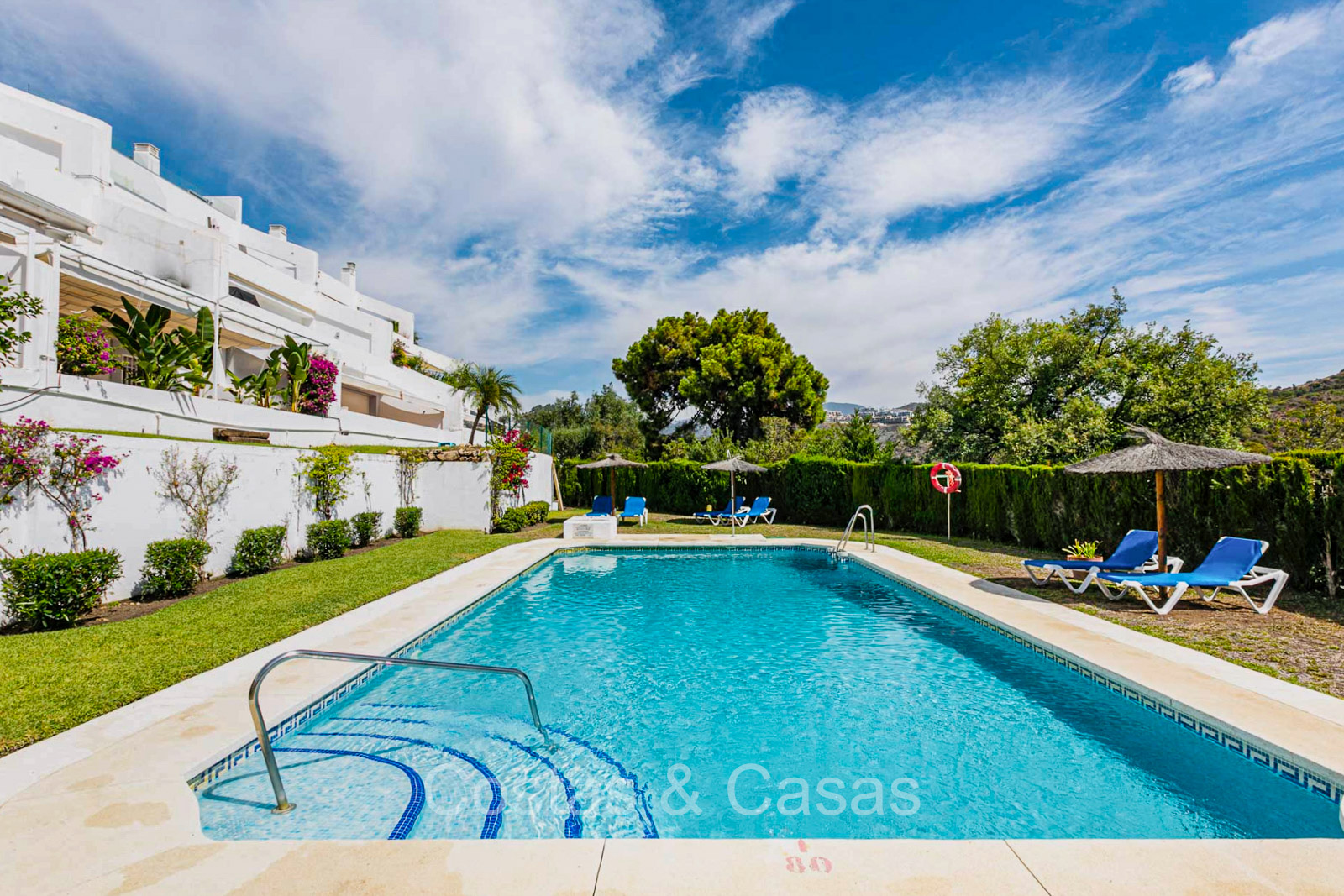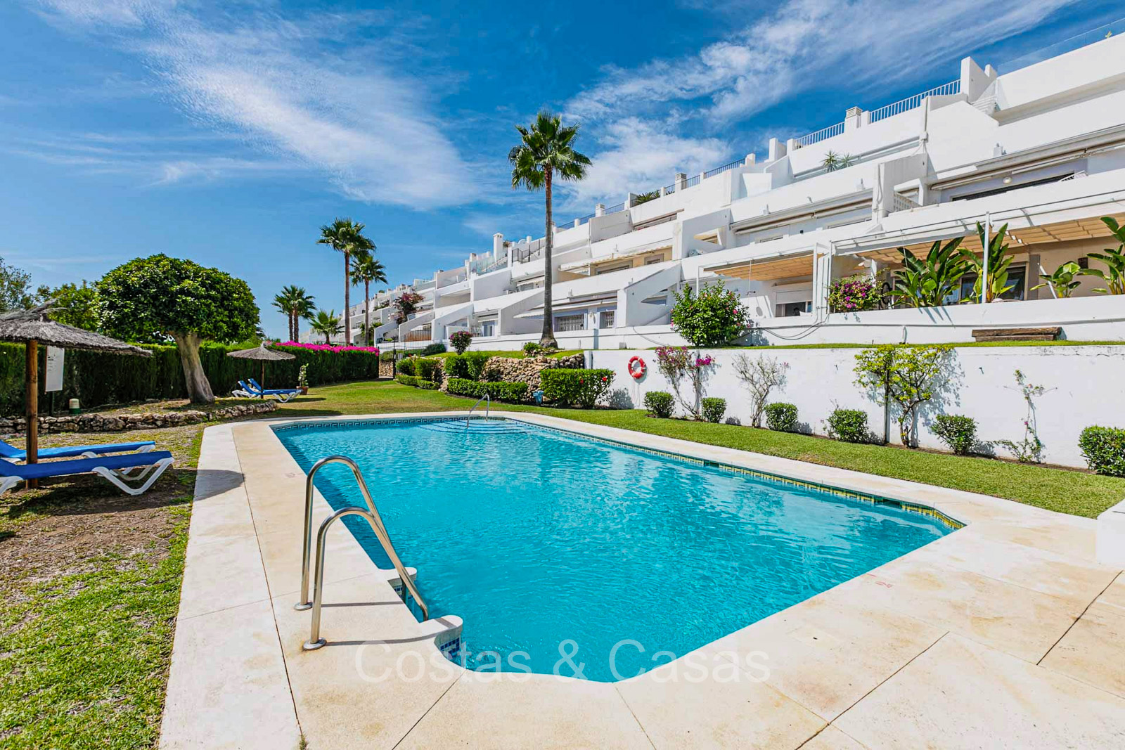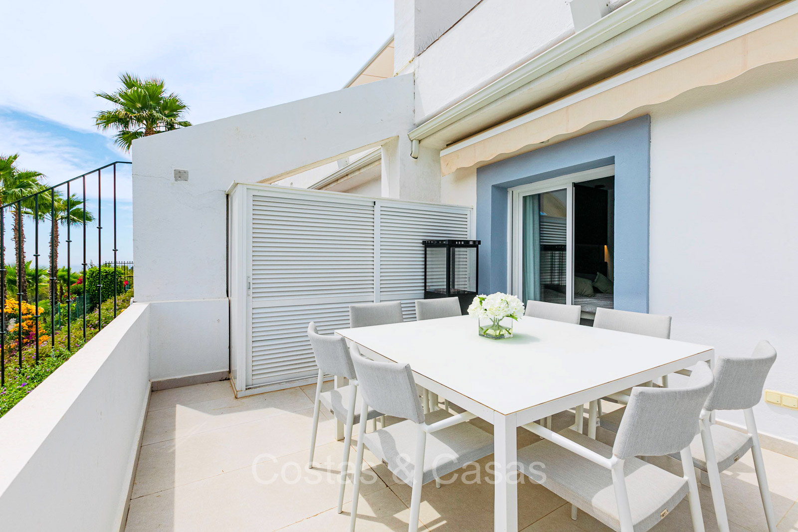 Appartement au rez-de-chaussée dans une position surélevée. Le charmant complexe résidentiel présente une architecture andalouse traditionnelle. Soigneusement rénové avec un souci du design luxueux. Orienté vers l'est. Belles vues dégagées sur la montagne de La Concha et en partie sur la mer. De hautes fenêtres coulissantes s'ouvrent sur la terrasse ensoleillée. Espace de vie ouvert. Cuisine ouverte avec appareils Siemens et un grand îlot de cuisson central où vous pouvez vous asseoir. A côté se trouve une pièce séparée et confortable, aménagée en salon de télévision. 3 chambres, 2 salles de bains et une toilette séparée. Sols de qualité de couleur crème. Buanderie séparée. Places de parking dans le parking commun du complexe.