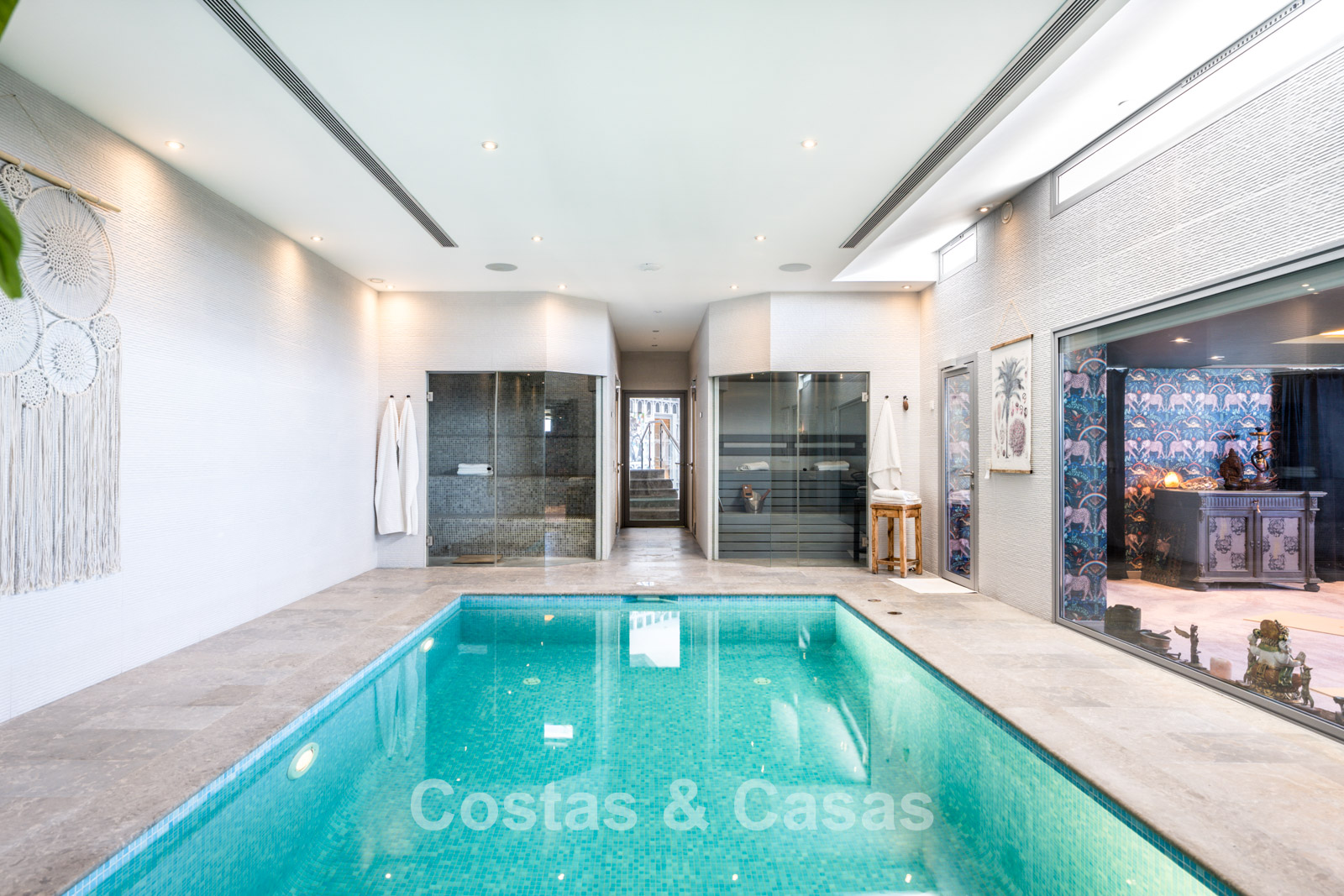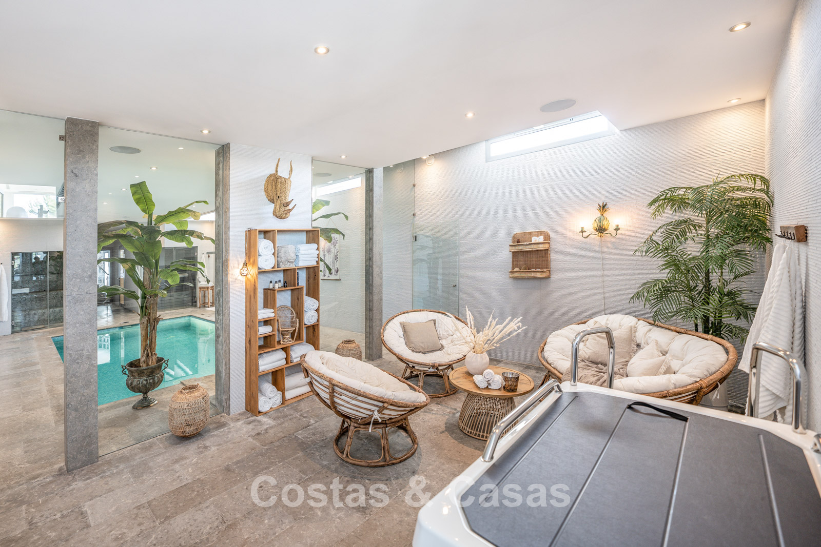 Ascenseur. Fenêtres du sol au plafond. Balustrades en verre. Climatisation. Chauffage par le sol dans toute la villa, à l'exception du garage. Cheminée à l'éthanol. Appareils de cuisine Miele. Système de domotique. Système Dolby Stereo Surround. Volets électriques. Armoires encastrées. Panneaux solaires. Système d'alarme. TÉLÉVISION EN CIRCUIT FERMÉ (CCTV) Respectueux de l'environnement. Accessible aux handicapés. Entièrement meublée.