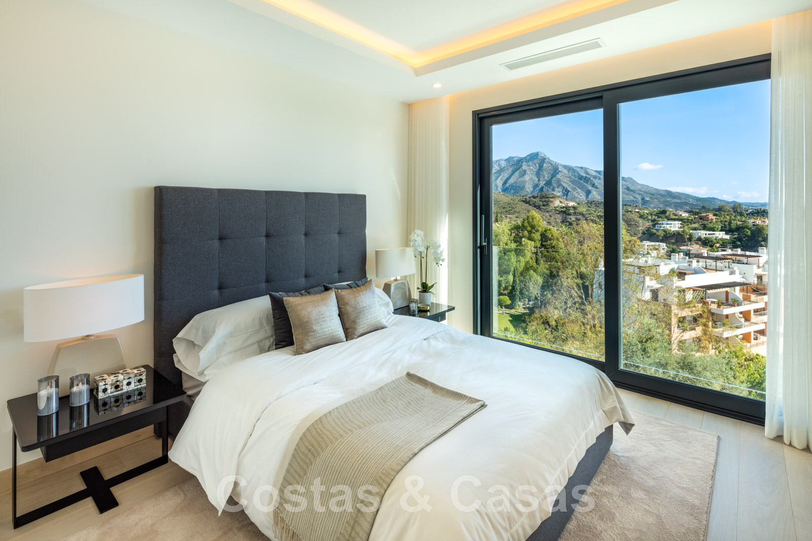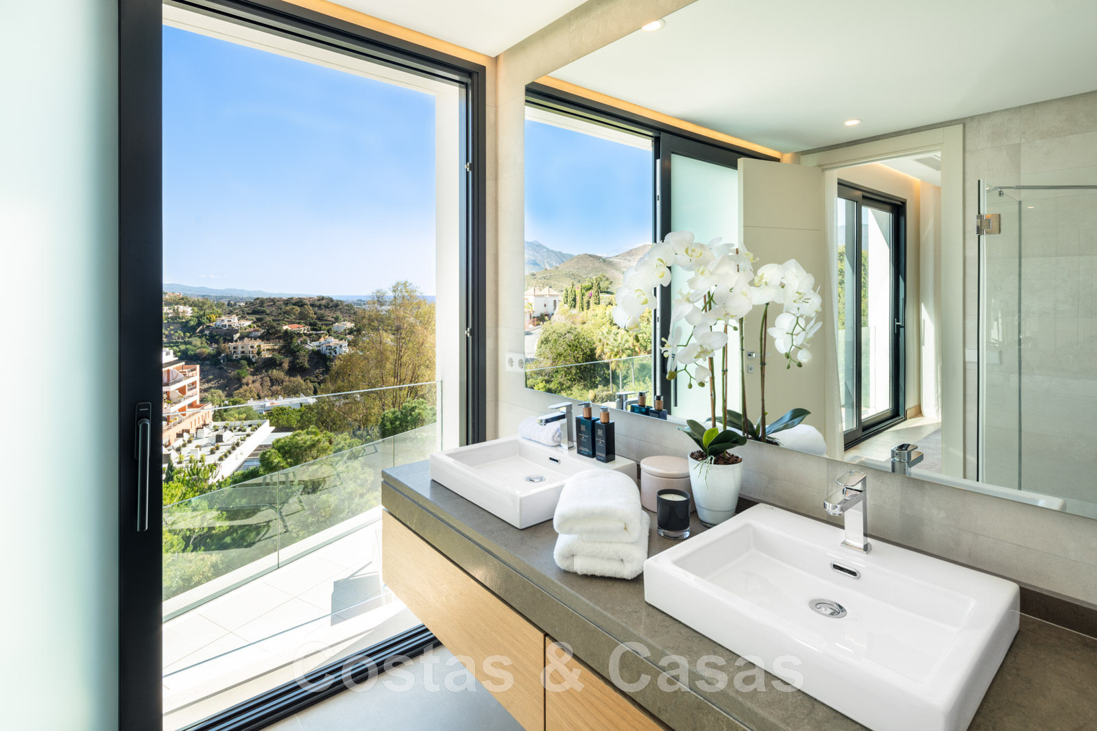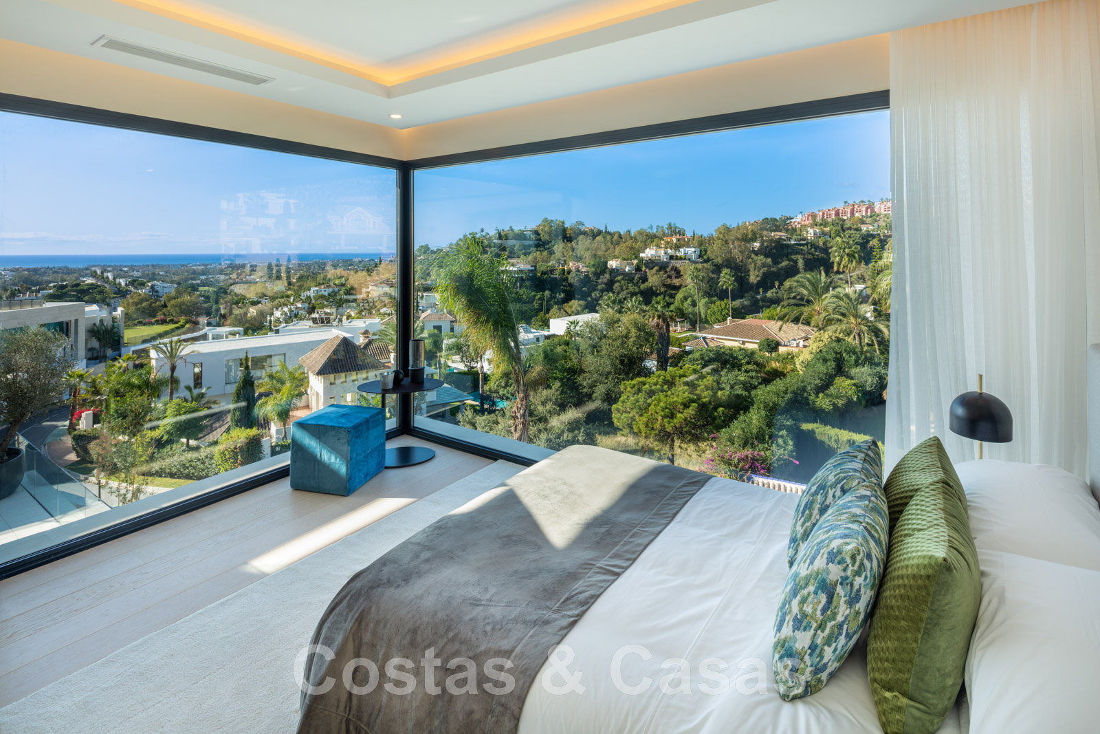 La chambre principale, avec sa salle de bains, jouit d'une vue imprenable sur la mer et dispose d'une terrasse privée.
