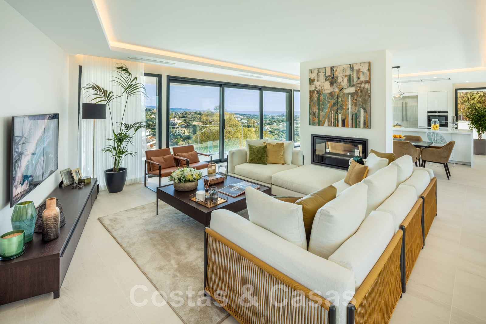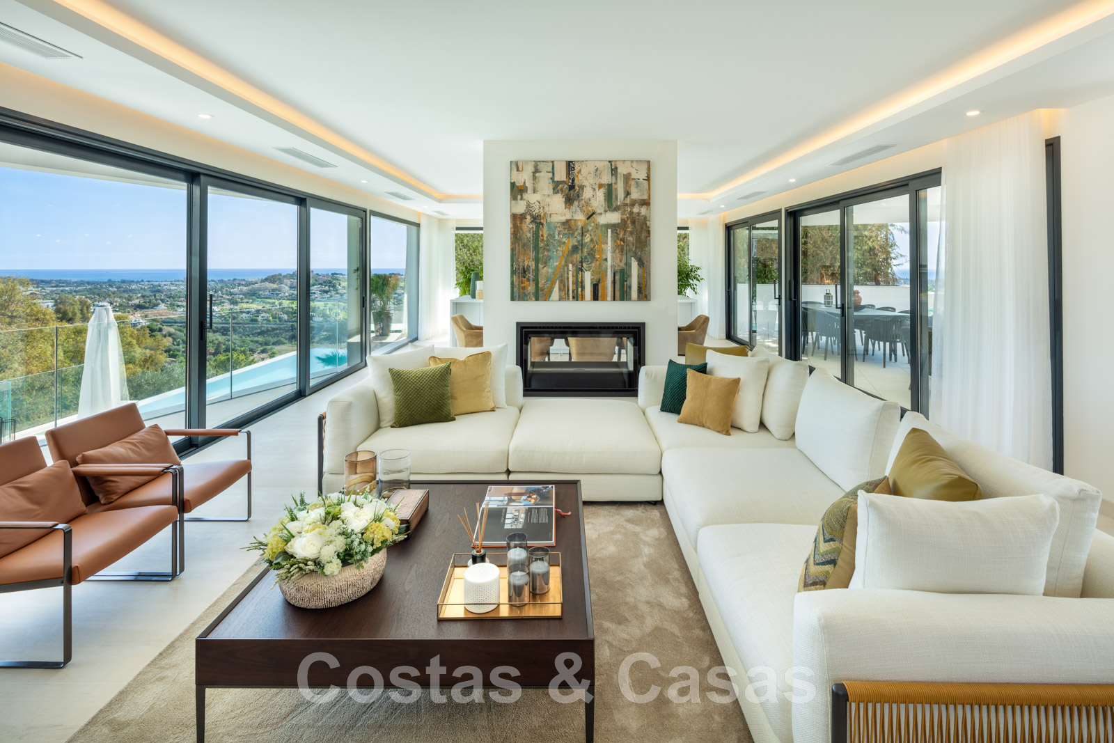 Espace de vie ouvert avec salon équipé d'une cheminée, table à manger et accès direct aux espaces extérieurs.