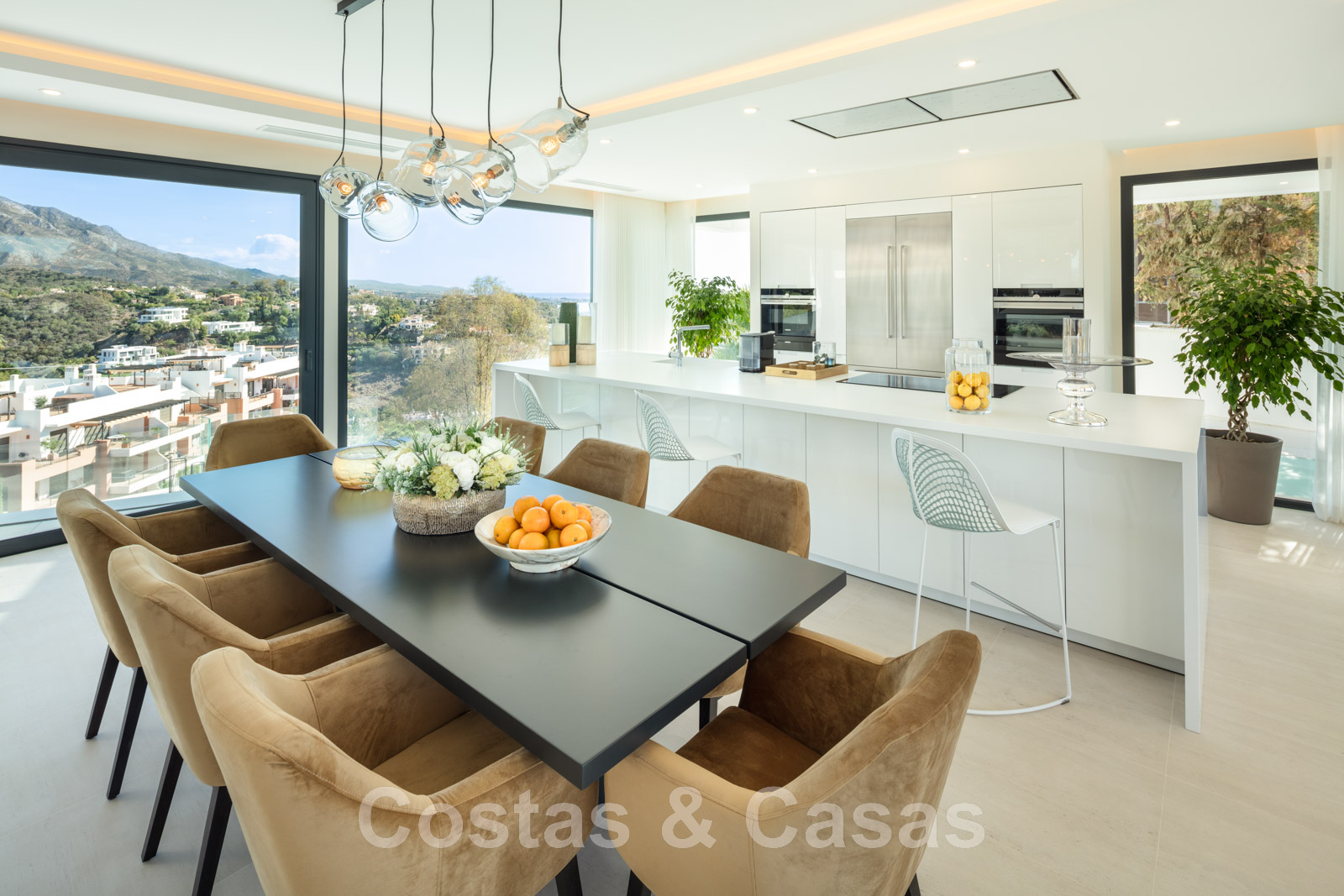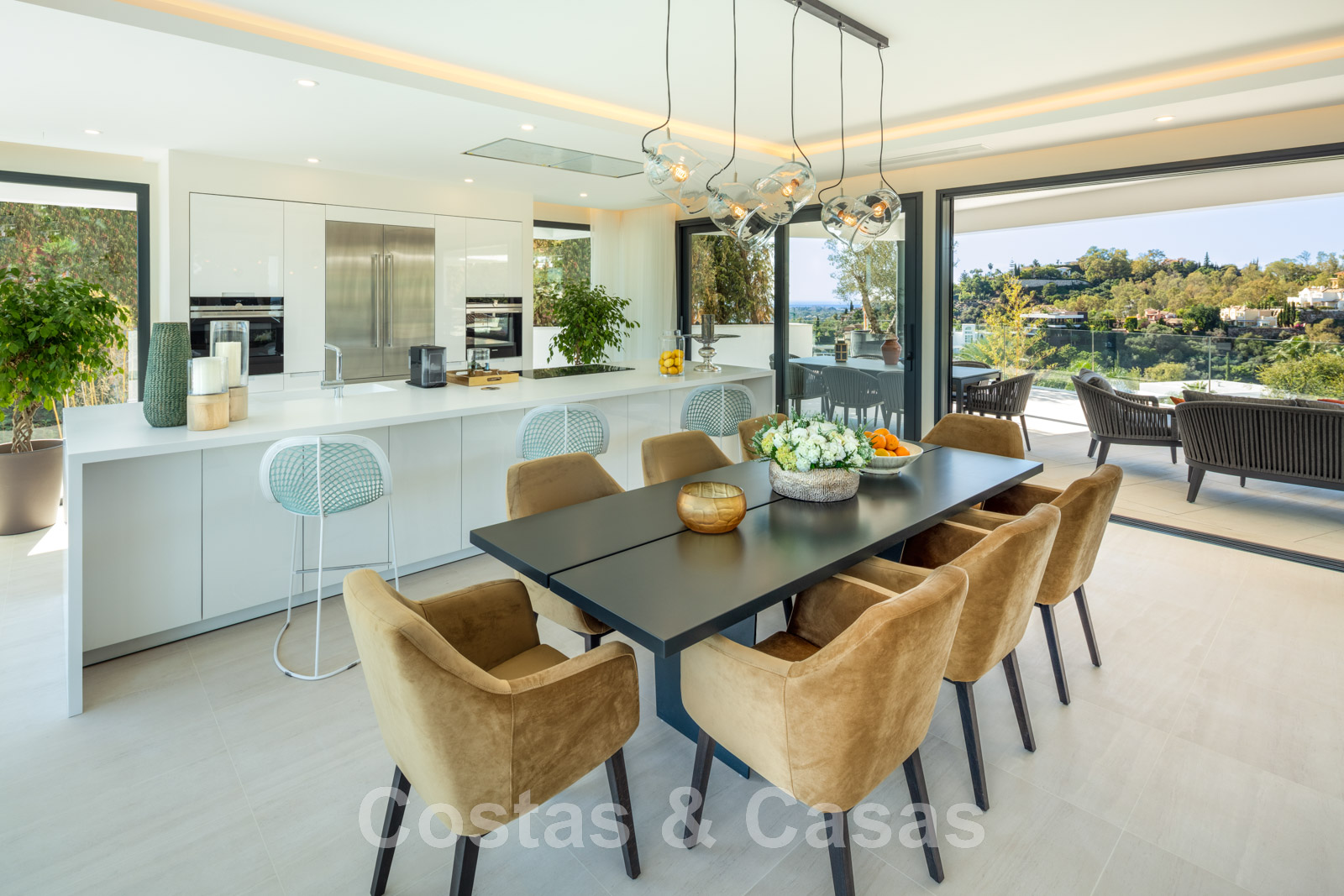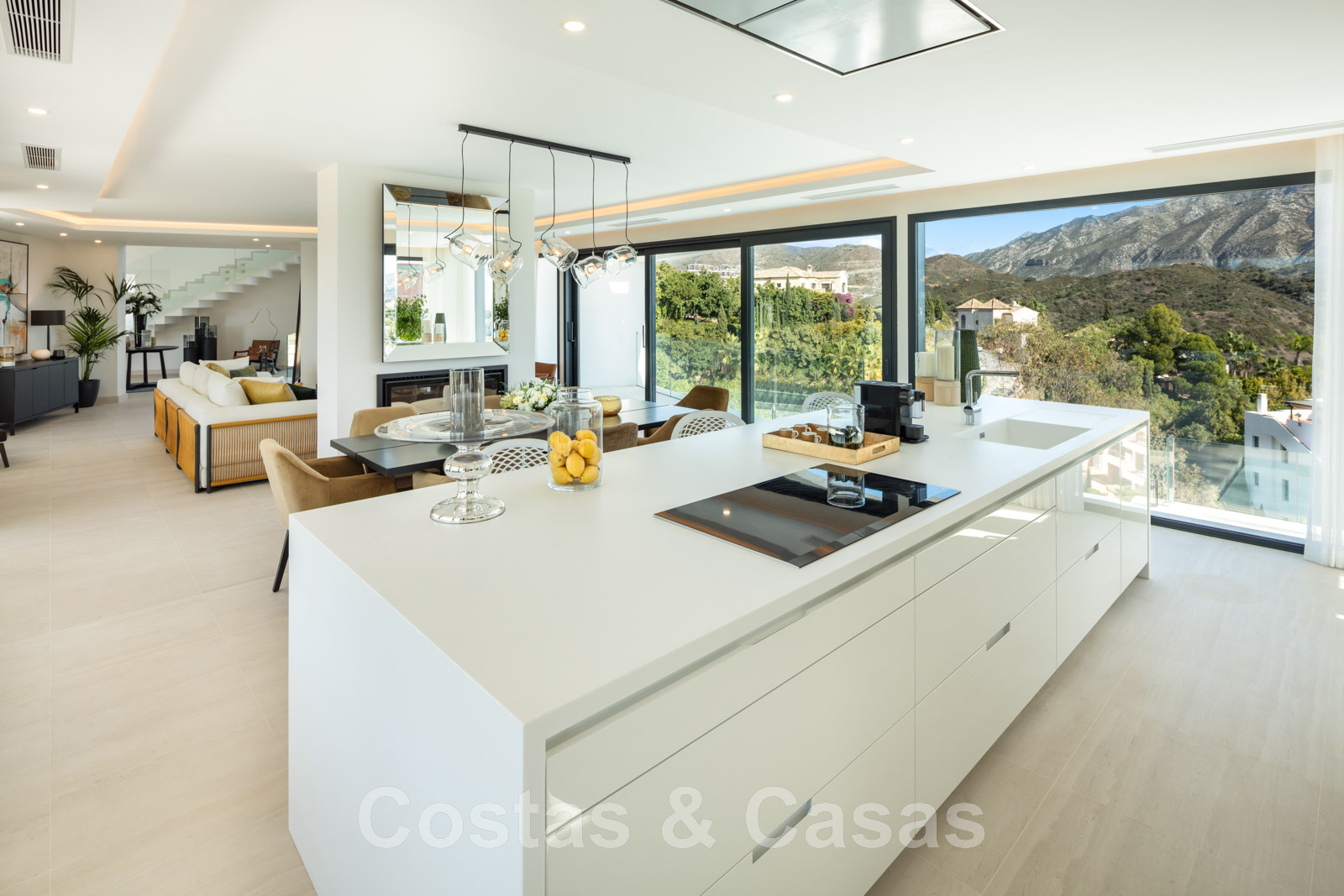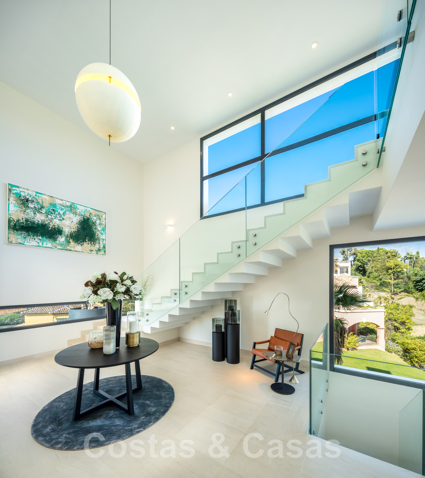Les hautes fenêtres coulissantes combinées aux hauts plafonds créent un intérieur ouvert et lumineux.