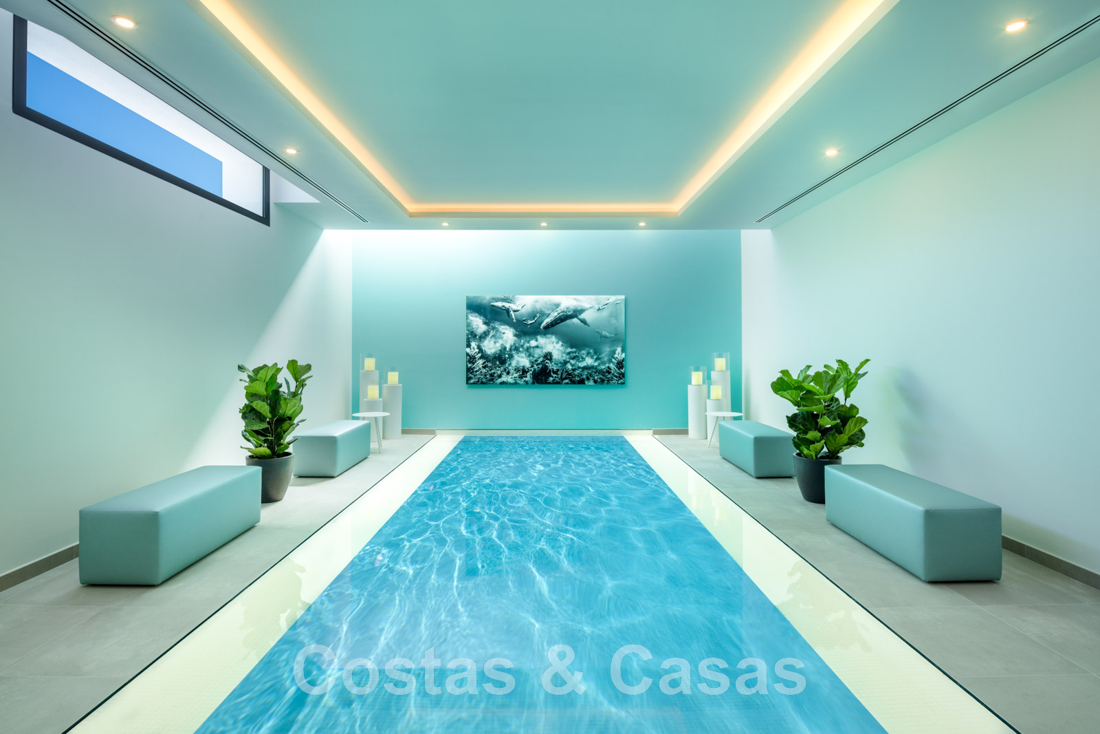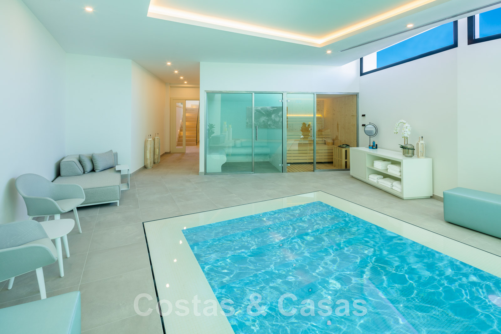 Grand espace bien-être avec diverses installations de spa, dont une grande piscine intérieure, un bain turc et un sauna.