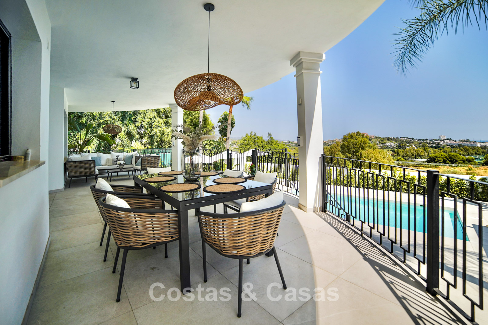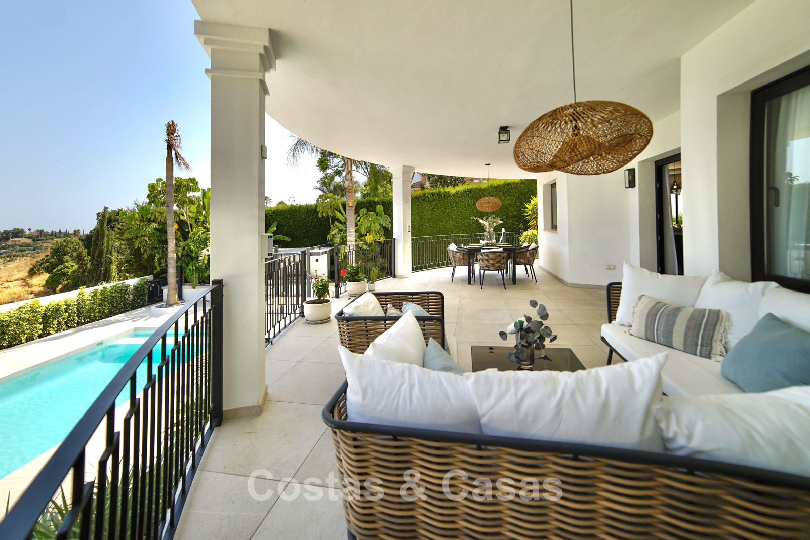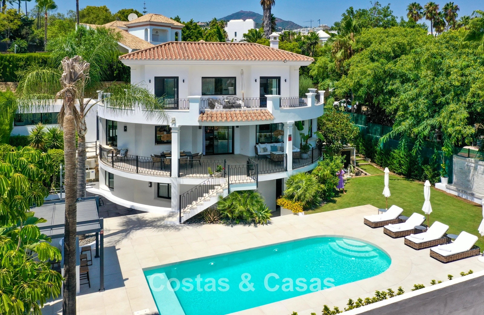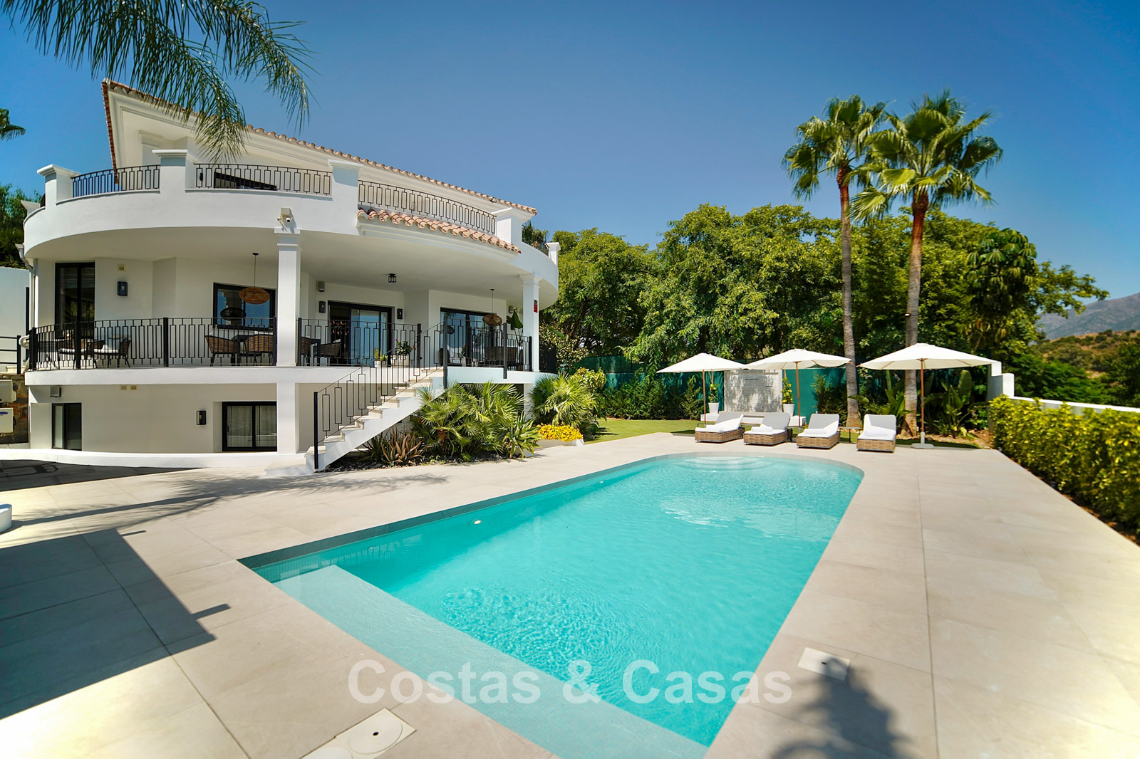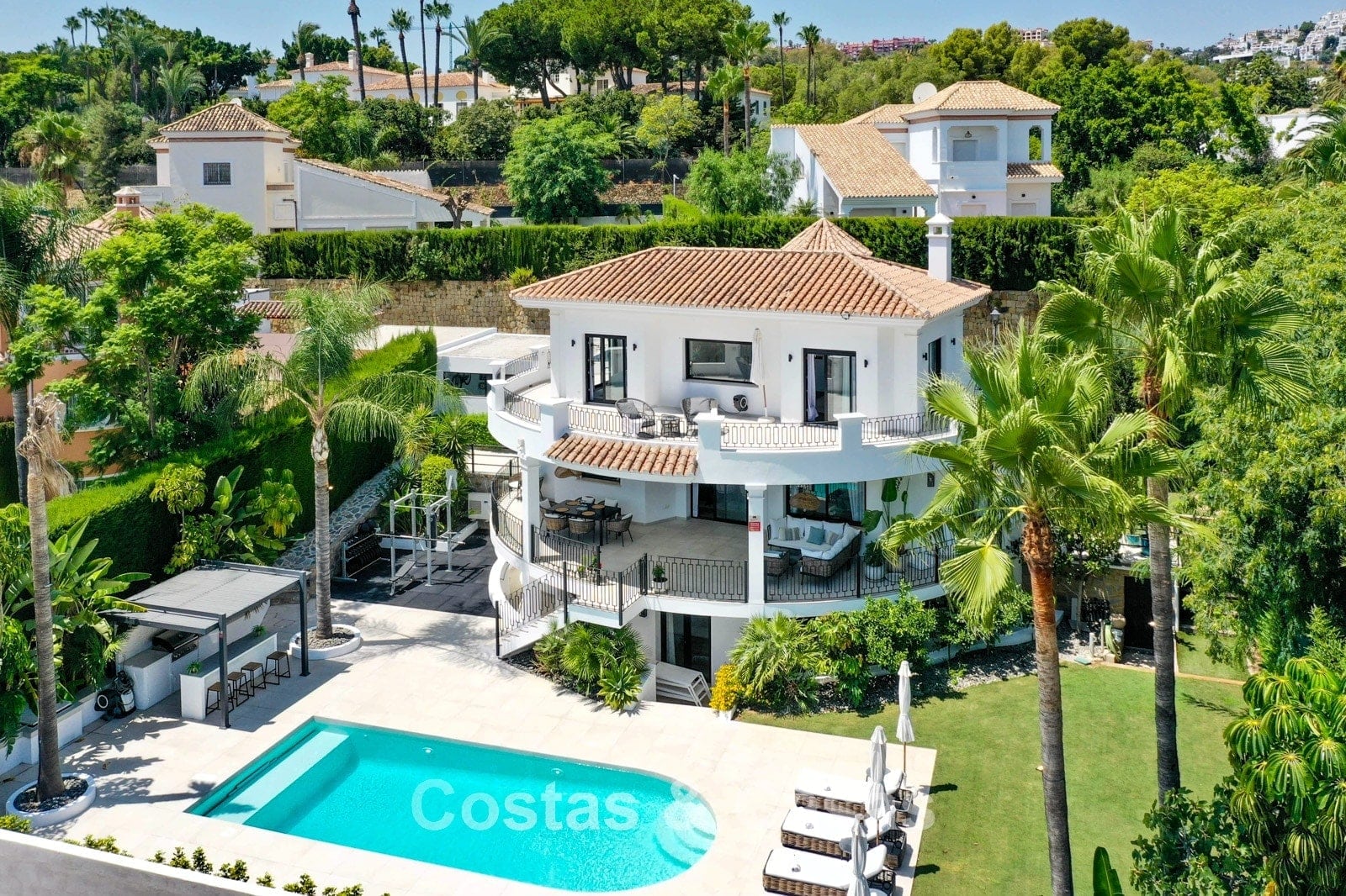 Cette villa dégage un luxe contemporain avec une subtile touche andalouse, de vastes terrasses et une atmosphère ouverte et lumineuse. L’architecture associe minimalisme et chaleur : façades blanches, toits en terre cuite et espaces extérieurs accueillants créent une ambiance d’élégance intemporelle. Rénovation haut de gamme axée sur le design et le confort. Salon avec espace TV et salle à manger intégrée. L’espace de vie ouvert communique directement avec l’extérieur, offrant une sensation exceptionnelle d’espace et de luminosité. Cuisine ouverte sur mesure avec électroménagers Neff, îlot central, bar petit-déjeuner et coin repas. 5 chambres sur mesure, 5 salles de bains. Espace fitness extérieur. Garage intérieur pour 2 voitures et espace de rangement supplémentaire.