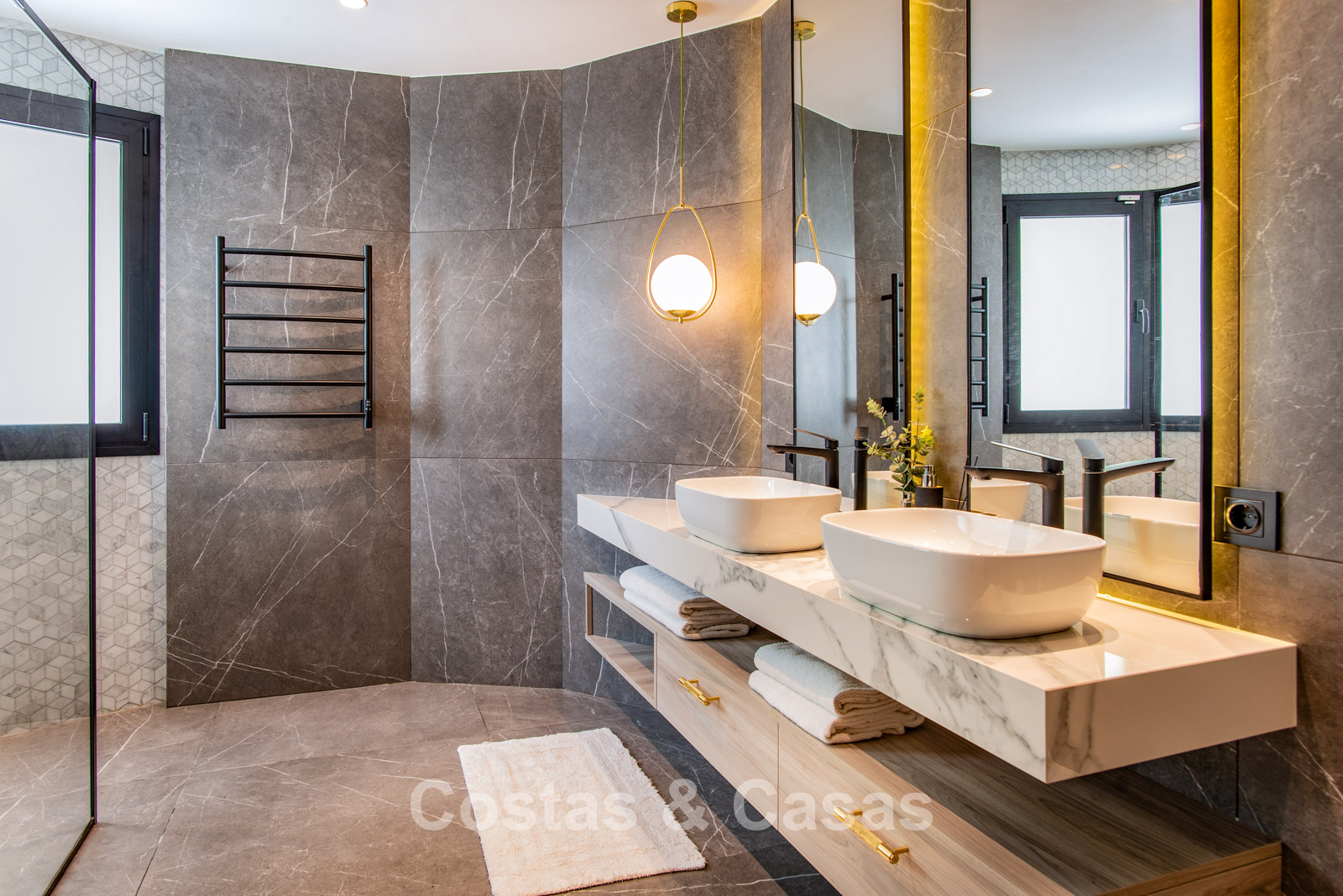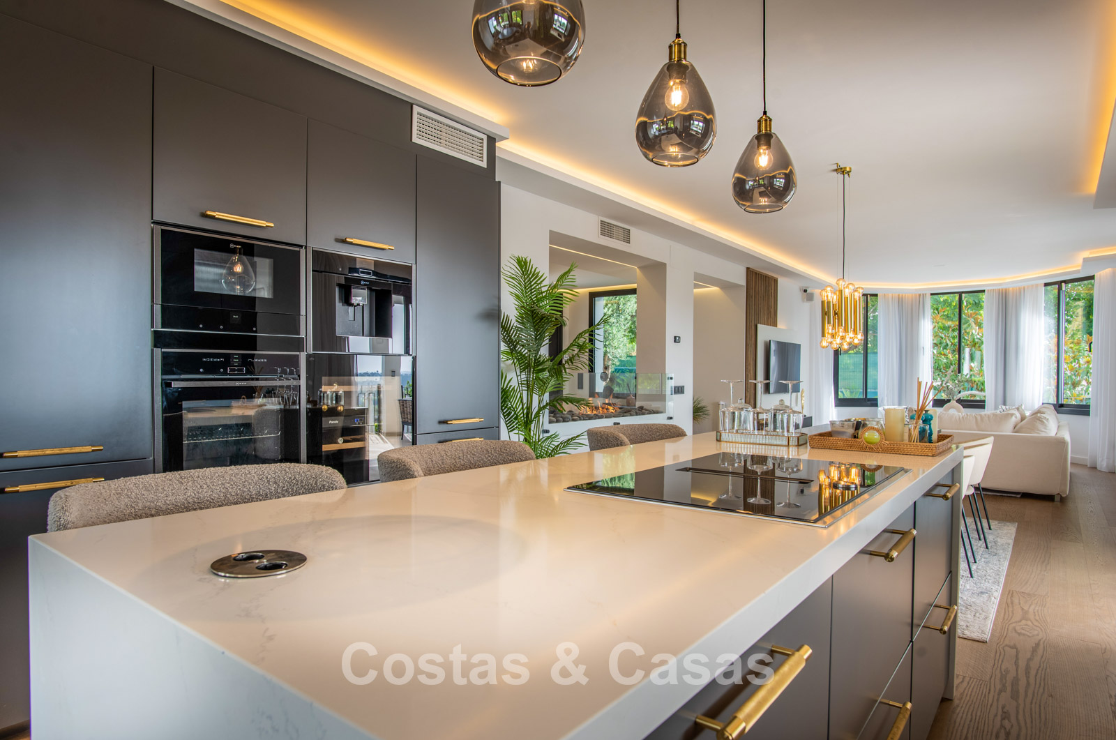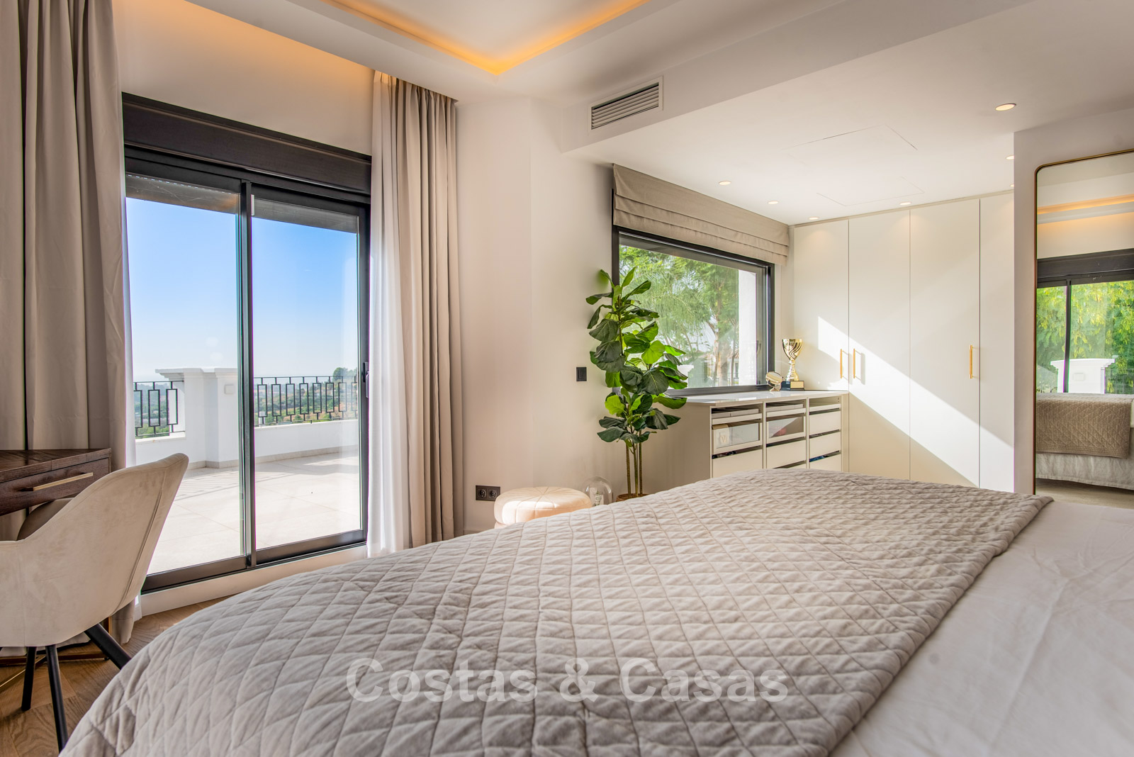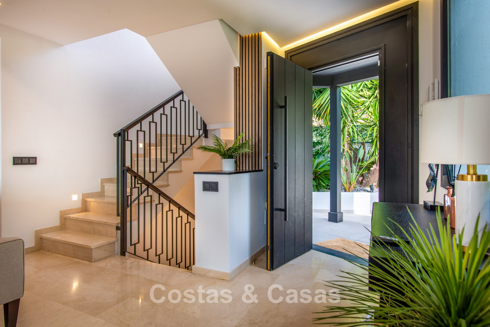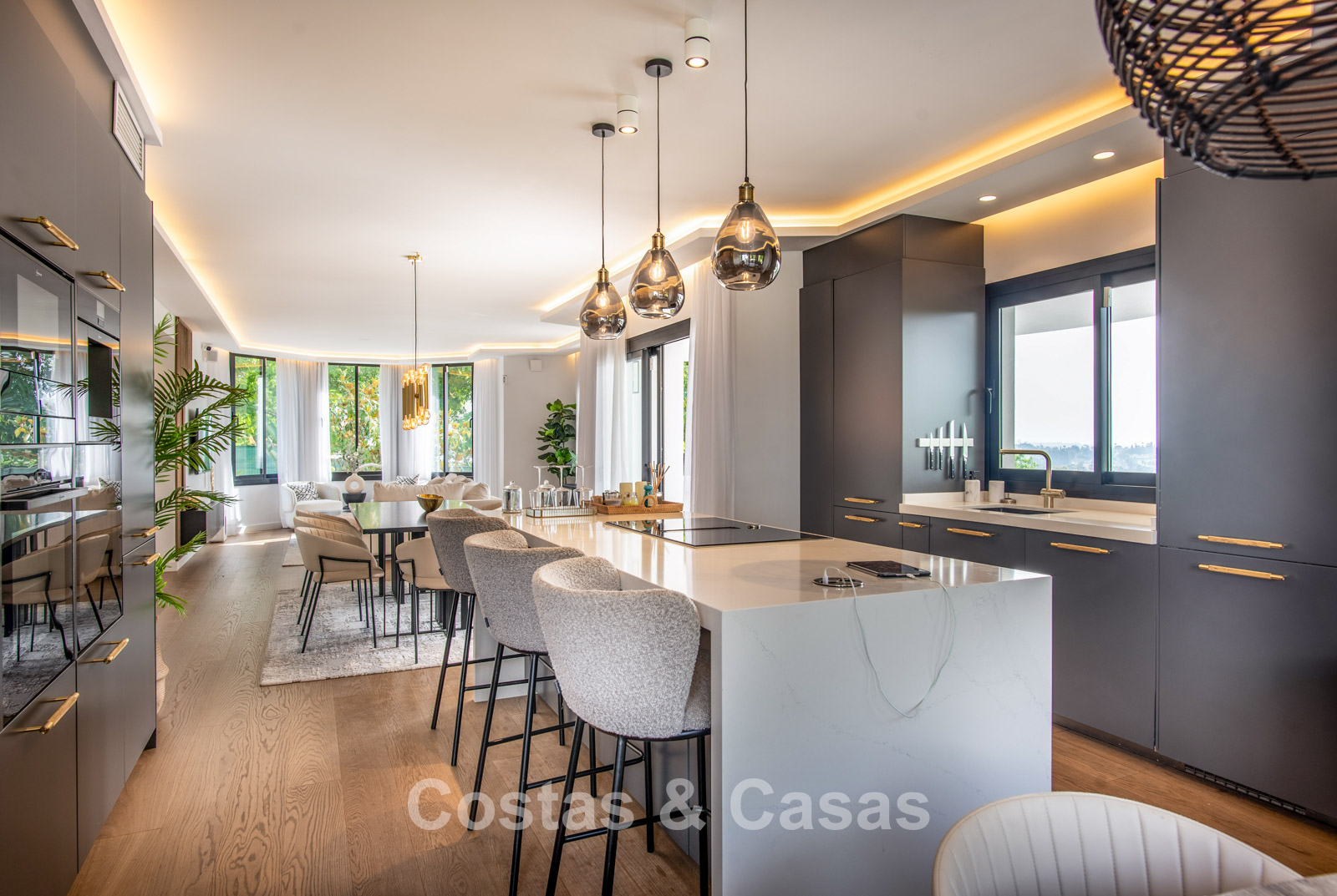 Cette villa dégage un luxe contemporain avec une subtile touche andalouse, de vastes terrasses et une atmosphère ouverte et lumineuse. L’architecture associe minimalisme et chaleur : façades blanches, toits en terre cuite et espaces extérieurs accueillants créent une ambiance d’élégance intemporelle. Rénovation haut de gamme axée sur le design et le confort. Salon avec espace TV et salle à manger intégrée. L’espace de vie ouvert communique directement avec l’extérieur, offrant une sensation exceptionnelle d’espace et de luminosité. Cuisine ouverte sur mesure avec électroménagers Neff, îlot central, bar petit-déjeuner et coin repas. 5 chambres sur mesure, 5 salles de bains. Espace fitness extérieur. Garage intérieur pour 2 voitures et espace de rangement supplémentaire.
