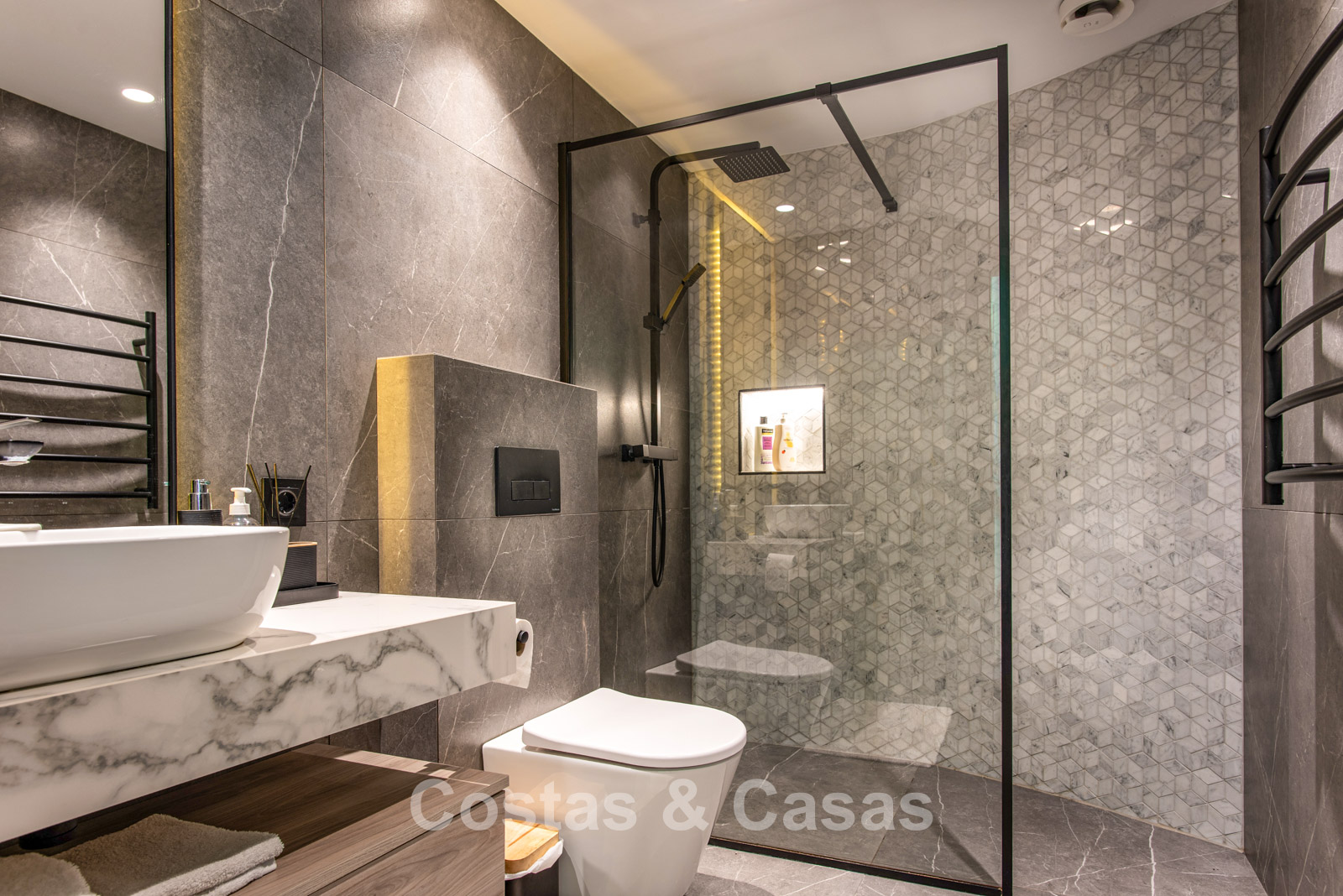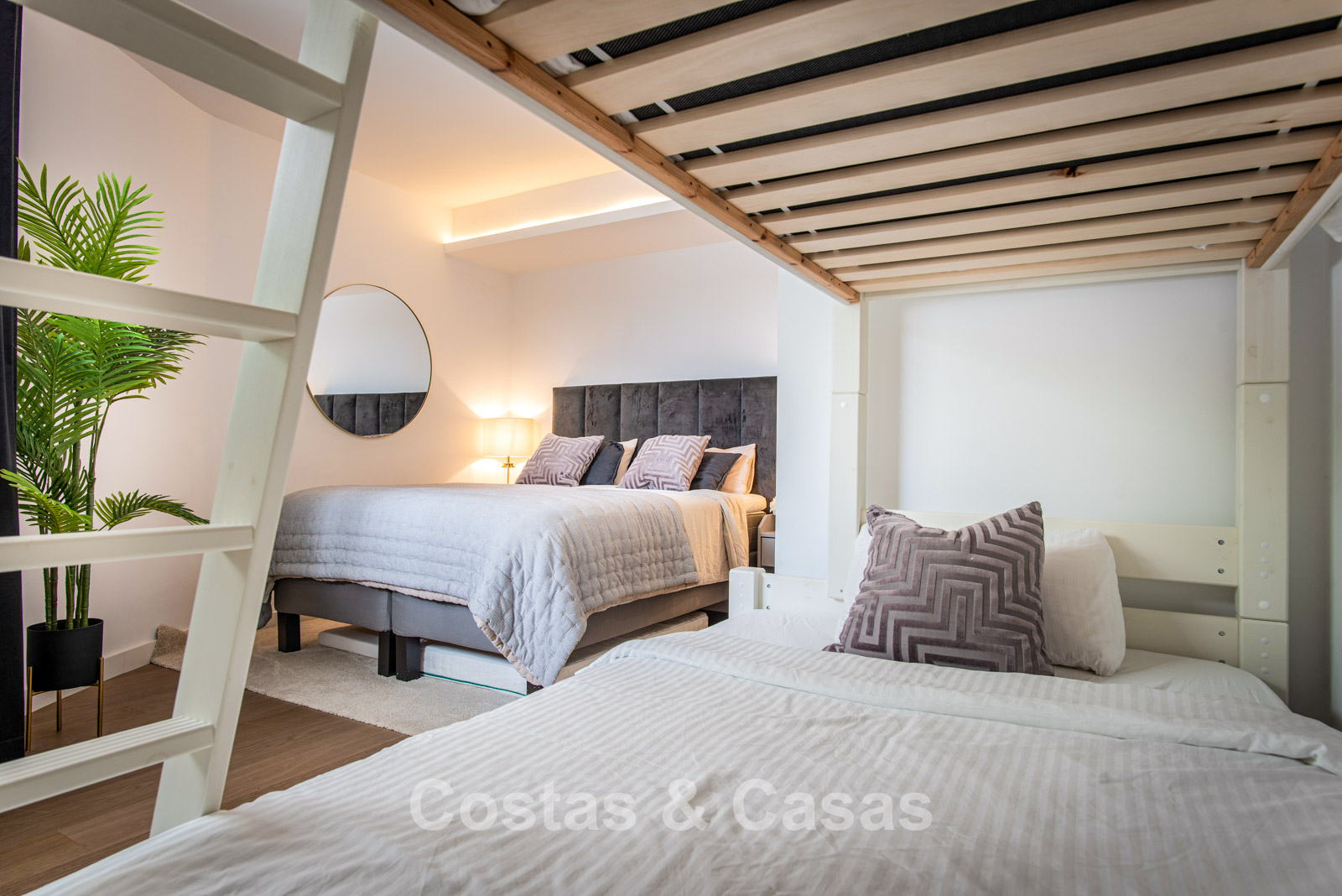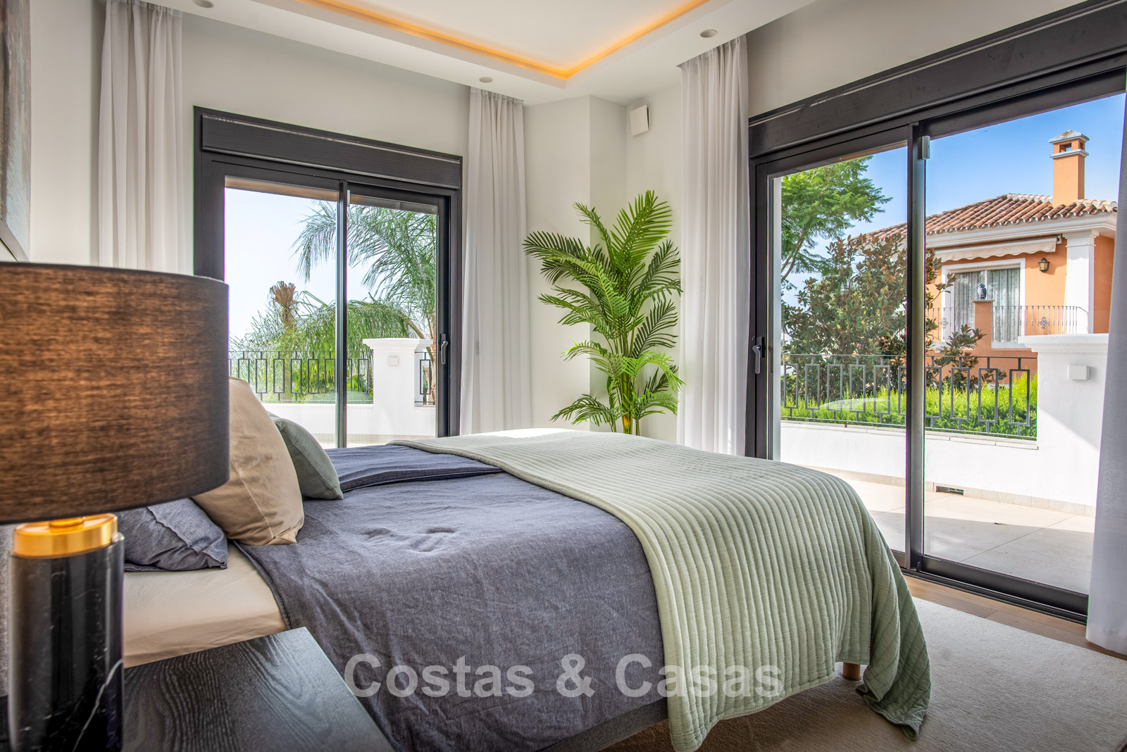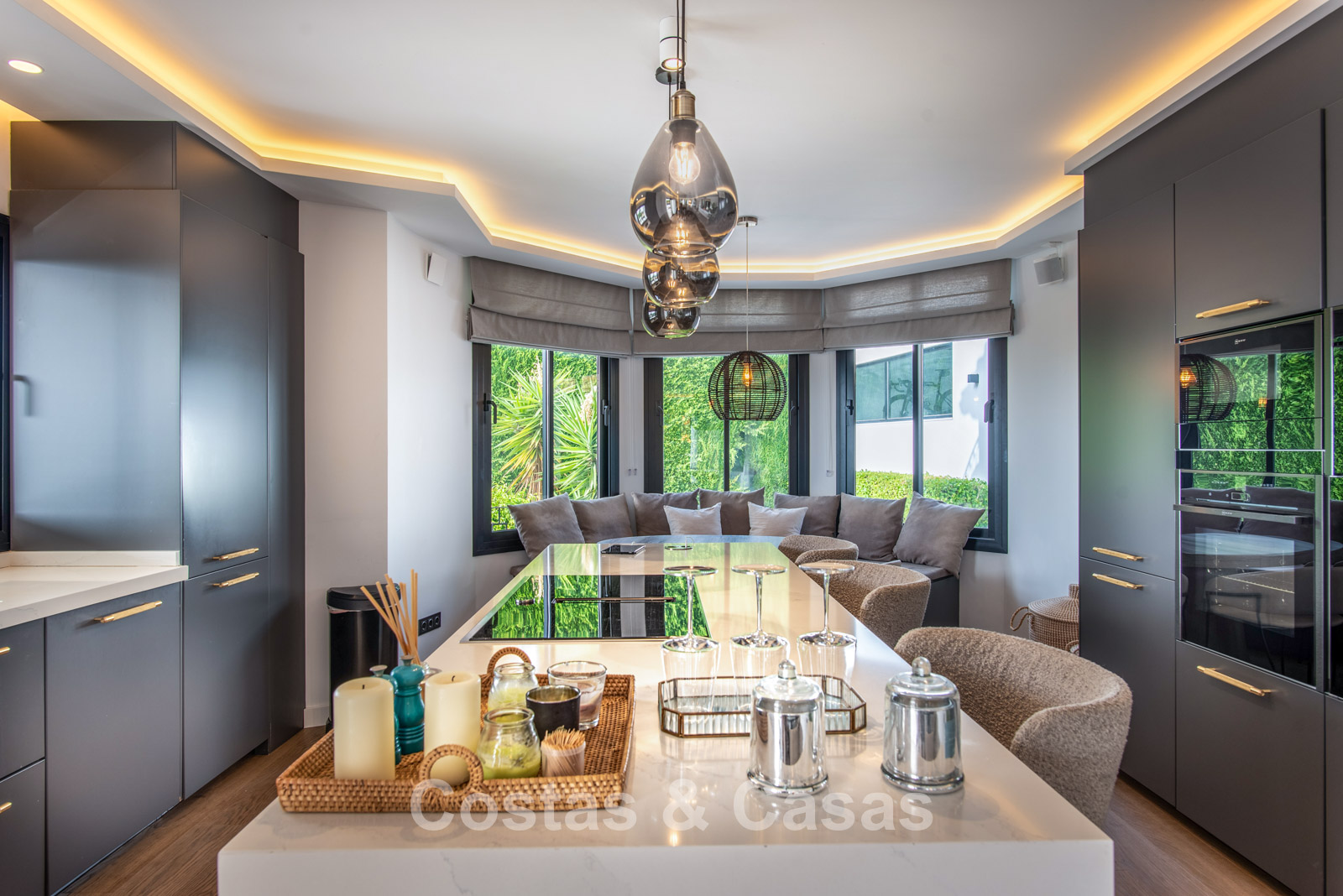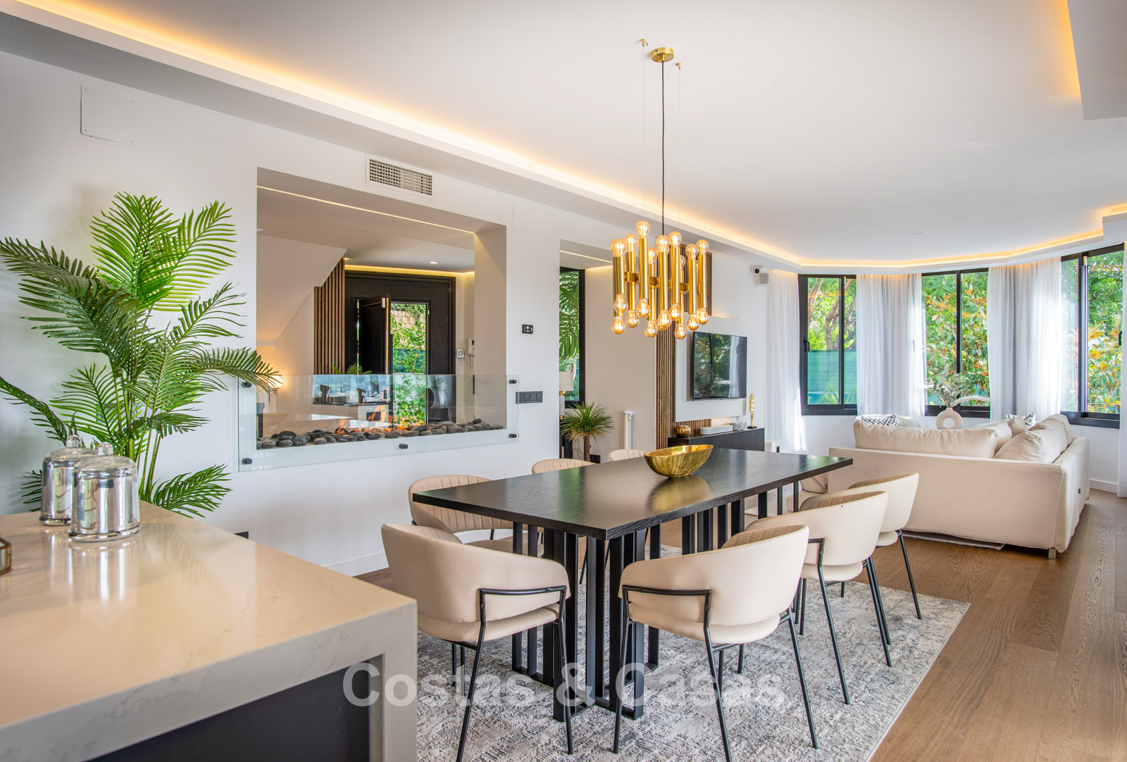 Cette villa dégage un luxe contemporain avec une subtile touche andalouse, de vastes terrasses et une atmosphère ouverte et lumineuse. L’architecture associe minimalisme et chaleur : façades blanches, toits en terre cuite et espaces extérieurs accueillants créent une ambiance d’élégance intemporelle. Rénovation haut de gamme axée sur le design et le confort. Salon avec espace TV et salle à manger intégrée. L’espace de vie ouvert communique directement avec l’extérieur, offrant une sensation exceptionnelle d’espace et de luminosité. Cuisine ouverte sur mesure avec électroménagers Neff, îlot central, bar petit-déjeuner et coin repas. 5 chambres sur mesure, 5 salles de bains. Espace fitness extérieur. Garage intérieur pour 2 voitures et espace de rangement supplémentaire.