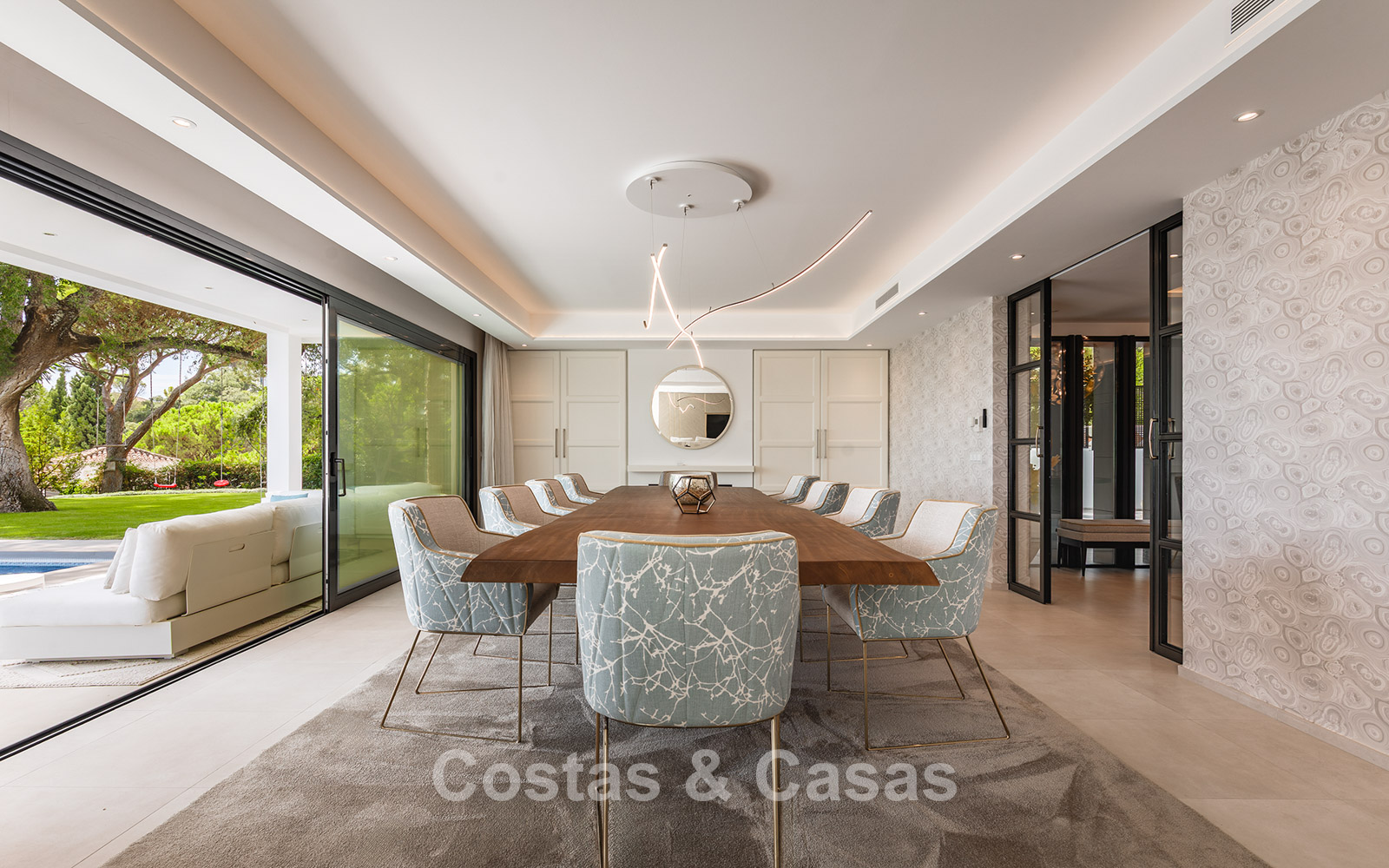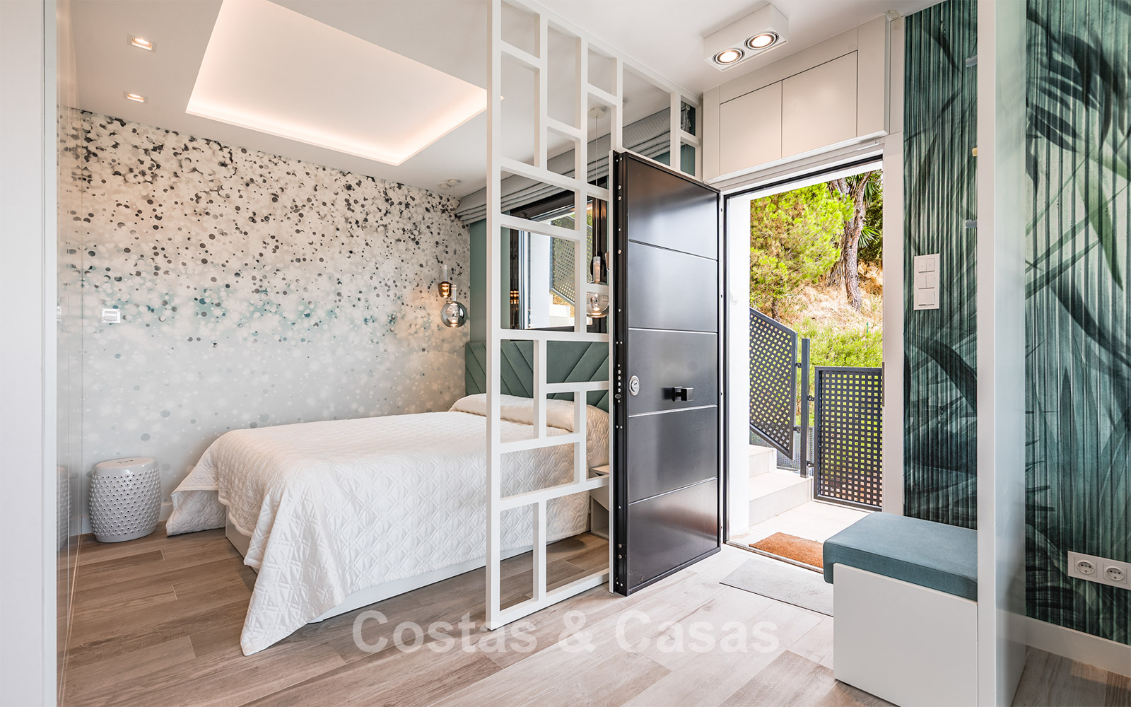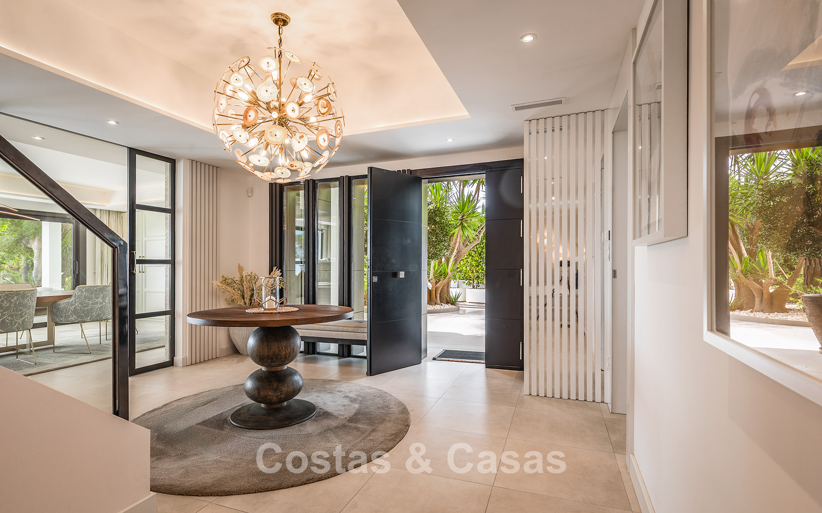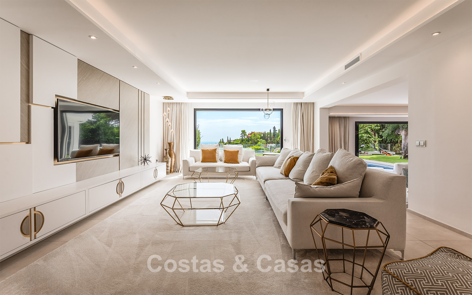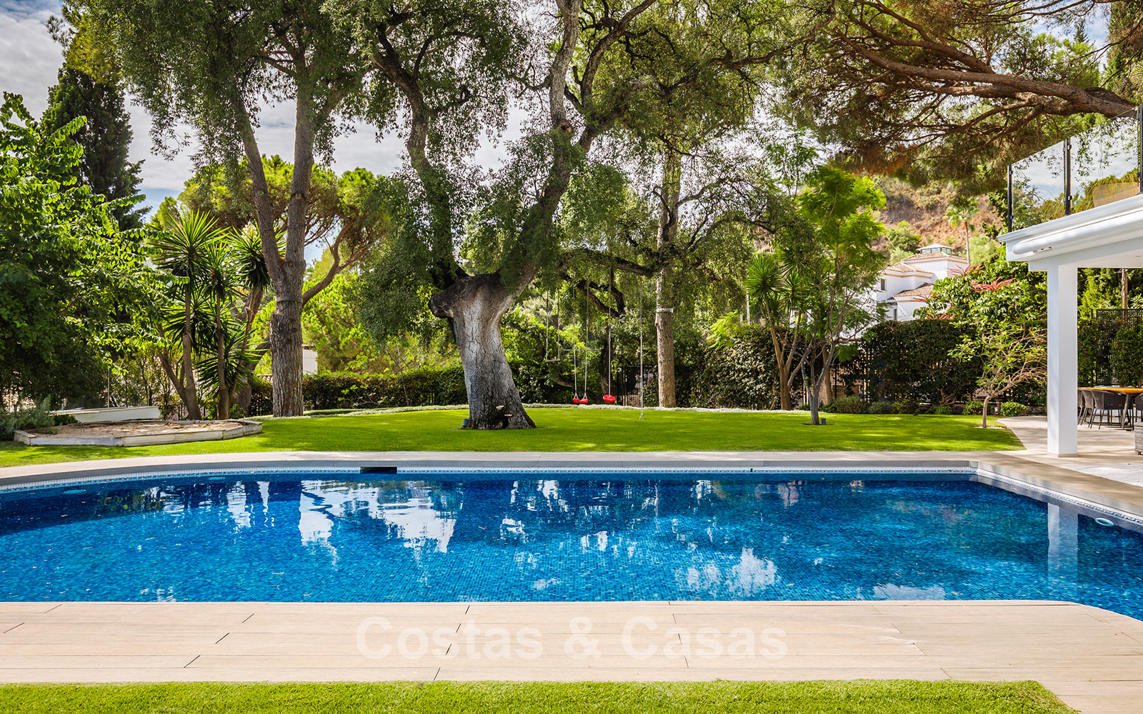 Villa individuelle moderne aux influences méditerranéennes. Entièrement modernisée avec des matériaux luxueux. De grandes baies vitrées coulissantes avec des cadres encastrés apportent beaucoup de lumière naturelle et renforcent la sensation d'espace. L'intérieur allie style contemporain et sérénité, caractérisé par des tons chauds, des lignes harmonieuses et des matériaux de haute qualité. Villa spacieuse et ouverte. À côté se trouve une salle à manger formelle avec une table pour 10 personnes. La cuisine sur mesure est équipée de meubles de rangement allant du sol au plafond, d'électroménagers Miele, d'un élégant îlot central et d'une table à manger. La villa comprend huit chambres, sept salles de bains et une toilette séparée. L'étage supérieur abrite la suite parentale, avec salle de bains, dressing et terrasse privée offrant une vue imprenable. Un logement d'amis indépendant, répartie sur deux étages, offre trois chambres, trois salles de bains, une cuisine et des espaces de vie, parfaits pour offrir un espace privé à vos invités ou à votre personnel. Carrelage crème de haute qualité. Buanderie. Débarras. Garage intégré + 2 places de parking couvertes.