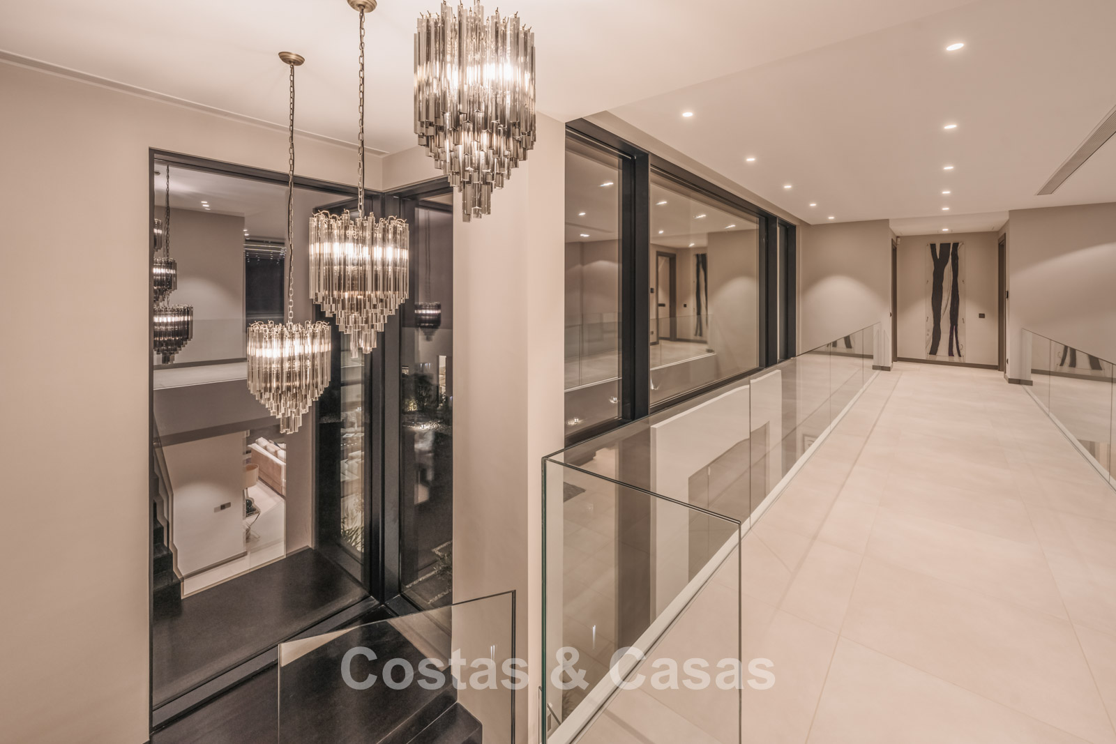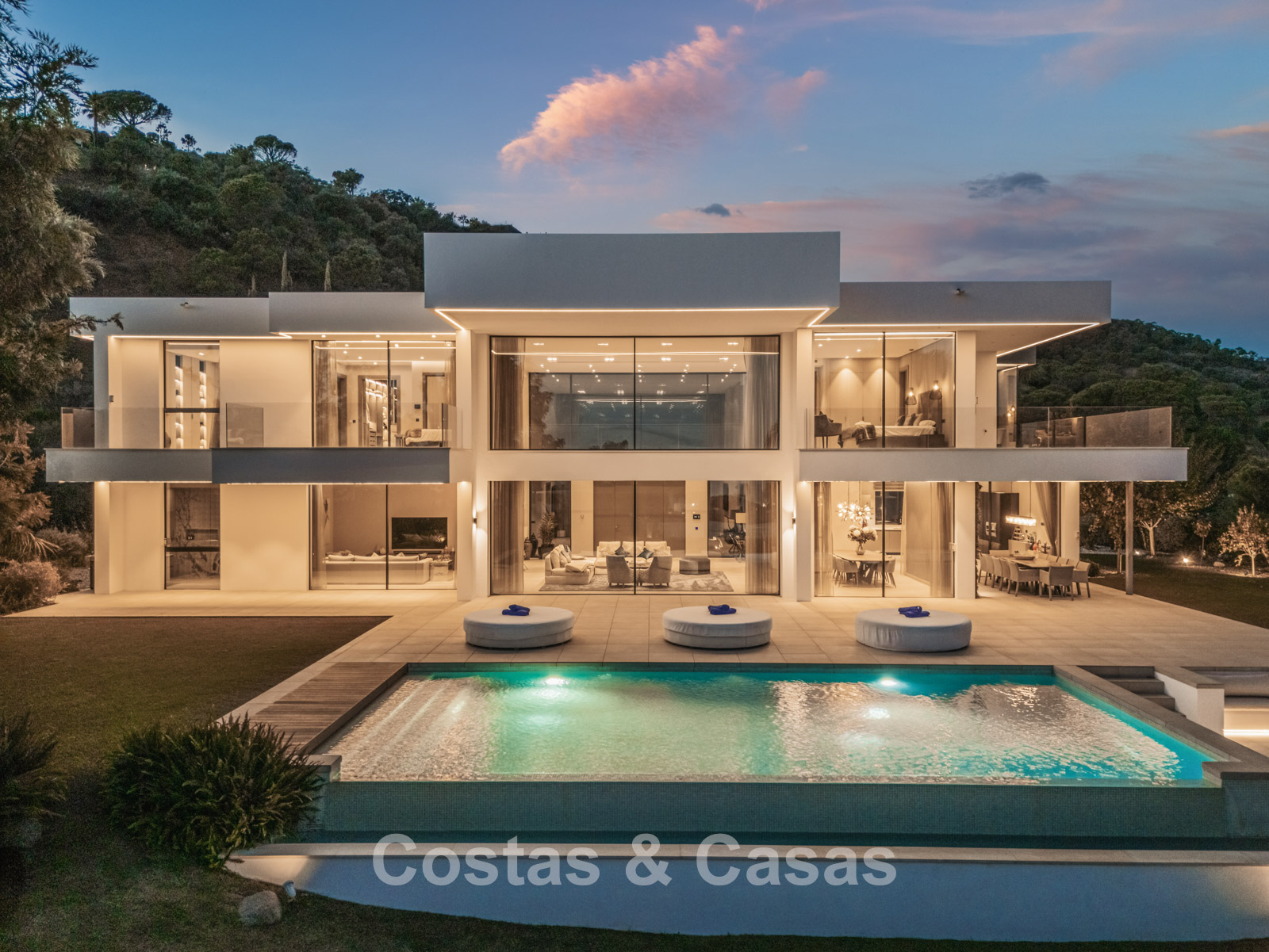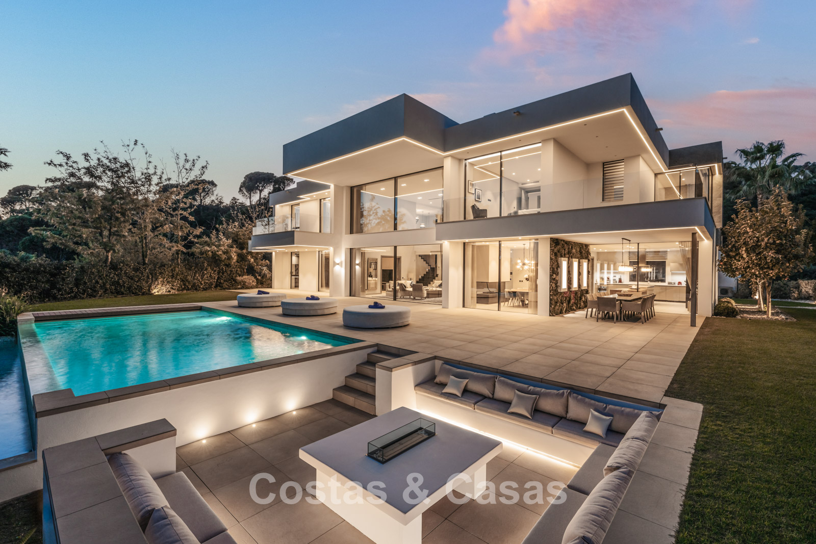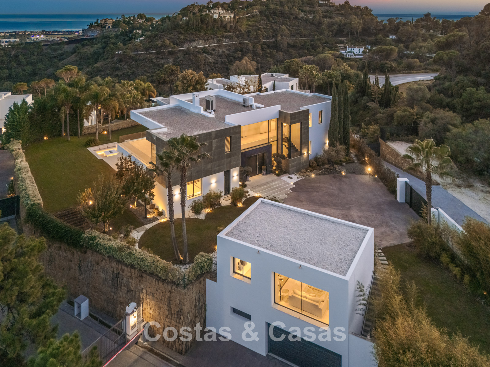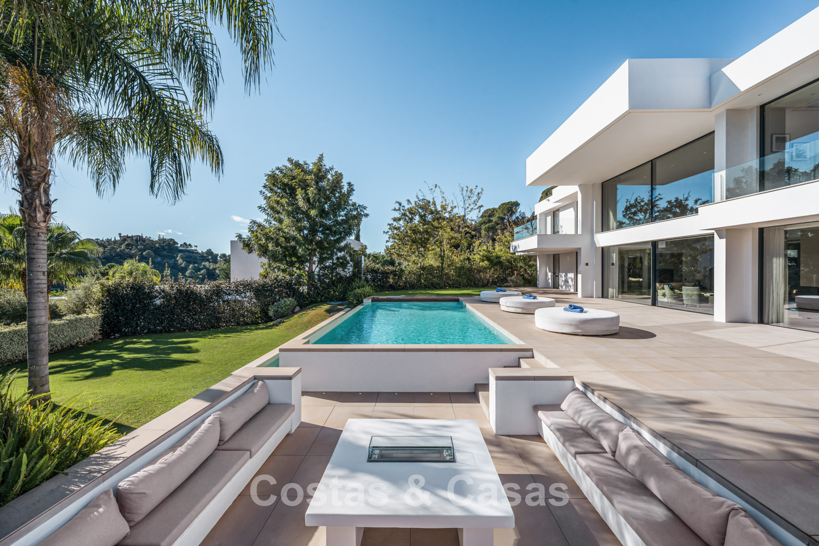 Autres caractéristiques : Climatisation pour le refroidissement et le chauffage. Cheminée. Balustrades en verre autour de la terrasse. Volets roulants électriques. Armoires encastrées sur mesure. Système d'alarme sophistiqué. Système d'irrigation automatique. Éclairage LED intérieur et extérieur.