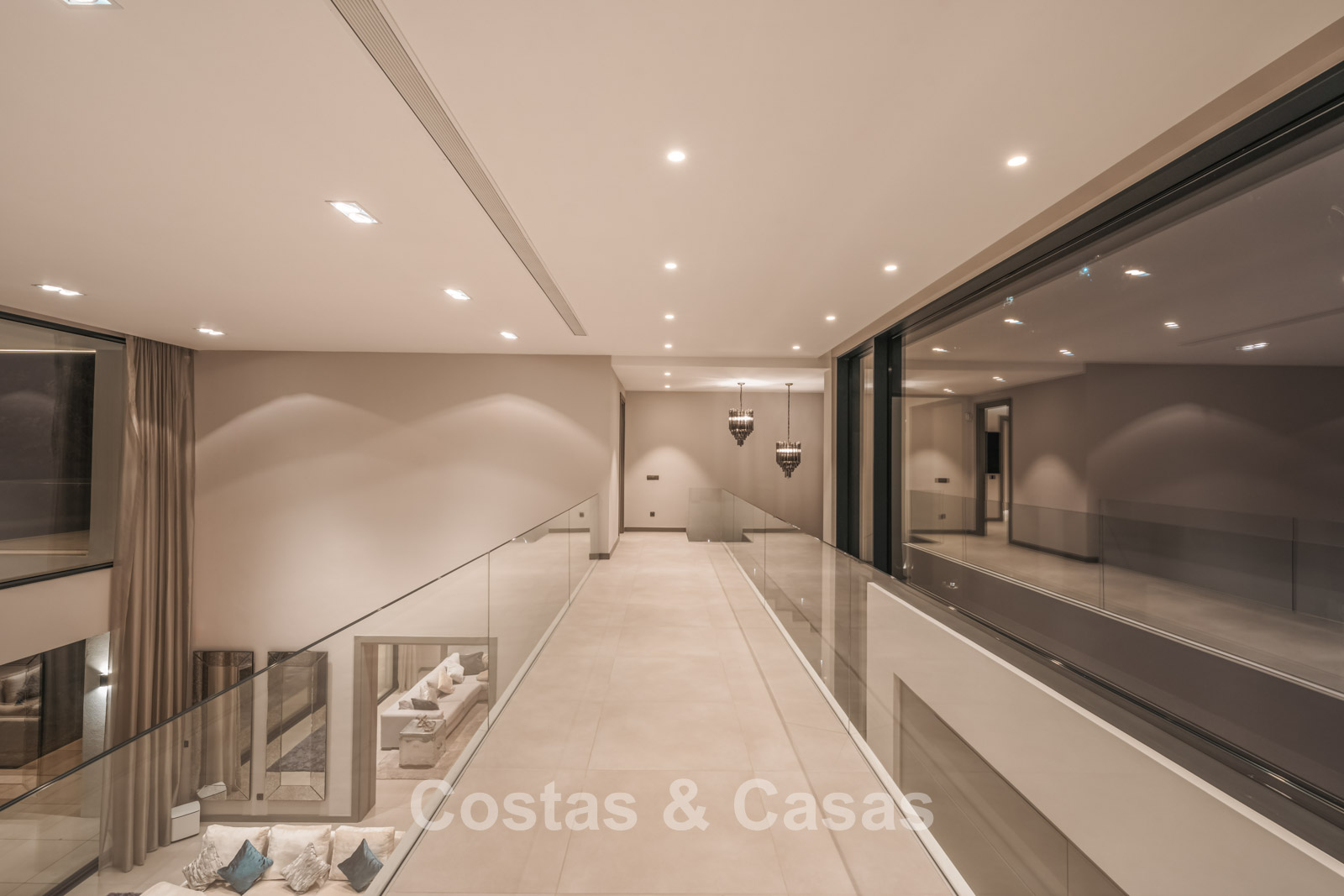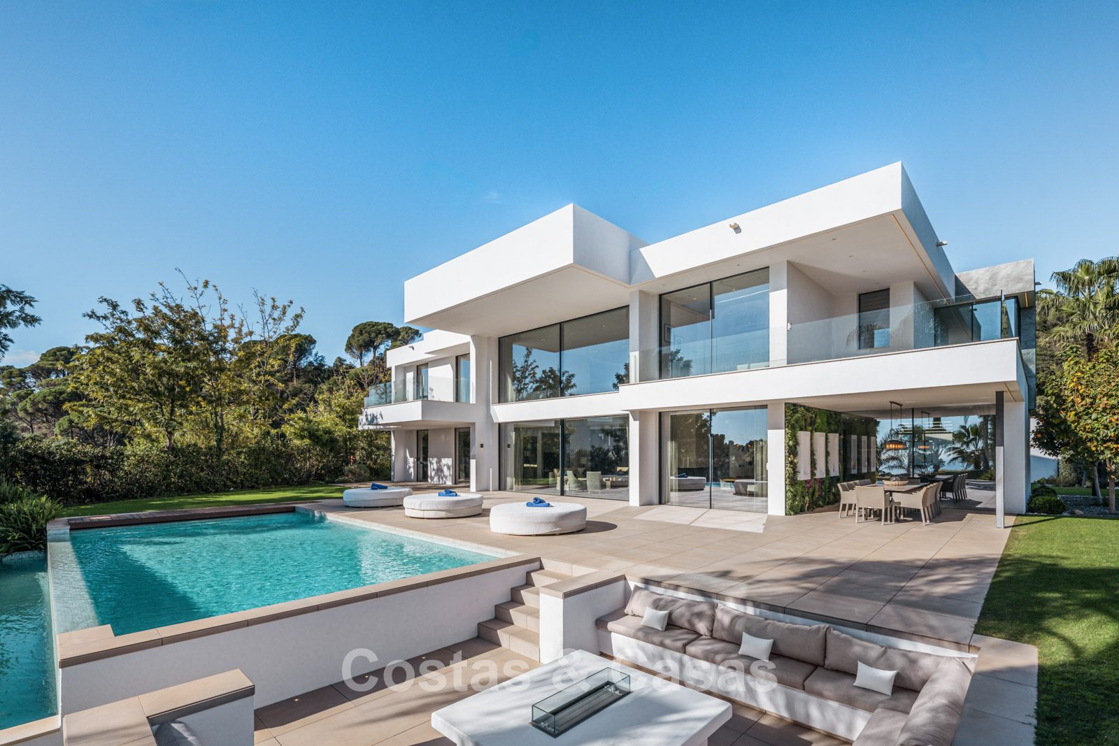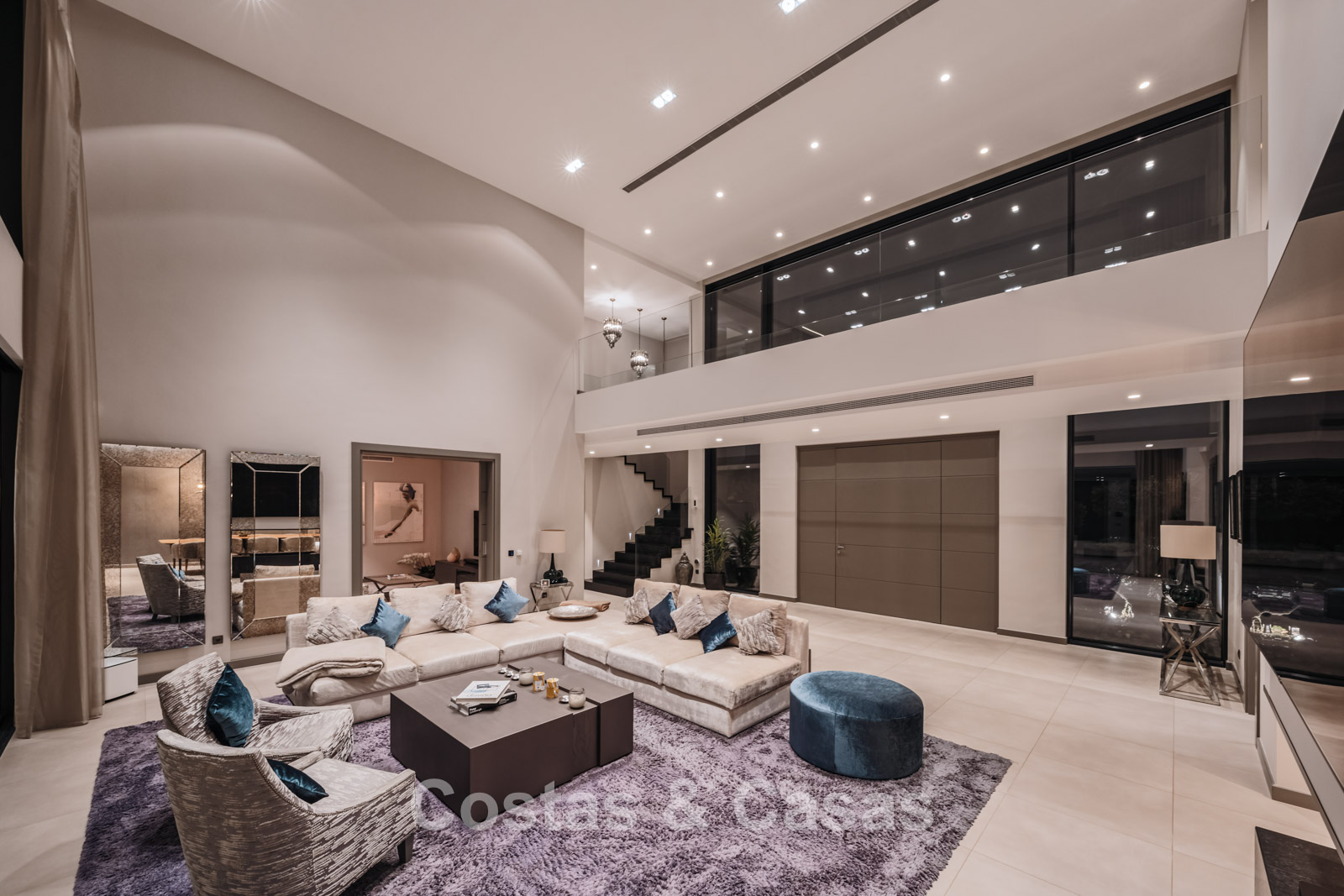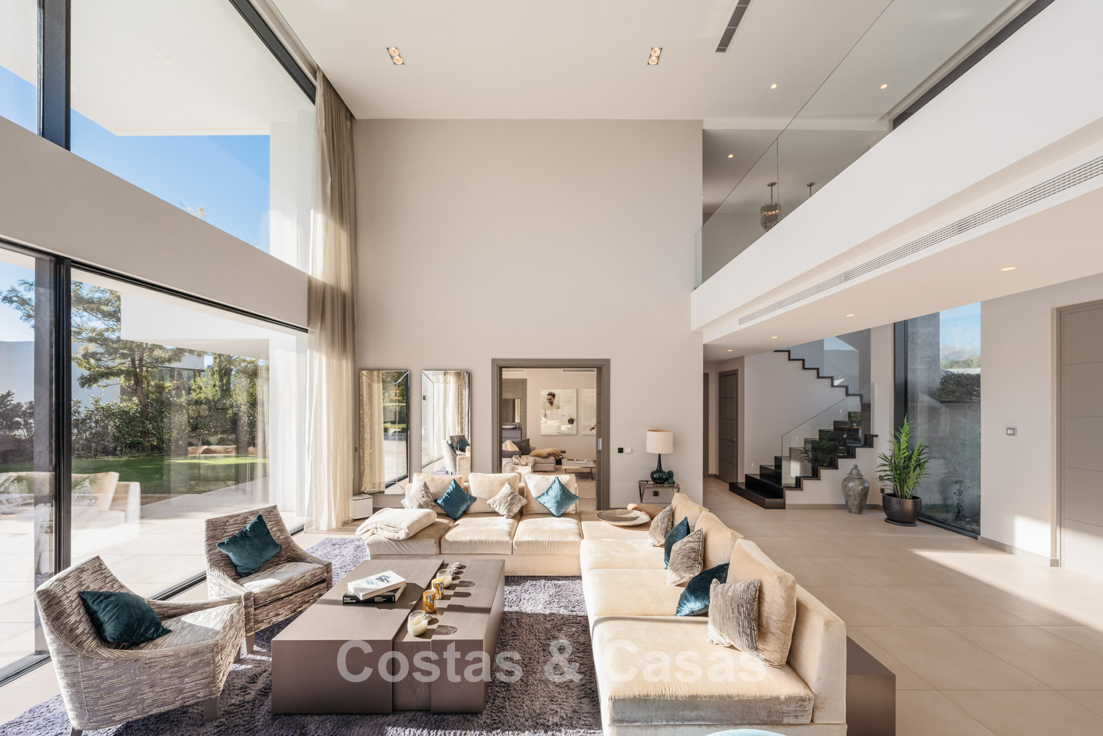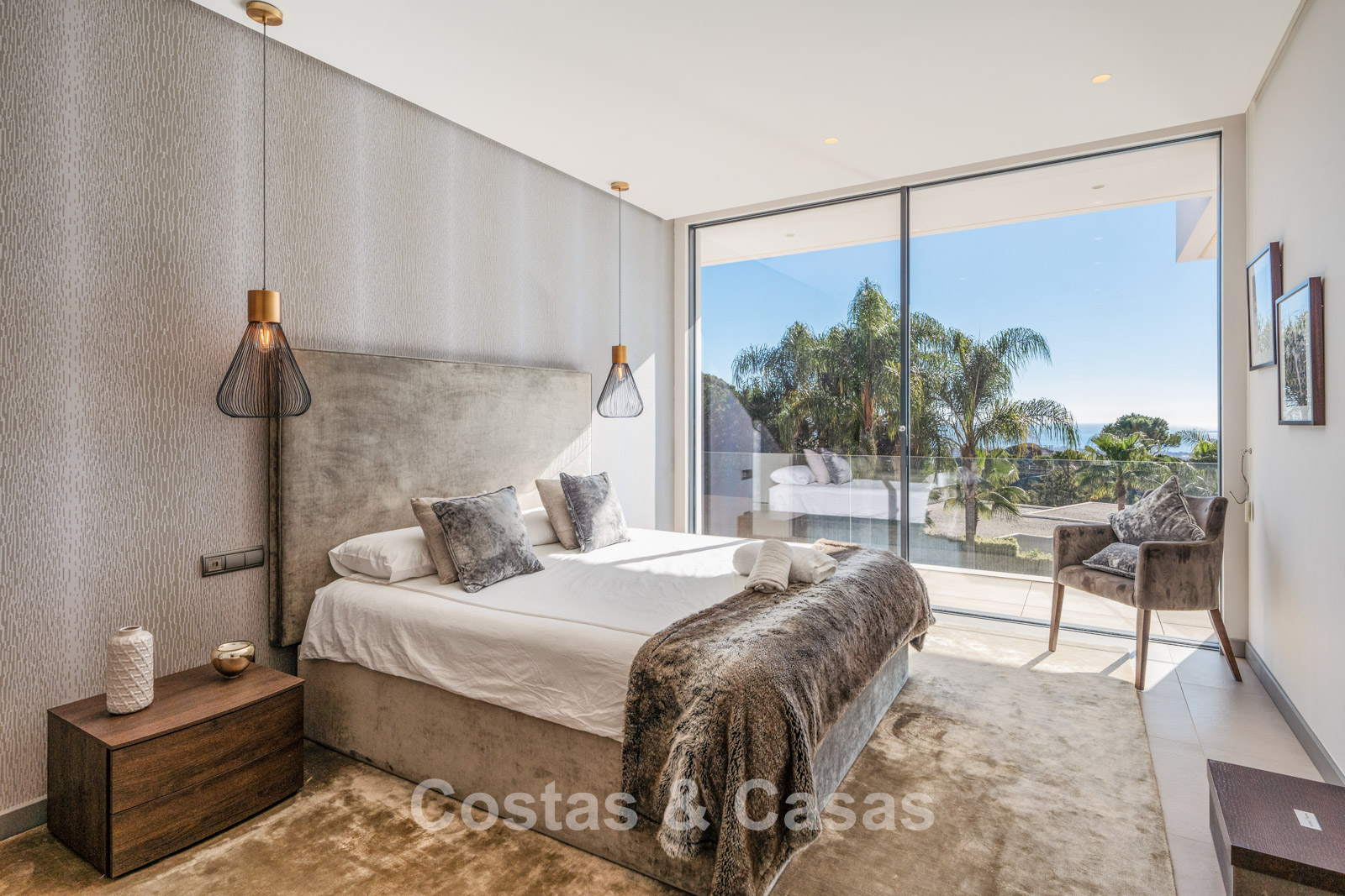 Autres caractéristiques : Climatisation pour le refroidissement et le chauffage. Cheminée. Balustrades en verre autour de la terrasse. Volets roulants électriques. Armoires encastrées sur mesure. Système d'alarme sophistiqué. Système d'irrigation automatique. Éclairage LED intérieur et extérieur.
