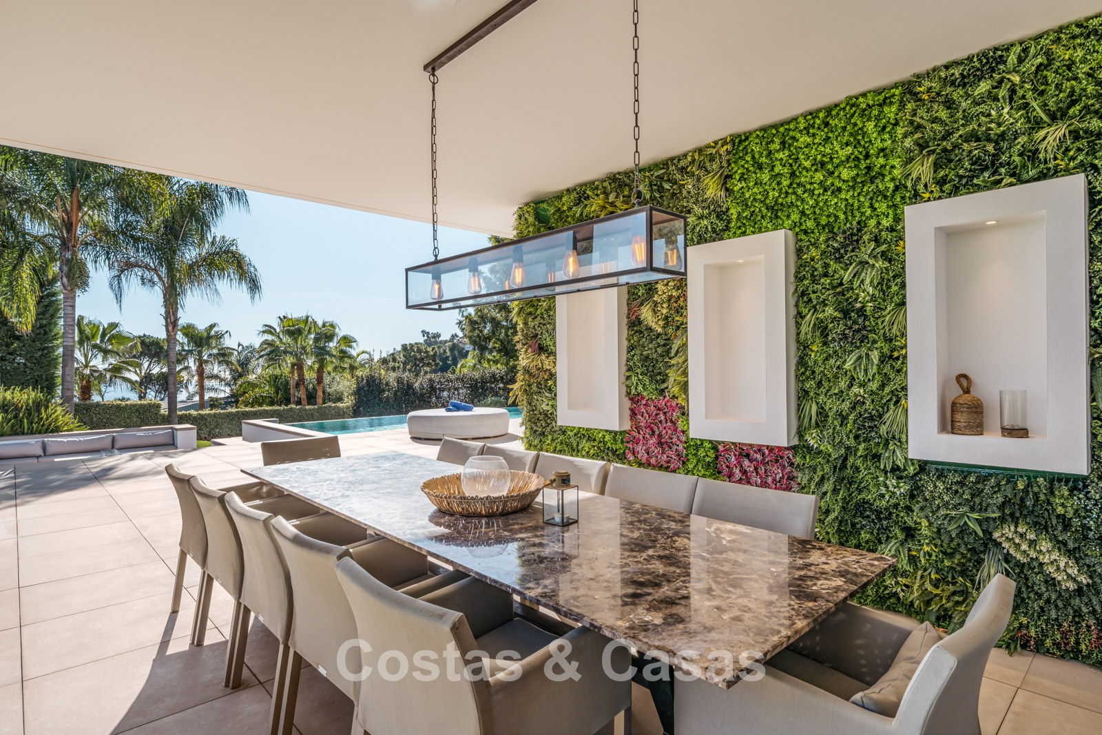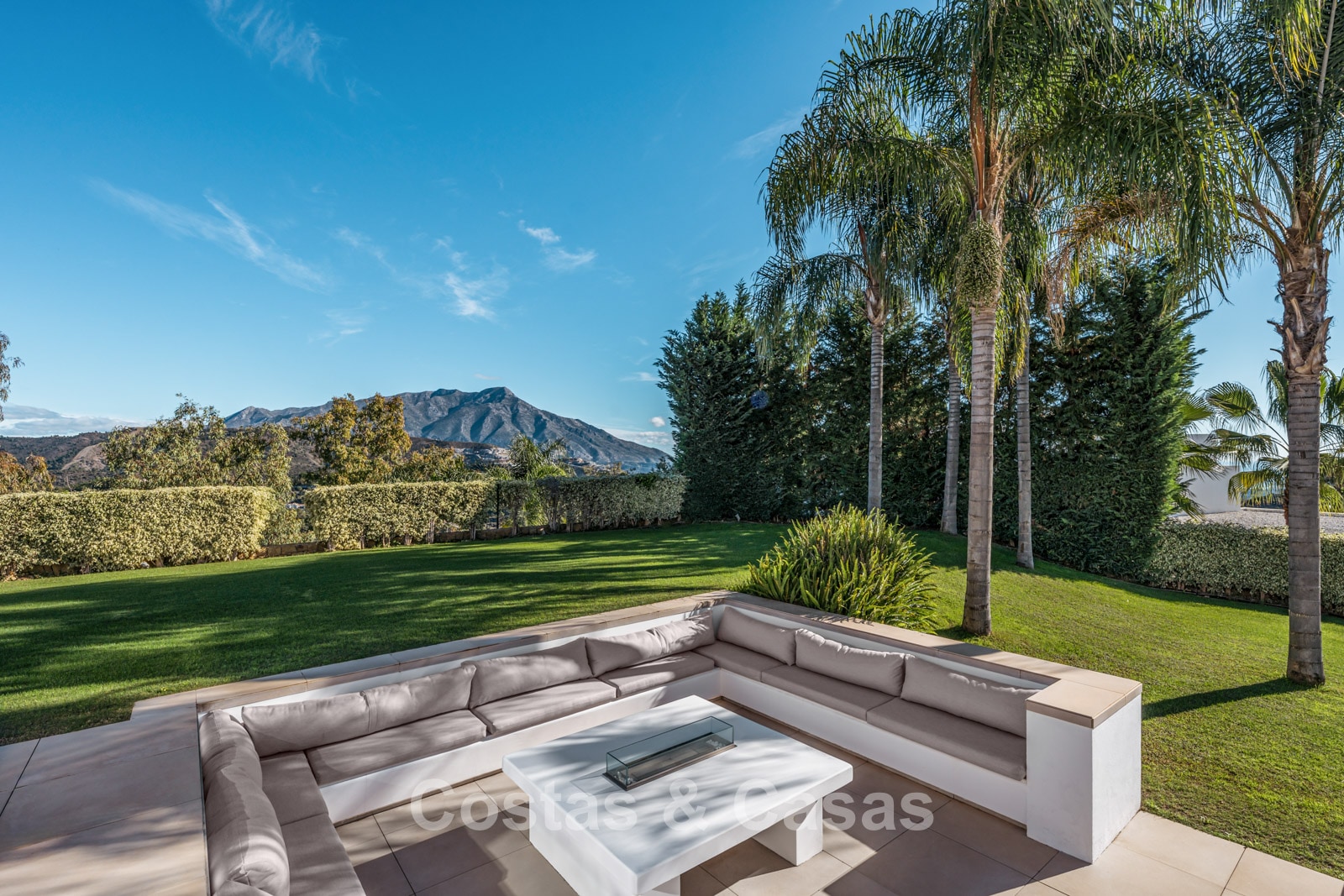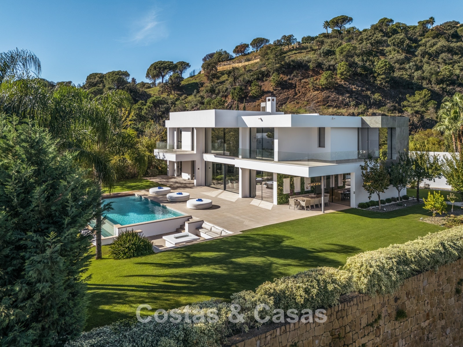 Grand terrain situé en position surélevée. Jardin paysager soigné avec verdure tropicale et pelouse. Grande piscine à débordement entourée d'une terrasse ensoleillée attenante. Un lounge en contrebas dispose d'une cheminée centrale, idéale pour des soirées agréables en famille ou entre amis. Terrasses ouvertes et couvertes avec suffisamment d'espace pour installer des chaises longues. Orientée plein sud. Magnifique vue sur la vallée, le paysage montagneux et la mer Méditerranée.