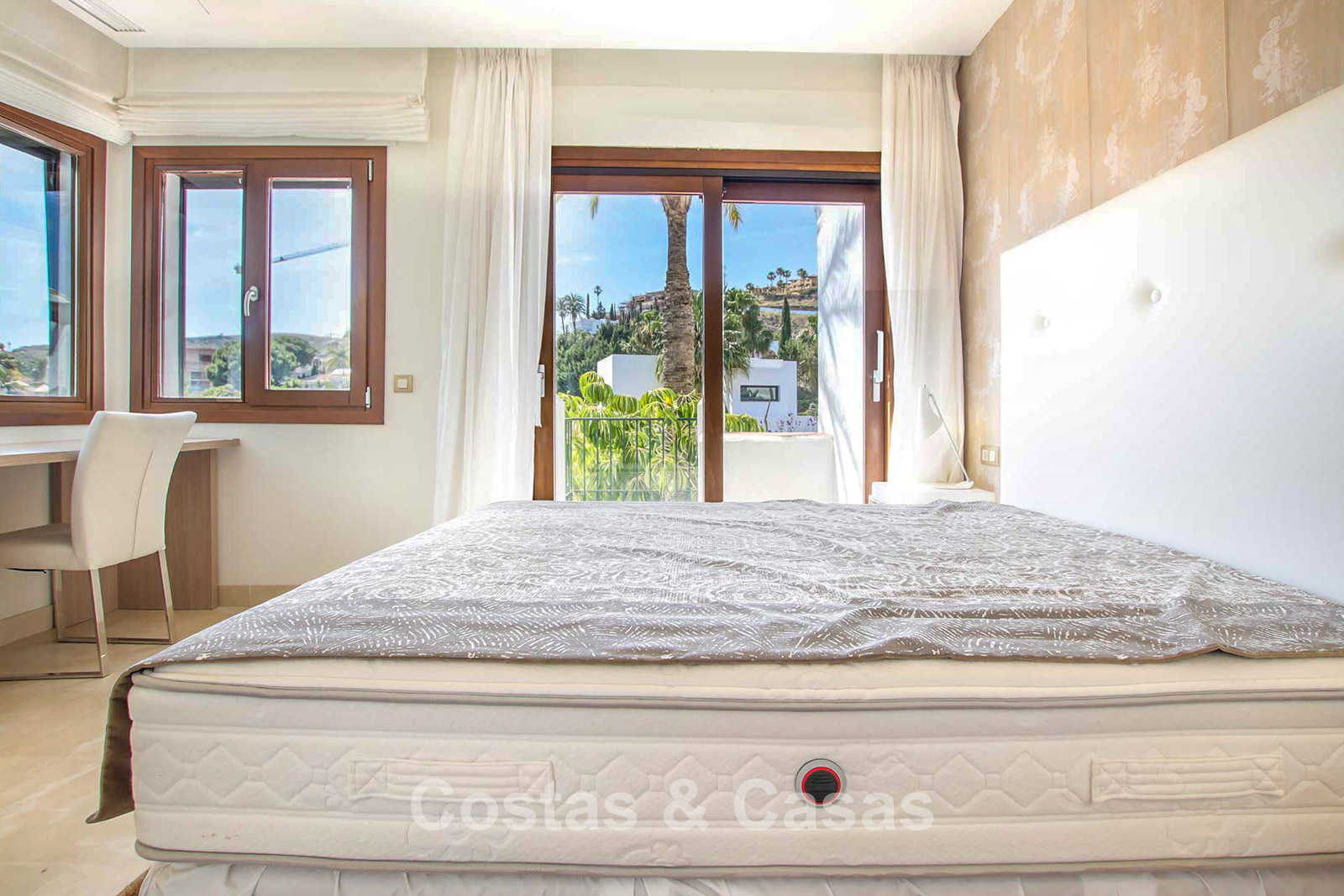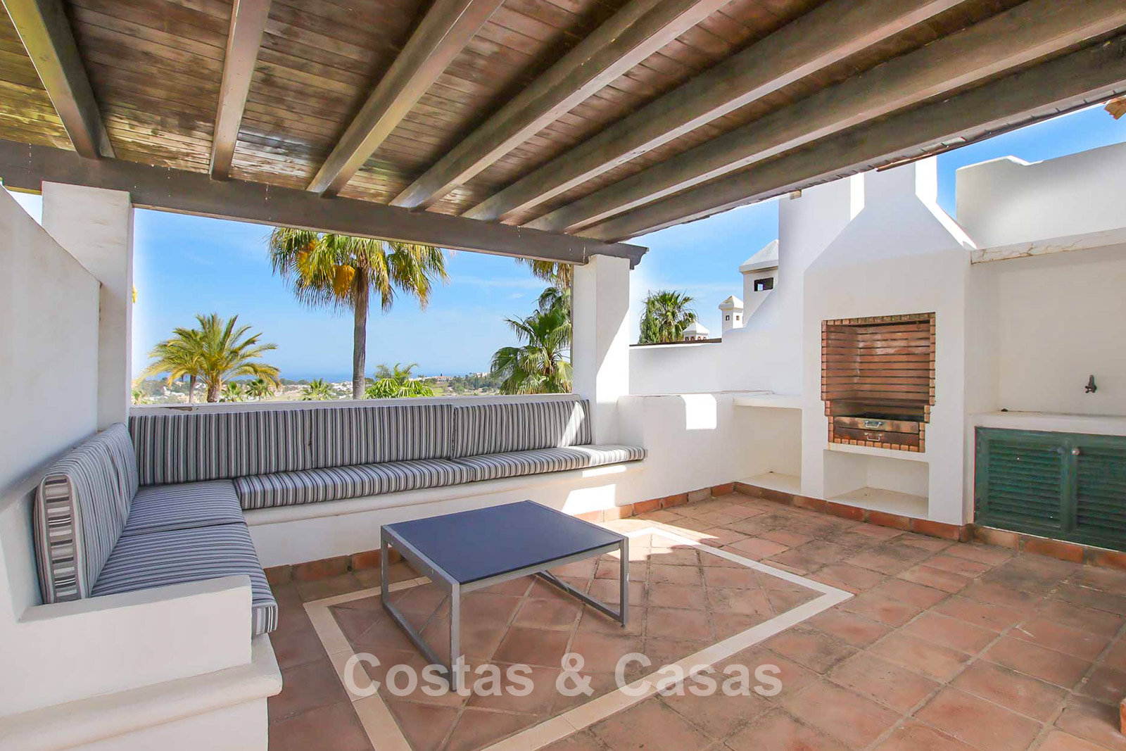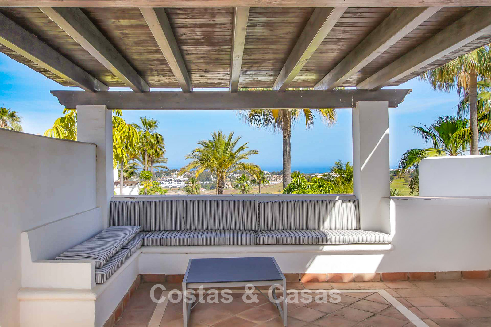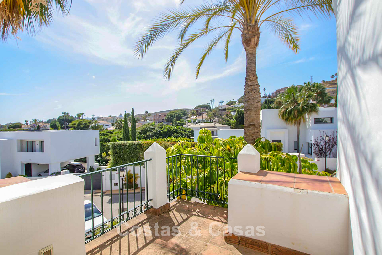 Maison au style méditerranéen moderne. Utiliser des matériaux de qualité. Orientée sud-est. Vues sur les jardins communaux, la vallée du golf et la mer Méditerranée. Une terrasse couverte, meublée de salles à manger et de salon, s'ouvre sur les jardins communaux. Le spacieux solarium est en partie couverte et offre un salon et un barbecue en pierre. De hautes fenêtres coulissantes offrent un intérieur aéré et très lumineux. Disposition ouverte. Salon spacieux avec coin repas intégré. Cuisine fermée et entièrement équipée avec appareils Siemens et une fenêtre de desserte donnant sur le séjour. 3 chambres, 3 salles de bains. La chambre principale possède un dressing et une salle de bain luxueuse. Sols en marbre. L’étage inférieur offre un espace multifonctionnel de 64 m² pouvant être aménagé librement. Débarras. Garage intérieur pour 1 voiture.