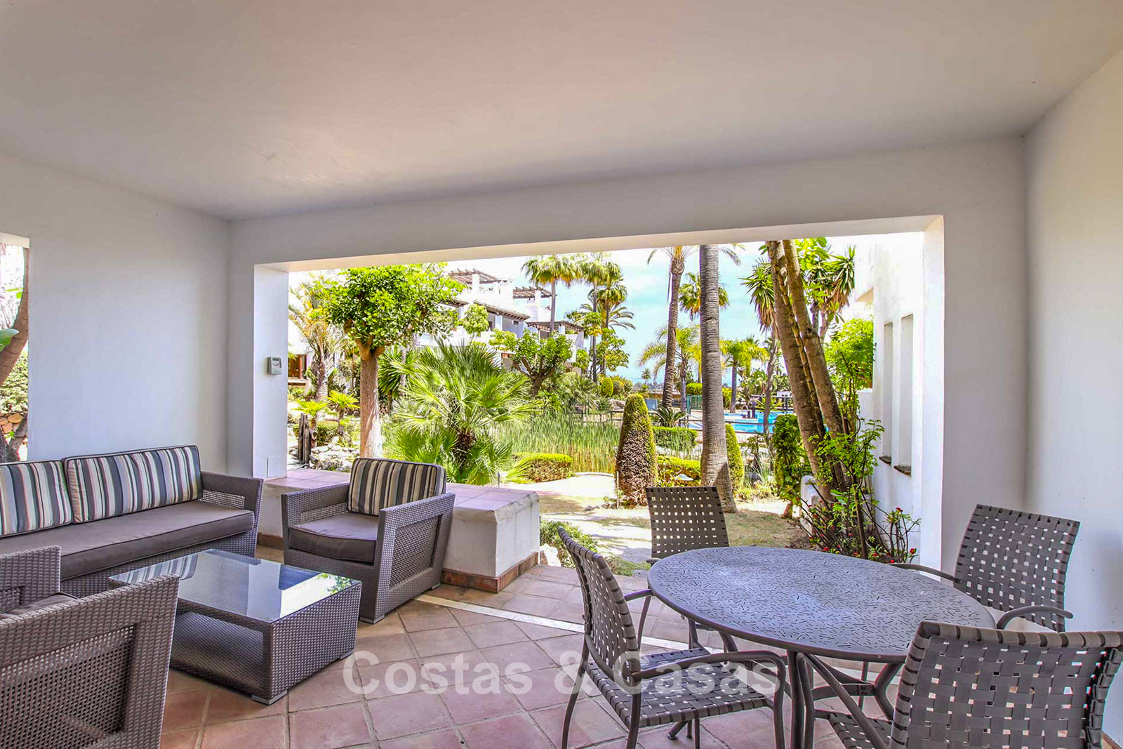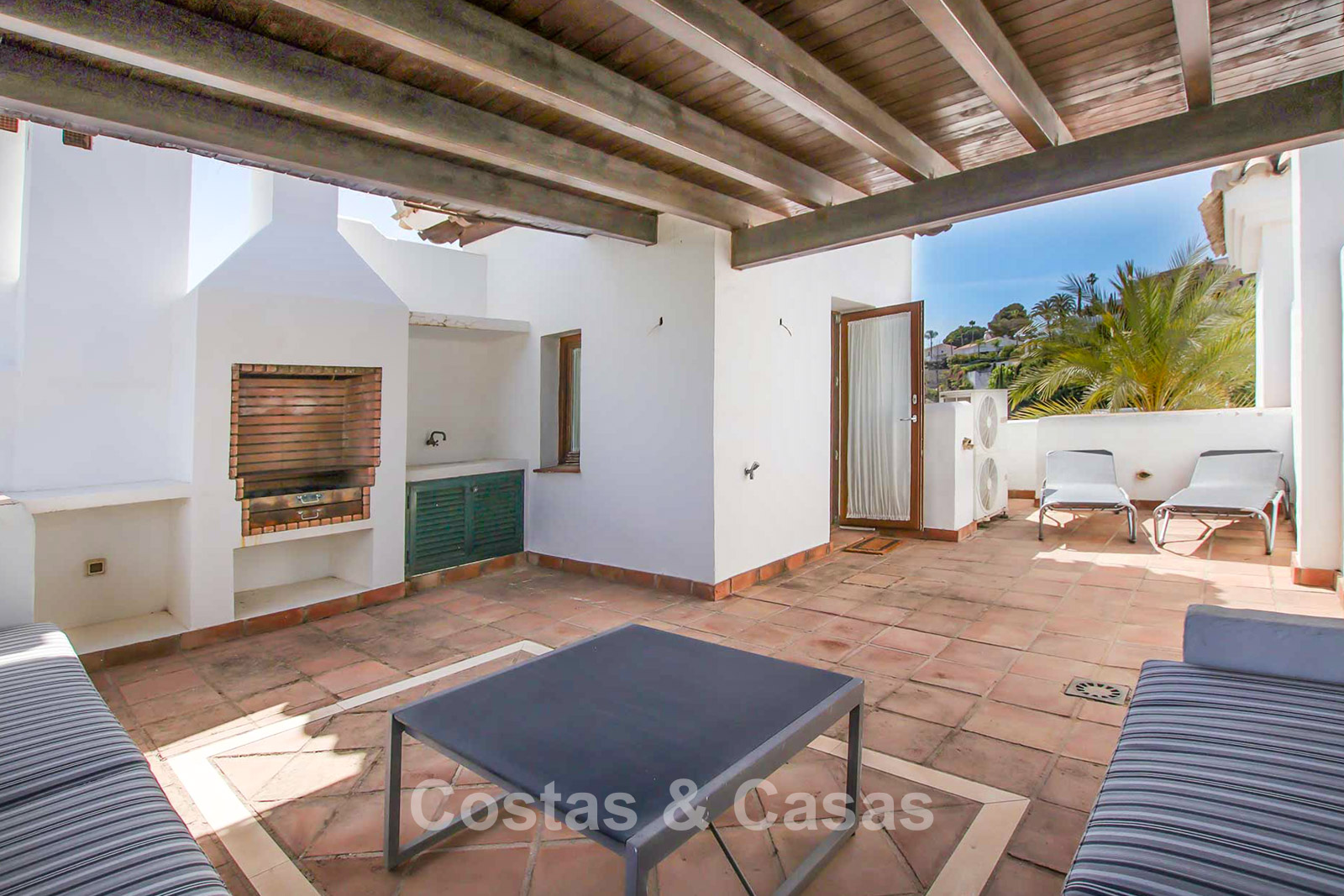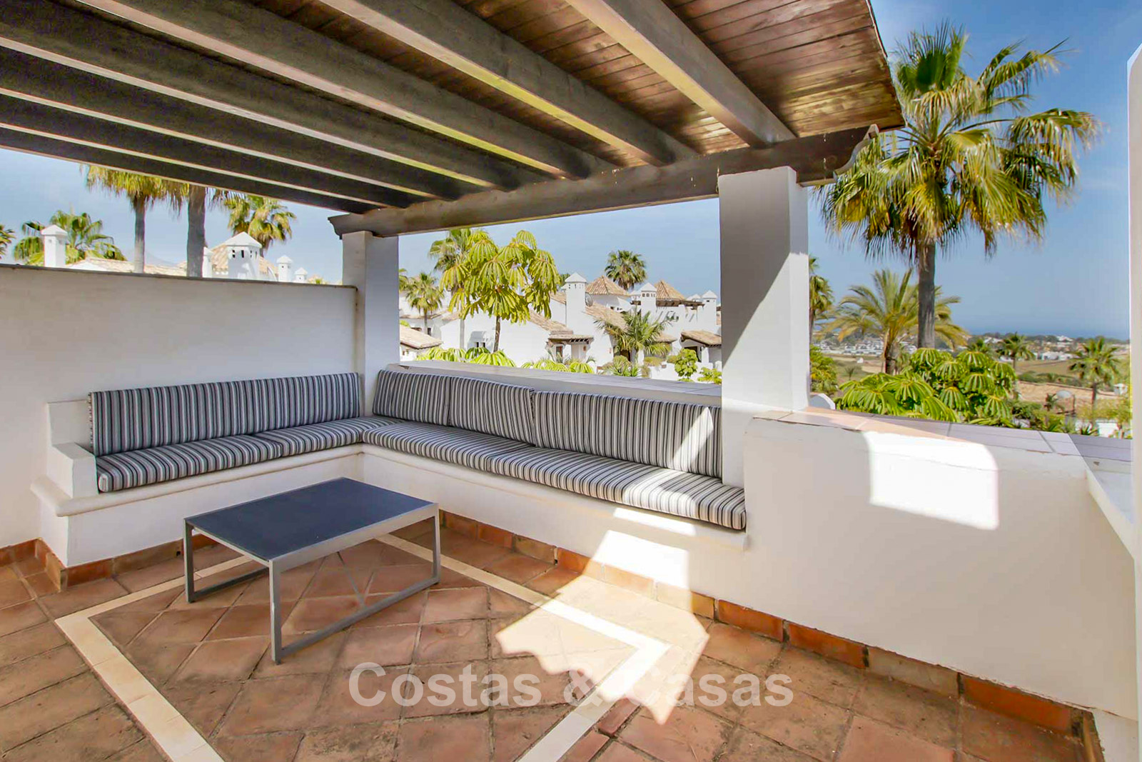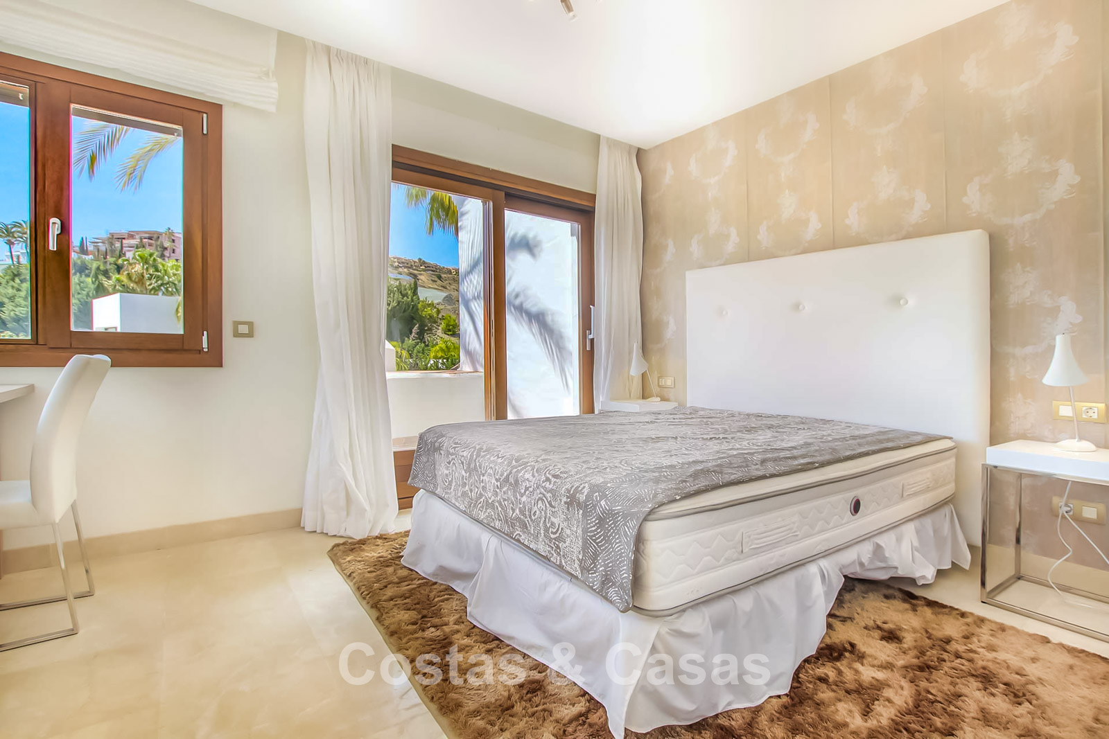 Maison au style méditerranéen moderne. Utiliser des matériaux de qualité. Orientée sud-est. Vues sur les jardins communaux, la vallée du golf et la mer Méditerranée. Une terrasse couverte, meublée de salles à manger et de salon, s'ouvre sur les jardins communaux. Le spacieux solarium est en partie couverte et offre un salon et un barbecue en pierre. De hautes fenêtres coulissantes offrent un intérieur aéré et très lumineux. Disposition ouverte. Salon spacieux avec coin repas intégré. Cuisine fermée et entièrement équipée avec appareils Siemens et une fenêtre de desserte donnant sur le séjour. 3 chambres, 3 salles de bains. La chambre principale possède un dressing et une salle de bain luxueuse. Sols en marbre. L’étage inférieur offre un espace multifonctionnel de 64 m² pouvant être aménagé librement. Débarras. Garage intérieur pour 1 voiture.