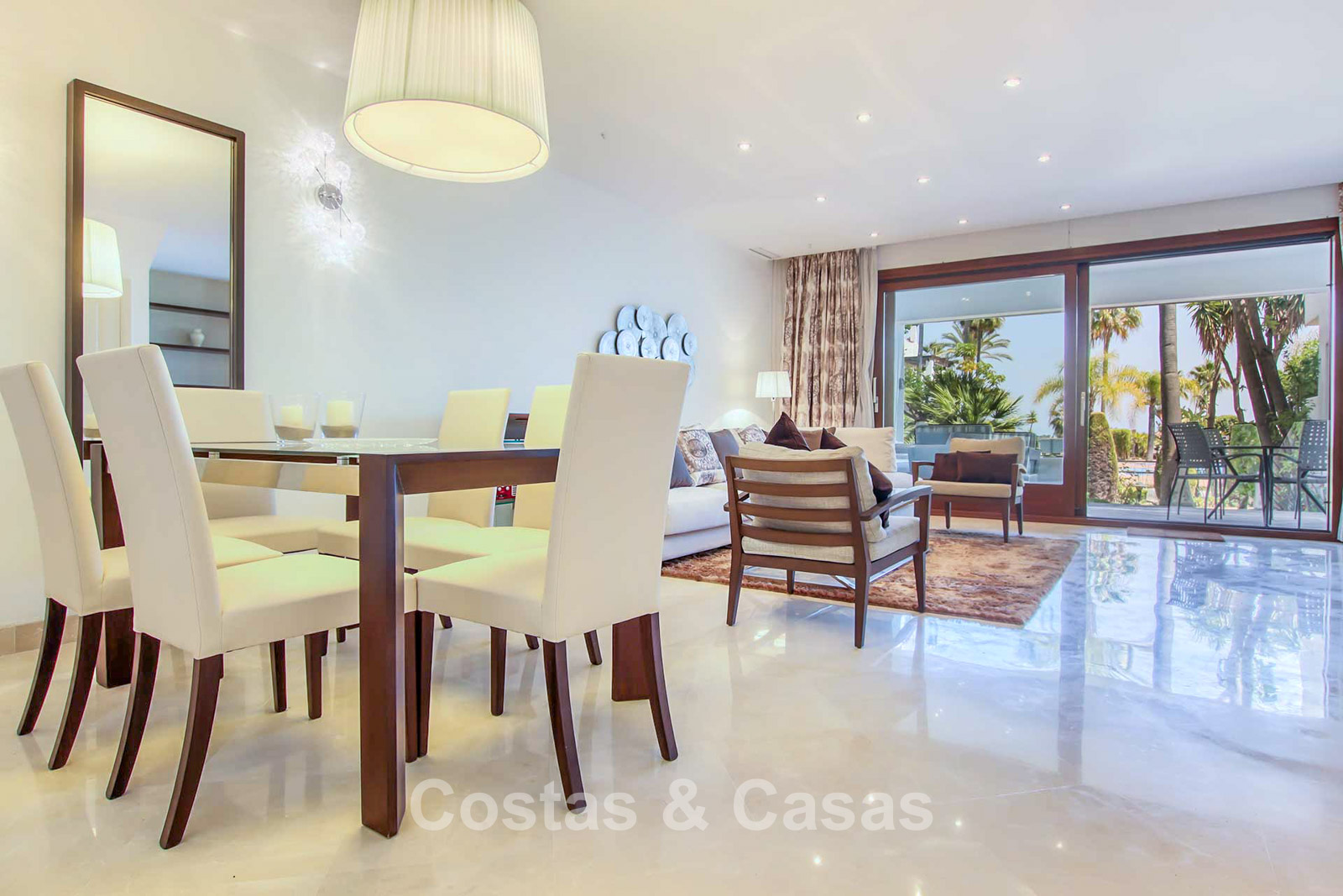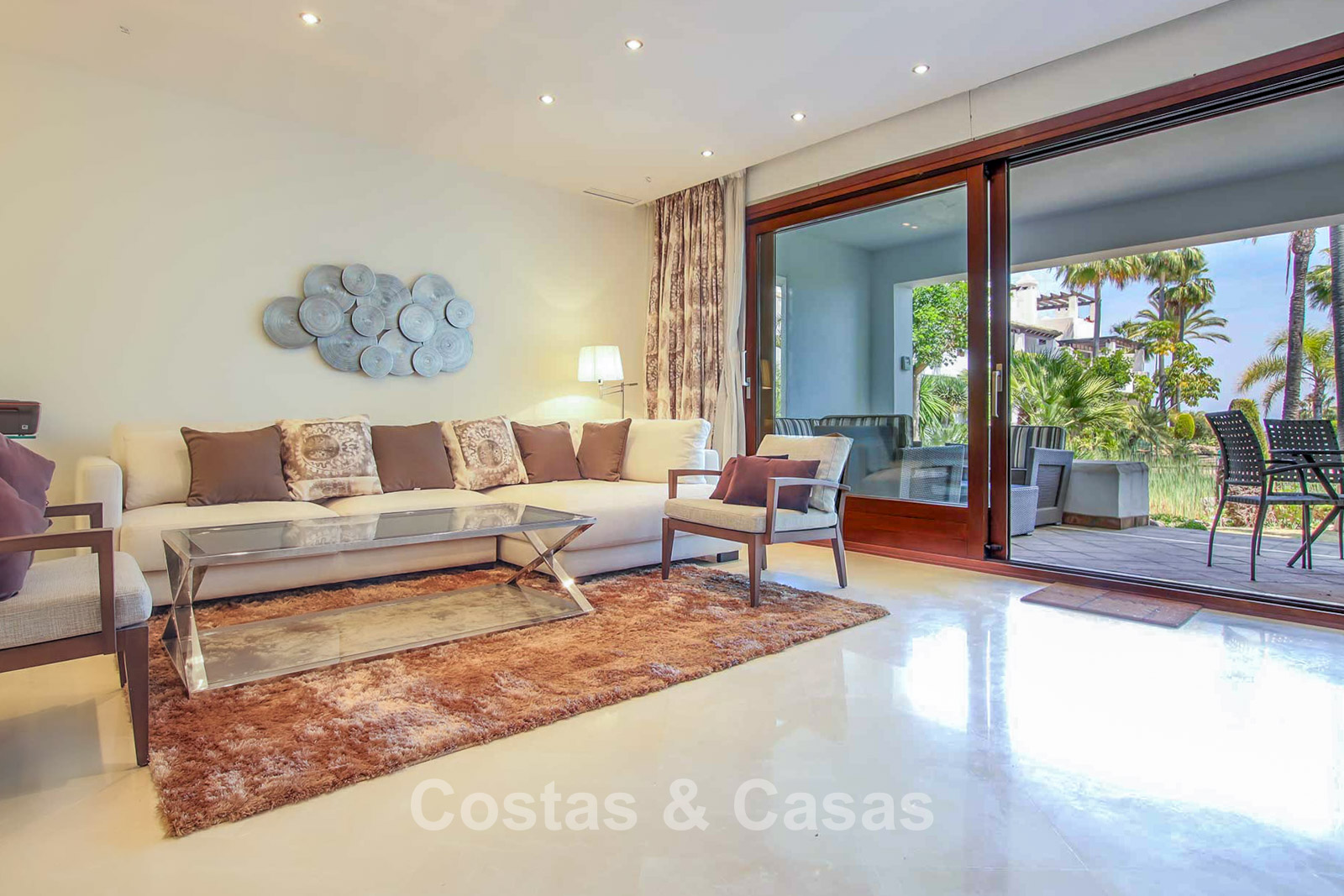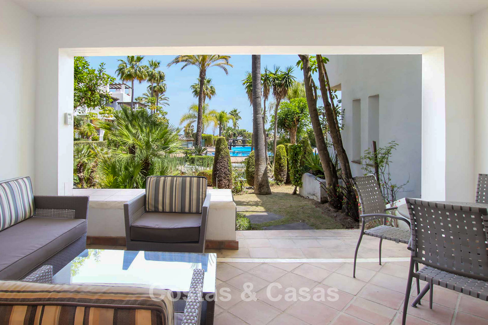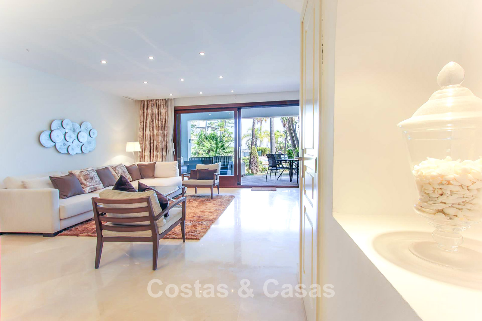 Maison au style méditerranéen moderne. Utiliser des matériaux de qualité. Orientée sud-est. Vues sur les jardins communaux, la vallée du golf et la mer Méditerranée. Une terrasse couverte, meublée de salles à manger et de salon, s'ouvre sur les jardins communaux. Le spacieux solarium est en partie couverte et offre un salon et un barbecue en pierre. De hautes fenêtres coulissantes offrent un intérieur aéré et très lumineux. Disposition ouverte. Salon spacieux avec coin repas intégré. Cuisine fermée et entièrement équipée avec appareils Siemens et une fenêtre de desserte donnant sur le séjour. 3 chambres, 3 salles de bains. La chambre principale possède un dressing et une salle de bain luxueuse. Sols en marbre. L’étage inférieur offre un espace multifonctionnel de 64 m² pouvant être aménagé librement. Débarras. Garage intérieur pour 1 voiture.