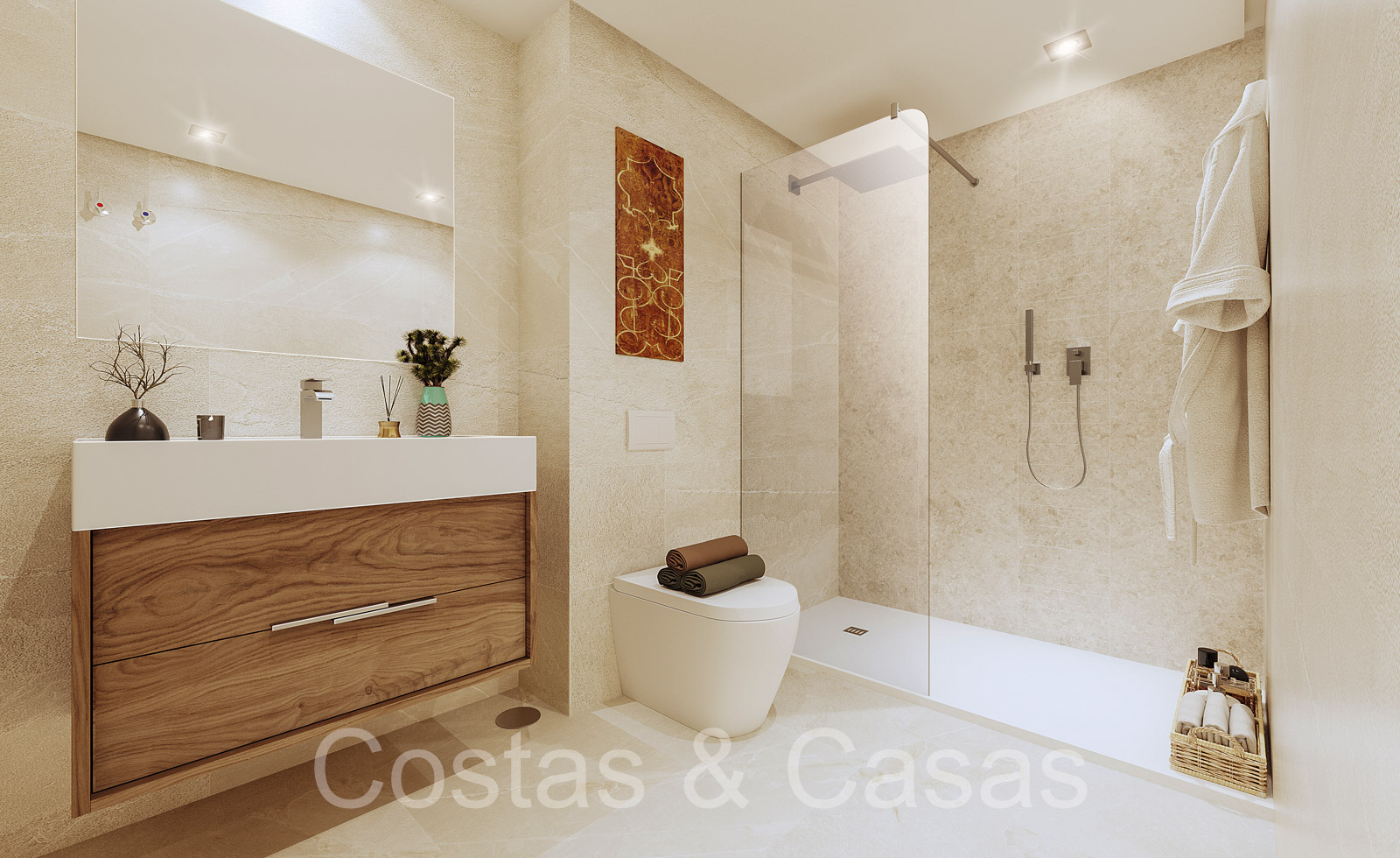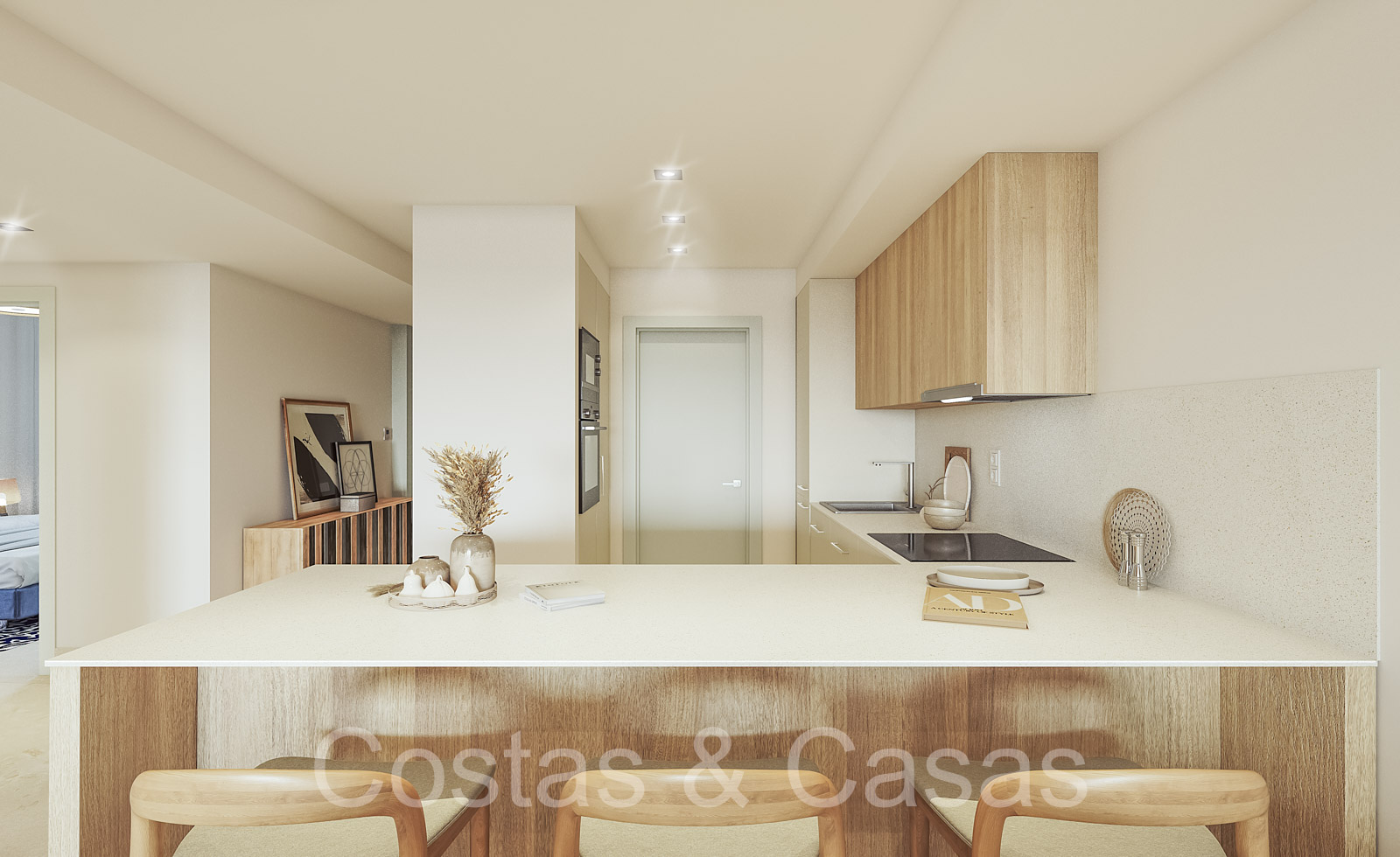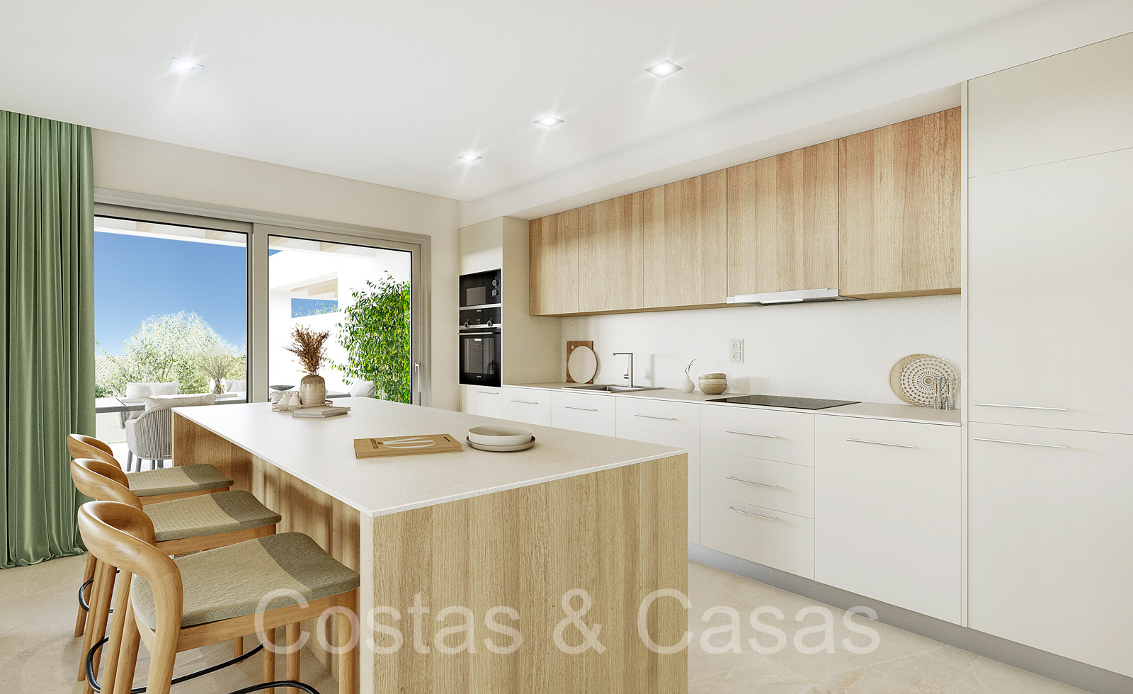 Appartements neufs de style contemporain. Haut niveau de finition avec des matériaux de qualité. Orienté vers le sud-est. Vues panoramiques sur les golfs et la mer Méditerranée. Design d'intérieur aéré et élégant. Appartements au rez-de-chaussée, 1er ou 2ème étage. Concept à aire ouverte. Cuisine moderne et ouverte, entièrement équipée d'appareils Siemens et équipée d'un îlot de cuisson avec coins salons. Attenant à une buanderie. Les hautes fenêtres coulissantes génèrent beaucoup de lumière naturelle dans les maisons et donnent sur les terrasses spacieuses. Coin repas intégré. 2 ou 3 chambres, 2 salles de bains. Sols en porcelaine de qualité 90x90cm de la marque Saloni. Débarras et place de parking dans le garage souterrain inclus.