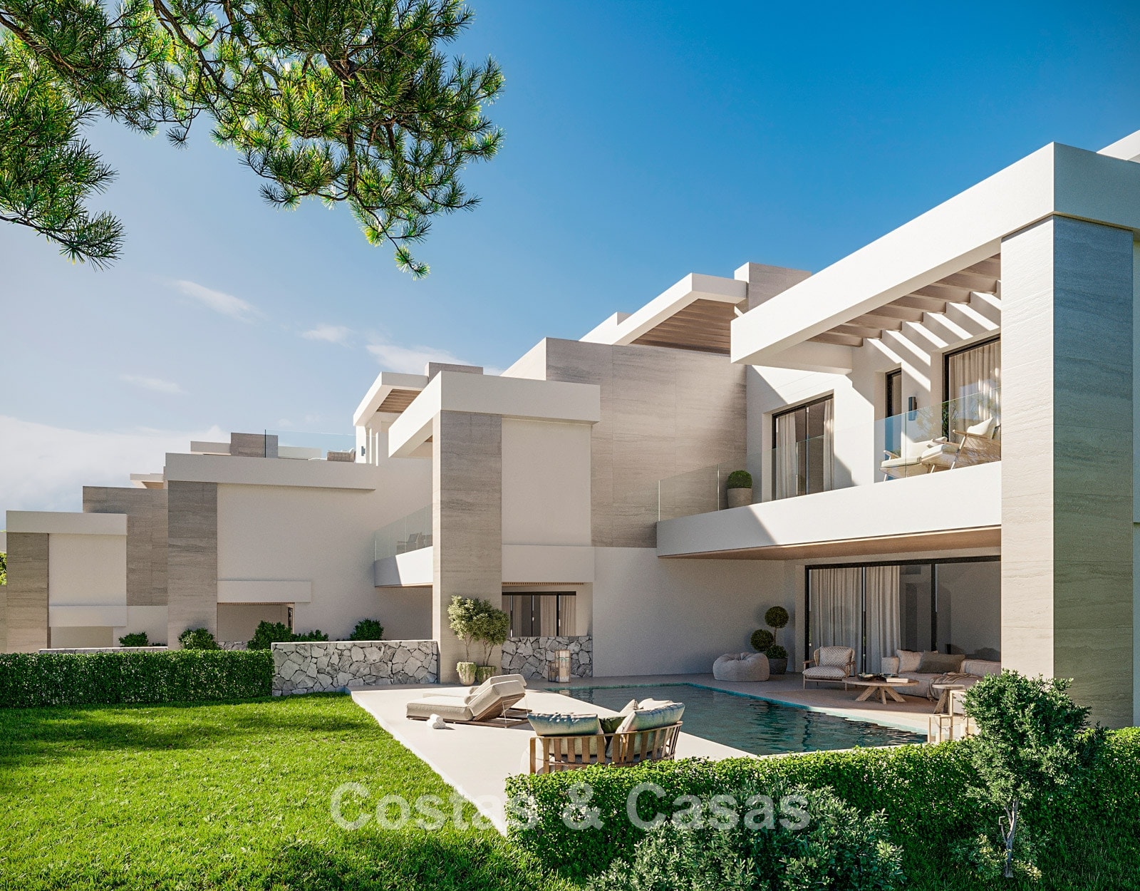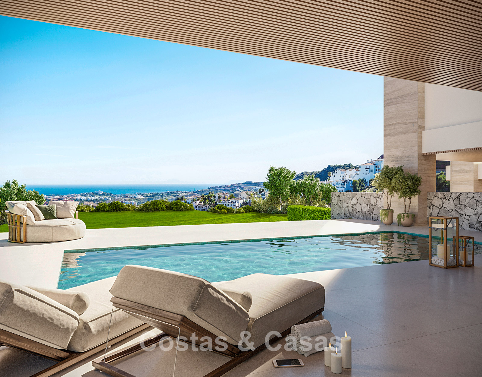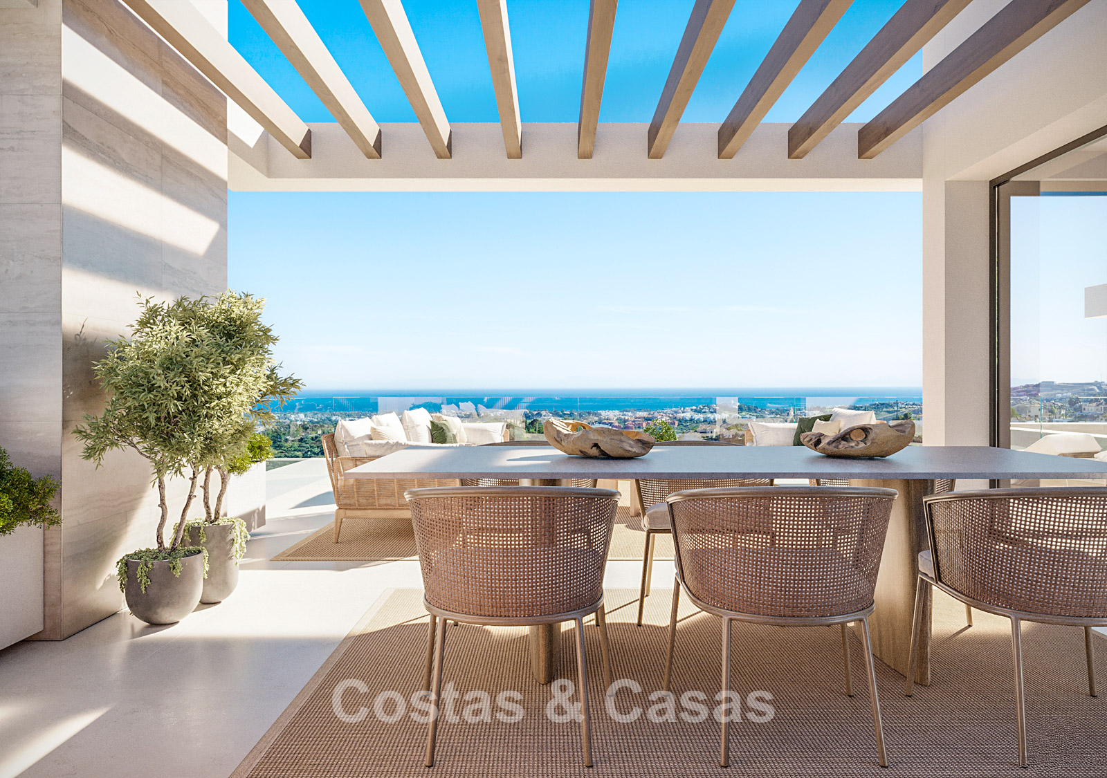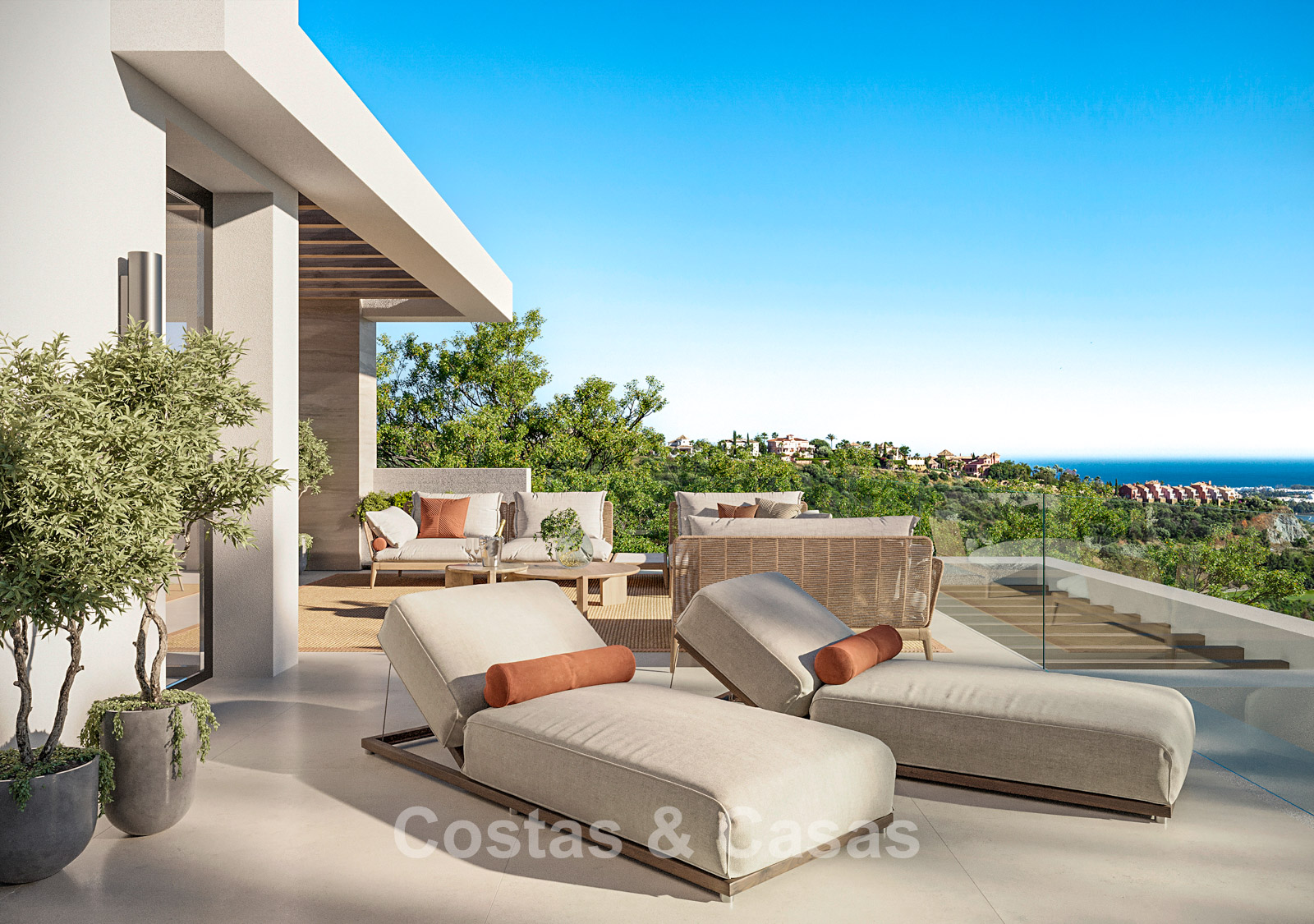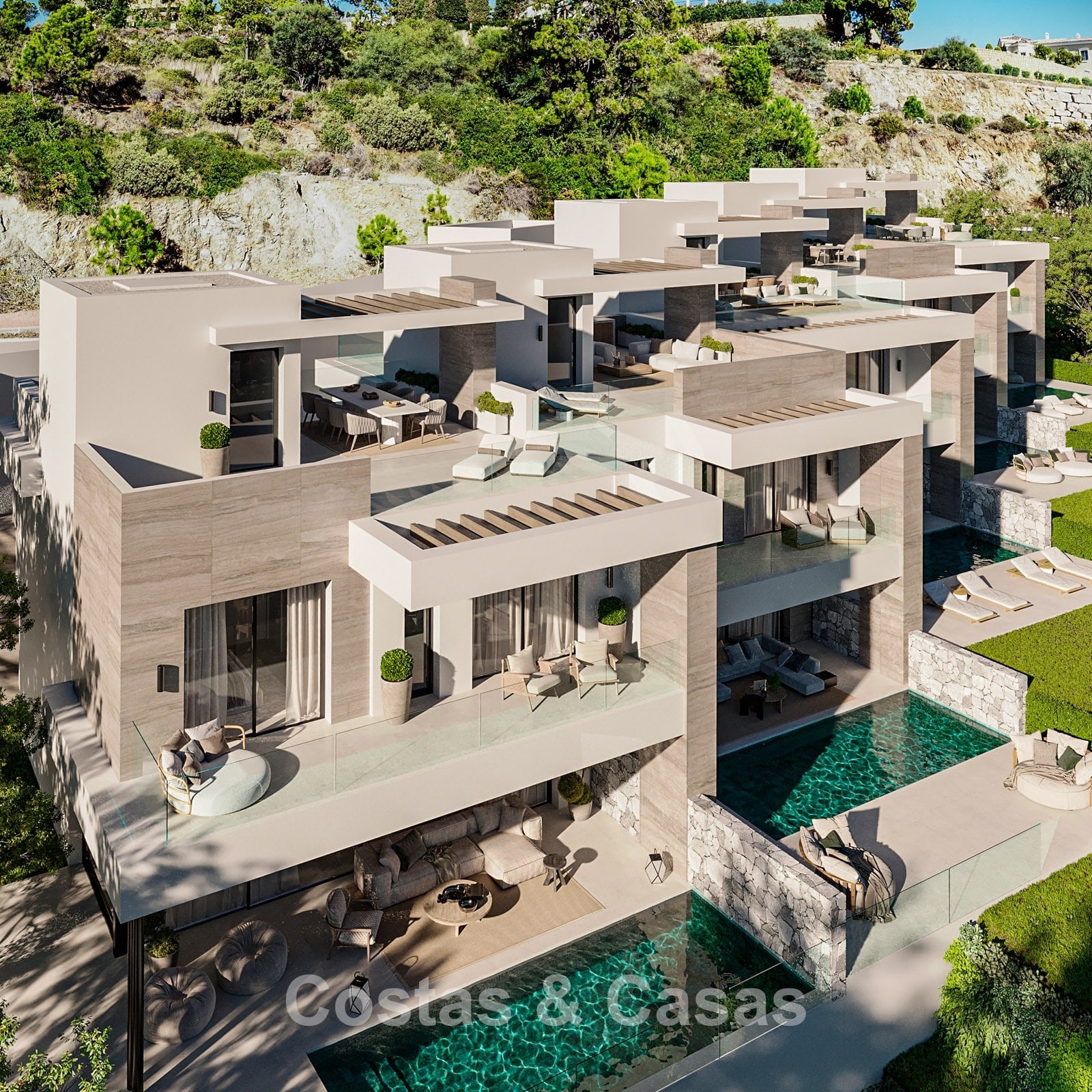 Nouvelle collection de 5 luxueuses villas neuves au style moderne méditerranéen. Orientation sud-est. Vue panoramique sur les montagnes et la mer Méditerranée depuis chaque étage hors sol. Construites avec des matériaux de haute qualité et des finitions haut de gamme. Le solarium offre un espace lounge et une salle à manger extérieure. Intérieurs ouverts, modernes et contemporains, baignés de lumière naturelle. Baies vitrées du sol au plafond et parfaite continuité entre intérieur et extérieur. Cuisines ouvertes entièrement équipées et réalisées sur mesure. Chaque villa dispose de 4 chambres avec salle de bains privative, ainsi qu’une suite parentale avec terrasse privée. Le niveau inférieur polyvalent peut être aménagé selon vos besoins, que ce soit en salle de sport avec sauna ou en salon TV supplémentaire. Ce niveau comprend également une cinquième chambre en suite avec lit simple et accès à un patio. Buanderie. Débarras. Local technique. 3 places de parking intérieures.