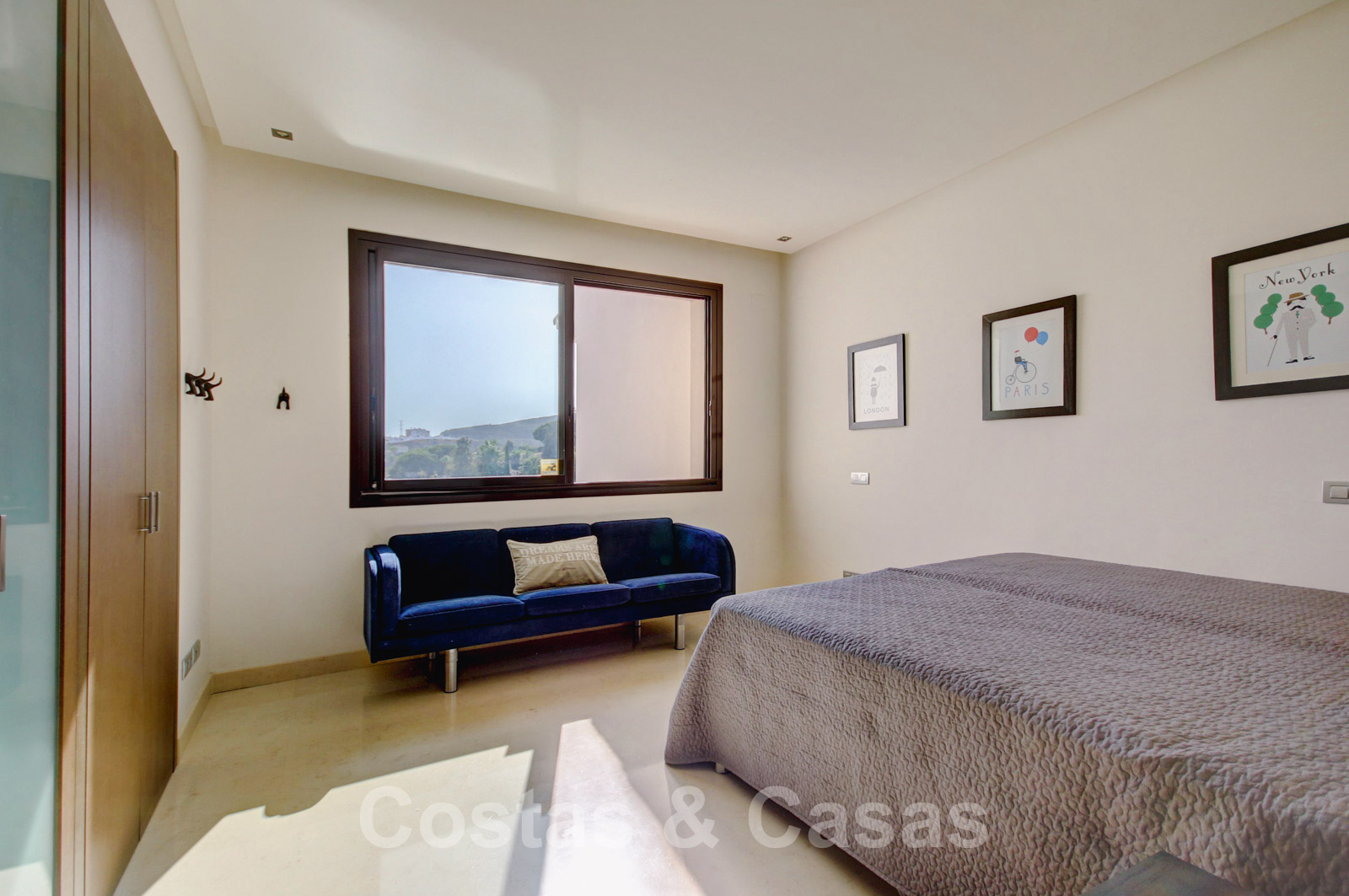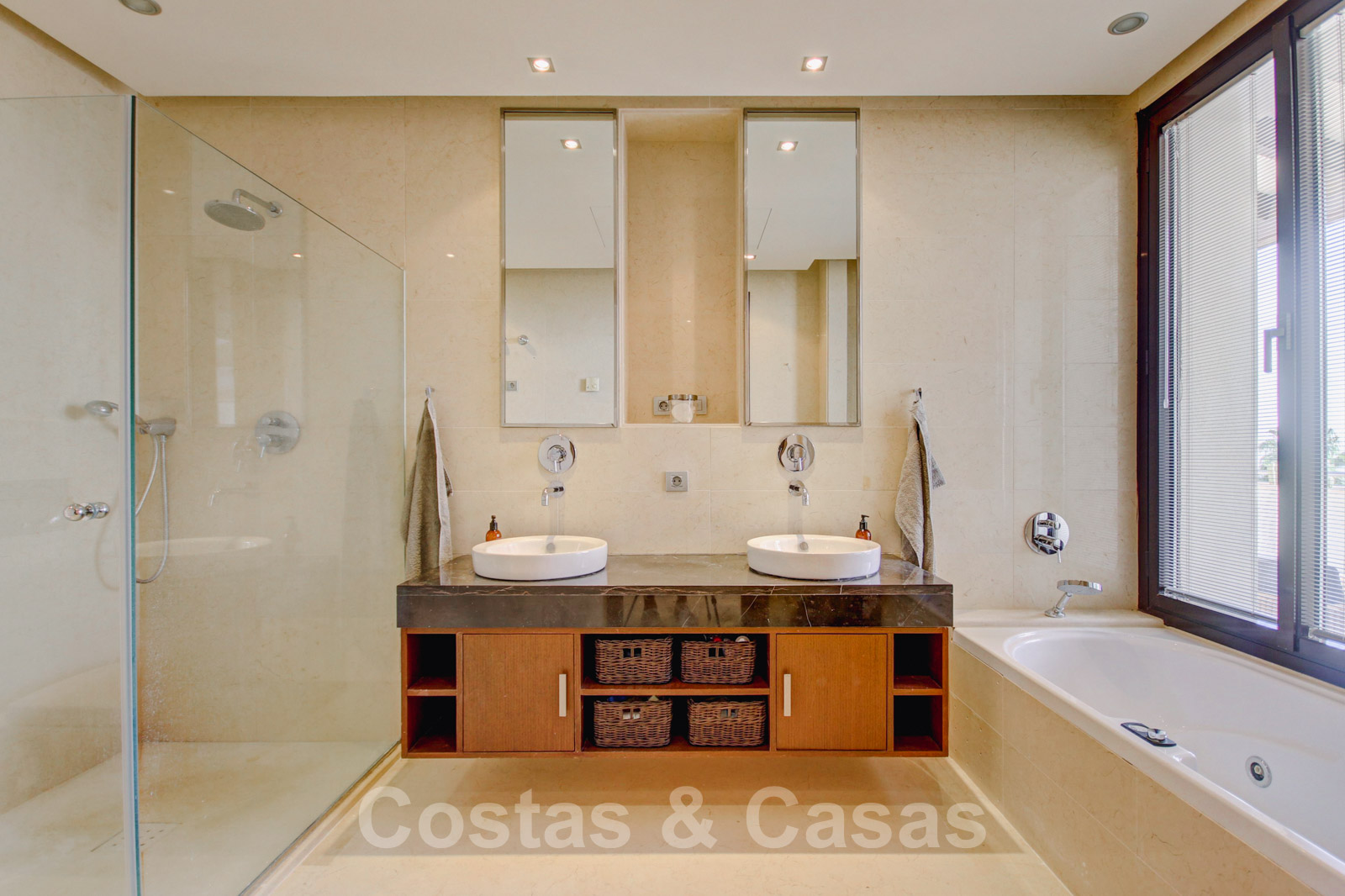 Spacieuse chambre principale avec douche et baignoire, elle donne sur la grande terrasse principale ouverte et dispose d'armoires encastrées.