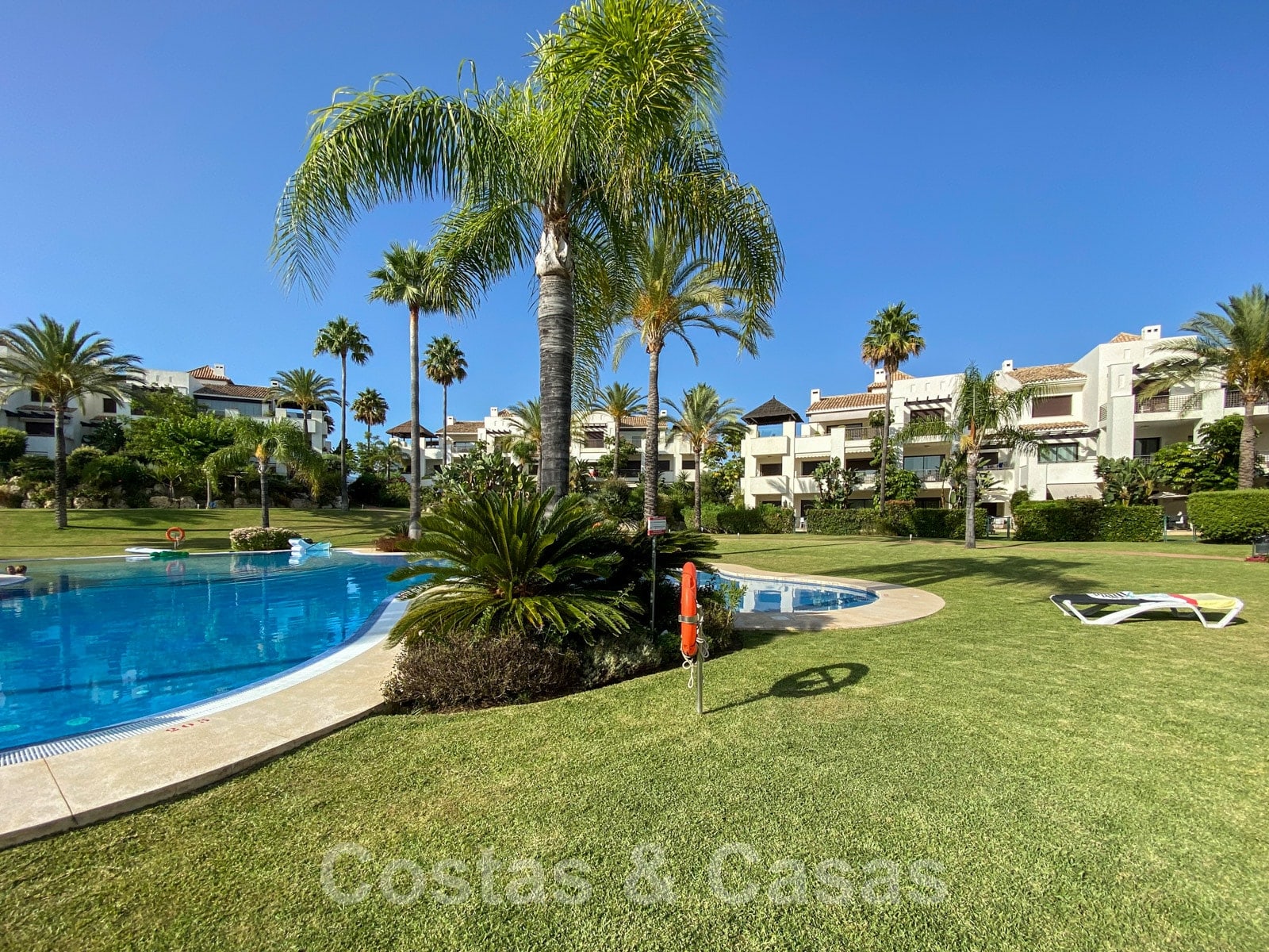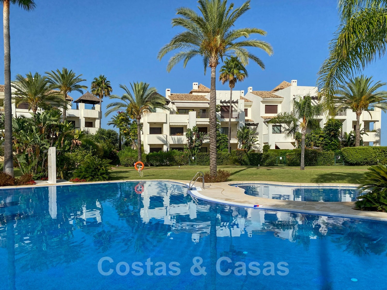 La propriété comprend deux piscines communes, toutes entourées de pelouses ouvertes avec plusieurs éléments aquatiques.