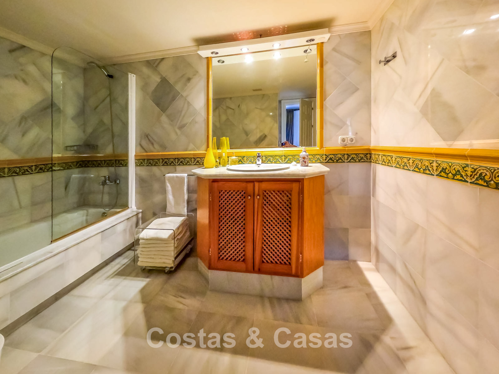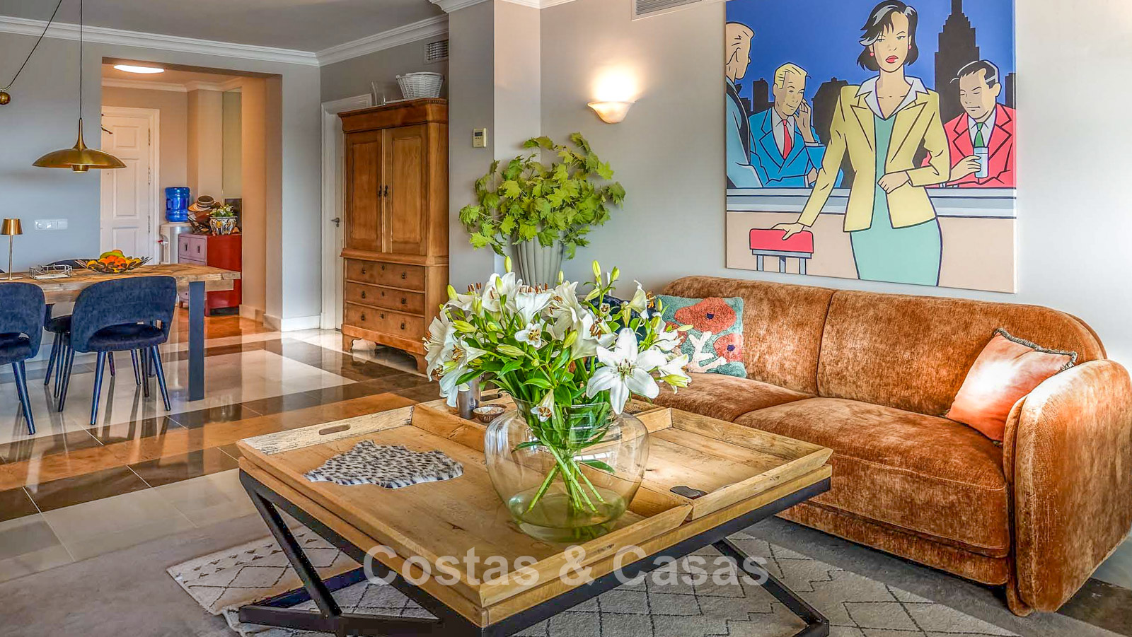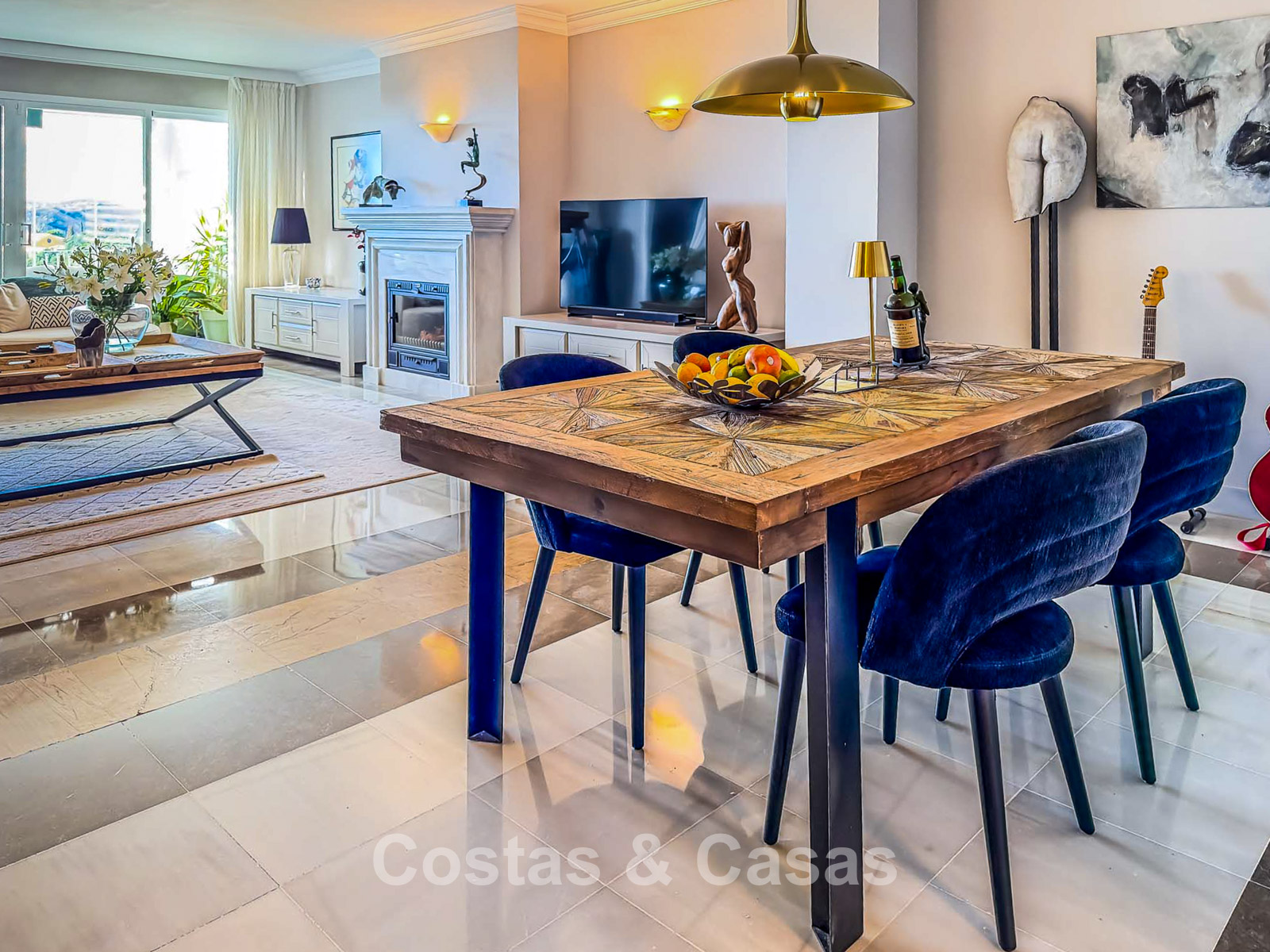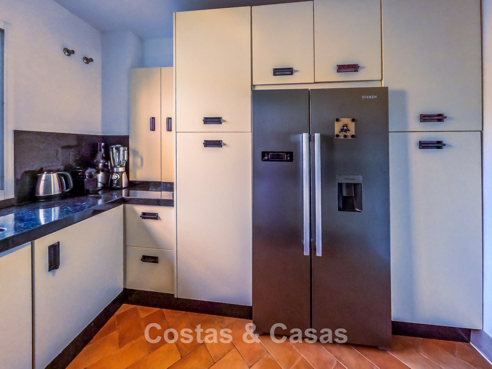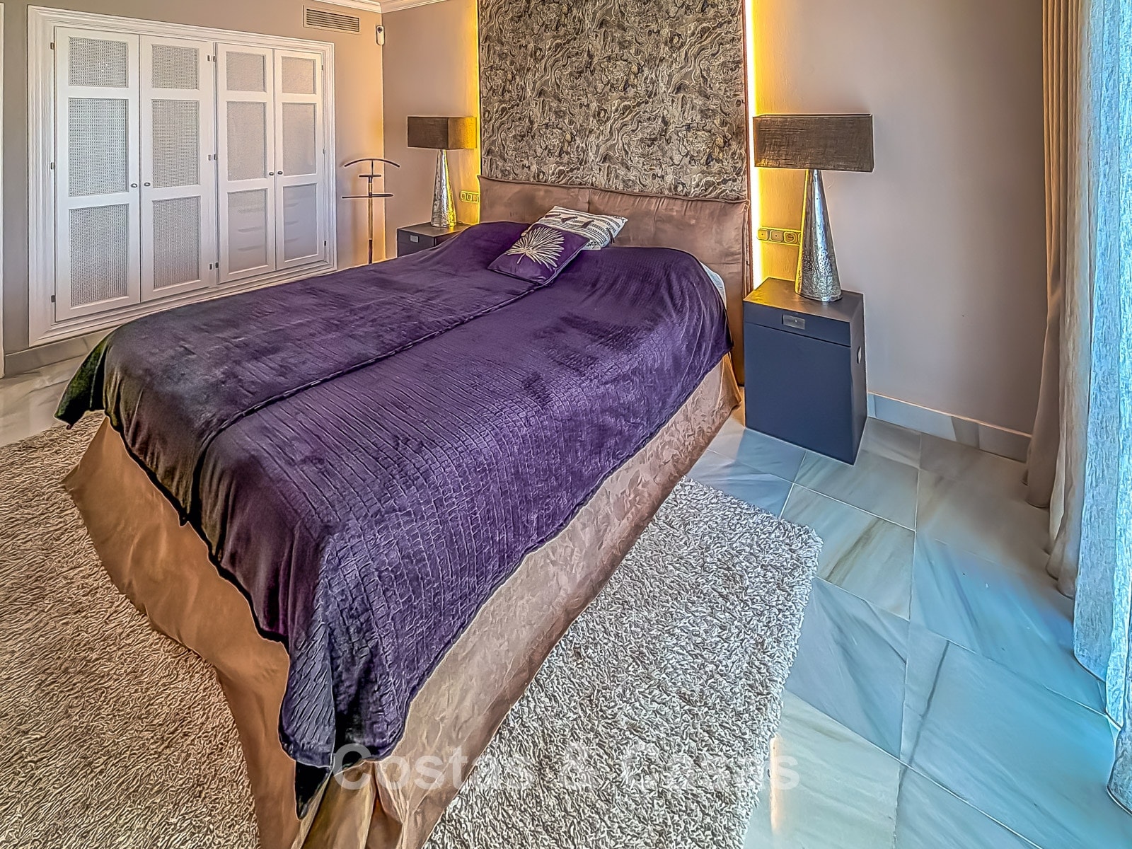 Penthouse en excellent état. Réalisé avec des matériaux de haute qualité. Intérieur lumineux et ouvert. Orientation sud-ouest. Vues panoramiques sur la mer Méditerranée, s’étendant jusqu’à la côte africaine et le détroit de Gibraltar. La terrasse est équipée d’une pergola électronique moderne et de rideaux de verre, permettant de la transformer facilement en un élégant salon d’hiver en un instant. Les grandes baies vitrées assurent une parfaite continuité entre les espaces intérieurs et extérieurs. Spacieuse pièce de vie d’environ 50 m² avec un agréable salon TV et une cheminée. Espace salle à manger intégré. Cuisine indépendante entièrement équipée. Deux chambres, chacune avec sa salle de bains en suite.