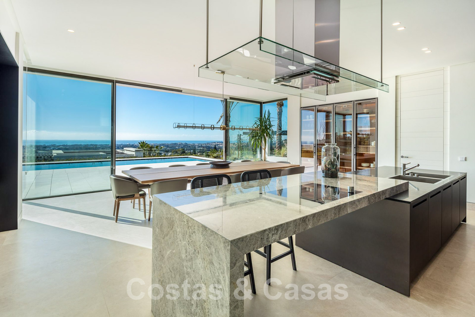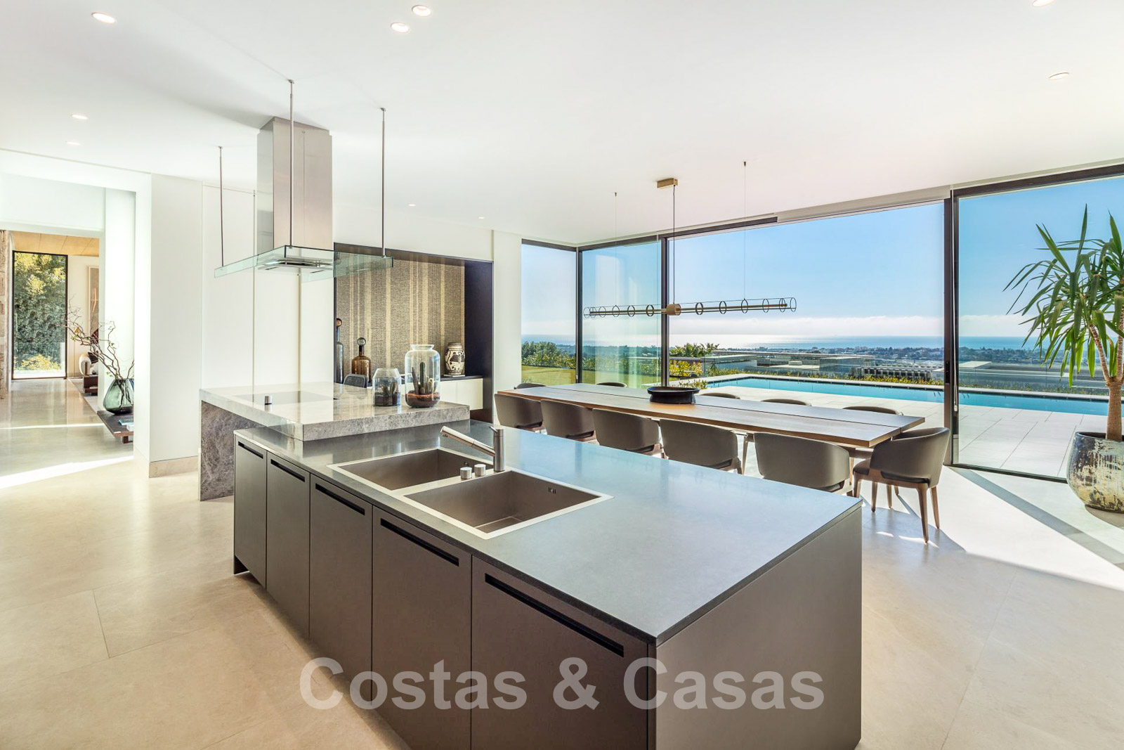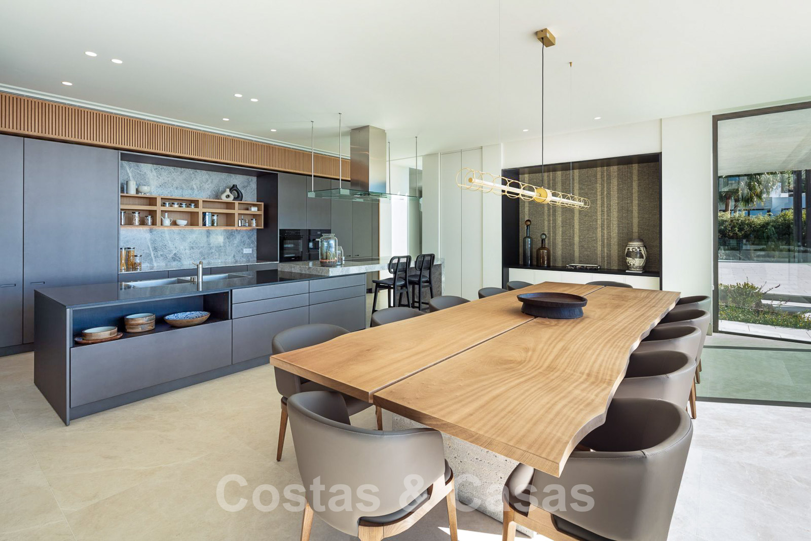 Cuisine élégante et équipée avec bar pour le petit-déjeuner, grande table à manger et accès aux vastes espaces extérieurs.