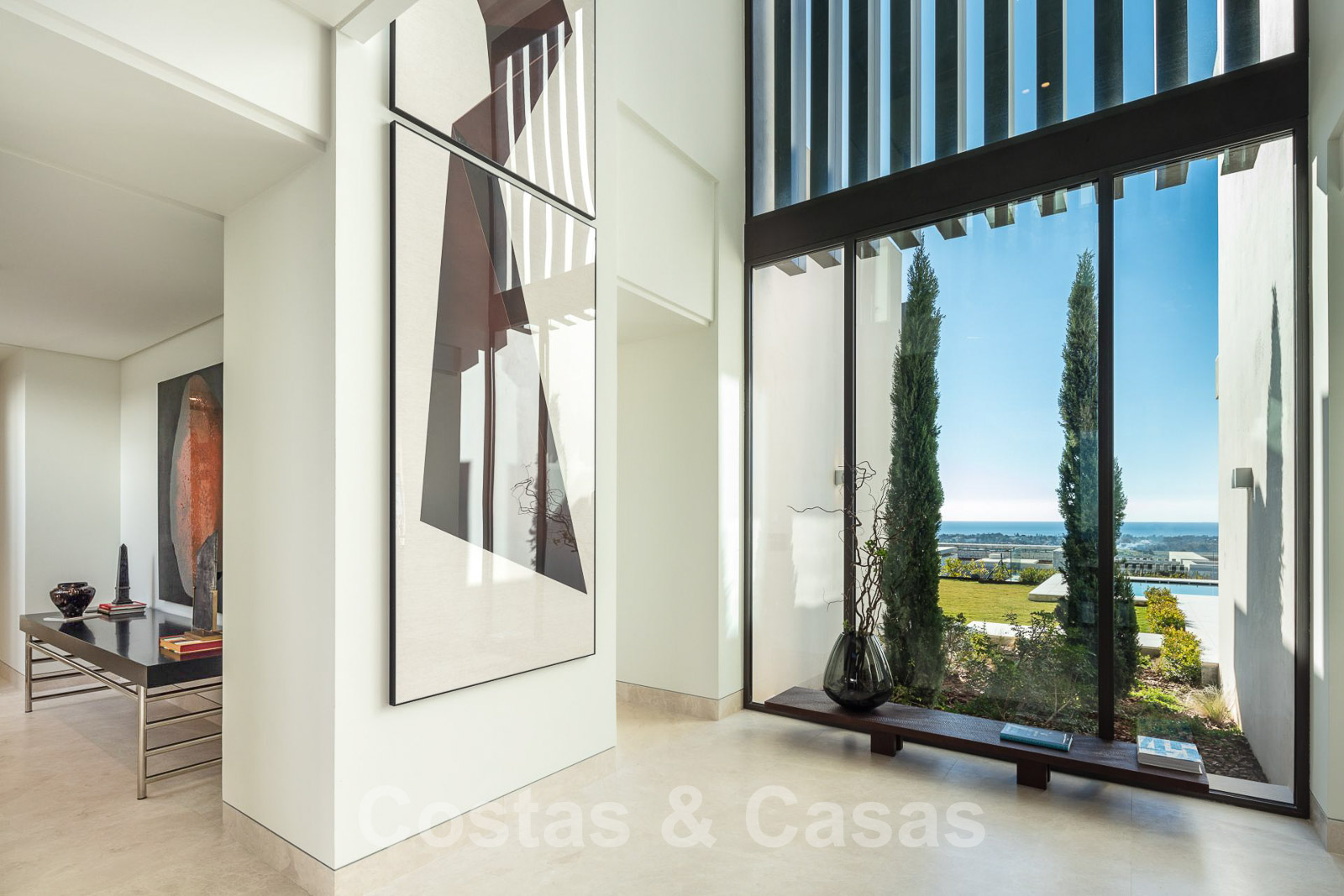 Une belle entrée vous accueille dans un hall d'entrée à double hauteur avec la mer en arrière-plan.