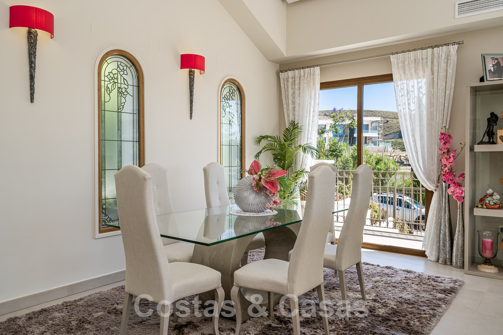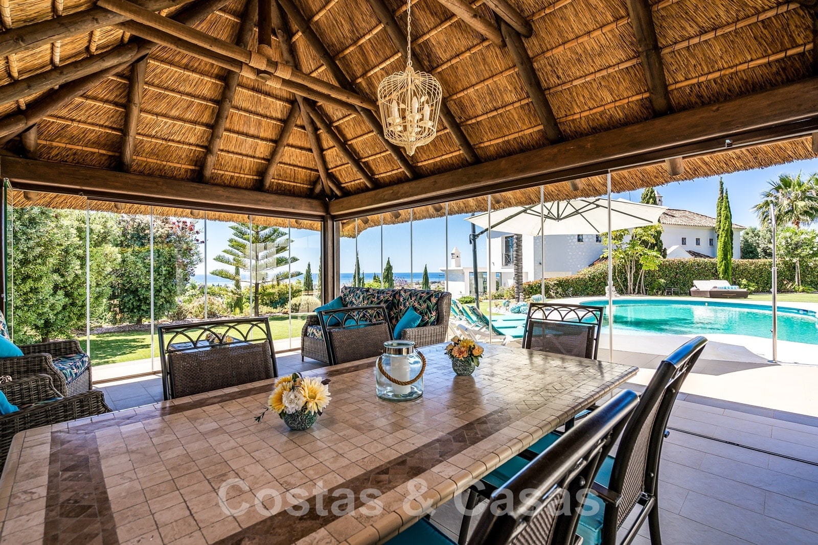 Pool house avec chillout et table à manger, équipé de rideaux en verre.