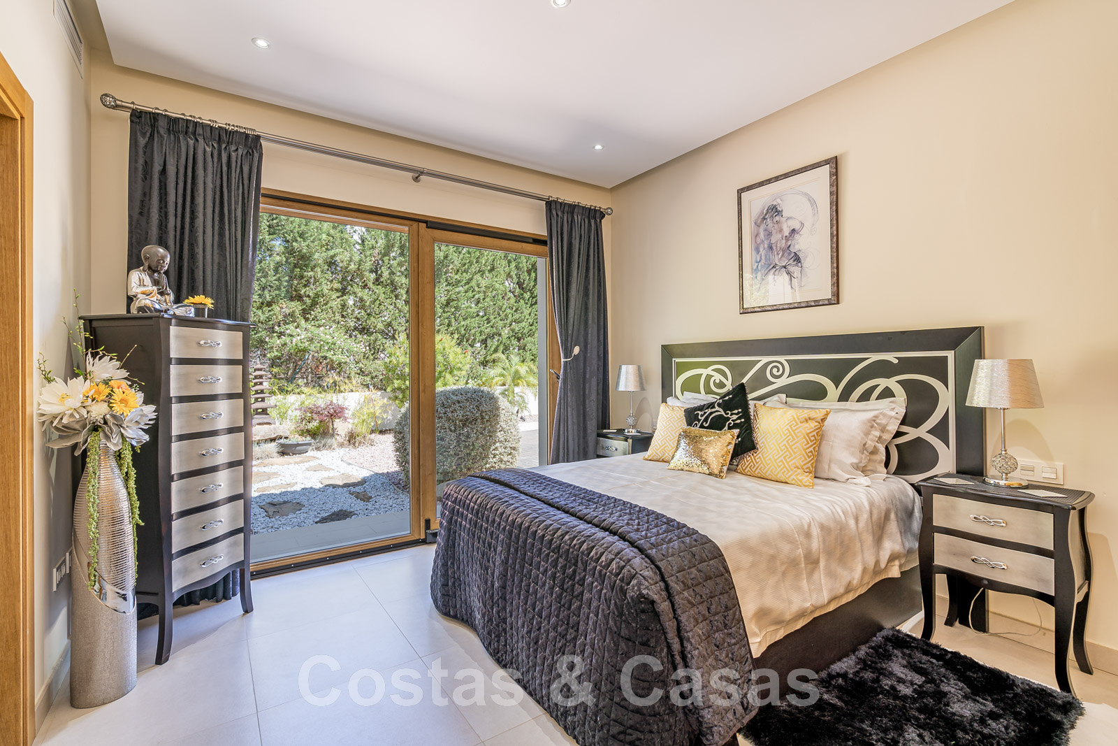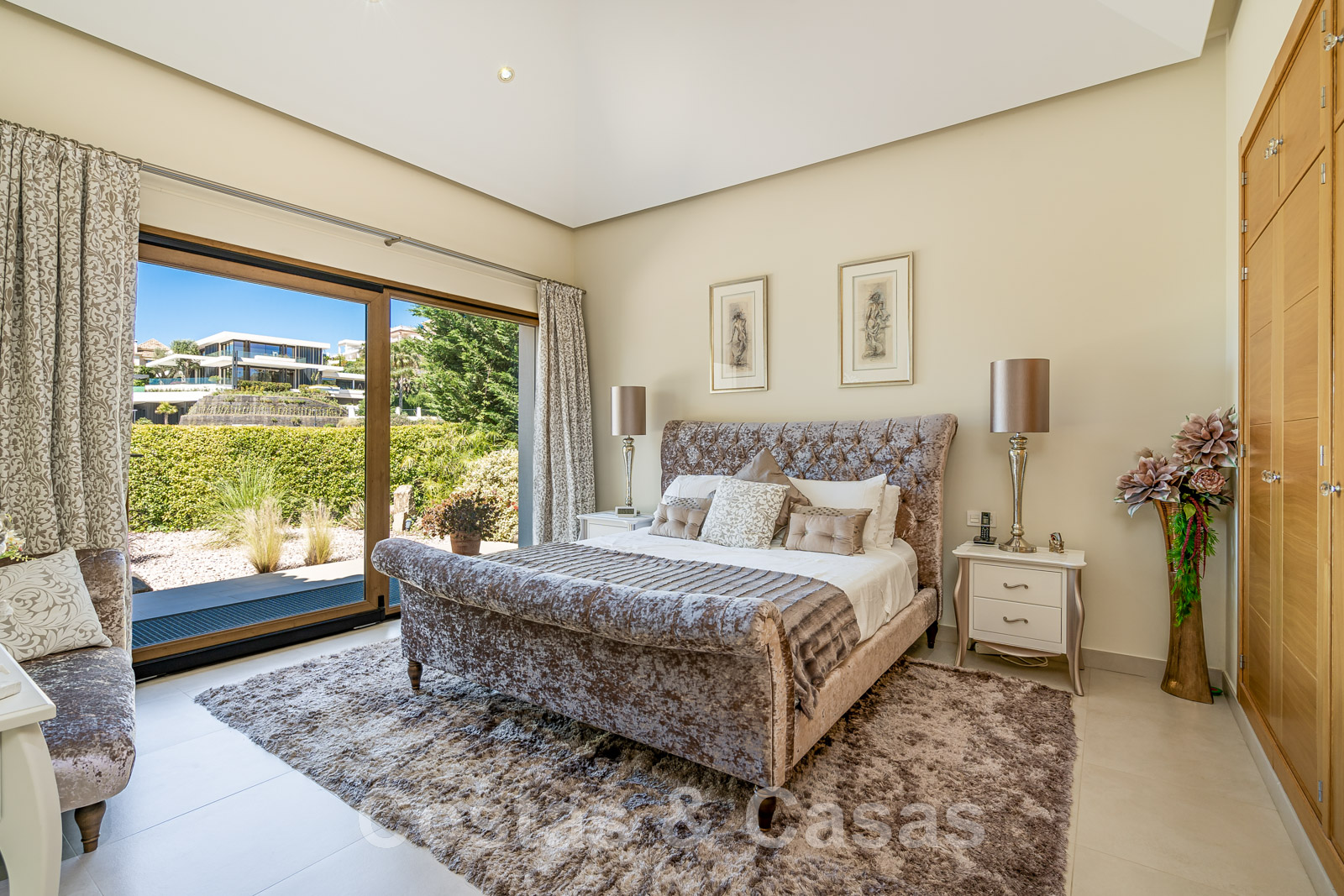 Suite principale avec plafond extra haut et accès au jardin.