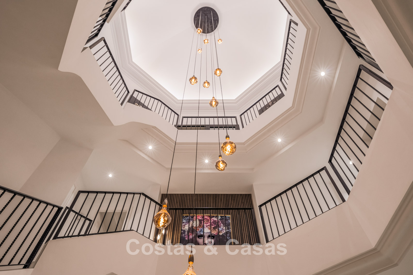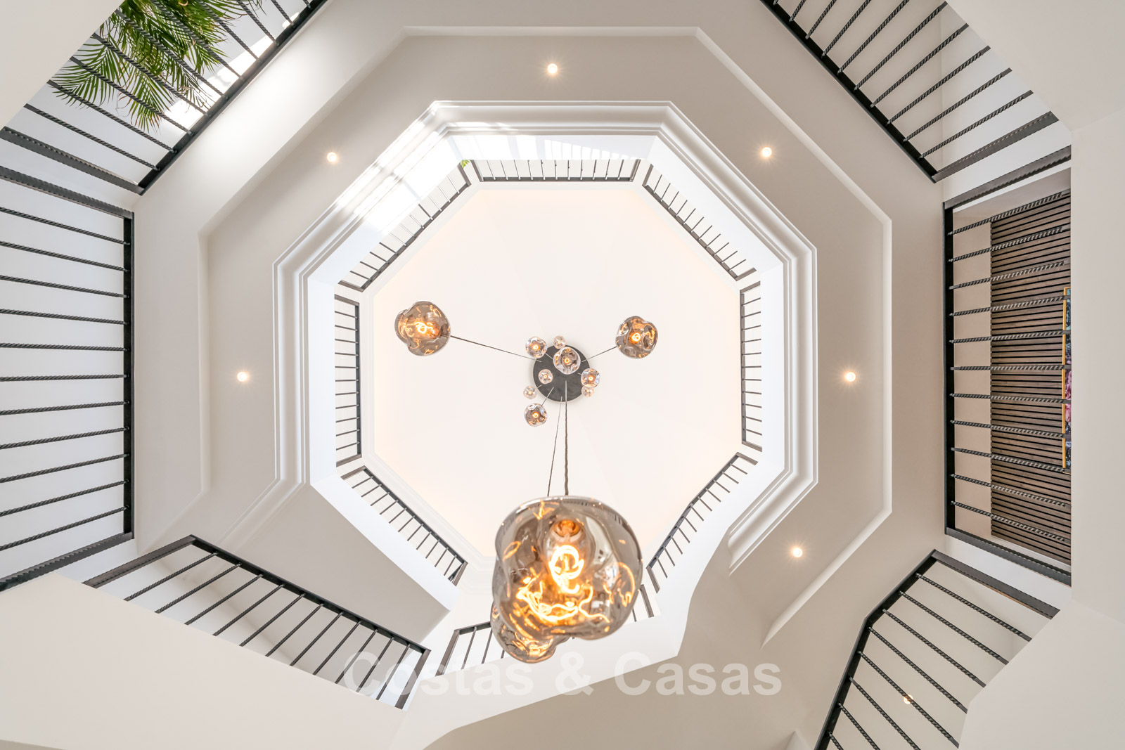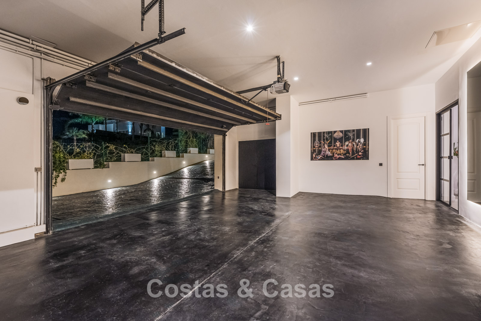 Ascenseur desservant tous les étages. Balustrades en verre. Climatisation. Système domotique avancé. Fenêtres coulissantes hautes. Éclairage extérieur. Système de musique intégré.