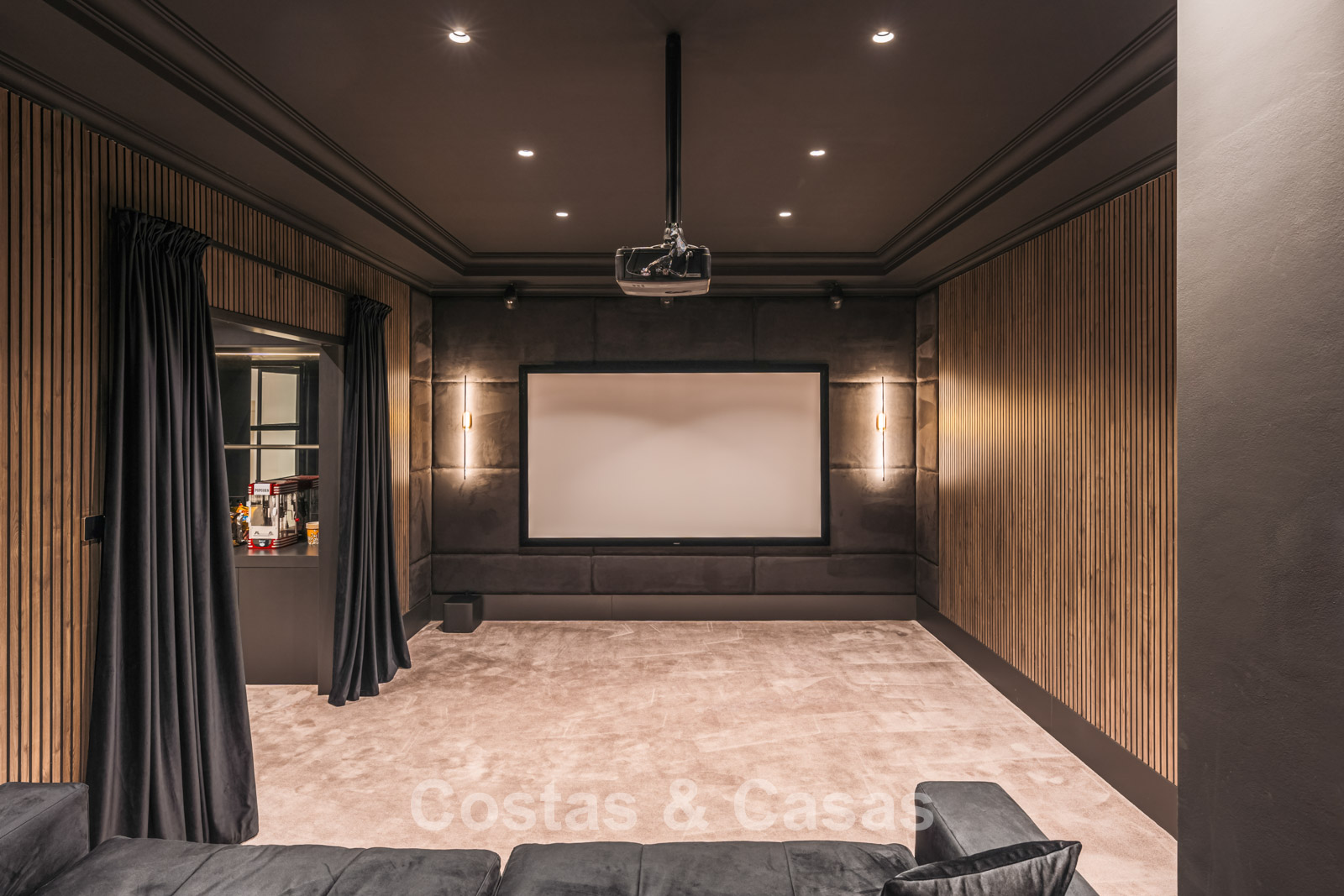 Étage inférieur Le hall donne sur un salon central agrémenté d'un mur à vin sur mesure. Un home cinéma entièrement conçu dans un style loft avec un bar assorti. Spa privé avec sauna et piscine. Gymnase entièrement équipé. 2 chambres en-suite. Buanderie équipée d'appareils Miele. Débarras/ salle technique. Garage intérieur pour plusieurs voitures.