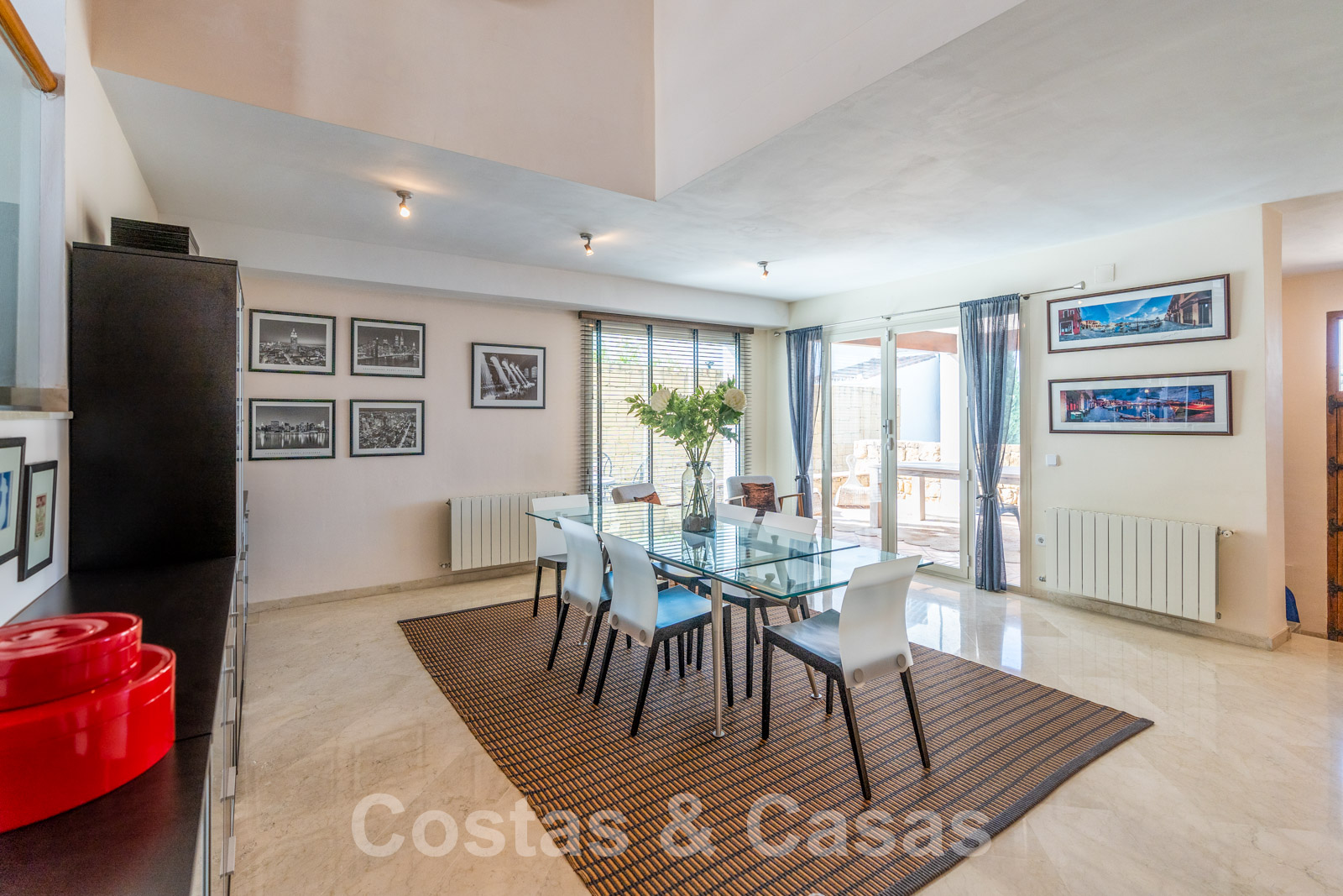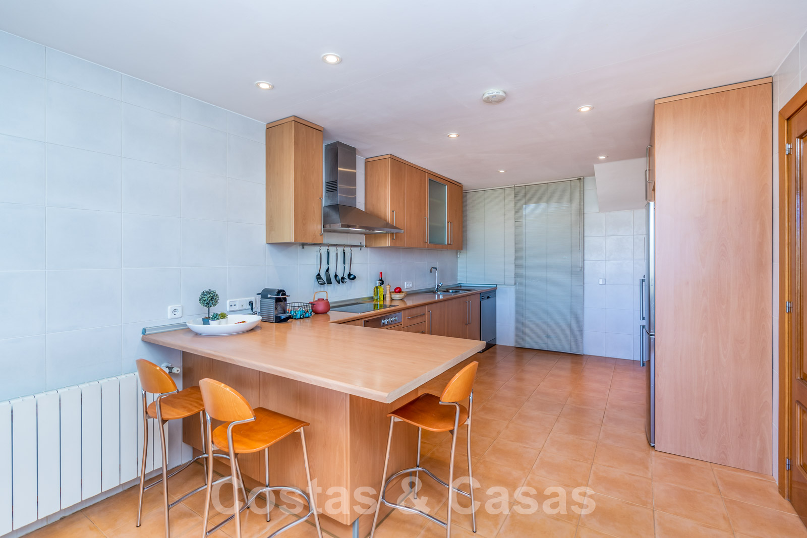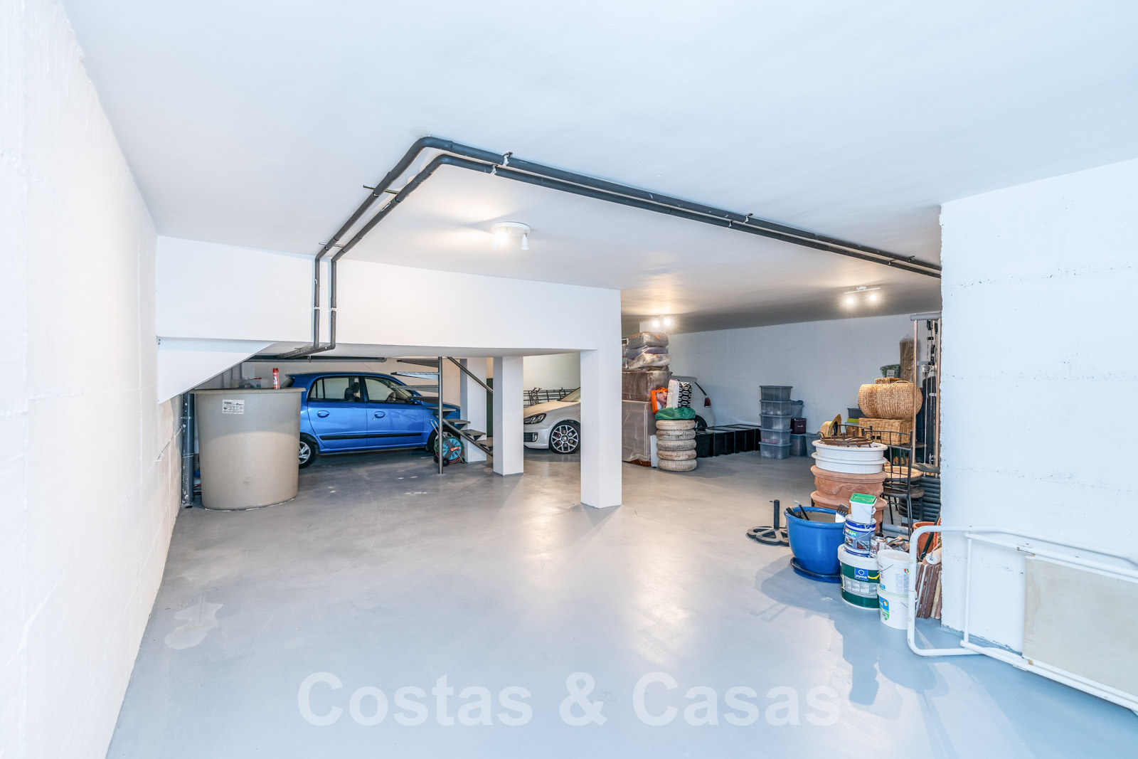 Villa spacieuse au style architectural méditerranéen. L'entrée se compose d'un porche confortable qui donne accès à la cour par le côté. Hall d'entrée avec une toilette invités. Vous entrez dans l'espace de vie ouvert, qui est relié à un coin salon par une structure mezzanine. Celui-ci donne accès à une terrasse ombragée équipée d'un chill-out. A ce niveau il y a aussi une chambre d'amis avec salle de bain séparée. Cuisine séparée et pratique avec un bar pour le petit-déjeuner et accès à un espace couvert "repas en plein air". Une piscine privée avec une terrasse adjacente. Le jardin paysager et nécessitant peu d'entretien offre un espace supplémentaire en profondeur qui peut être aménagé selon vos propres souhaits. Au total, il y a 4 chambres et 4 salles de bains. Sols en marbre de couleur crème. Grand débarras et garage intérieur pour 2 voitures.
