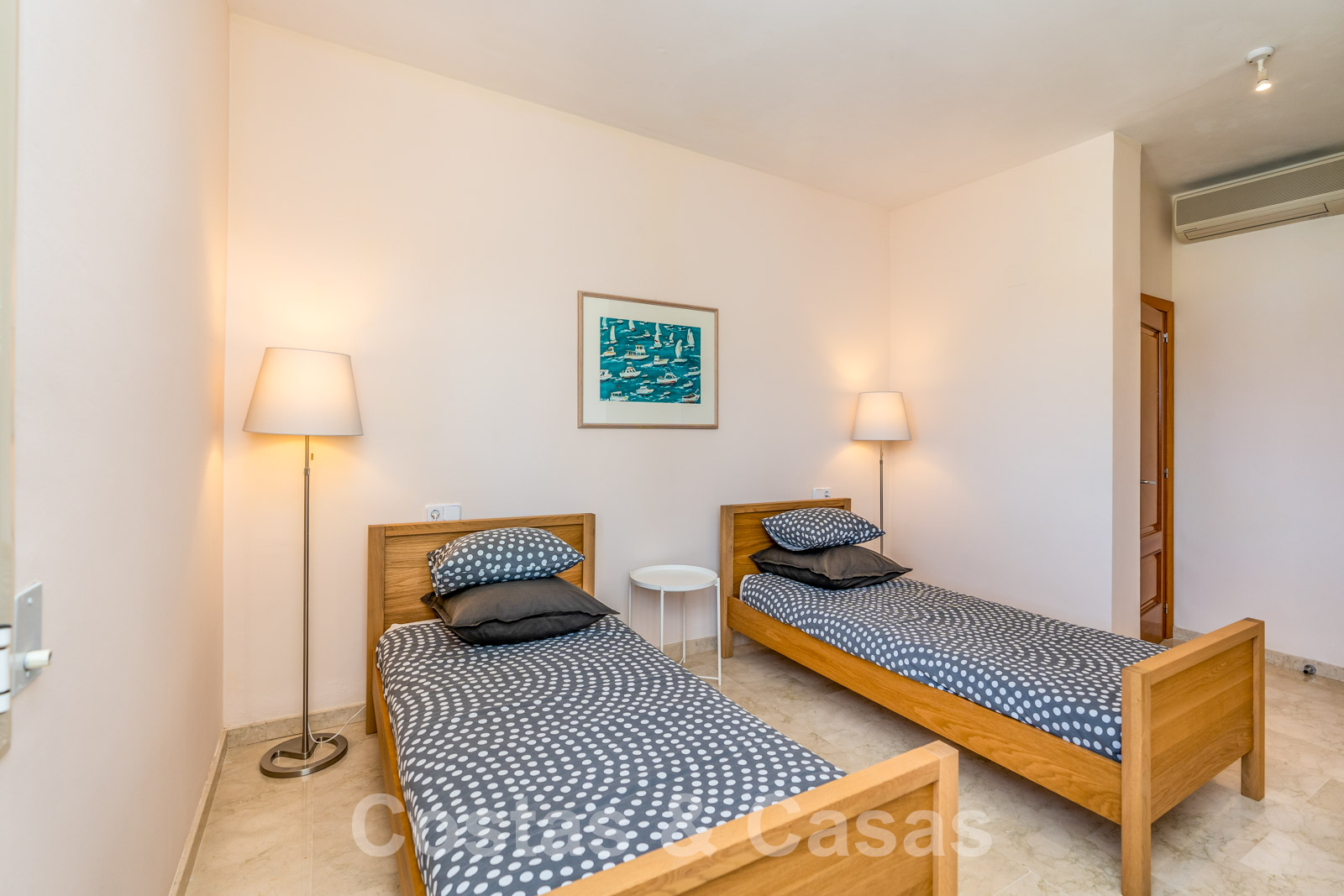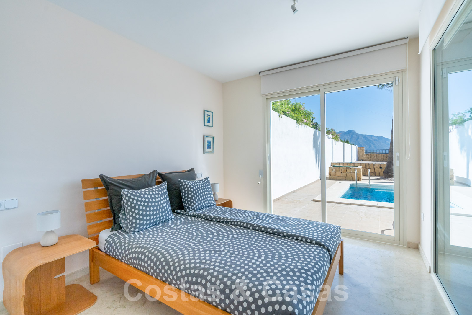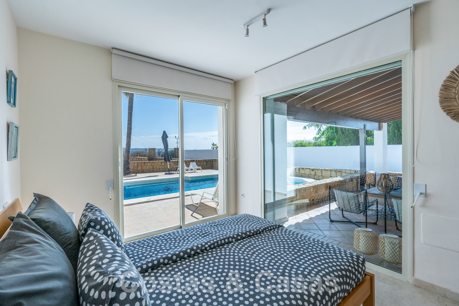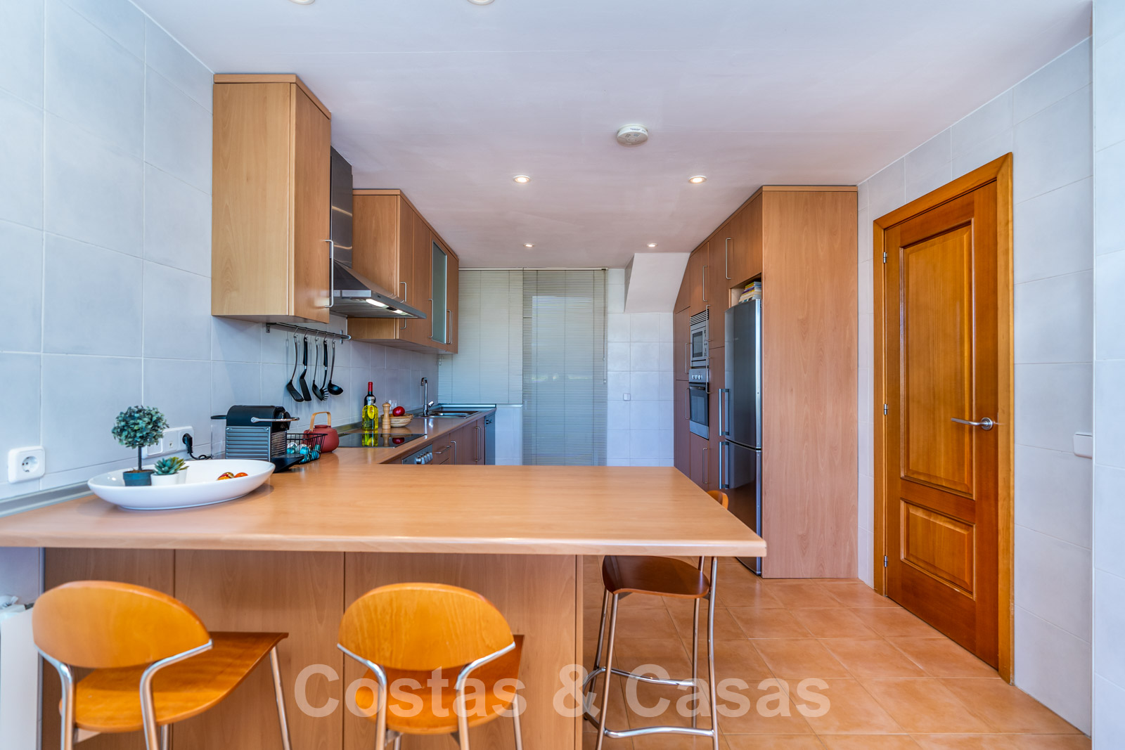 Villa spacieuse au style architectural méditerranéen. L'entrée se compose d'un porche confortable qui donne accès à la cour par le côté. Hall d'entrée avec une toilette invités. Vous entrez dans l'espace de vie ouvert, qui est relié à un coin salon par une structure mezzanine. Celui-ci donne accès à une terrasse ombragée équipée d'un chill-out. A ce niveau il y a aussi une chambre d'amis avec salle de bain séparée. Cuisine séparée et pratique avec un bar pour le petit-déjeuner et accès à un espace couvert "repas en plein air". Une piscine privée avec une terrasse adjacente. Le jardin paysager et nécessitant peu d'entretien offre un espace supplémentaire en profondeur qui peut être aménagé selon vos propres souhaits. Au total, il y a 4 chambres et 4 salles de bains. Sols en marbre de couleur crème. Grand débarras et garage intérieur pour 2 voitures.