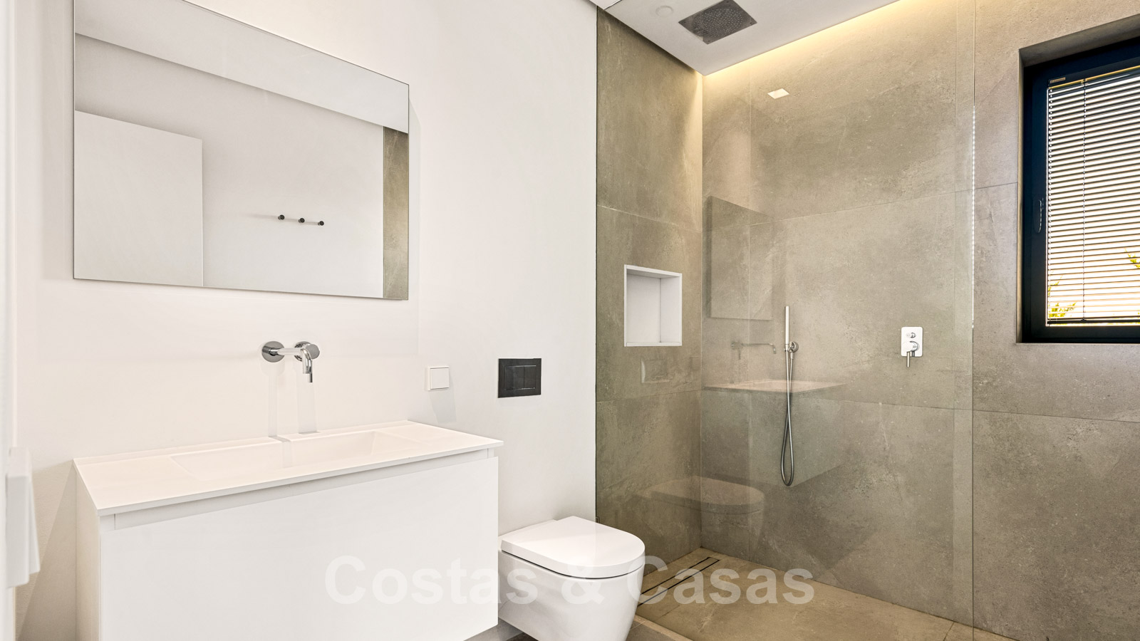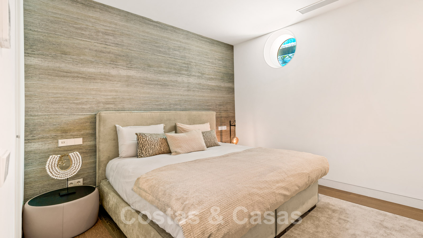 La chambre principale est équipée d'une salle de bain avec baignoire indépendante. Des fenêtres allant du sol au plafond créent un espace lumineux et donnent accès à la terrasse privée.
