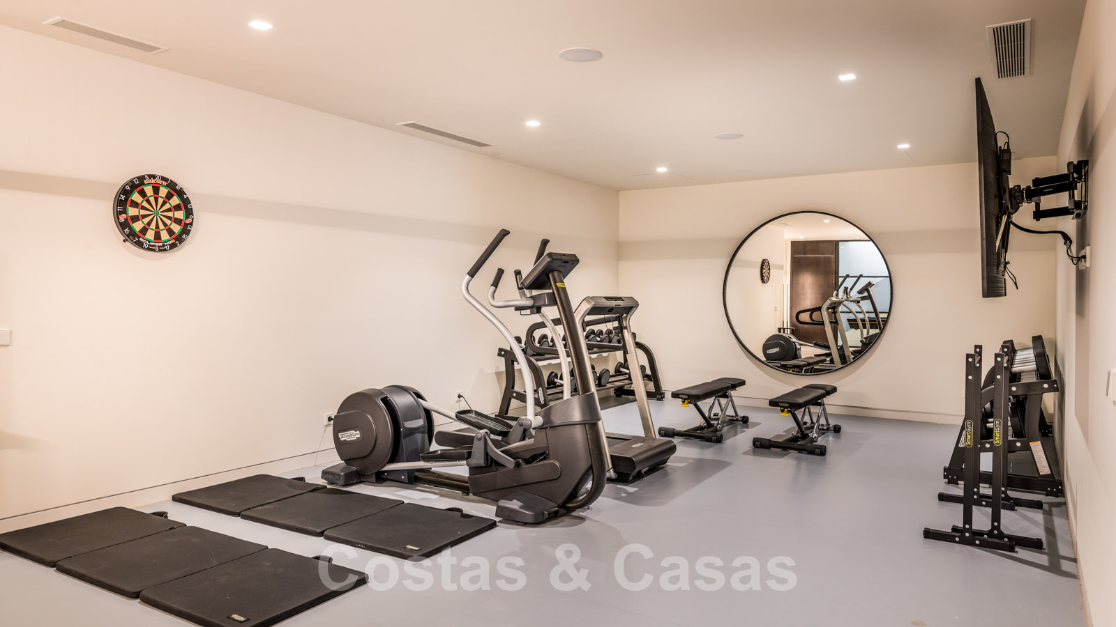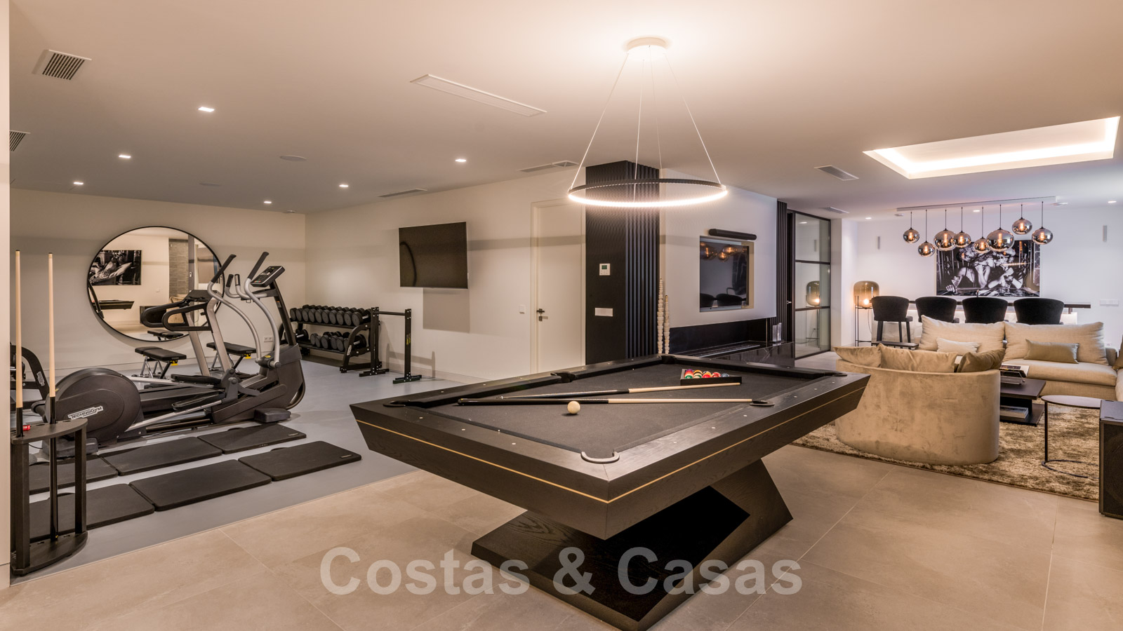 Le sous-sol est conçu comme un espace de détente avec un coin salon intégré avec cheminée électrique, un bar, un billard et un gymnase entièrement équipé. Il y a en plus deux chambres pour les invités avec salle de bain, une laverie et un débarras supplémentaire.