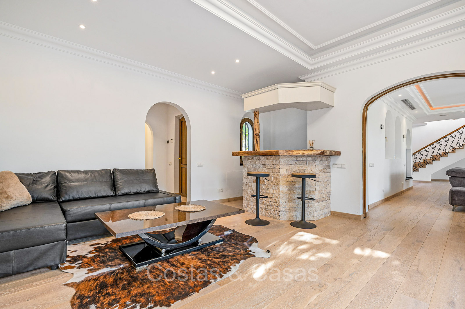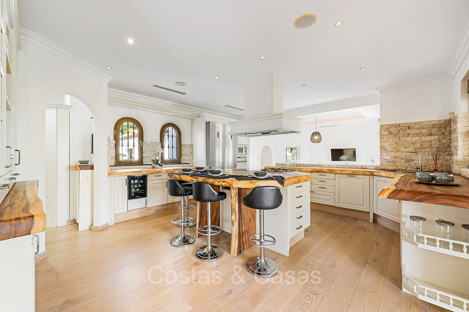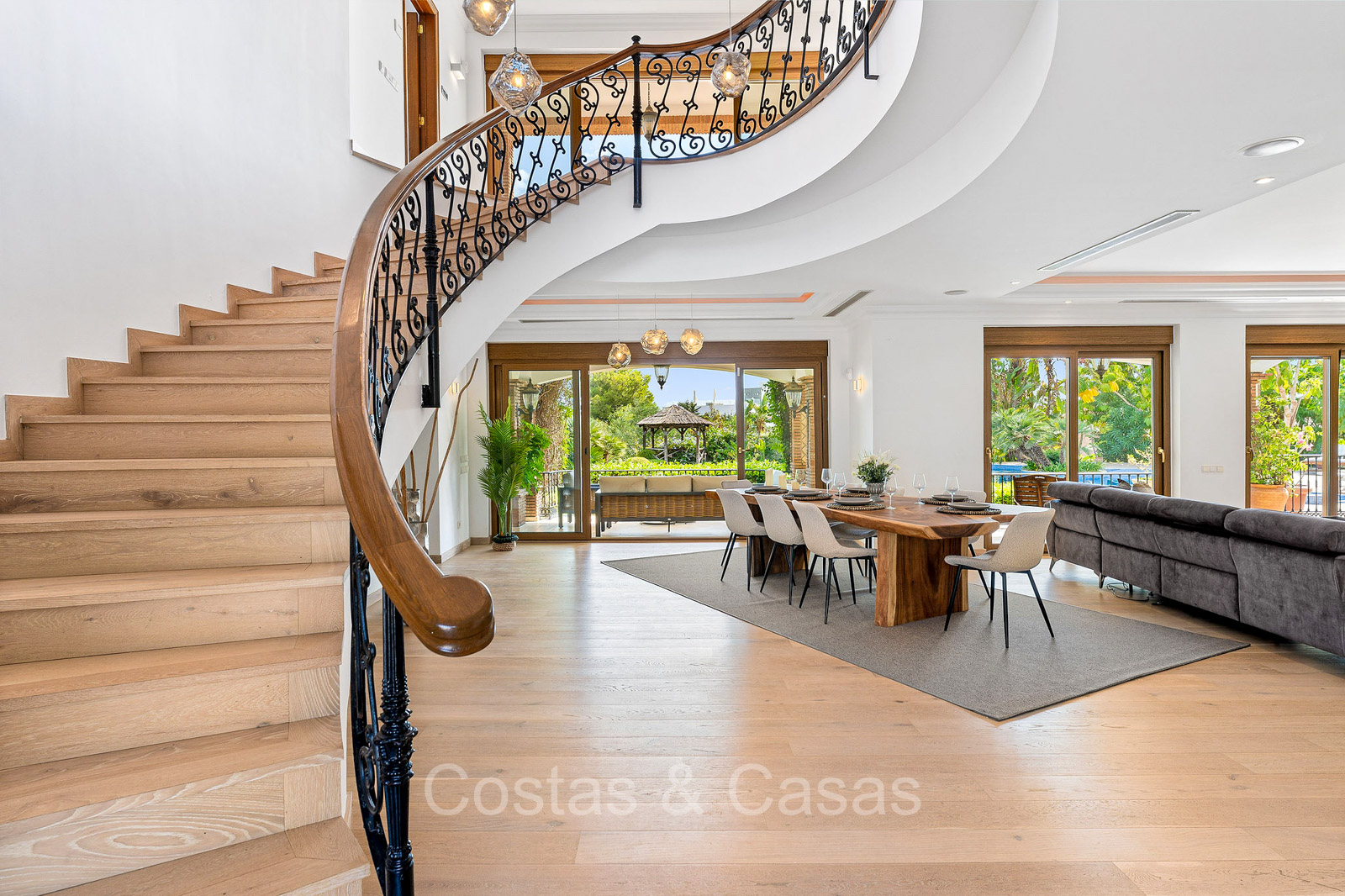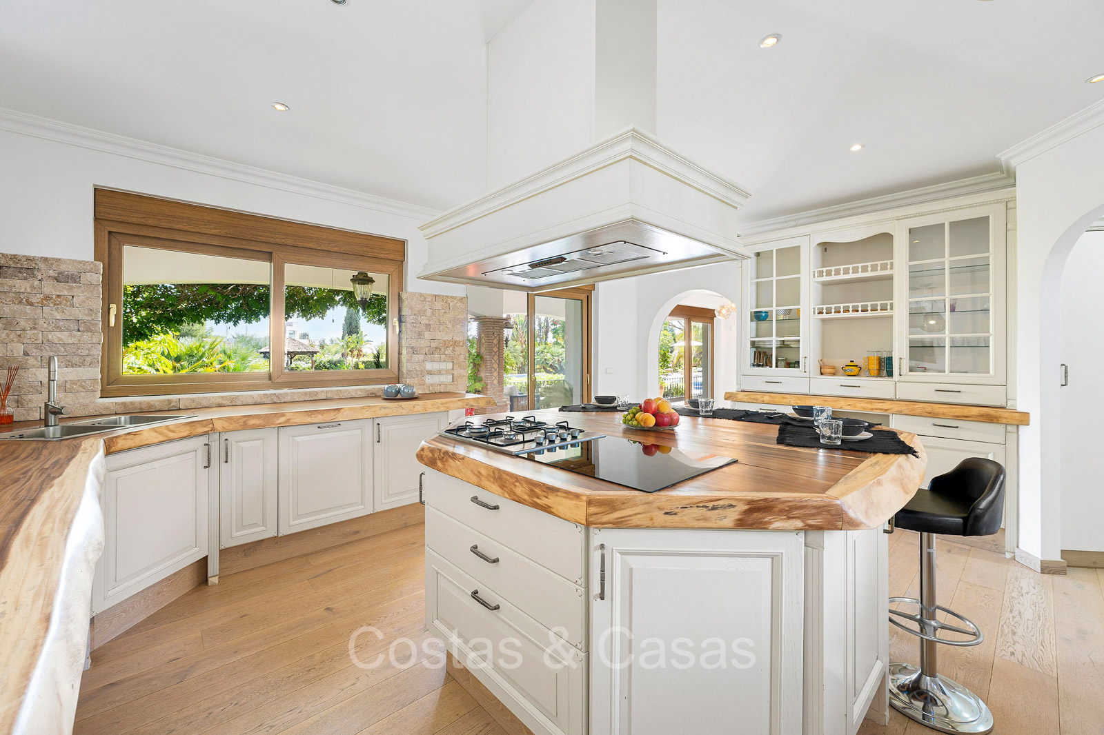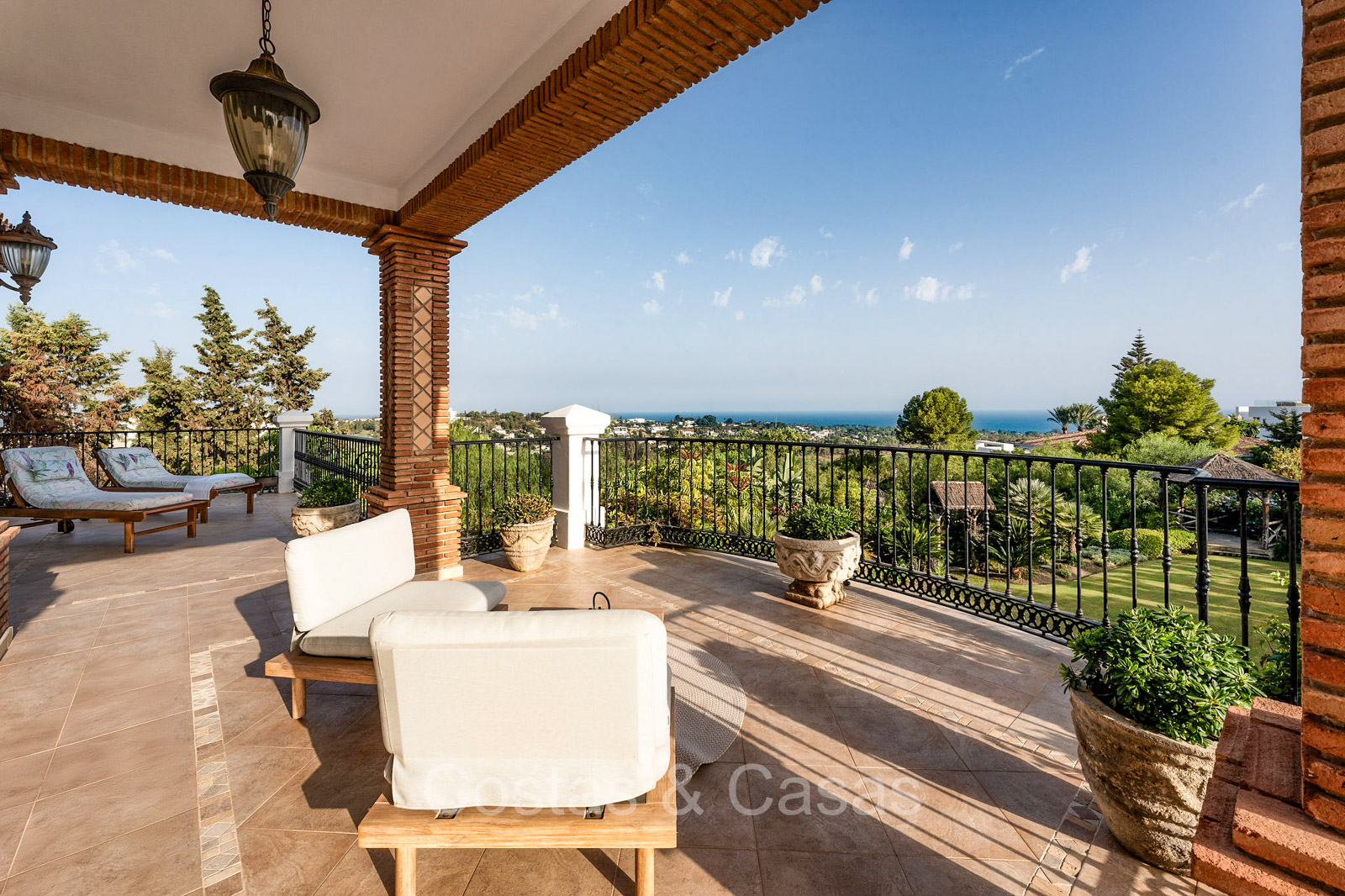 Villa individuelle de style architectural andalou traditionnel. Soigneusement rénovée en 2020. De hautes fenêtres coulissantes s'ouvrent sur les espaces extérieurs et génèrent également beaucoup de lumière naturelle. En entrant, vous êtes accueilli par un grand et charmant espace avec un escalier orné et un plafond à double hauteur qui monte élégamment jusqu'à l'étage supérieur. Salon ouvert et chaleureux avec cheminée. Coin repas intégré. Cuisine sur mesure pratique avec un îlot de cuisson central où vous pourrez vous asseoir. Buanderie avec un réfrigérateur. 6 chambres, 6 salles de bains et 2 toilettes séparées. La suite principale est située à l'étage supérieur et bénéficie d'une grande salle de bains, d'un dressing et d'un accès à la vaste terrasse. Une petite pièce polyvalente à l'étage supérieur peut être librement aménagée en bureau privé ou en bureau. Planchers en bois. Logement intérieur avec accès privé. Buanderie. Garage intérieur pour 2 voitures. Parking supplémentaire pour 3 à 4 voitures.