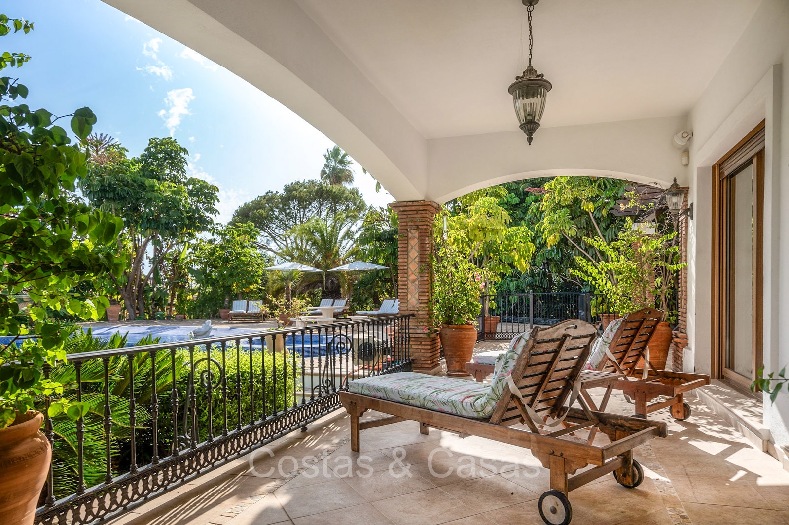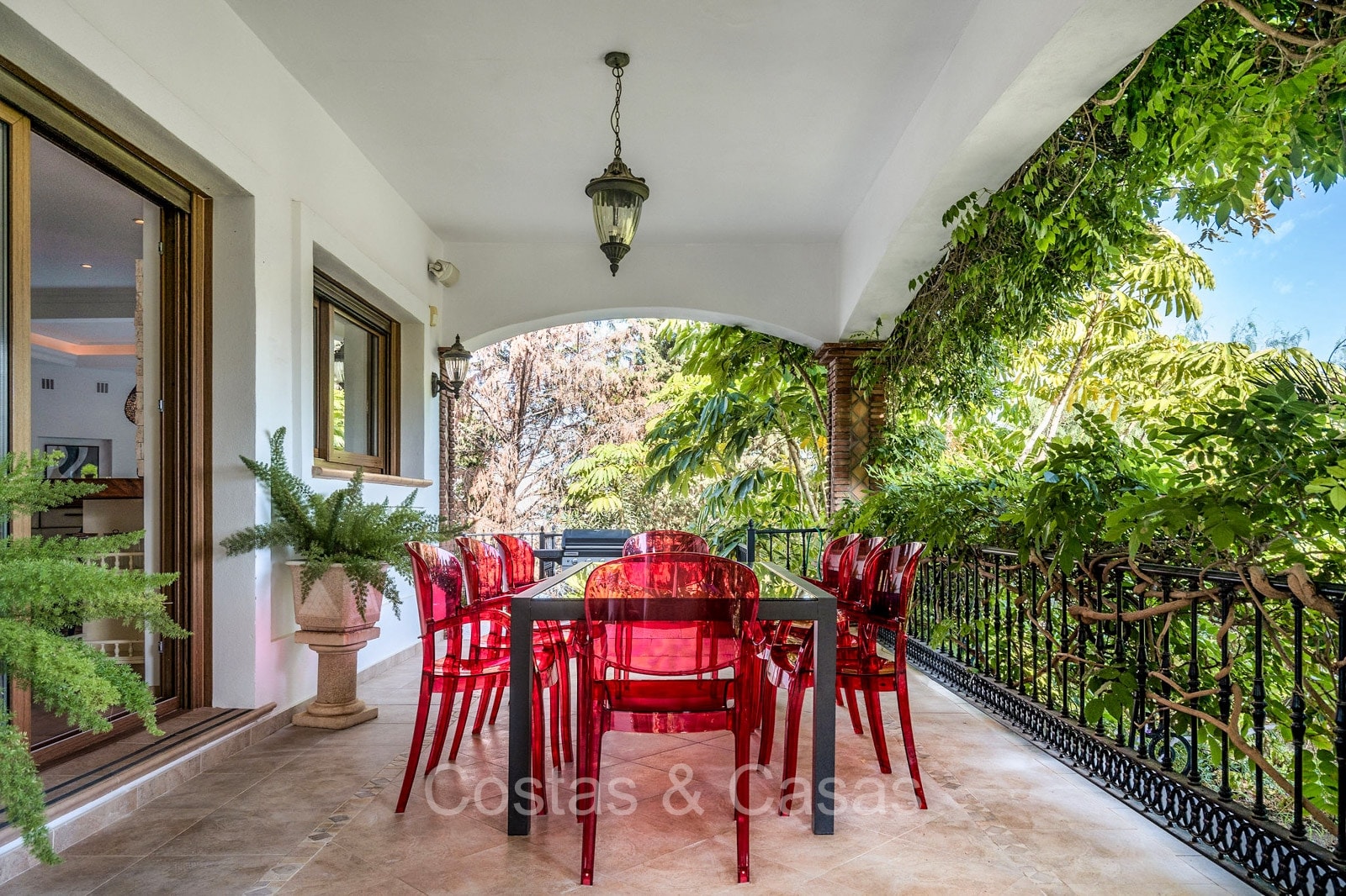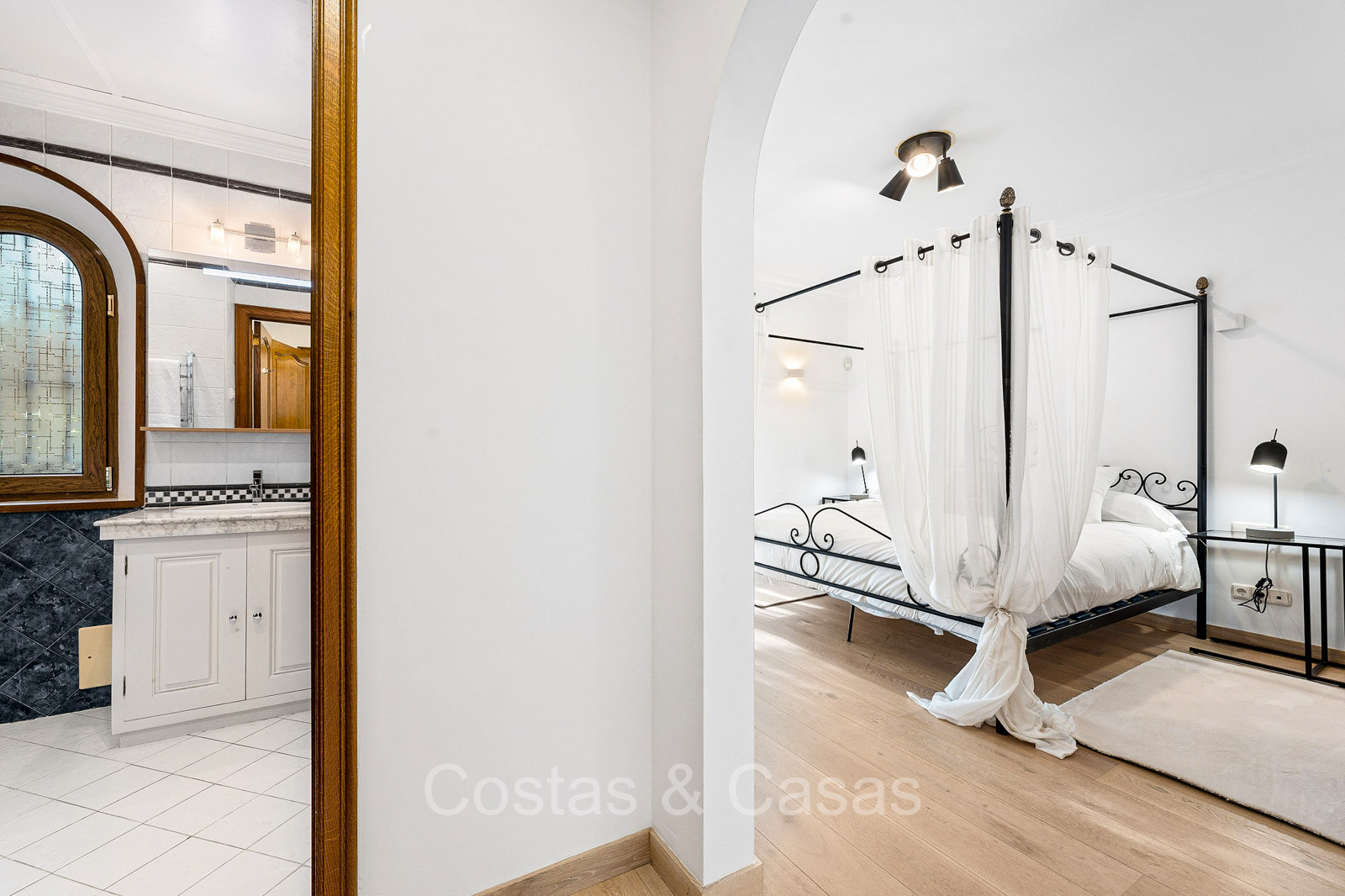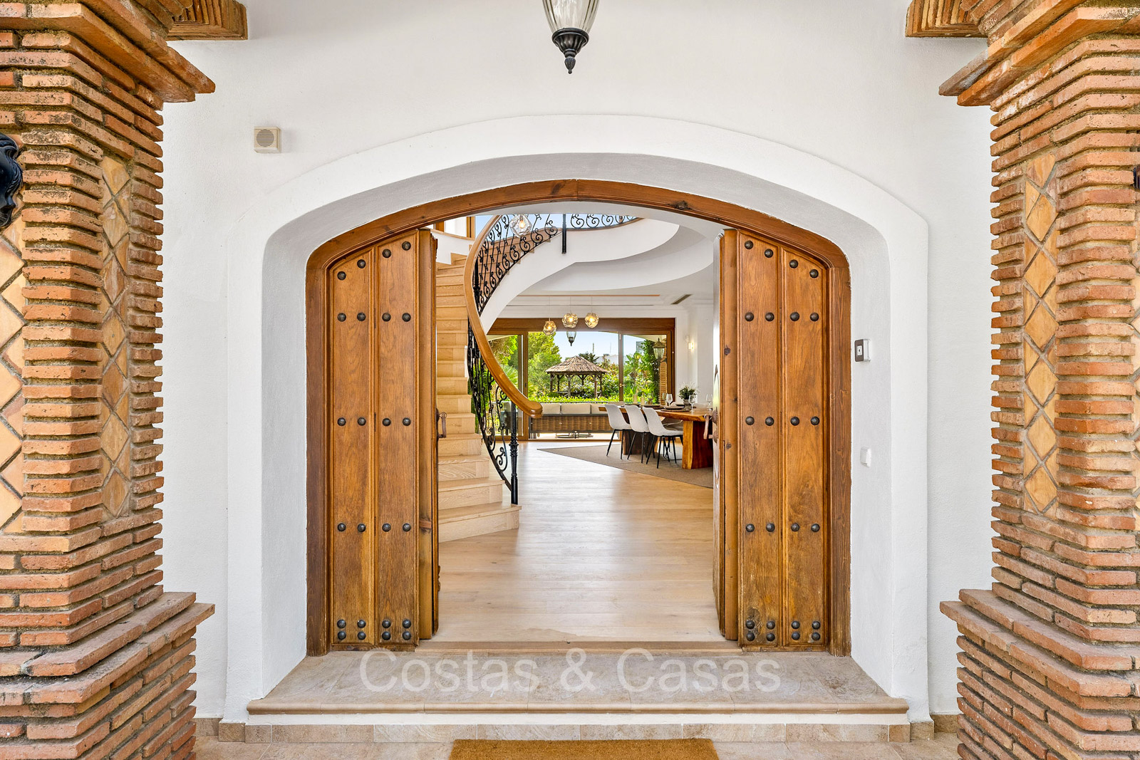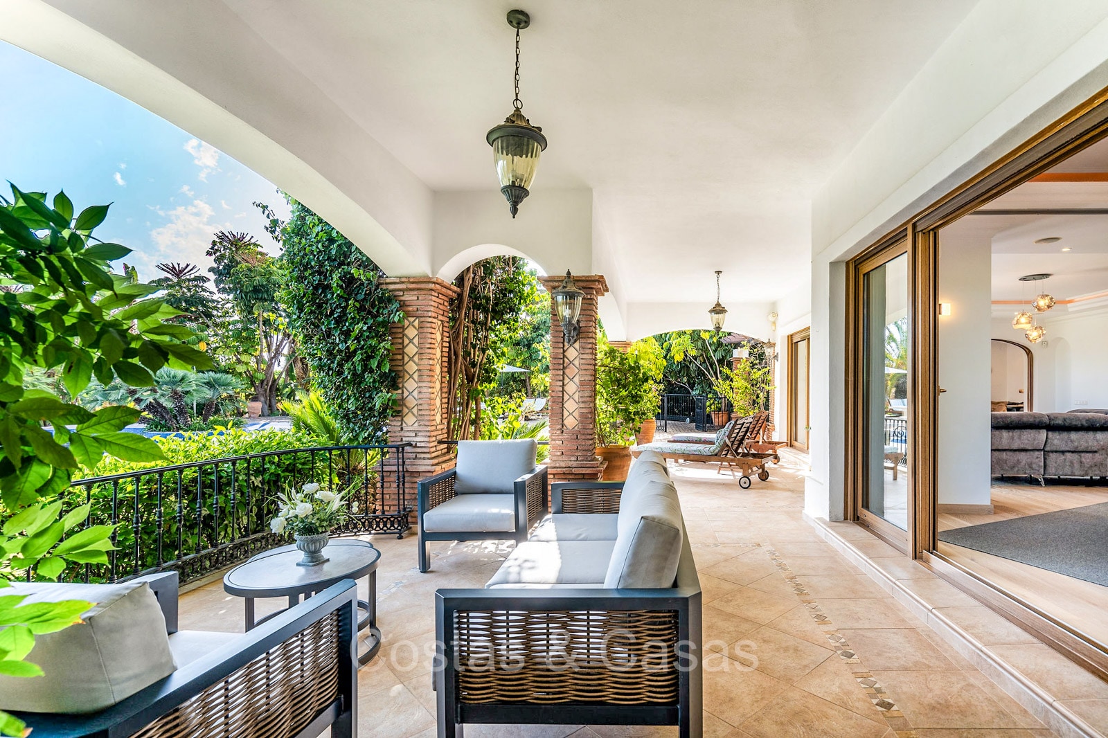 Villa individuelle de style architectural andalou traditionnel. Soigneusement rénovée en 2020. De hautes fenêtres coulissantes s'ouvrent sur les espaces extérieurs et génèrent également beaucoup de lumière naturelle. En entrant, vous êtes accueilli par un grand et charmant espace avec un escalier orné et un plafond à double hauteur qui monte élégamment jusqu'à l'étage supérieur. Salon ouvert et chaleureux avec cheminée. Coin repas intégré. Cuisine sur mesure pratique avec un îlot de cuisson central où vous pourrez vous asseoir. Buanderie avec un réfrigérateur. 6 chambres, 6 salles de bains et 2 toilettes séparées. La suite principale est située à l'étage supérieur et bénéficie d'une grande salle de bains, d'un dressing et d'un accès à la vaste terrasse. Une petite pièce polyvalente à l'étage supérieur peut être librement aménagée en bureau privé ou en bureau. Planchers en bois. Logement intérieur avec accès privé. Buanderie. Garage intérieur pour 2 voitures. Parking supplémentaire pour 3 à 4 voitures.