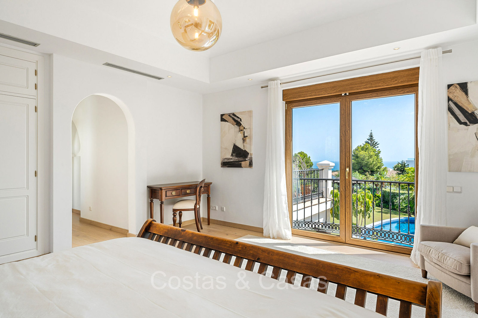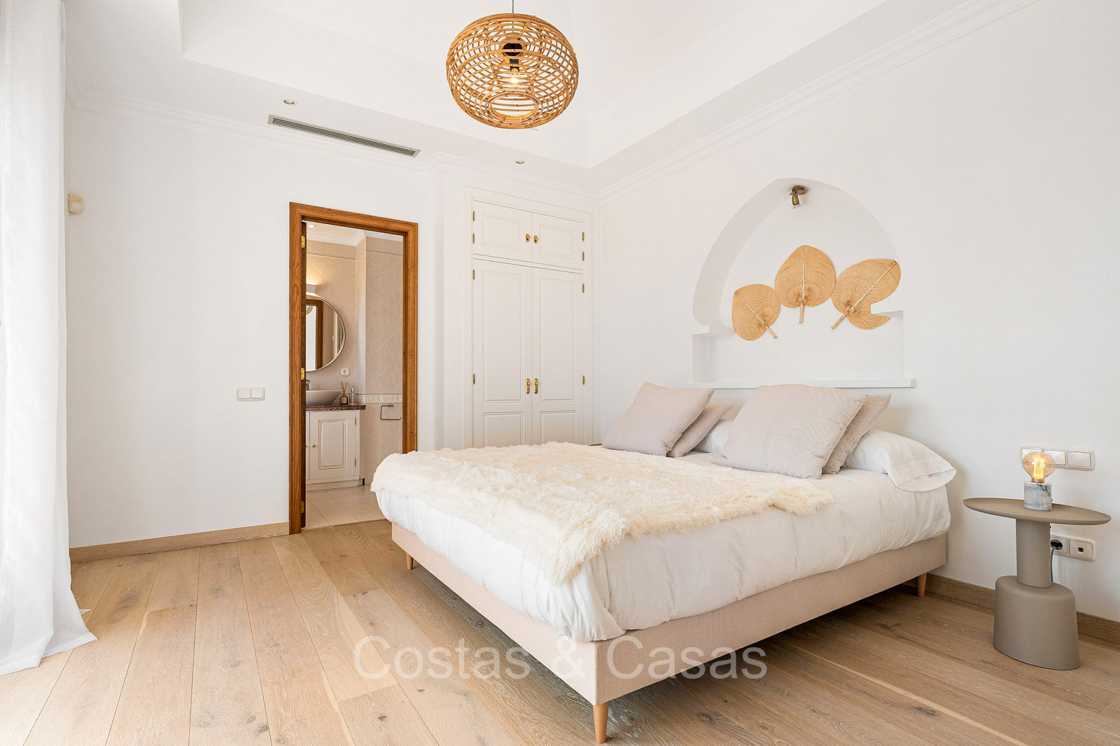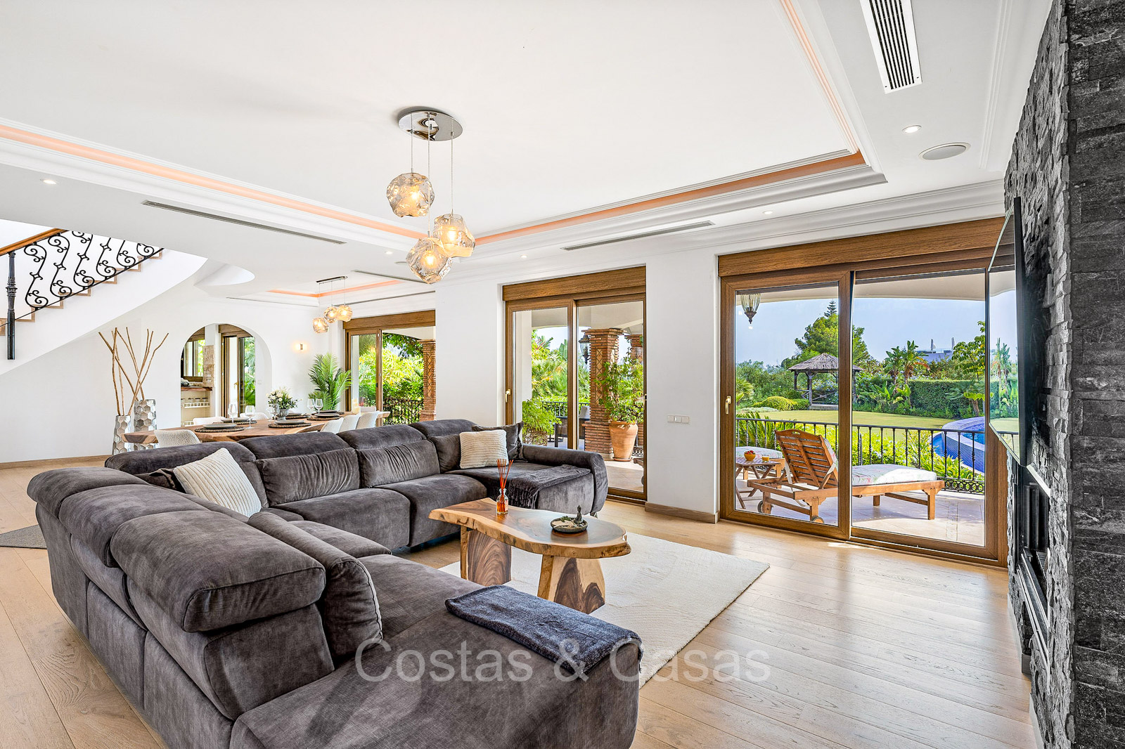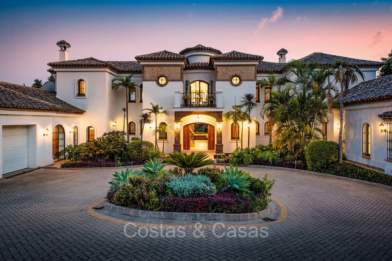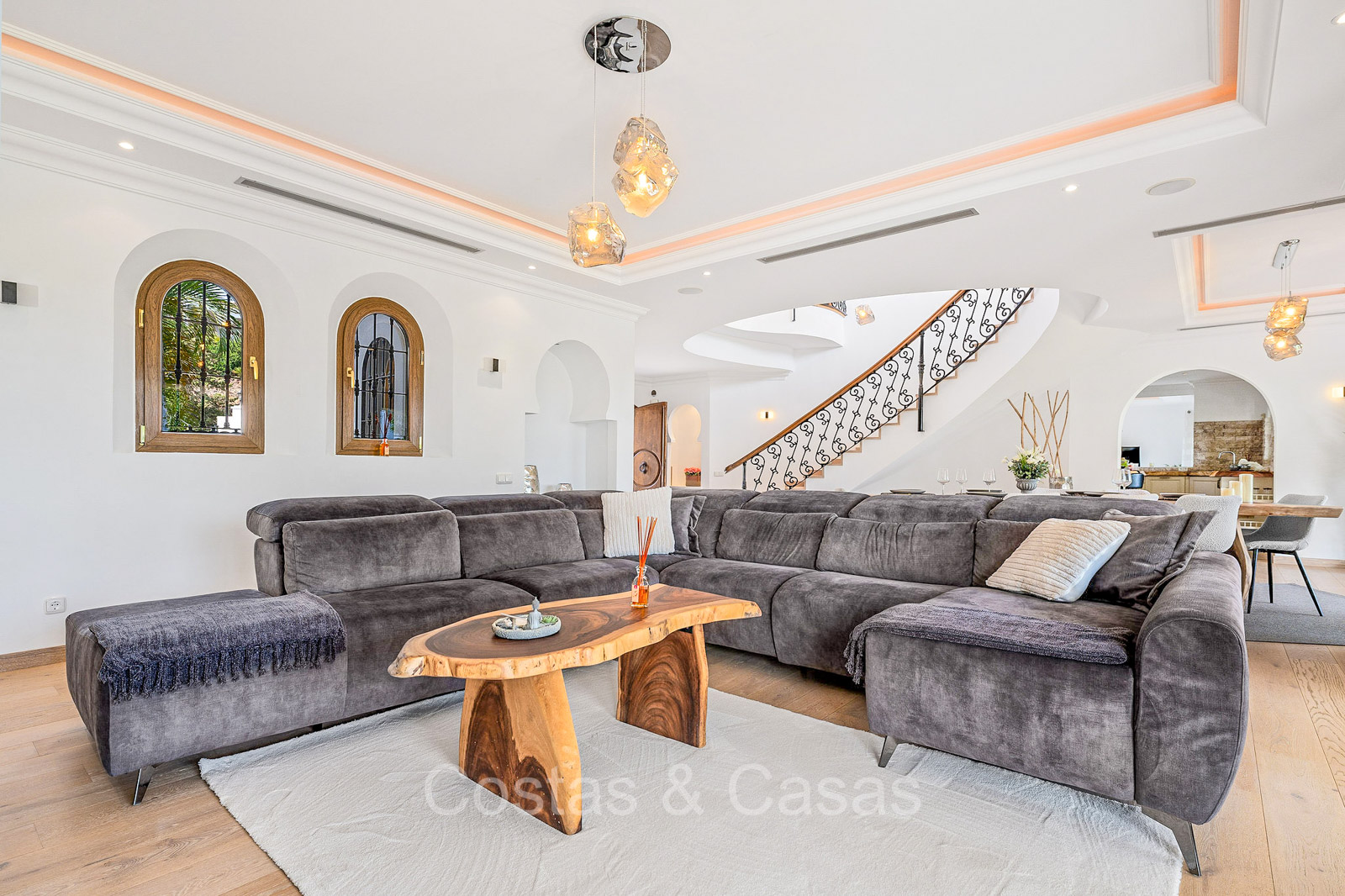 Villa individuelle de style architectural andalou traditionnel. Soigneusement rénovée en 2020. De hautes fenêtres coulissantes s'ouvrent sur les espaces extérieurs et génèrent également beaucoup de lumière naturelle. En entrant, vous êtes accueilli par un grand et charmant espace avec un escalier orné et un plafond à double hauteur qui monte élégamment jusqu'à l'étage supérieur. Salon ouvert et chaleureux avec cheminée. Coin repas intégré. Cuisine sur mesure pratique avec un îlot de cuisson central où vous pourrez vous asseoir. Buanderie avec un réfrigérateur. 6 chambres, 6 salles de bains et 2 toilettes séparées. La suite principale est située à l'étage supérieur et bénéficie d'une grande salle de bains, d'un dressing et d'un accès à la vaste terrasse. Une petite pièce polyvalente à l'étage supérieur peut être librement aménagée en bureau privé ou en bureau. Planchers en bois. Logement intérieur avec accès privé. Buanderie. Garage intérieur pour 2 voitures. Parking supplémentaire pour 3 à 4 voitures.