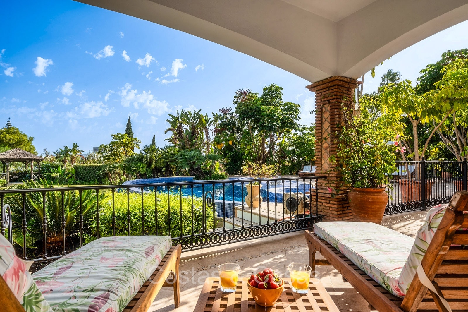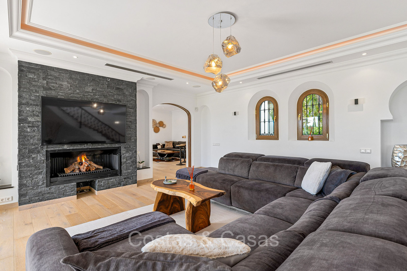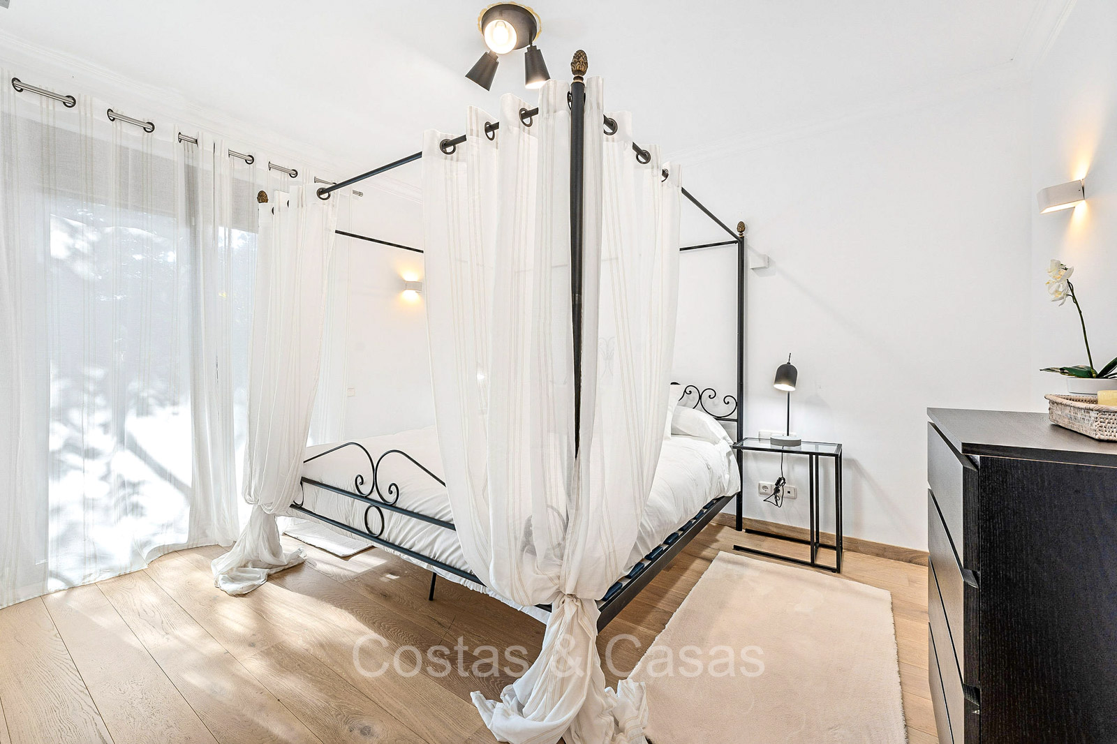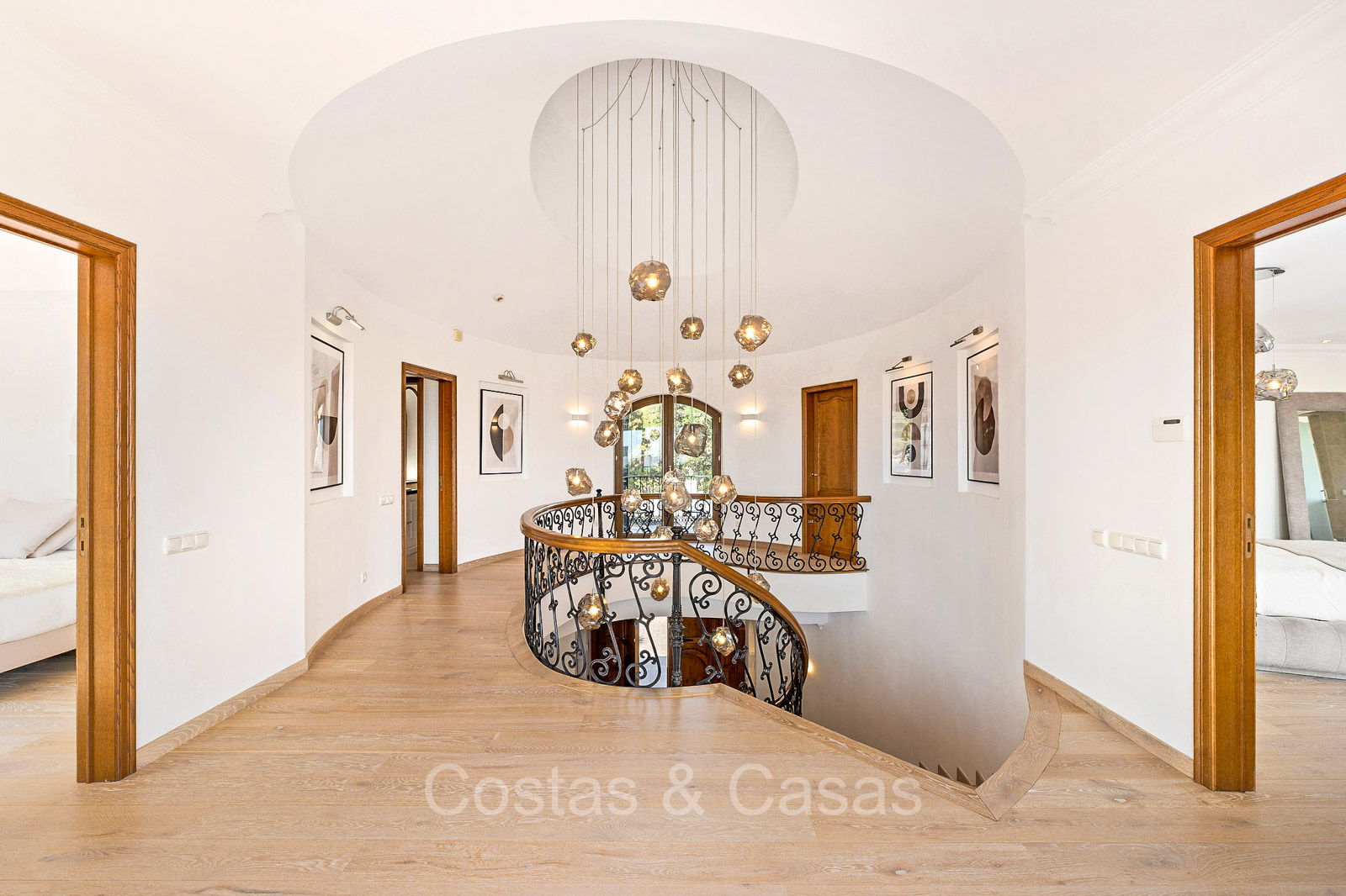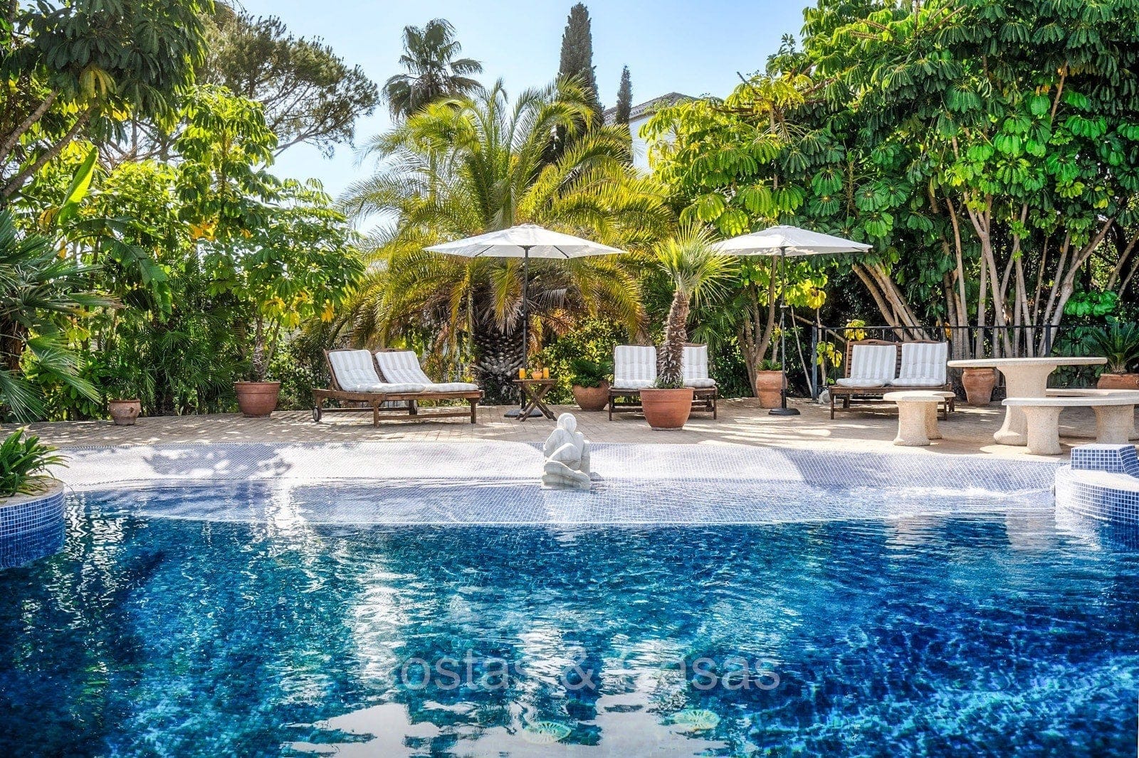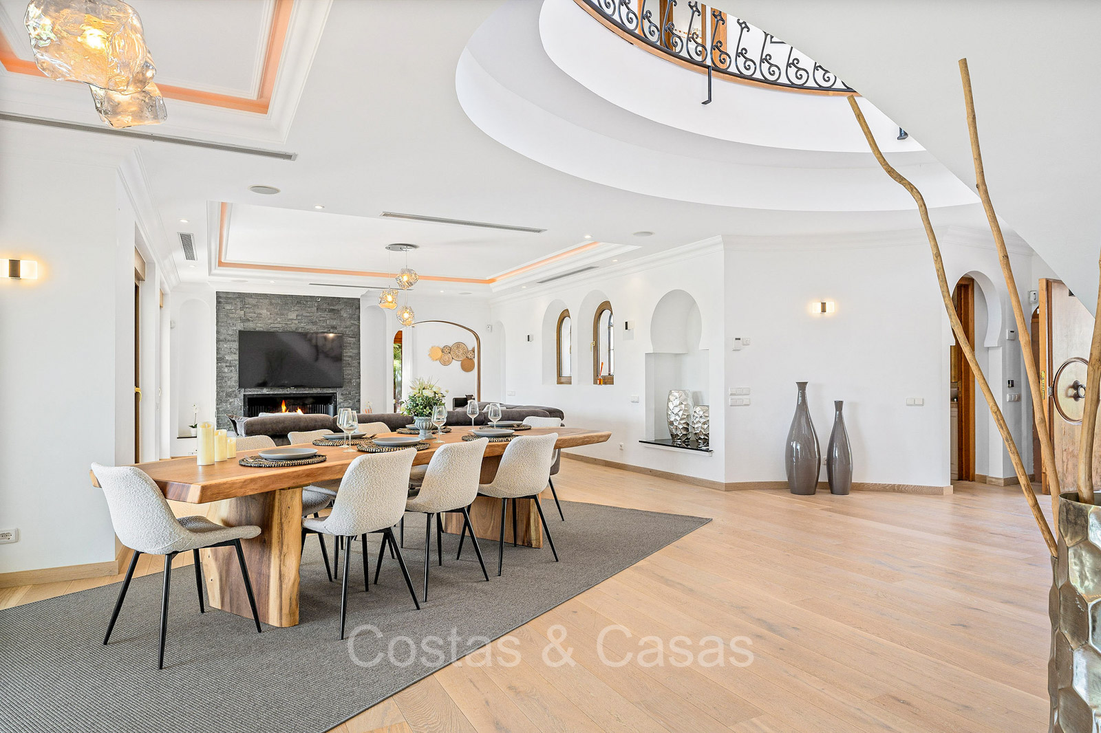 Villa individuelle de style architectural andalou traditionnel. Soigneusement rénovée en 2020. De hautes fenêtres coulissantes s'ouvrent sur les espaces extérieurs et génèrent également beaucoup de lumière naturelle. En entrant, vous êtes accueilli par un grand et charmant espace avec un escalier orné et un plafond à double hauteur qui monte élégamment jusqu'à l'étage supérieur. Salon ouvert et chaleureux avec cheminée. Coin repas intégré. Cuisine sur mesure pratique avec un îlot de cuisson central où vous pourrez vous asseoir. Buanderie avec un réfrigérateur. 6 chambres, 6 salles de bains et 2 toilettes séparées. La suite principale est située à l'étage supérieur et bénéficie d'une grande salle de bains, d'un dressing et d'un accès à la vaste terrasse. Une petite pièce polyvalente à l'étage supérieur peut être librement aménagée en bureau privé ou en bureau. Planchers en bois. Logement intérieur avec accès privé. Buanderie. Garage intérieur pour 2 voitures. Parking supplémentaire pour 3 à 4 voitures.